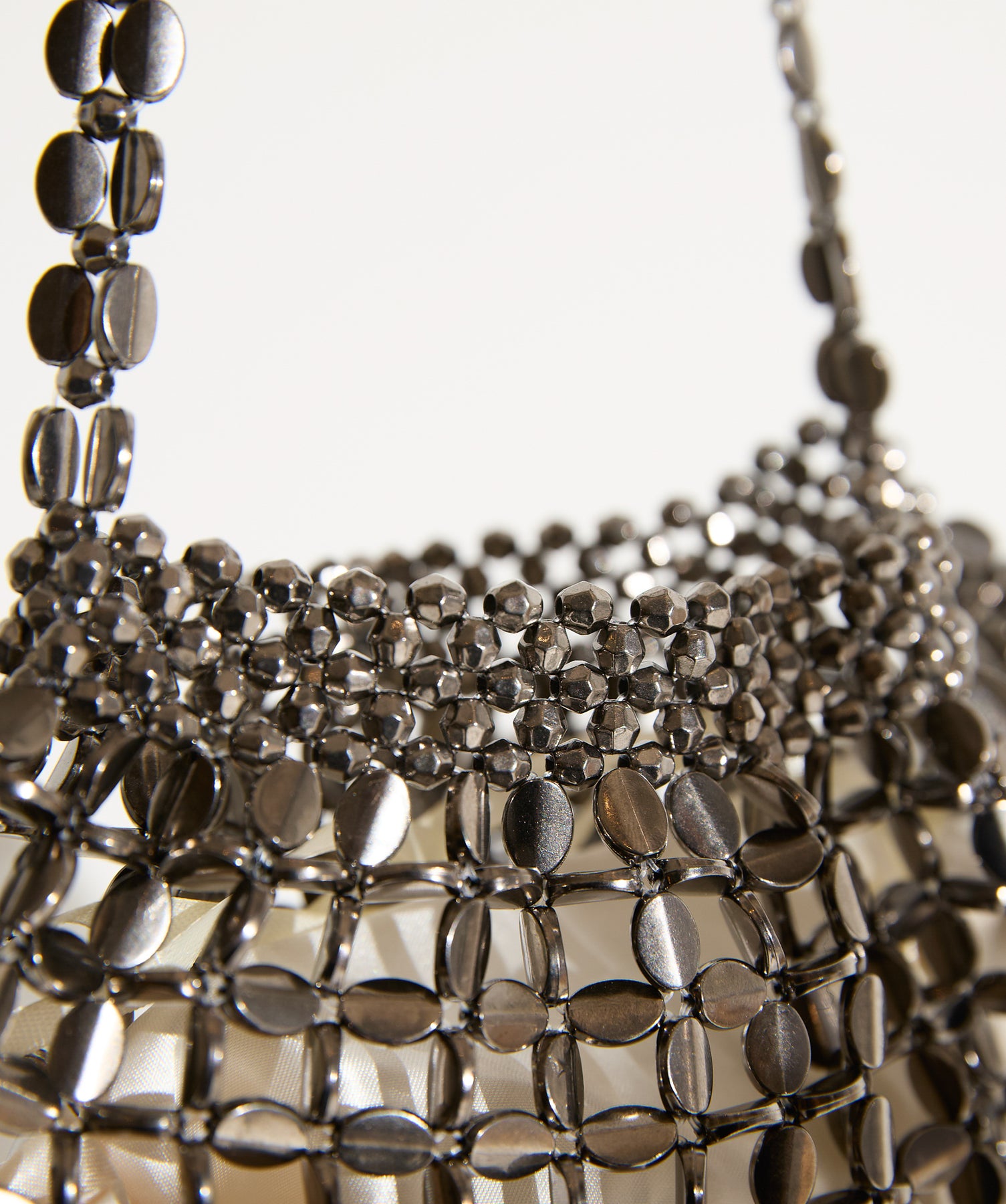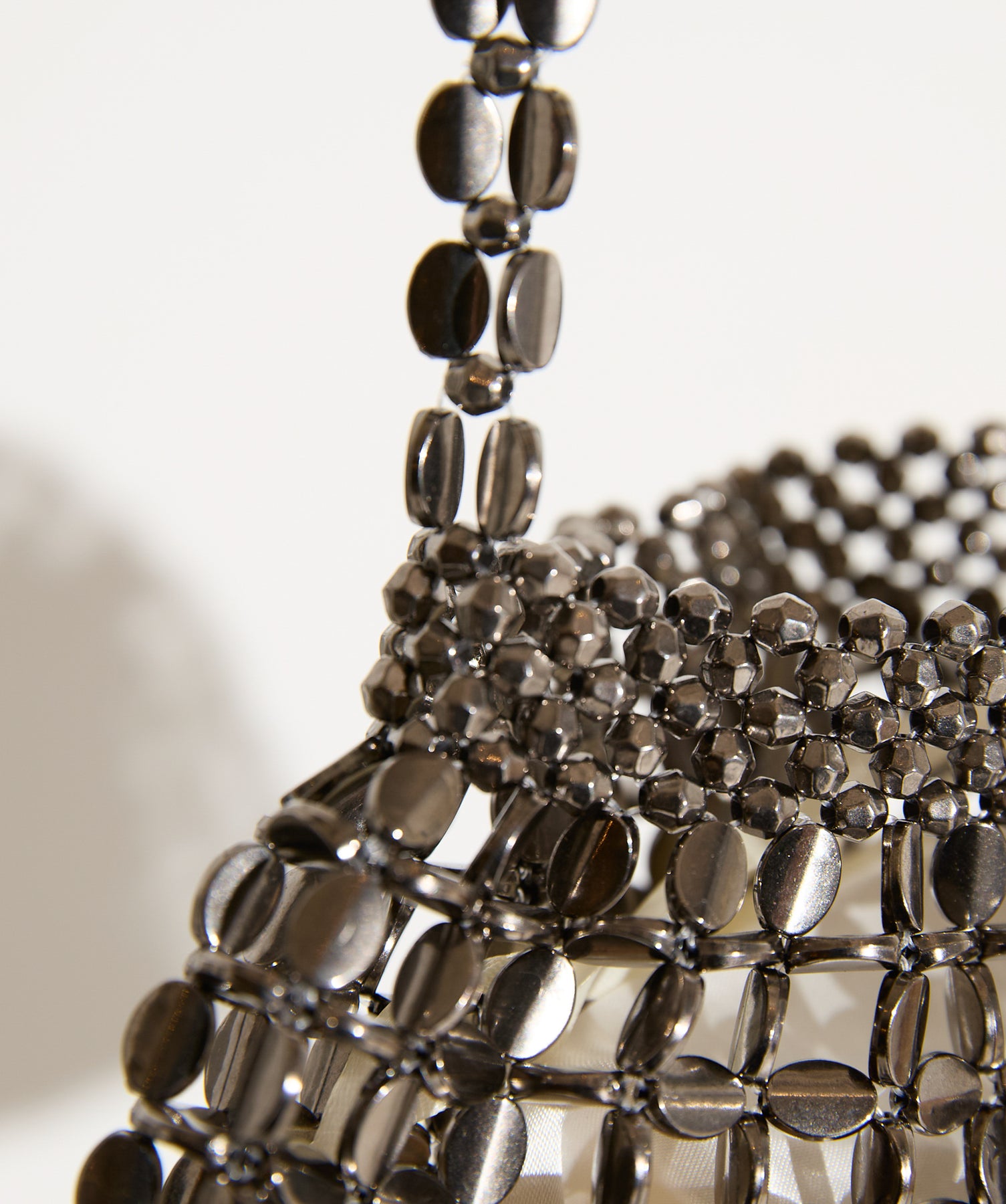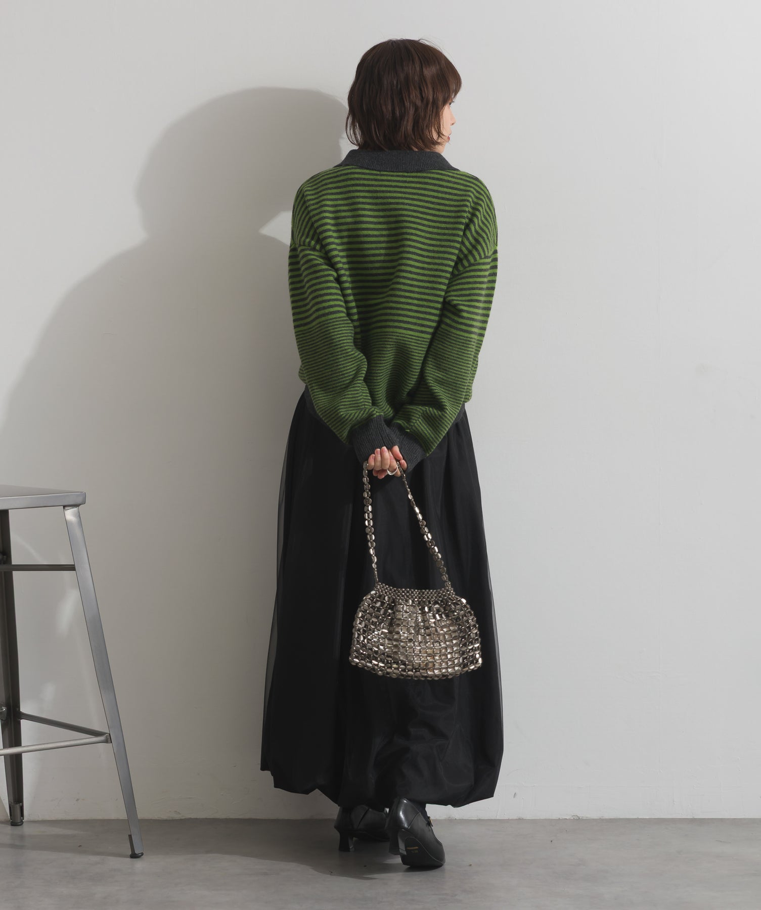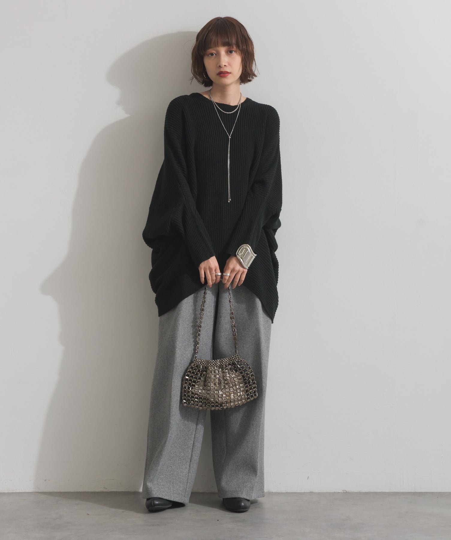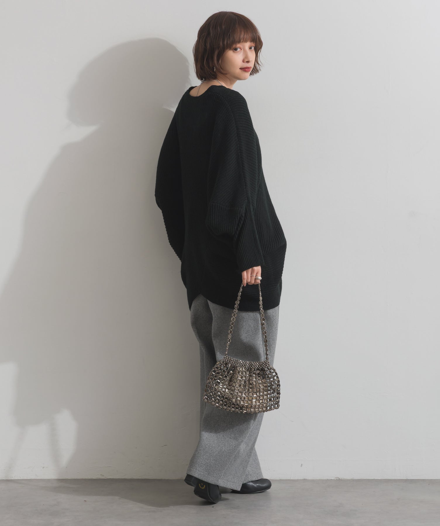 光で魅せる、主役級の存在感。-material-メタリックな輝きが目を惹く、軽量アルミチェーン素材を贅沢に使用。繊細ながら強度のある作りで、華奢な見た目以上の実用性を備えています。中には程よい光沢のサテン巾着付き。シアー感のある編み込みとのコントラストで、アイテム自体がアクセサリーのような仕上がりに。-design-シャープな印象を与えるチェーンバッグに、女性らしい丸みを持たせたニュアンスフォルムをミックス。コンパクトなサイズ感ながらも、ミニ財布やリップなど必要最低限のアイテムがしっかり入る設計。ショルダーとしてもハンド持ちでも映える、トレンドに左右されない洗練デザインです。スタイリングを一気に格上げするアクセントバッグとして、ナイトシーンはもちろん、あえてカジュアルに外すのもおすすめ。