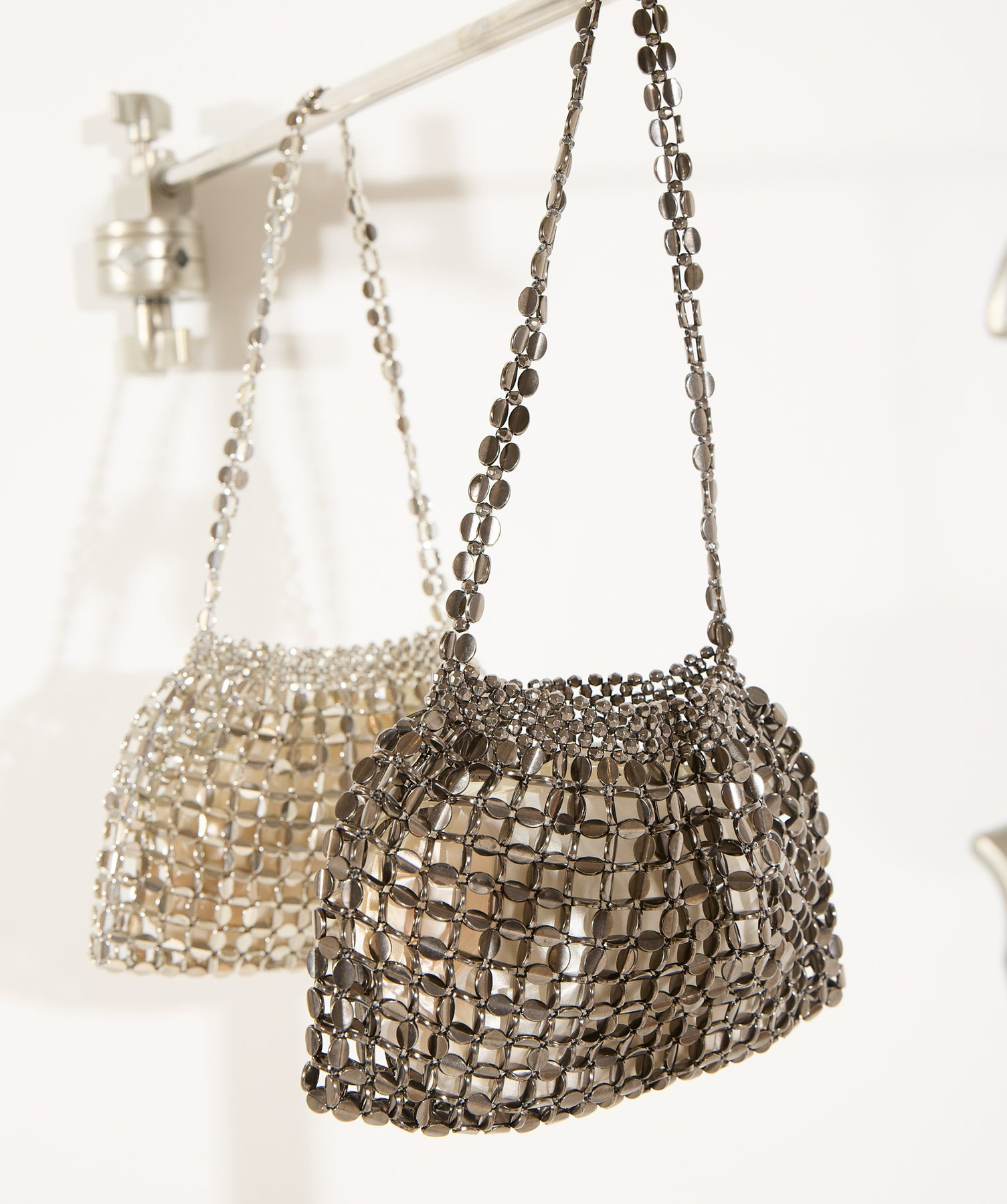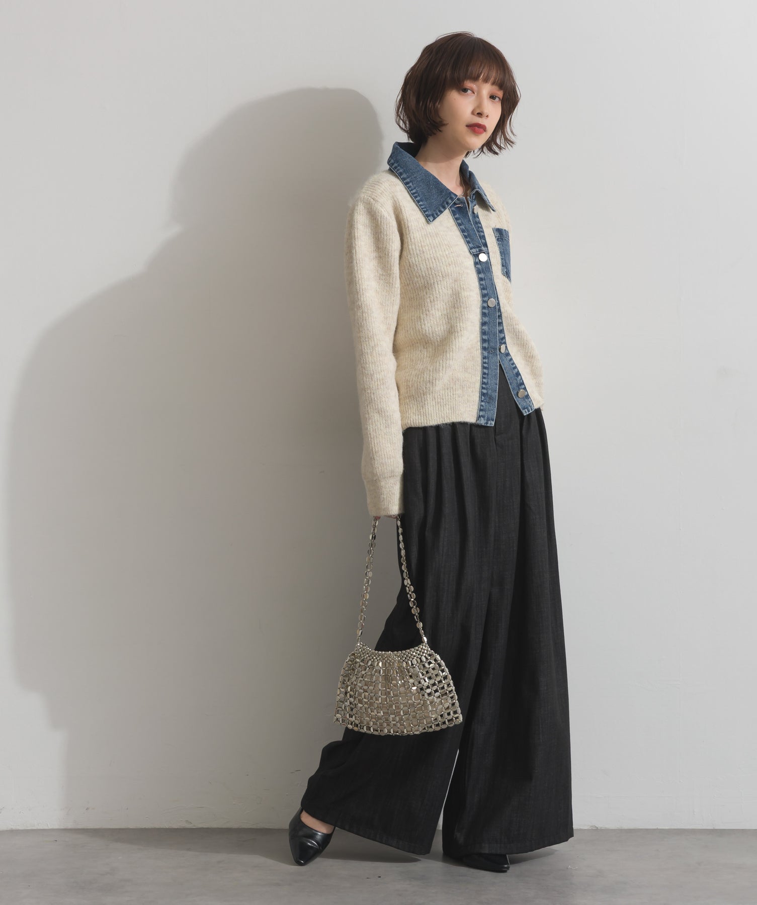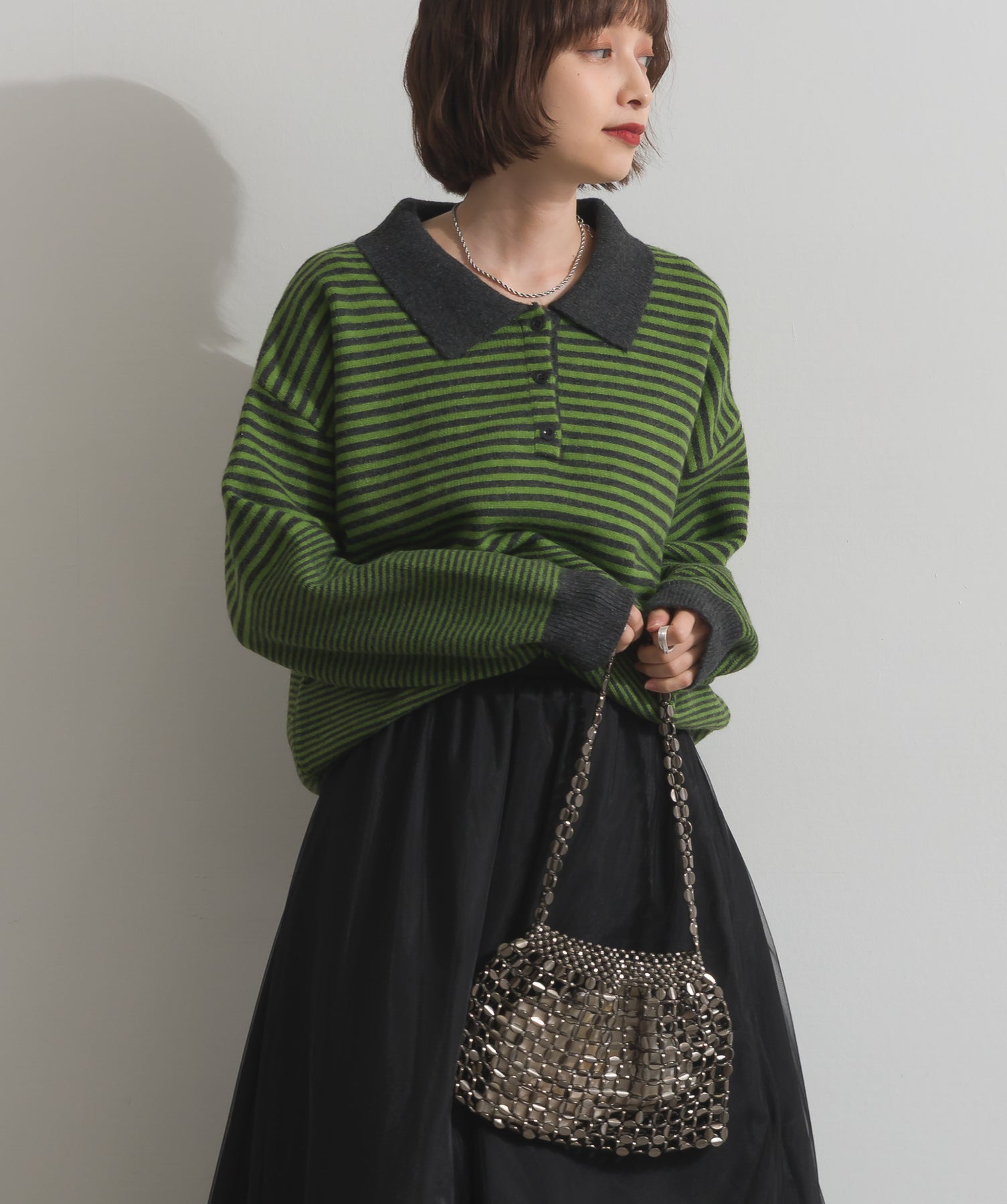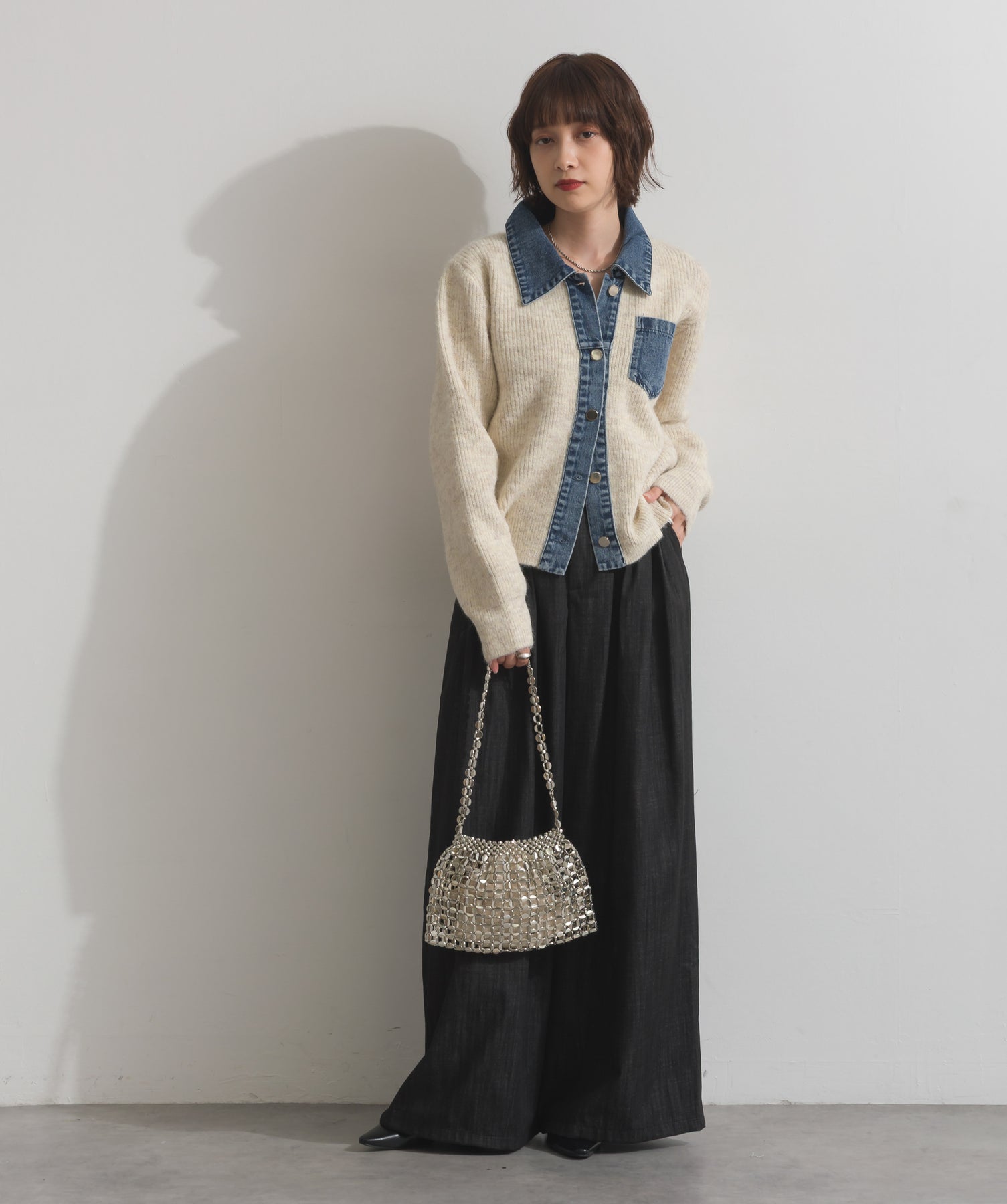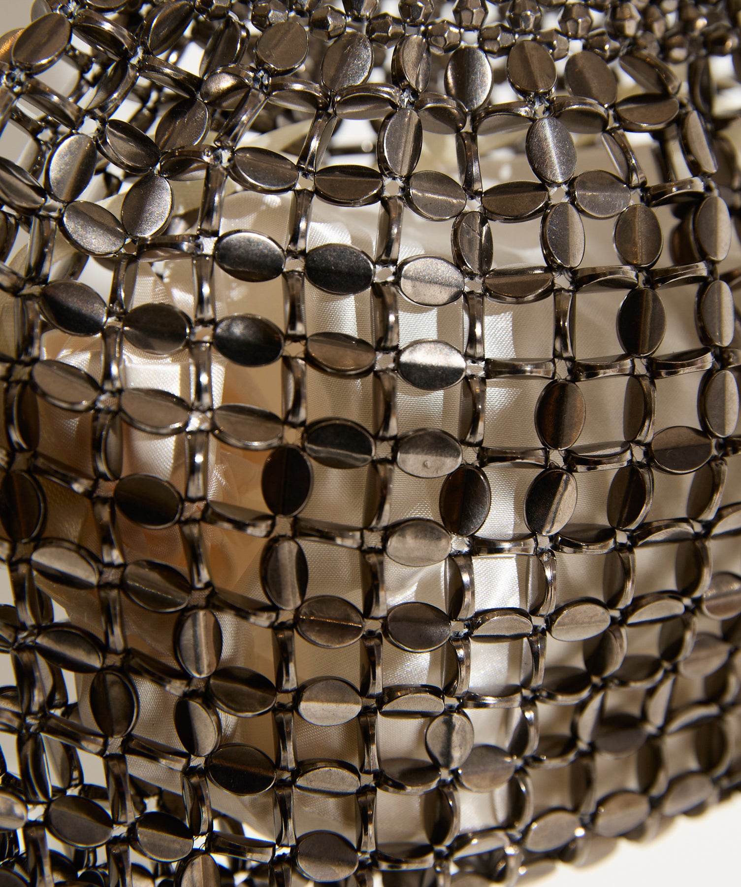 光で魅せる、主役級の存在感。-material-メタリックな輝きが目を惹く、軽量アルミチェーン素材を贅沢に使用。繊細ながら強度のある作りで、華奢な見た目以上の実用性を備えています。中には程よい光沢のサテン巾着付き。シアー感のある編み込みとのコントラストで、アイテム自体がアクセサリーのような仕上がりに。-design-シャープな印象を与えるチェーンバッグに、女性らしい丸みを持たせたニュアンスフォルムをミックス。コンパクトなサイズ感ながらも、ミニ財布やリップなど必要最低限のアイテムがしっかり入る設計。ショルダーとしてもハンド持ちでも映える、トレンドに左右されない洗練デザインです。スタイリングを一気に格上げするアクセントバッグとして、ナイトシーンはもちろん、あえてカジュアルに外すのもおすすめ。