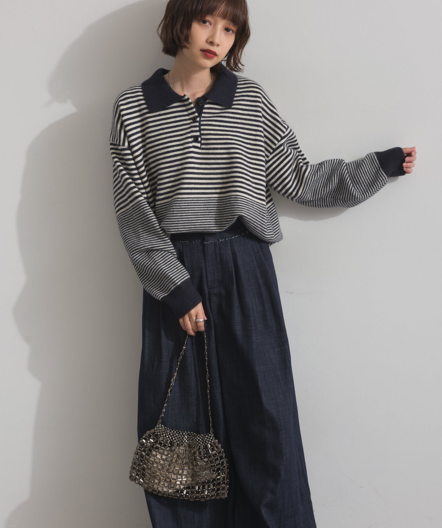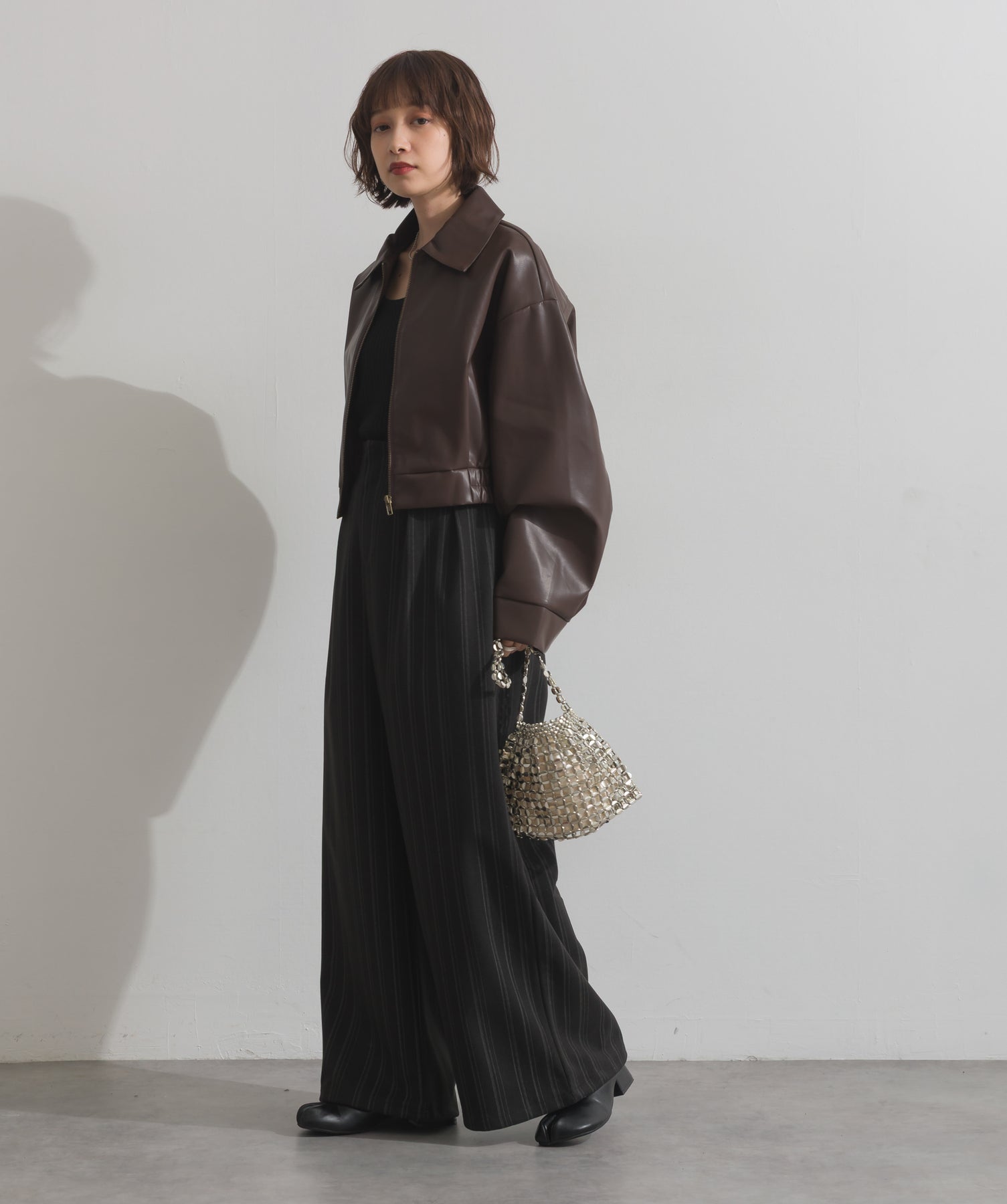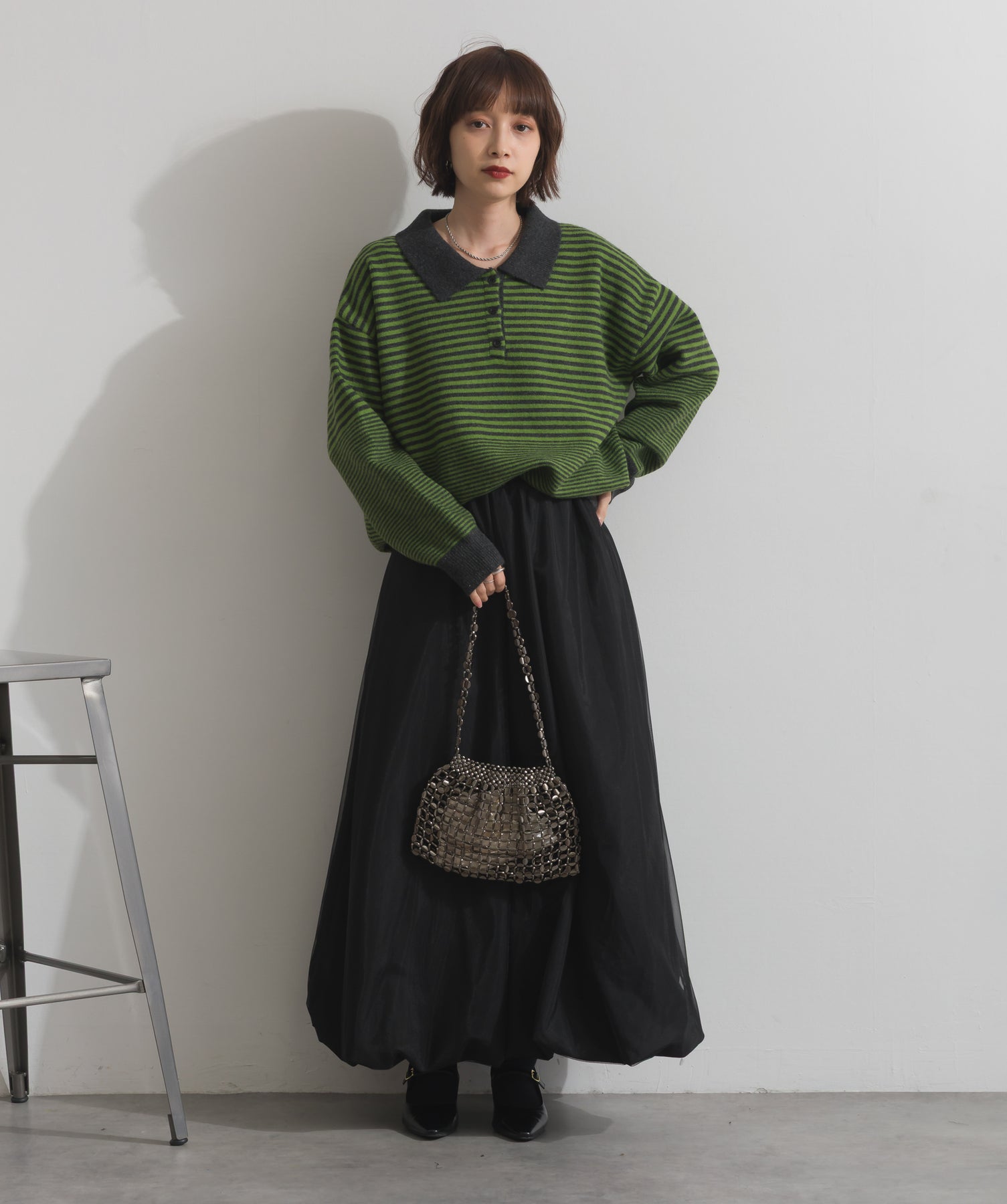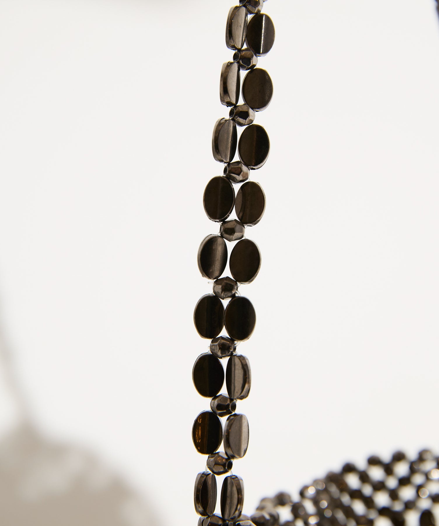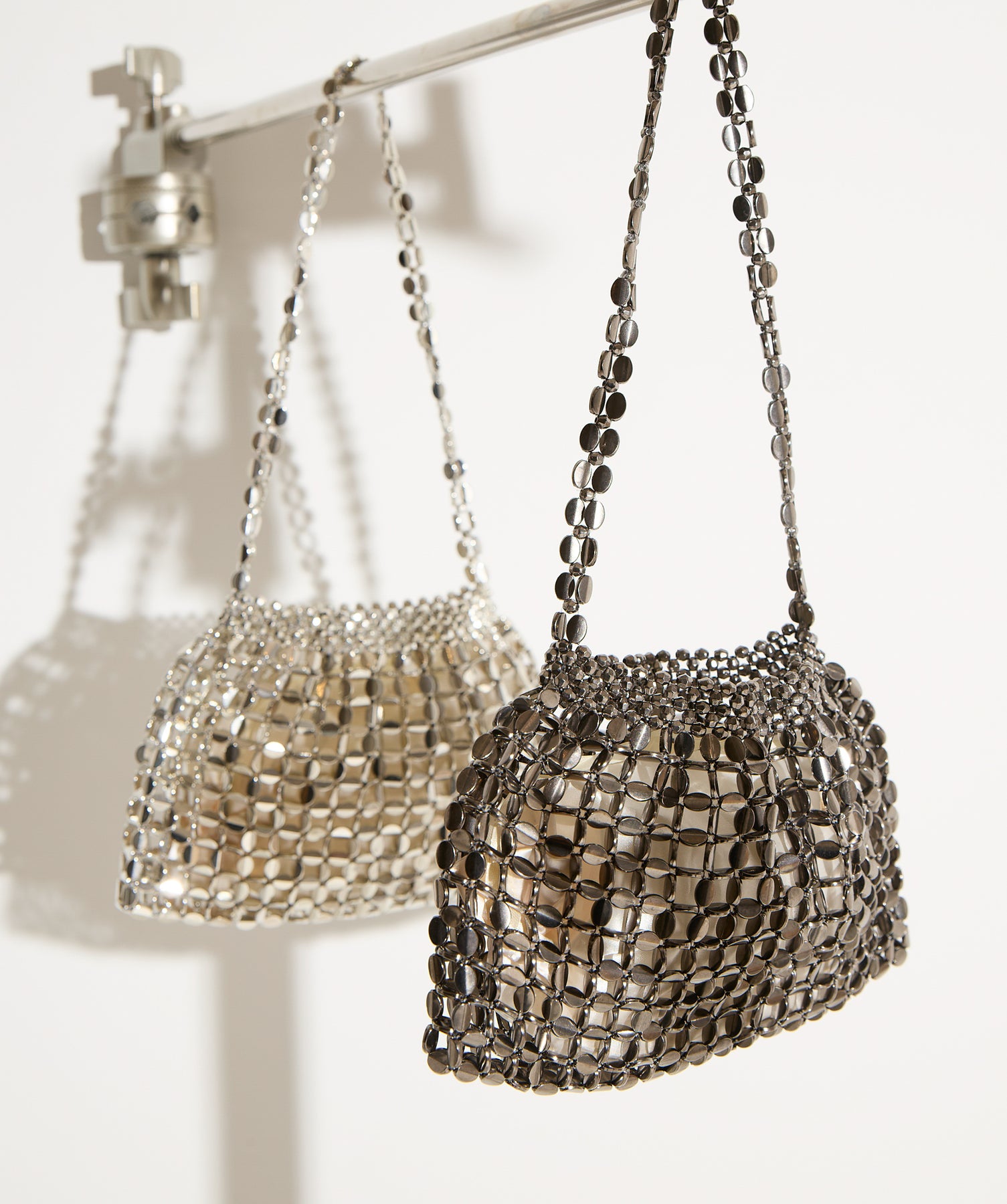 光で魅せる、主役級の存在感。-material-メタリックな輝きが目を惹く、軽量アルミチェーン素材を贅沢に使用。繊細ながら強度のある作りで、華奢な見た目以上の実用性を備えています。中には程よい光沢のサテン巾着付き。シアー感のある編み込みとのコントラストで、アイテム自体がアクセサリーのような仕上がりに。-design-シャープな印象を与えるチェーンバッグに、女性らしい丸みを持たせたニュアンスフォルムをミックス。コンパクトなサイズ感ながらも、ミニ財布やリップなど必要最低限のアイテムがしっかり入る設計。ショルダーとしてもハンド持ちでも映える、トレンドに左右されない洗練デザインです。スタイリングを一気に格上げするアクセントバッグとして、ナイトシーンはもちろん、あえてカジュアルに外すのもおすすめ。