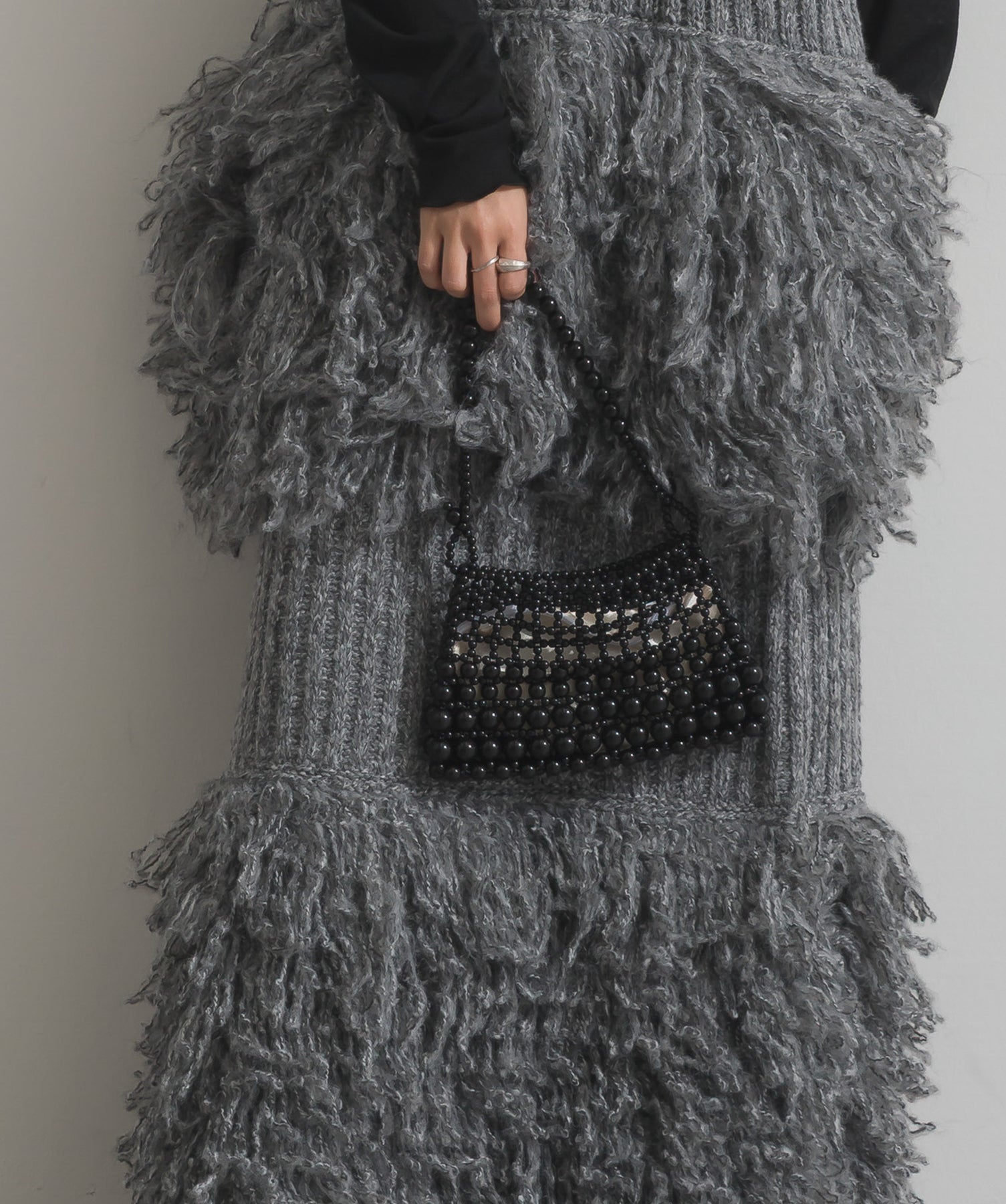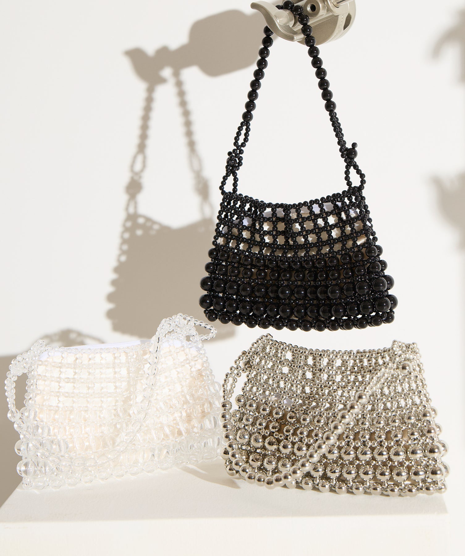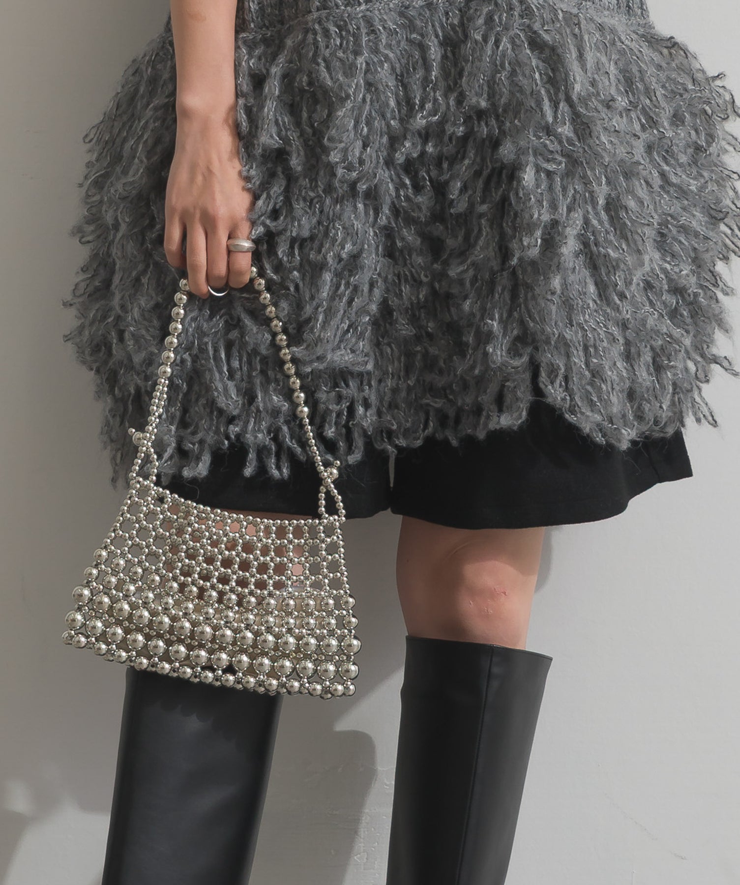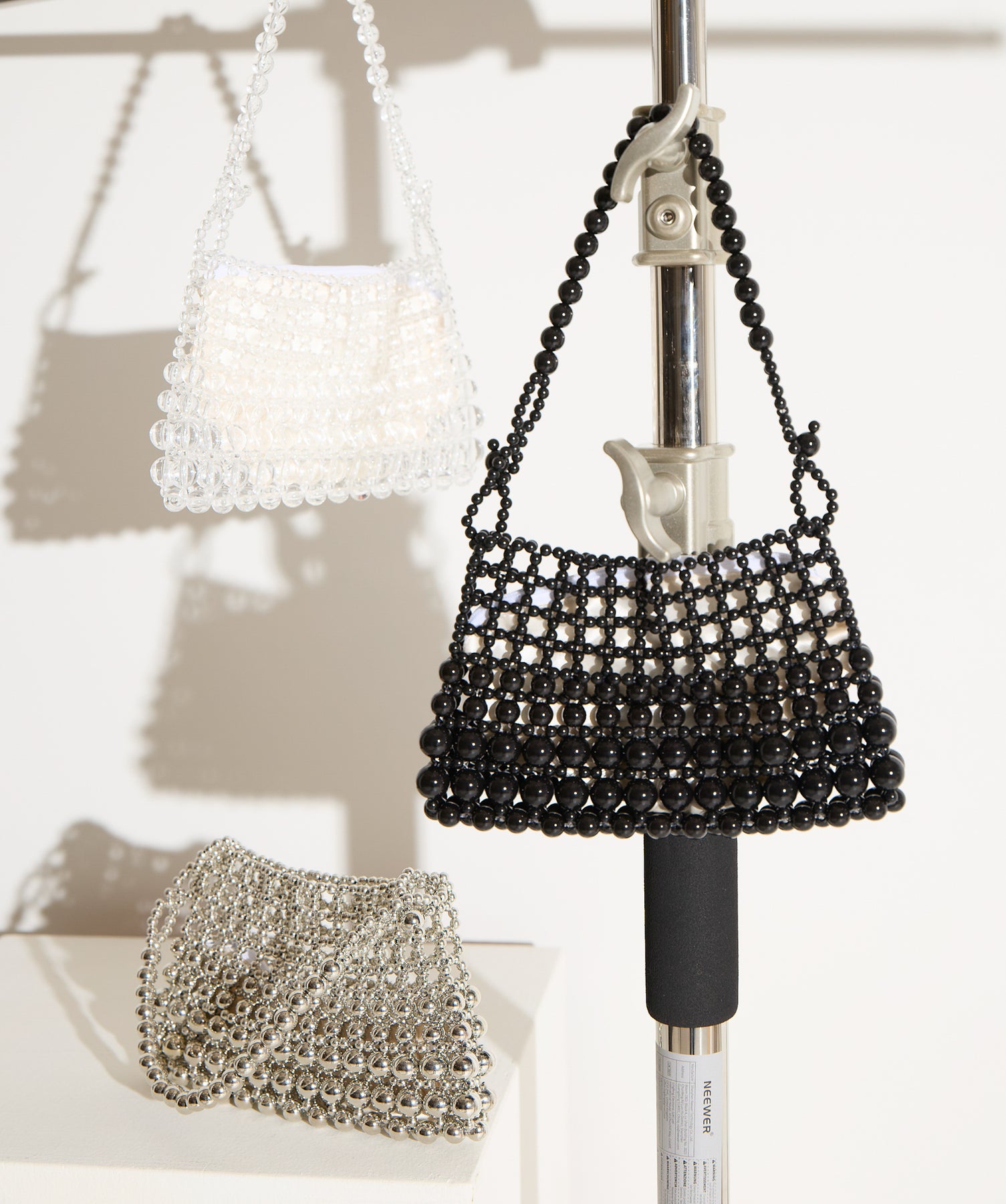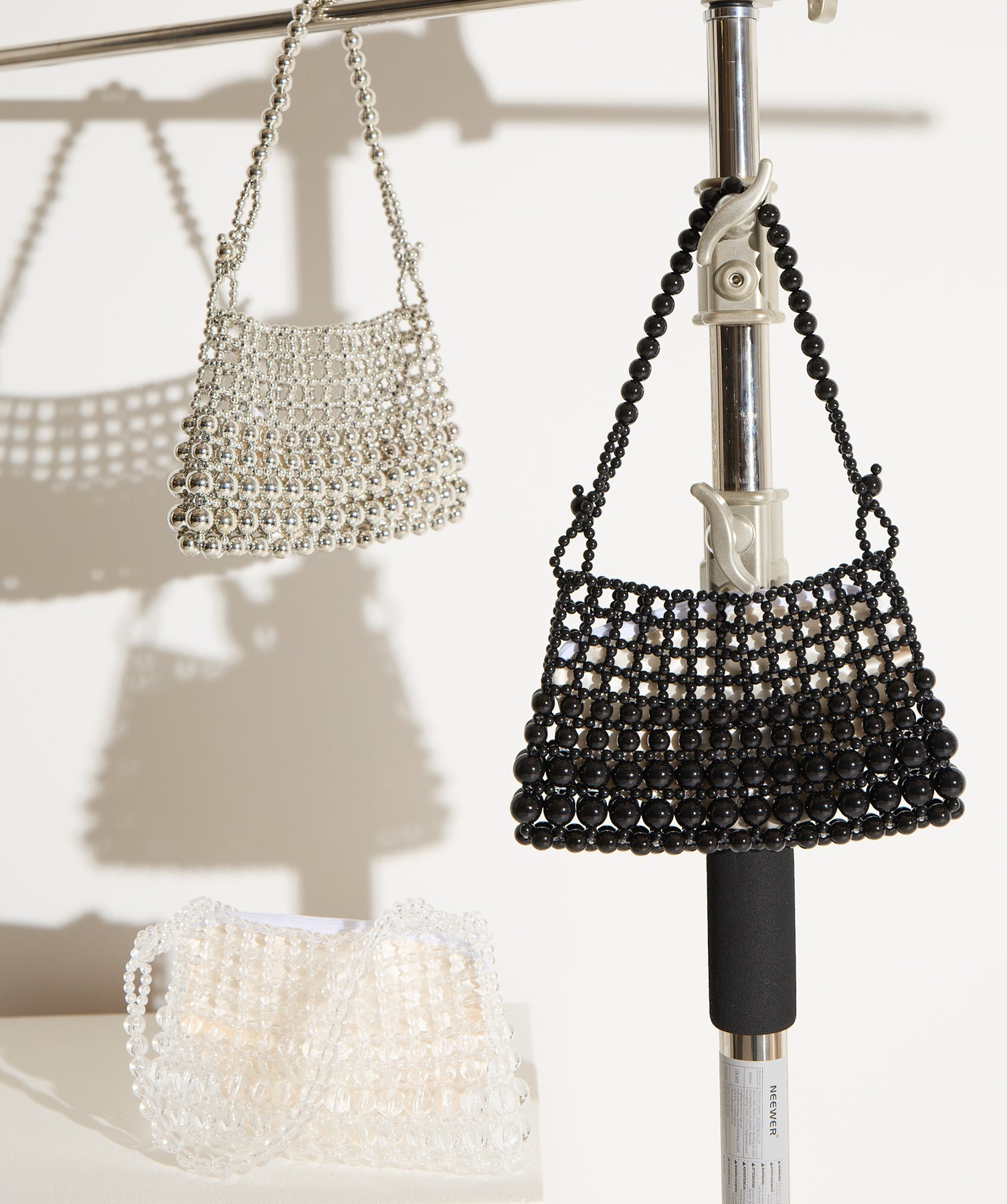 Sparkle with attitude. 個性が光る、艶めくビーズバッグ。-material-光を反射するグリッタービーズで編み上げたメッシュ構造。しっかりとした立体感がありながら、驚くほど軽量。中には布袋付きで、荷物の落下を防ぎつつ中身を見せないスマート仕様。-design-大胆でシャープなシルエットが魅力。クラシカルなハンドバッグ型をベースに、ビーズの抜け感とツヤでエッジィな雰囲気に昇華。デイリーからパーティシーンまで、アクセサリー感覚で使えるデザイン。