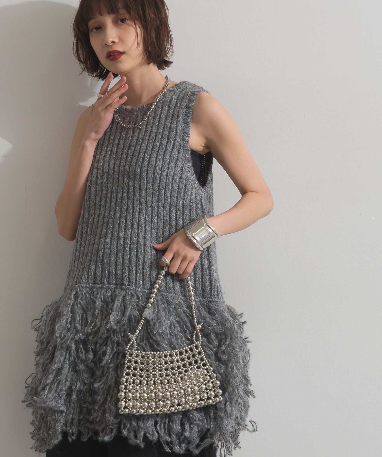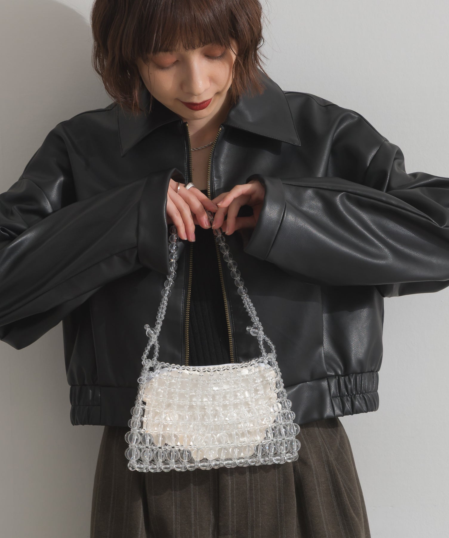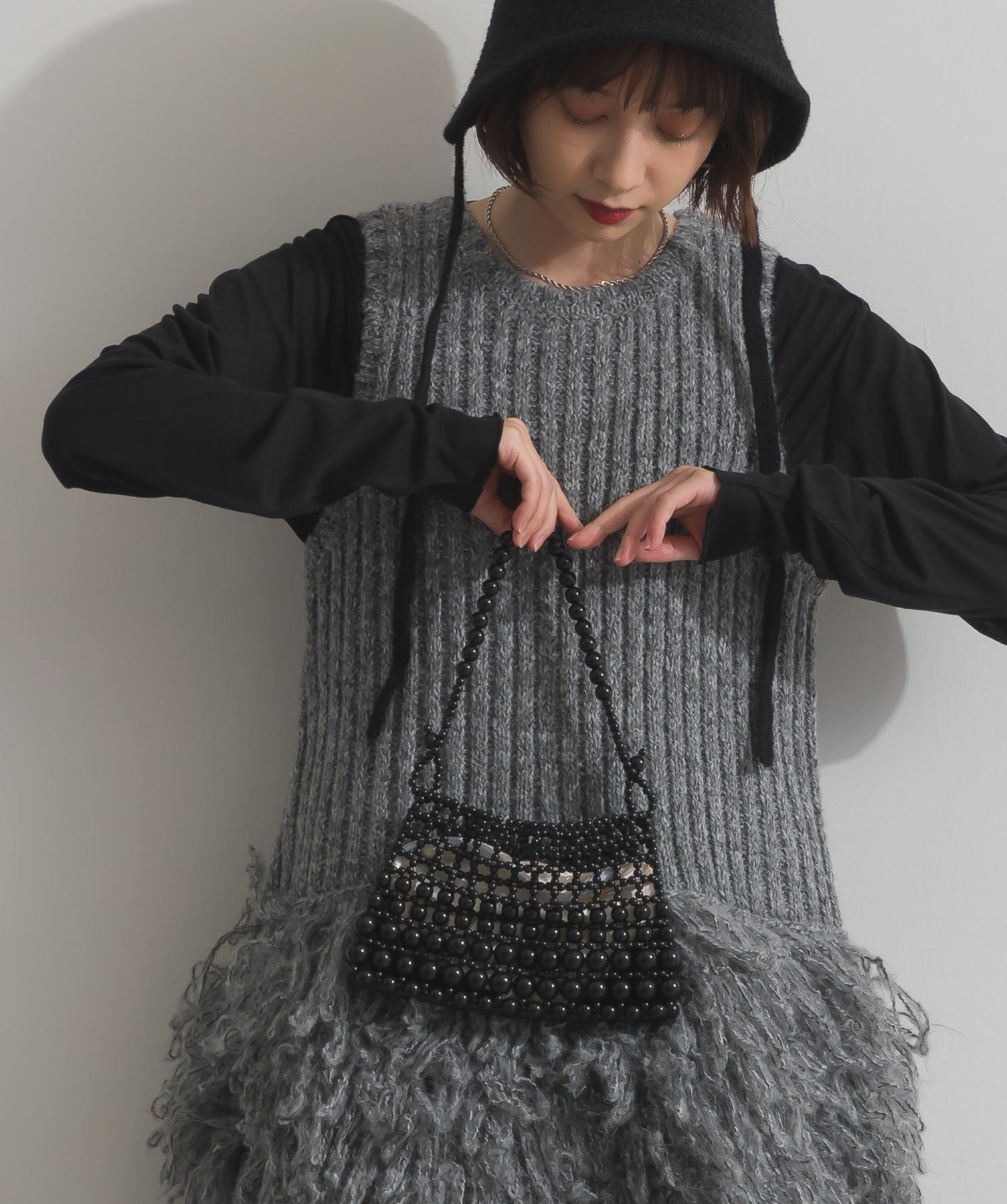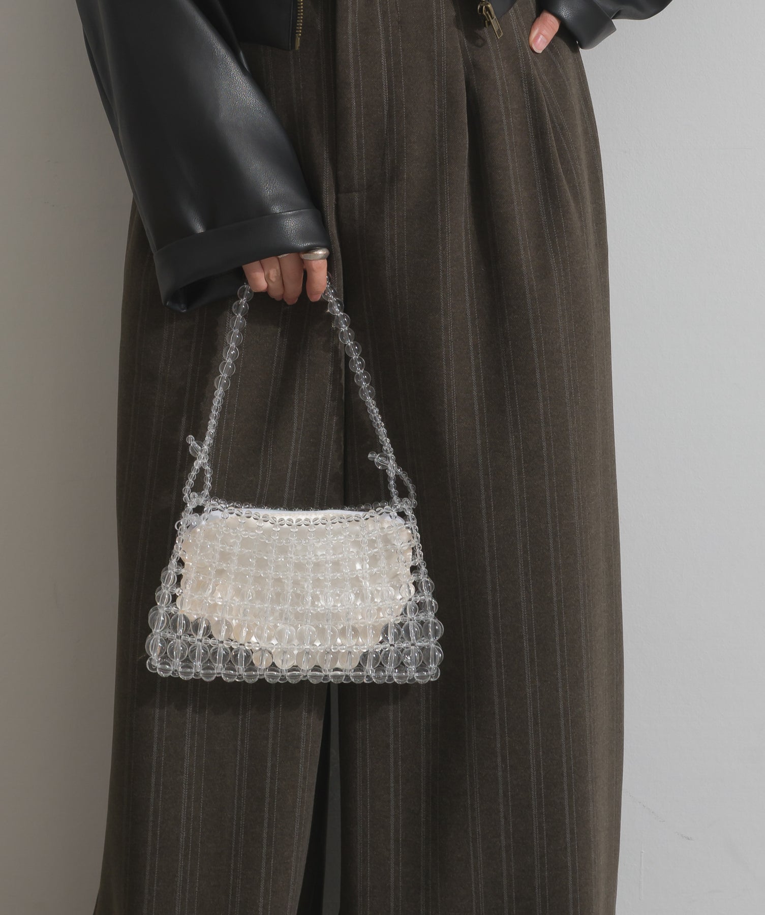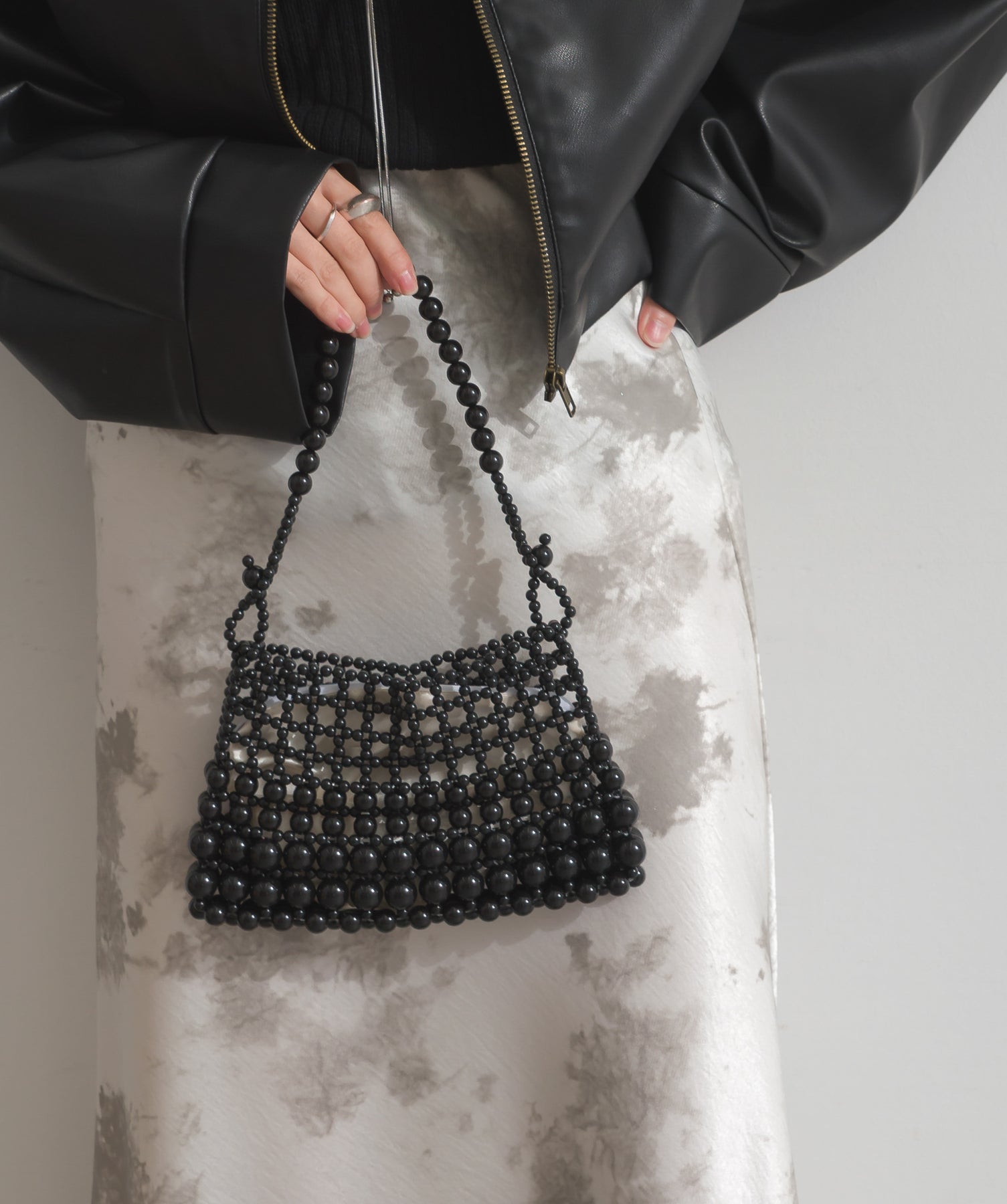 Sparkle with attitude. 個性が光る、艶めくビーズバッグ。-material-光を反射するグリッタービーズで編み上げたメッシュ構造。しっかりとした立体感がありながら、驚くほど軽量。中には布袋付きで、荷物の落下を防ぎつつ中身を見せないスマート仕様。-design-大胆でシャープなシルエットが魅力。クラシカルなハンドバッグ型をベースに、ビーズの抜け感とツヤでエッジィな雰囲気に昇華。デイリーからパーティシーンまで、アクセサリー感覚で使えるデザイン。