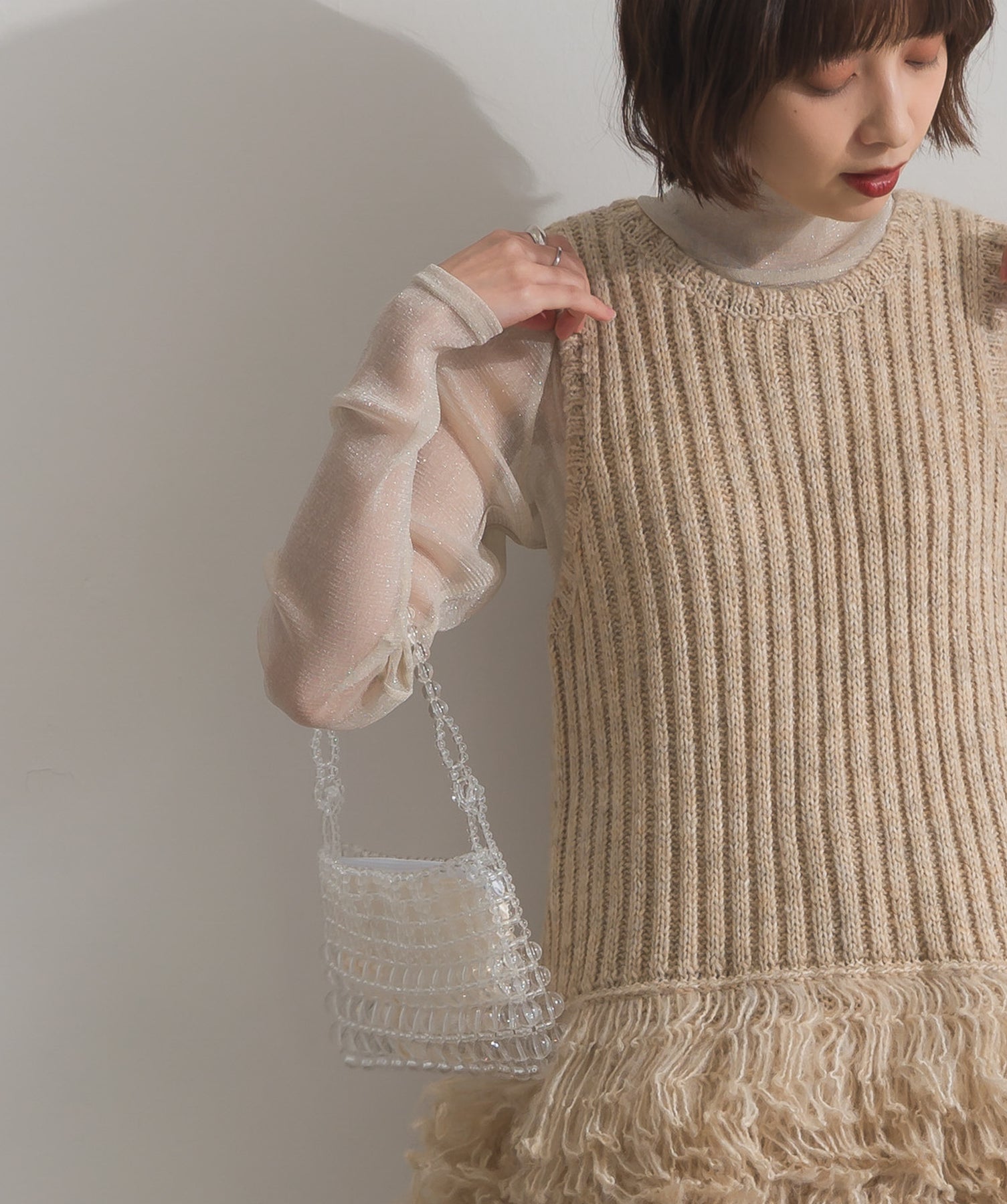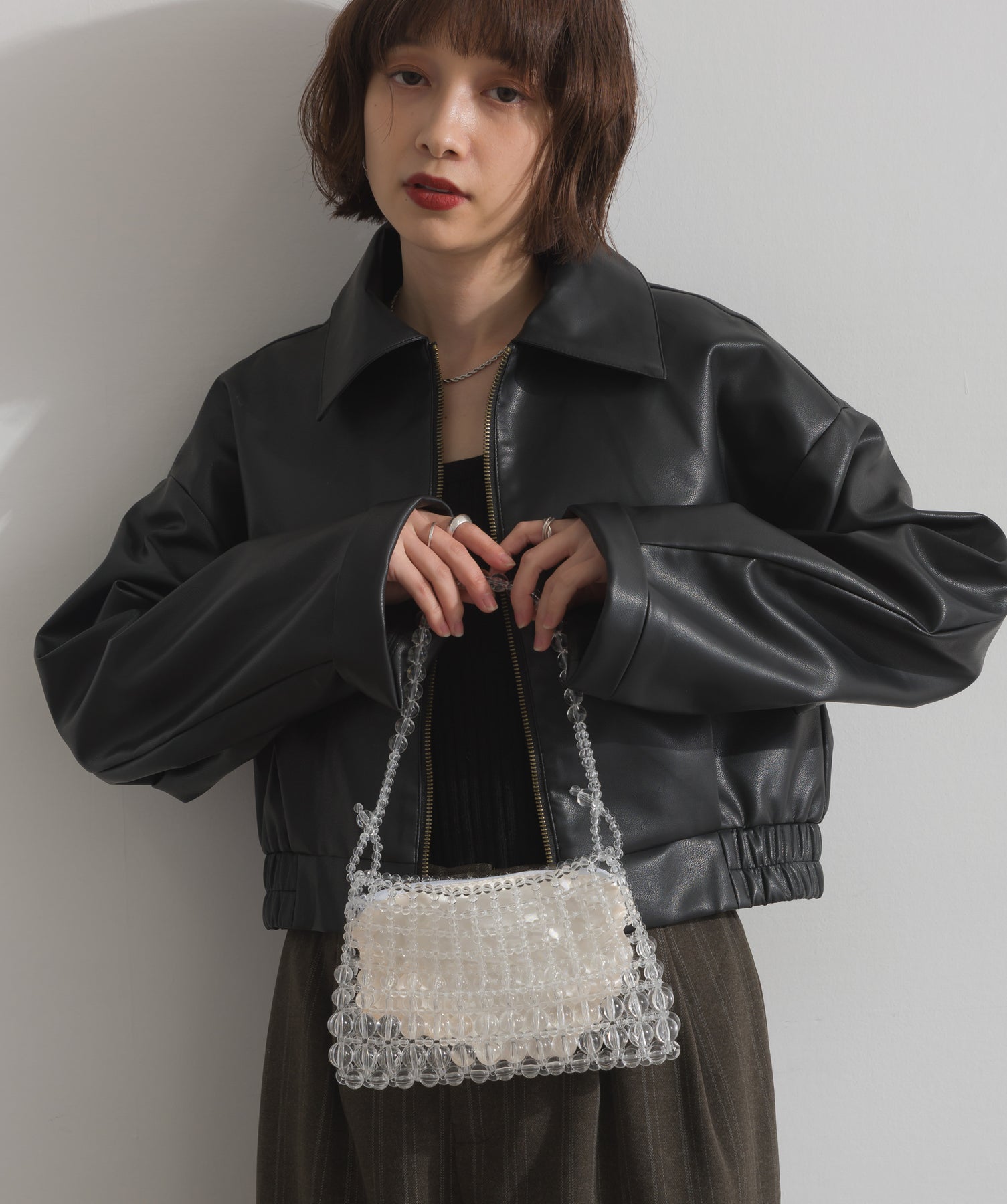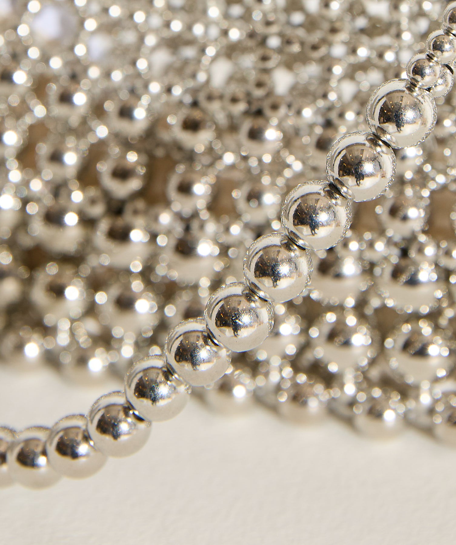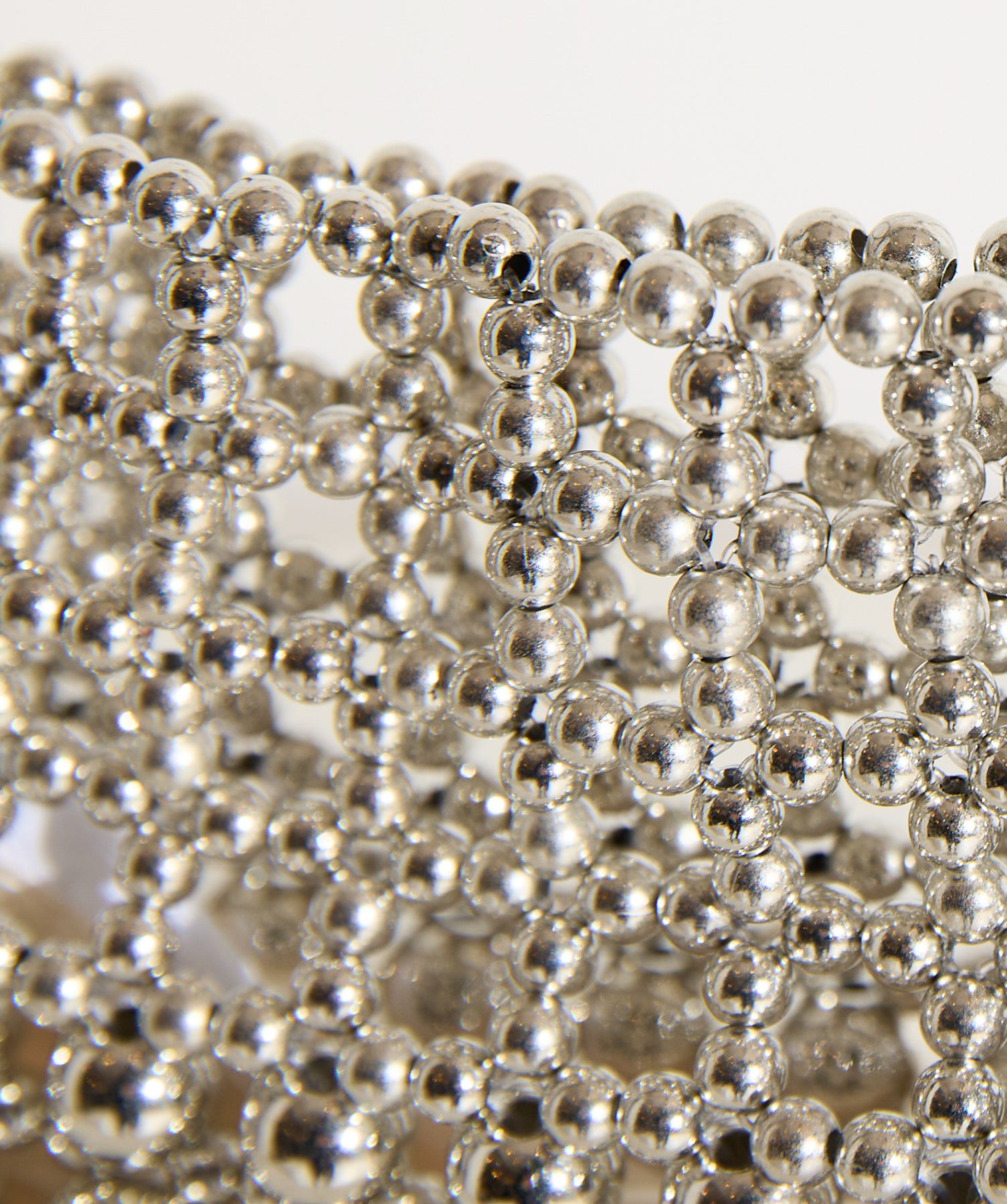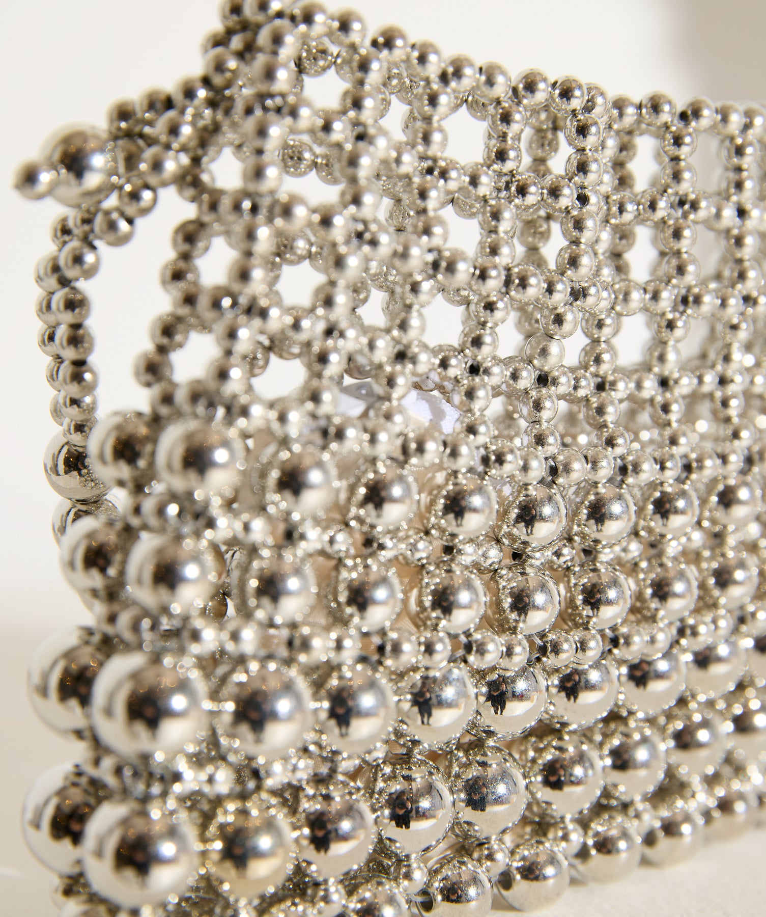 Sparkle with attitude. 個性が光る、艶めくビーズバッグ。-material-光を反射するグリッタービーズで編み上げたメッシュ構造。しっかりとした立体感がありながら、驚くほど軽量。中には布袋付きで、荷物の落下を防ぎつつ中身を見せないスマート仕様。-design-大胆でシャープなシルエットが魅力。クラシカルなハンドバッグ型をベースに、ビーズの抜け感とツヤでエッジィな雰囲気に昇華。デイリーからパーティシーンまで、アクセサリー感覚で使えるデザイン。