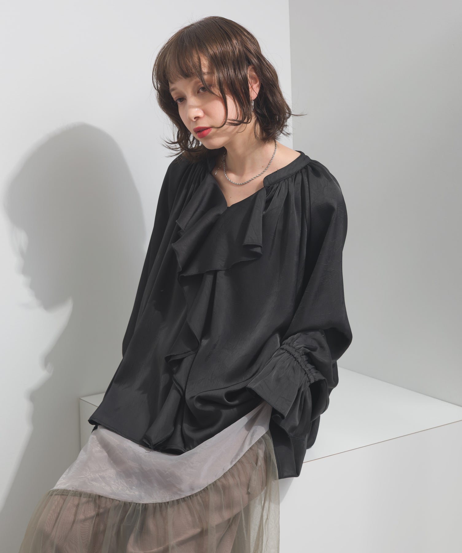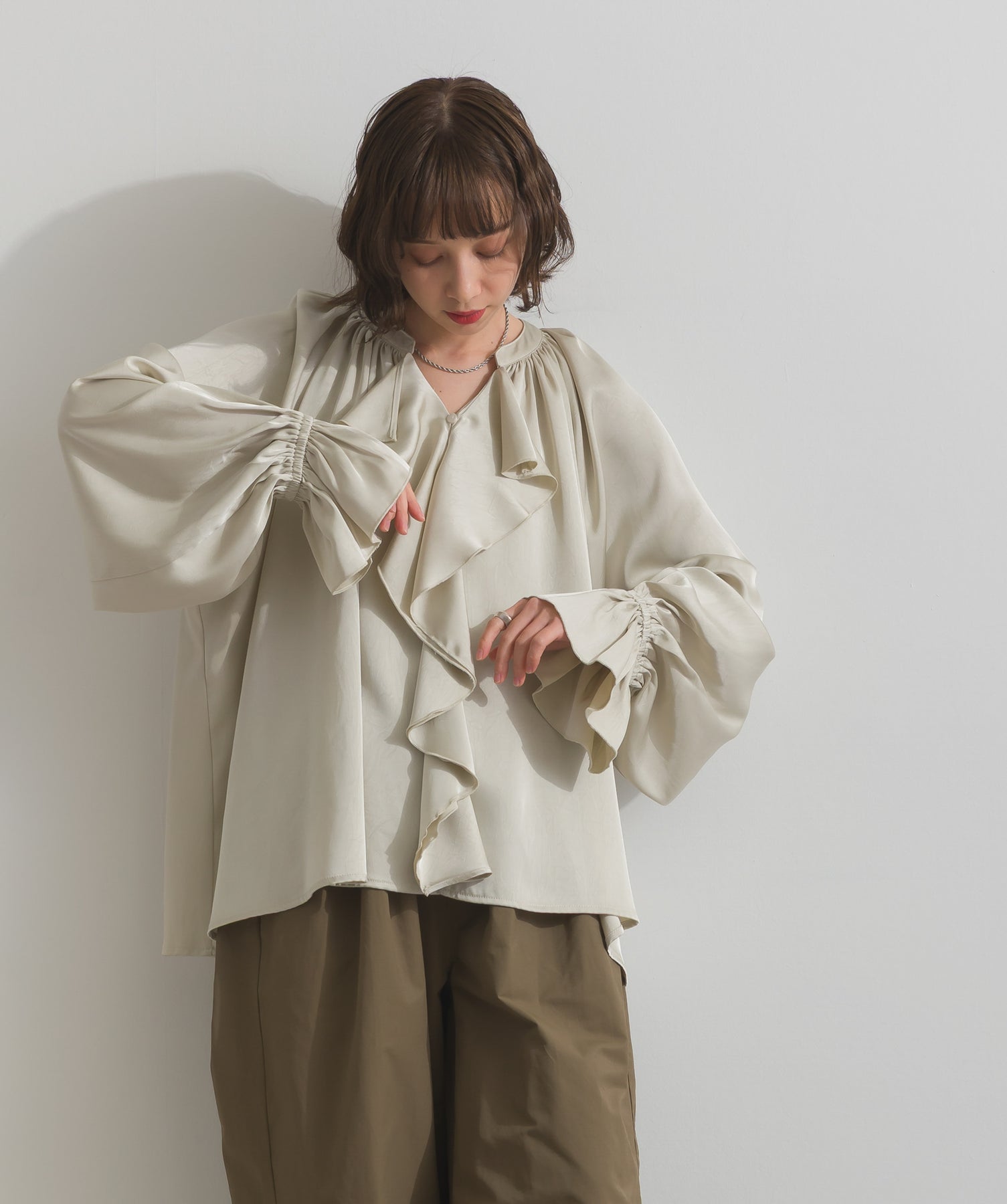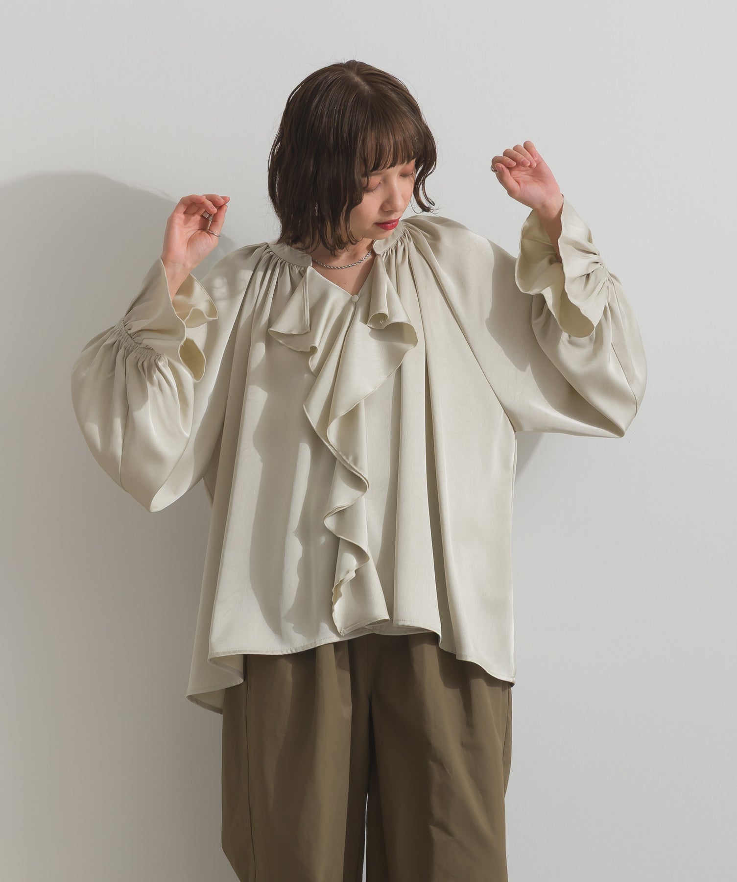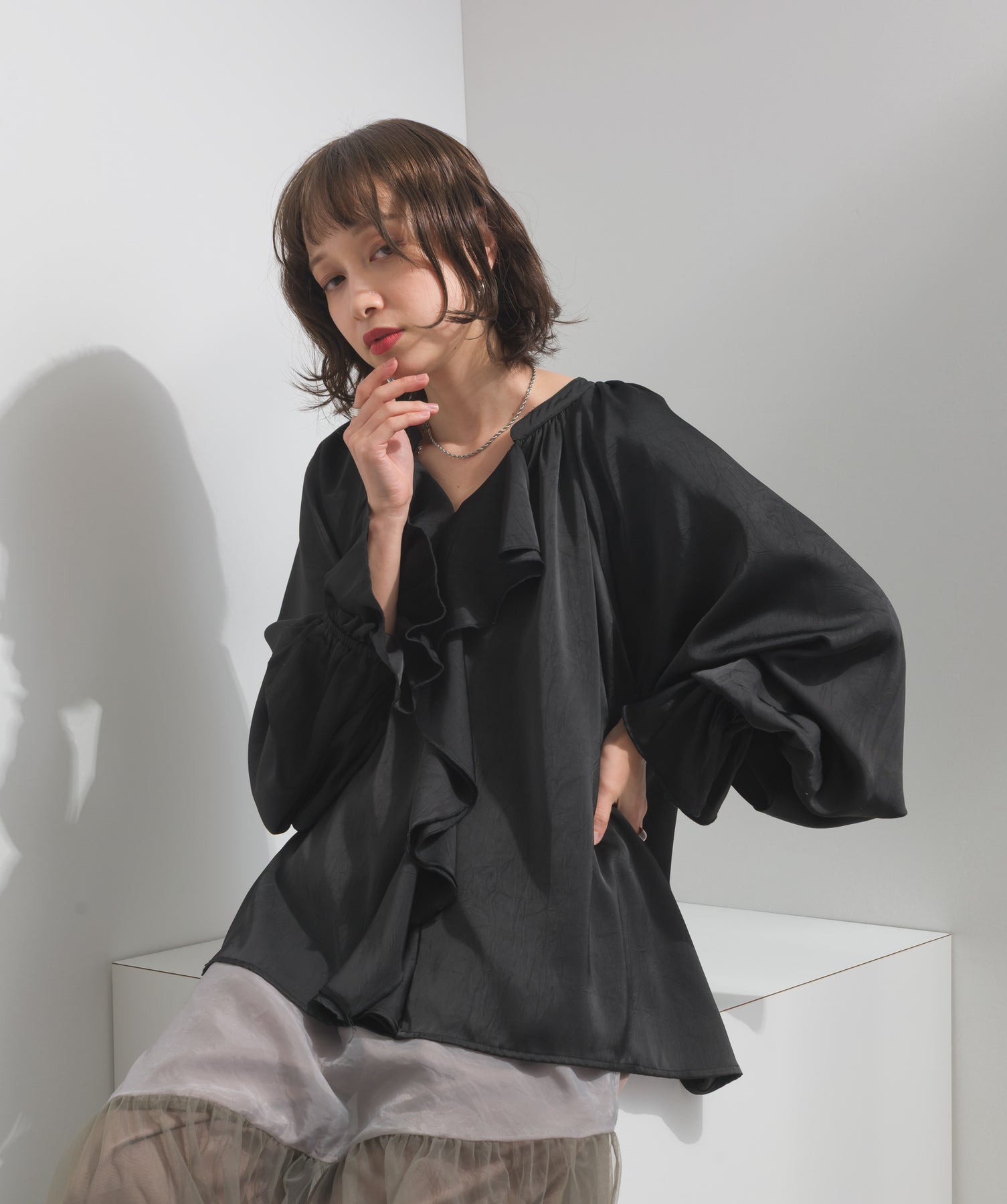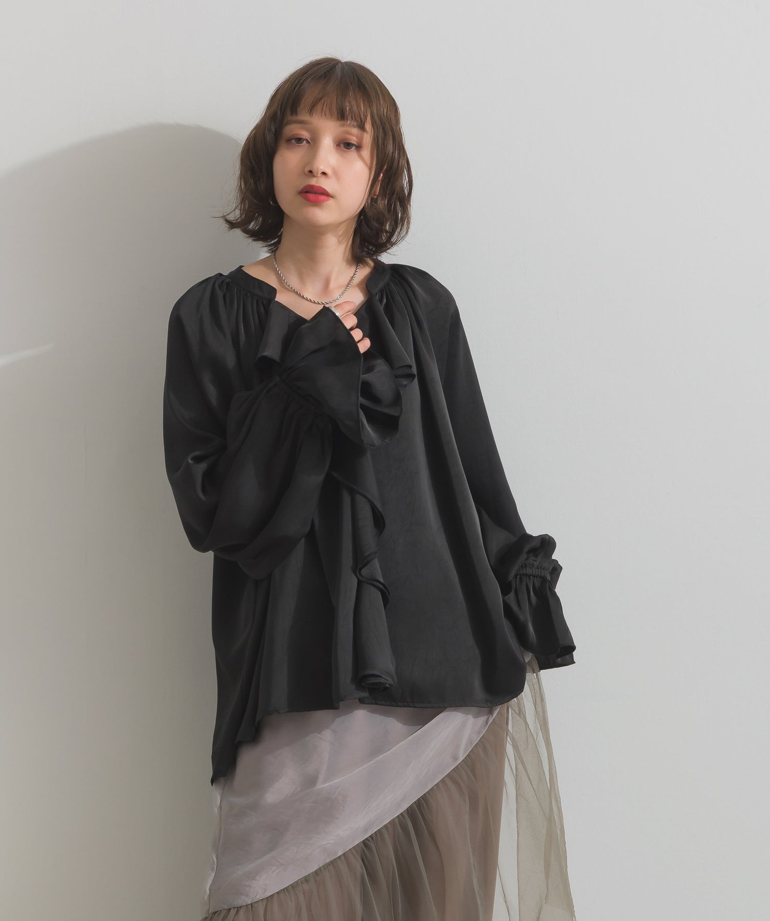 纏うだけで洗練。ドラマティックな存在感を放つ主役ブラウス-material-上品な光沢感と程よいハリのあるサテン調素材を使用。軽やかなのに落ち感が美しく、シーズンレスで着まわせる万能感も魅力です。肌触りがなめらかで、着心地の良さにも配慮されています。-design-大胆なフロントフリルとギャザーデザインが目を引く、フェミニンとモードを両立したブラウス。ボリューム感のあるスリーブとゆとりあるシルエットが、こなれ感と華やかさを演出。パンツにもスカートにも映える丈感で、スタイリングの主役になる1枚です。 ドレスアップにもデイリーにも馴染み、アクセ要らずで映える洗練デザイン。
