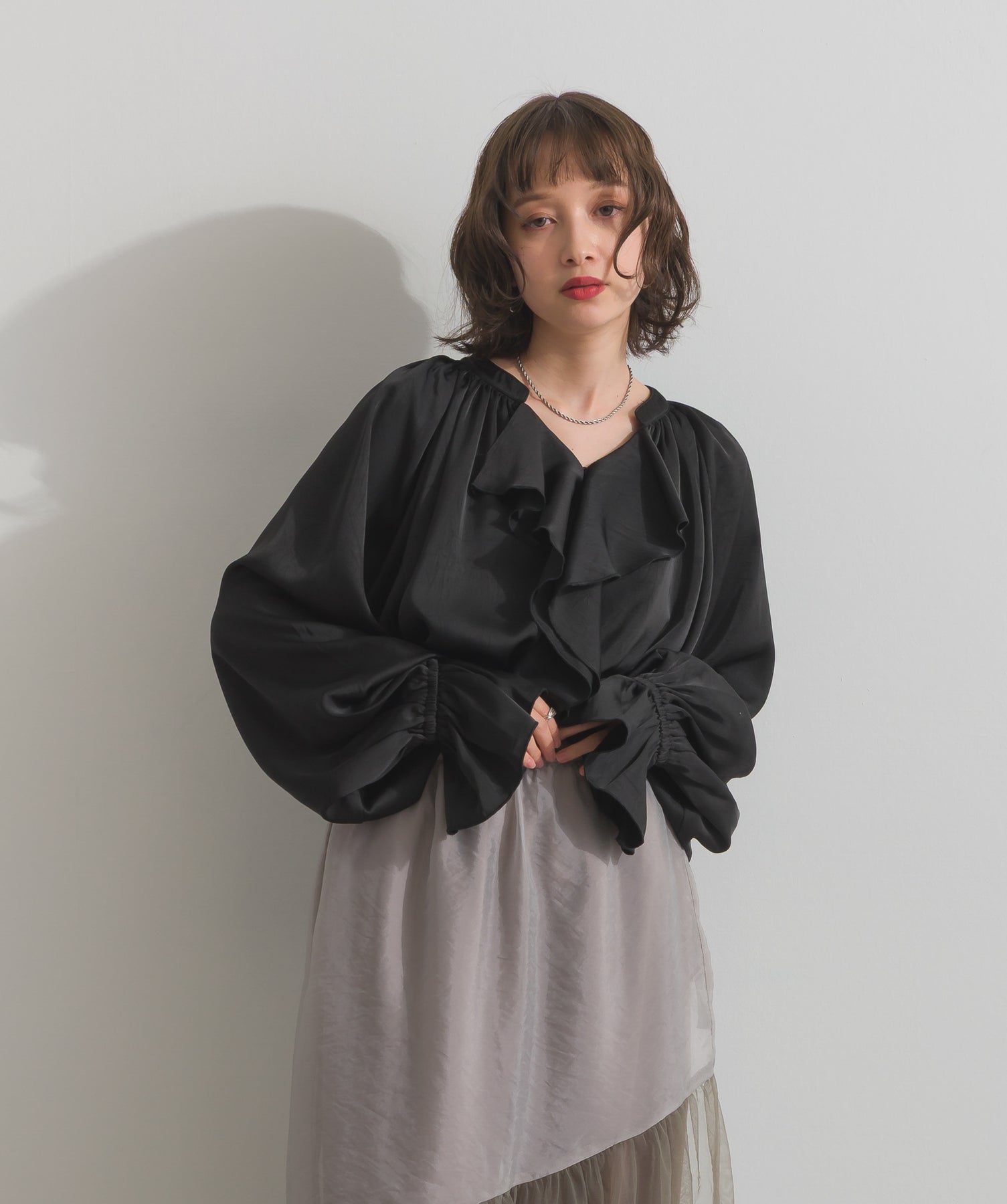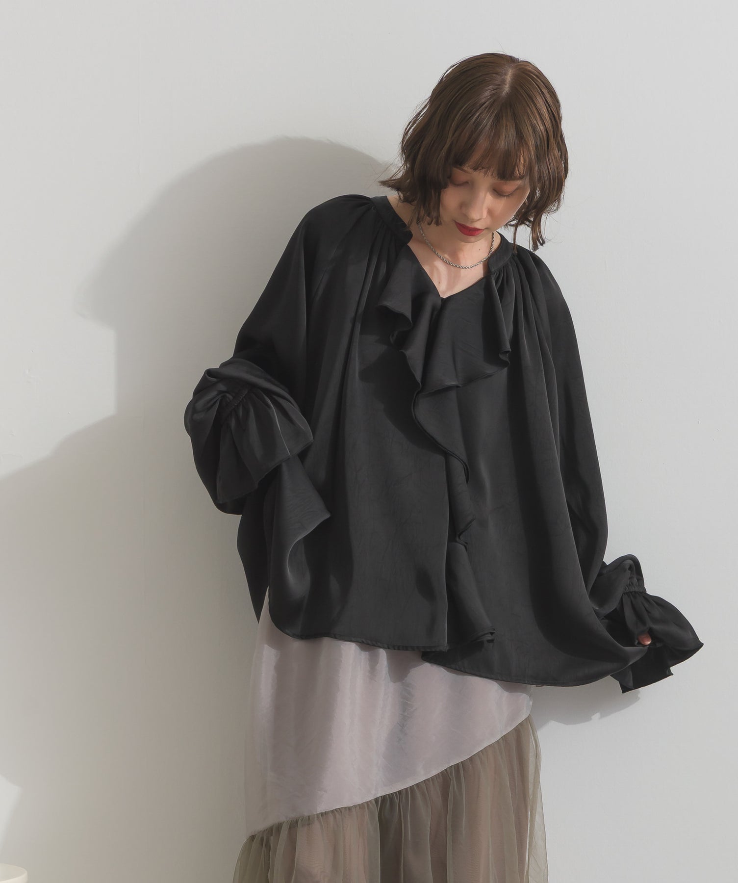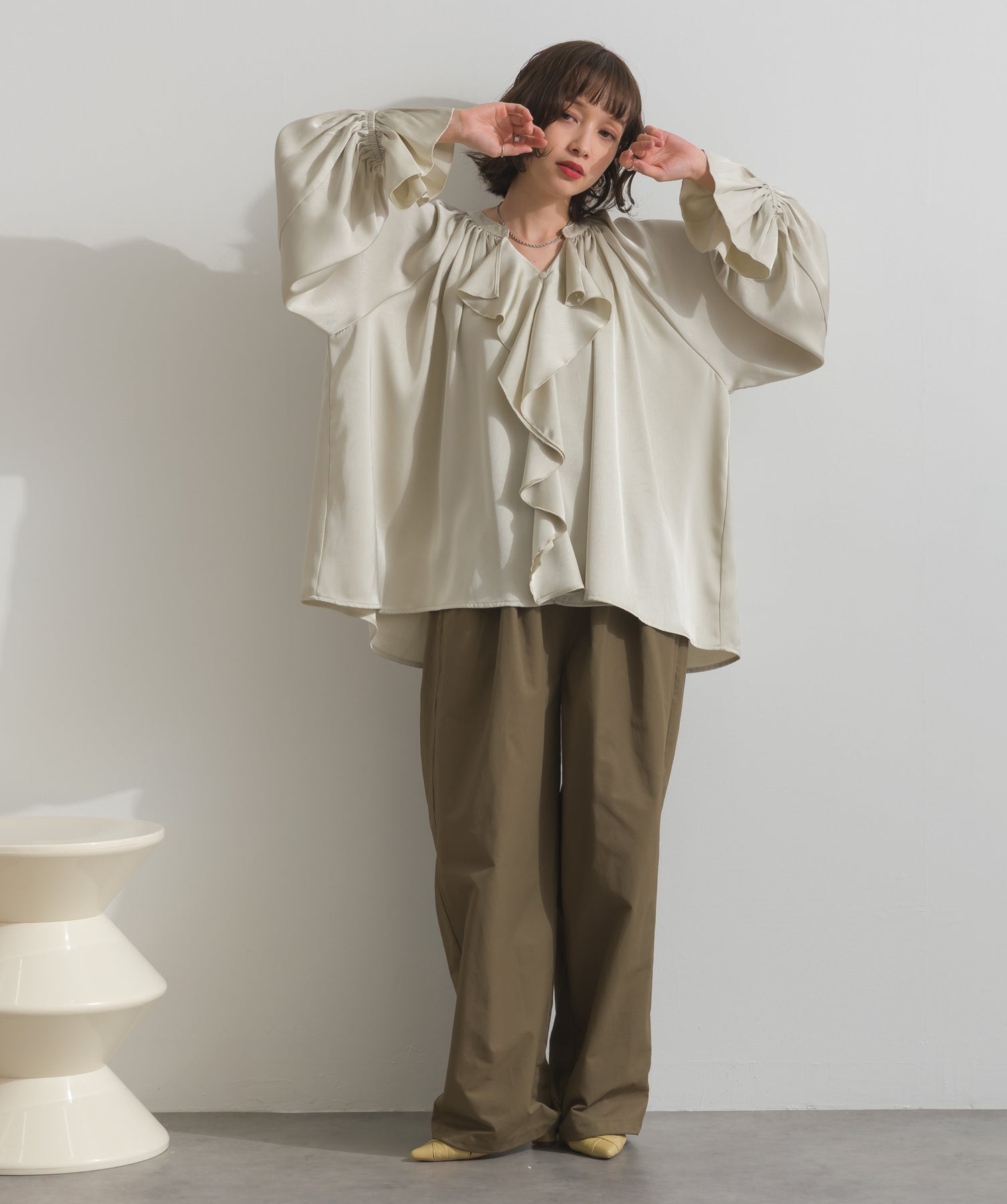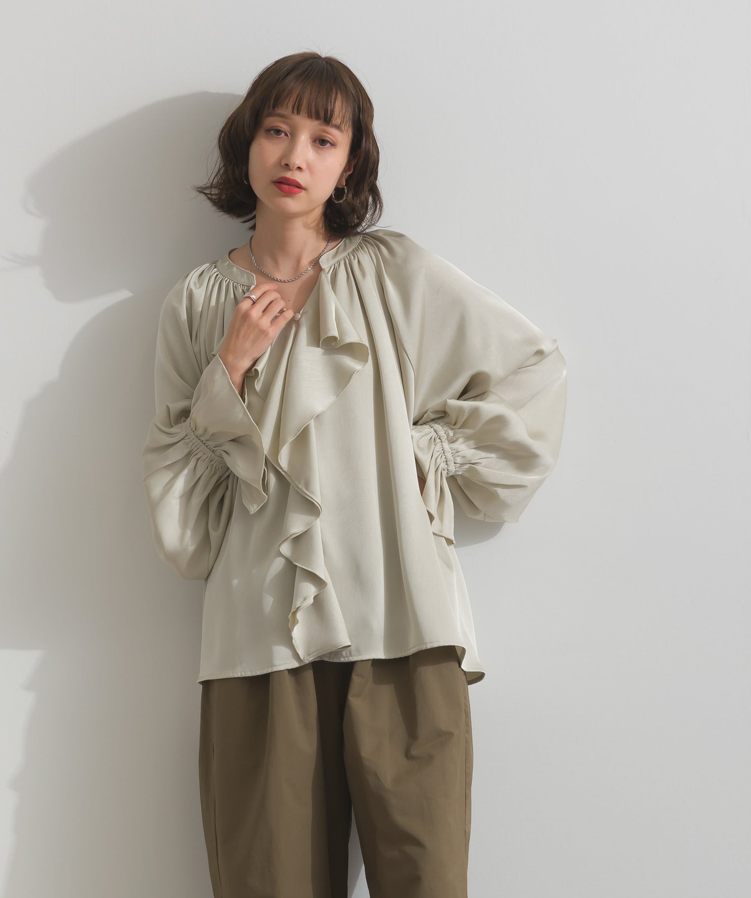 纏うだけで洗練。ドラマティックな存在感を放つ主役ブラウス-material-上品な光沢感と程よいハリのあるサテン調素材を使用。軽やかなのに落ち感が美しく、シーズンレスで着まわせる万能感も魅力です。肌触りがなめらかで、着心地の良さにも配慮されています。-design-大胆なフロントフリルとギャザーデザインが目を引く、フェミニンとモードを両立したブラウス。ボリューム感のあるスリーブとゆとりあるシルエットが、こなれ感と華やかさを演出。パンツにもスカートにも映える丈感で、スタイリングの主役になる1枚です。 ドレスアップにもデイリーにも馴染み、アクセ要らずで映える洗練デザイン。