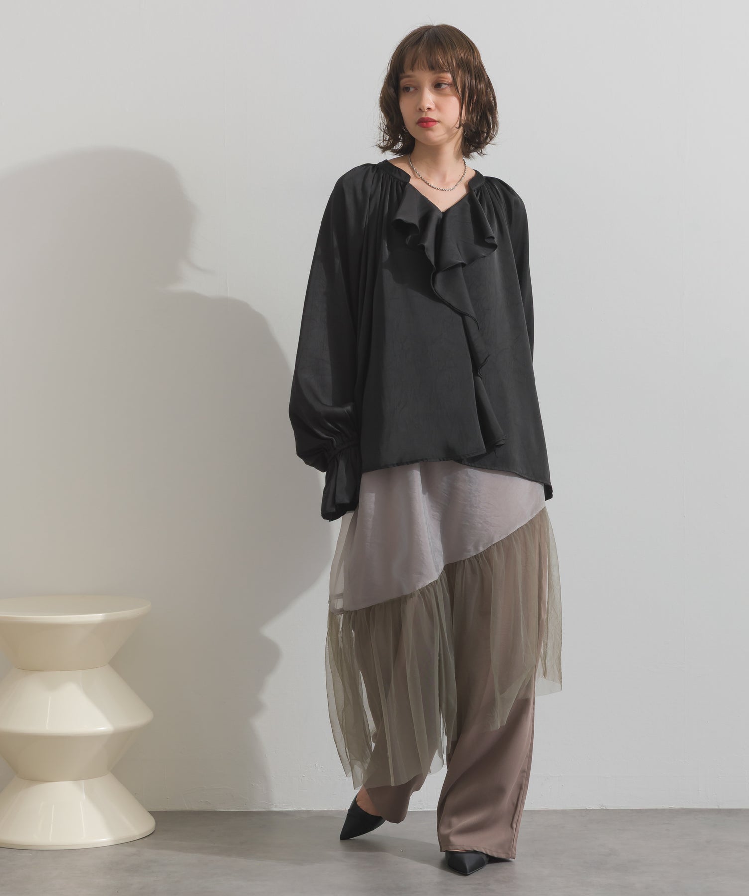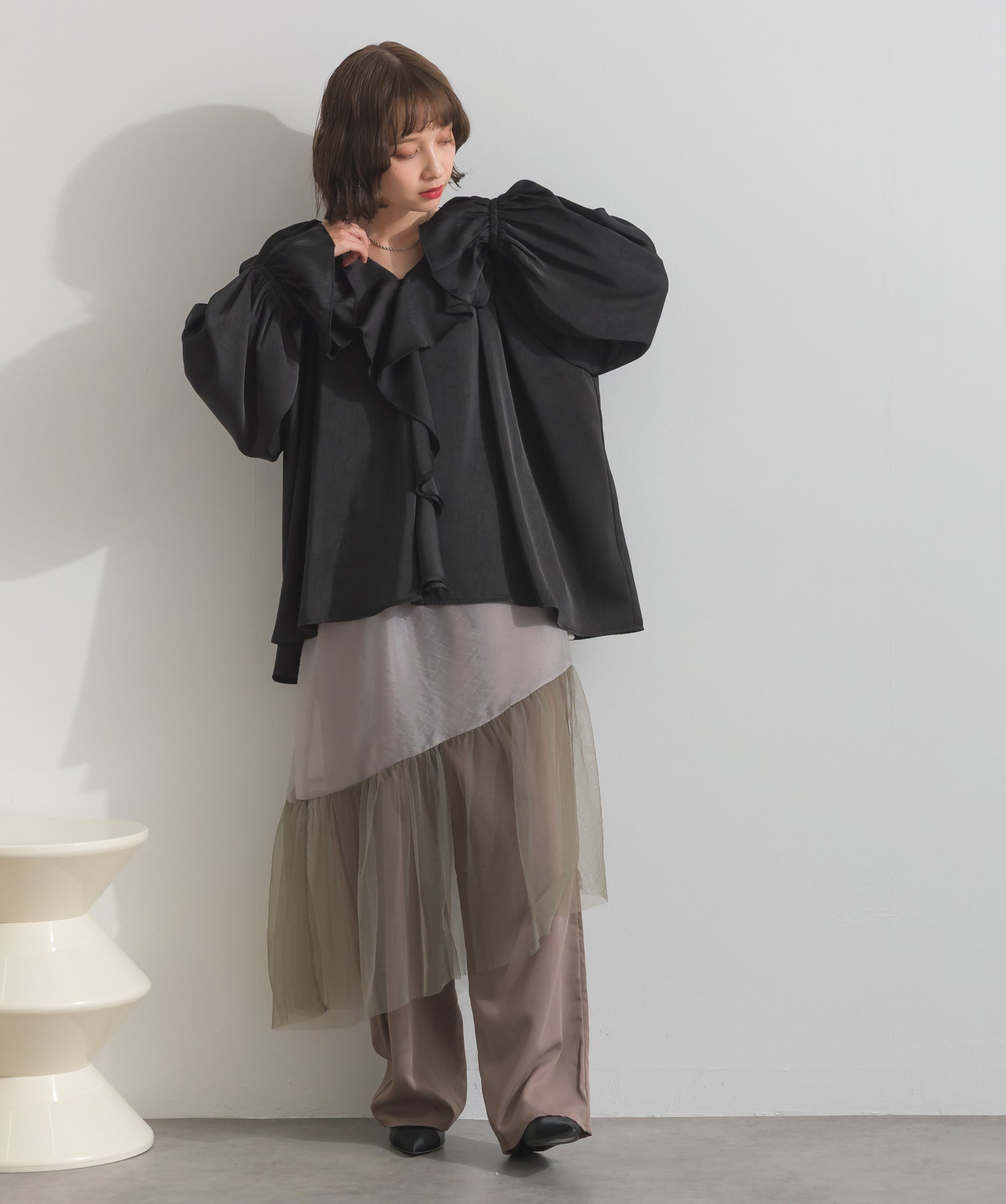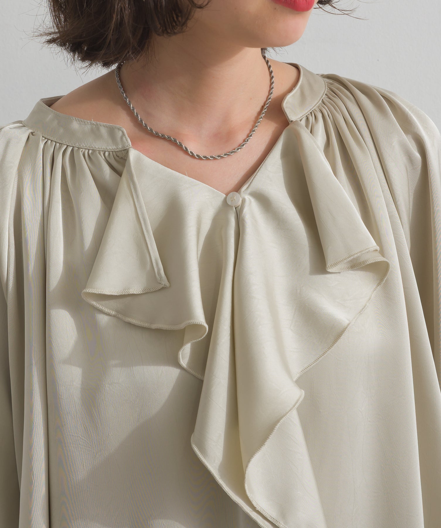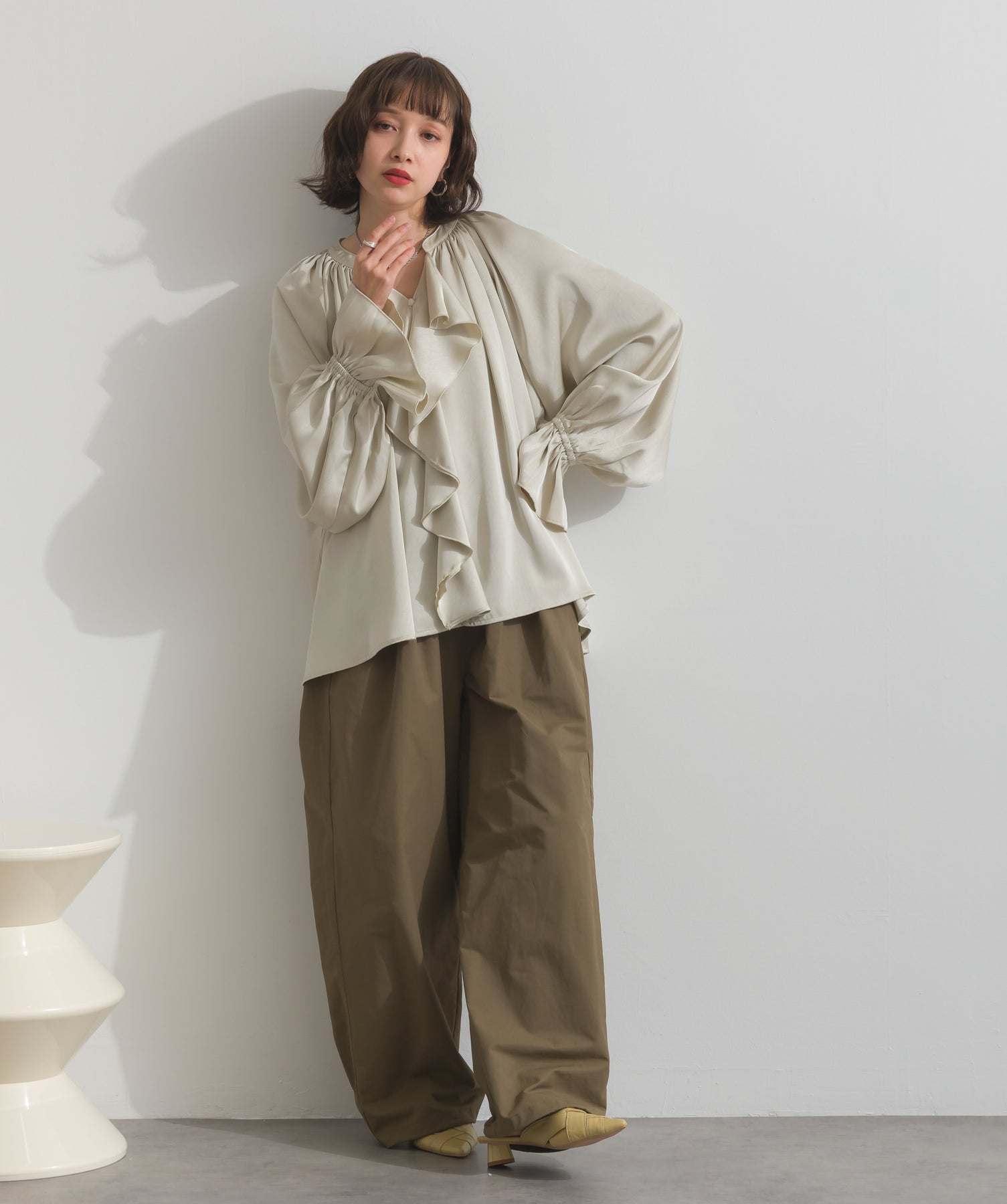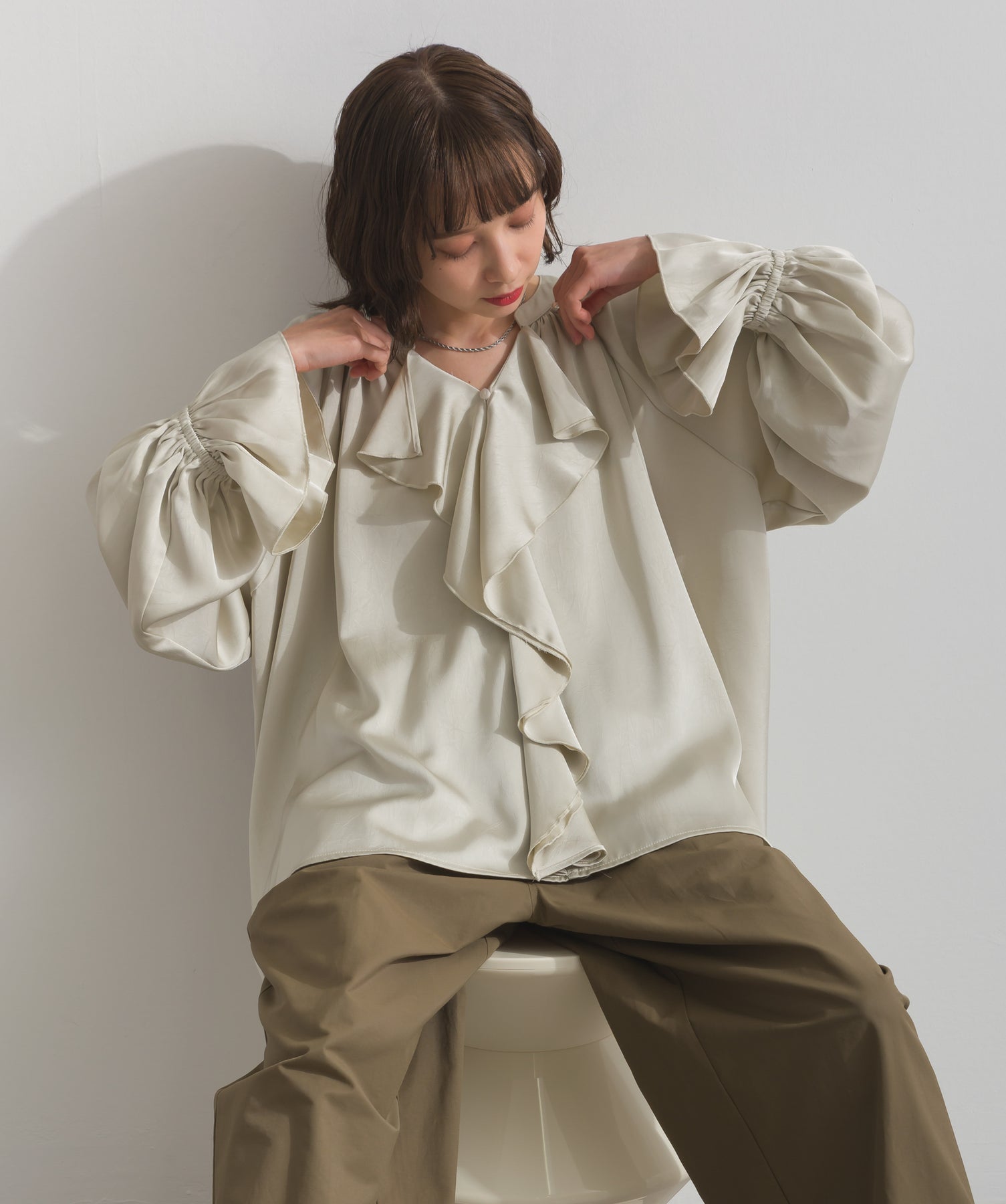 纏うだけで洗練。ドラマティックな存在感を放つ主役ブラウス-material-上品な光沢感と程よいハリのあるサテン調素材を使用。軽やかなのに落ち感が美しく、シーズンレスで着まわせる万能感も魅力です。肌触りがなめらかで、着心地の良さにも配慮されています。-design-大胆なフロントフリルとギャザーデザインが目を引く、フェミニンとモードを両立したブラウス。ボリューム感のあるスリーブとゆとりあるシルエットが、こなれ感と華やかさを演出。パンツにもスカートにも映える丈感で、スタイリングの主役になる1枚です。 ドレスアップにもデイリーにも馴染み、アクセ要らずで映える洗練デザイン。