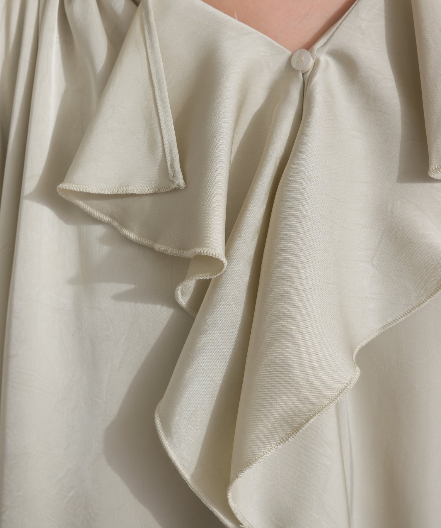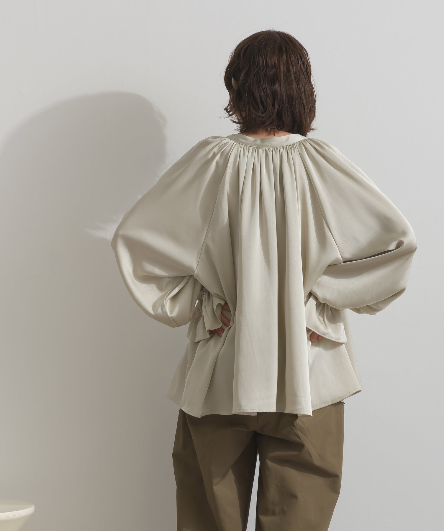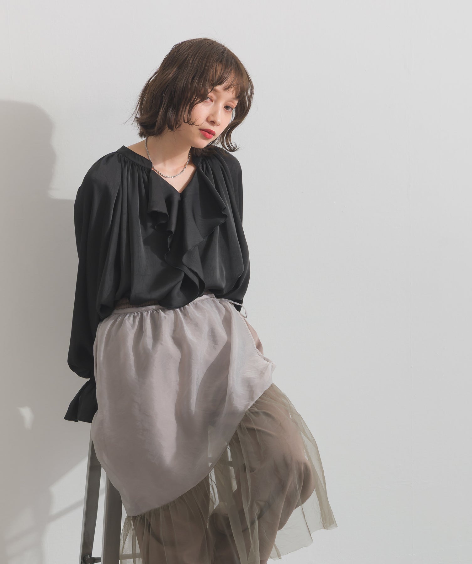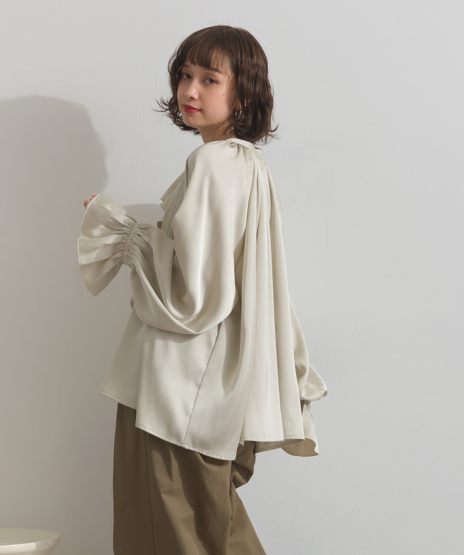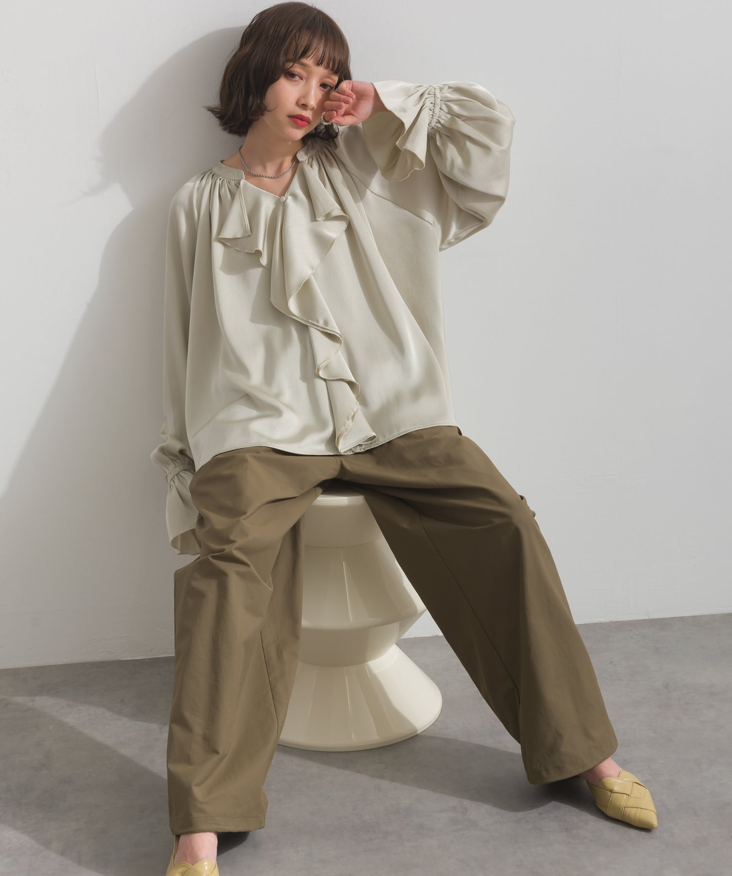 纏うだけで洗練。ドラマティックな存在感を放つ主役ブラウス-material-上品な光沢感と程よいハリのあるサテン調素材を使用。軽やかなのに落ち感が美しく、シーズンレスで着まわせる万能感も魅力です。肌触りがなめらかで、着心地の良さにも配慮されています。-design-大胆なフロントフリルとギャザーデザインが目を引く、フェミニンとモードを両立したブラウス。ボリューム感のあるスリーブとゆとりあるシルエットが、こなれ感と華やかさを演出。パンツにもスカートにも映える丈感で、スタイリングの主役になる1枚です。 ドレスアップにもデイリーにも馴染み、アクセ要らずで映える洗練デザイン。