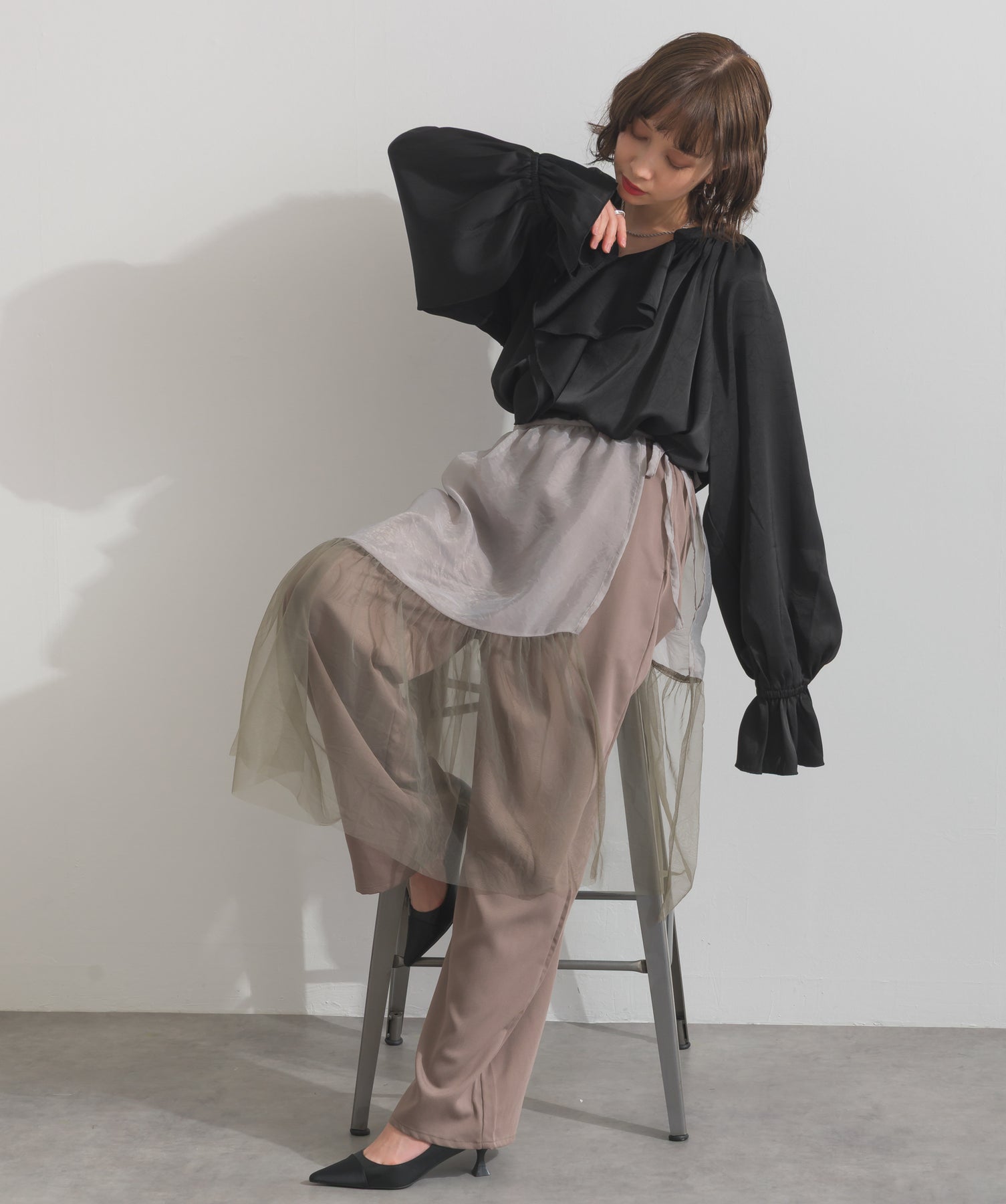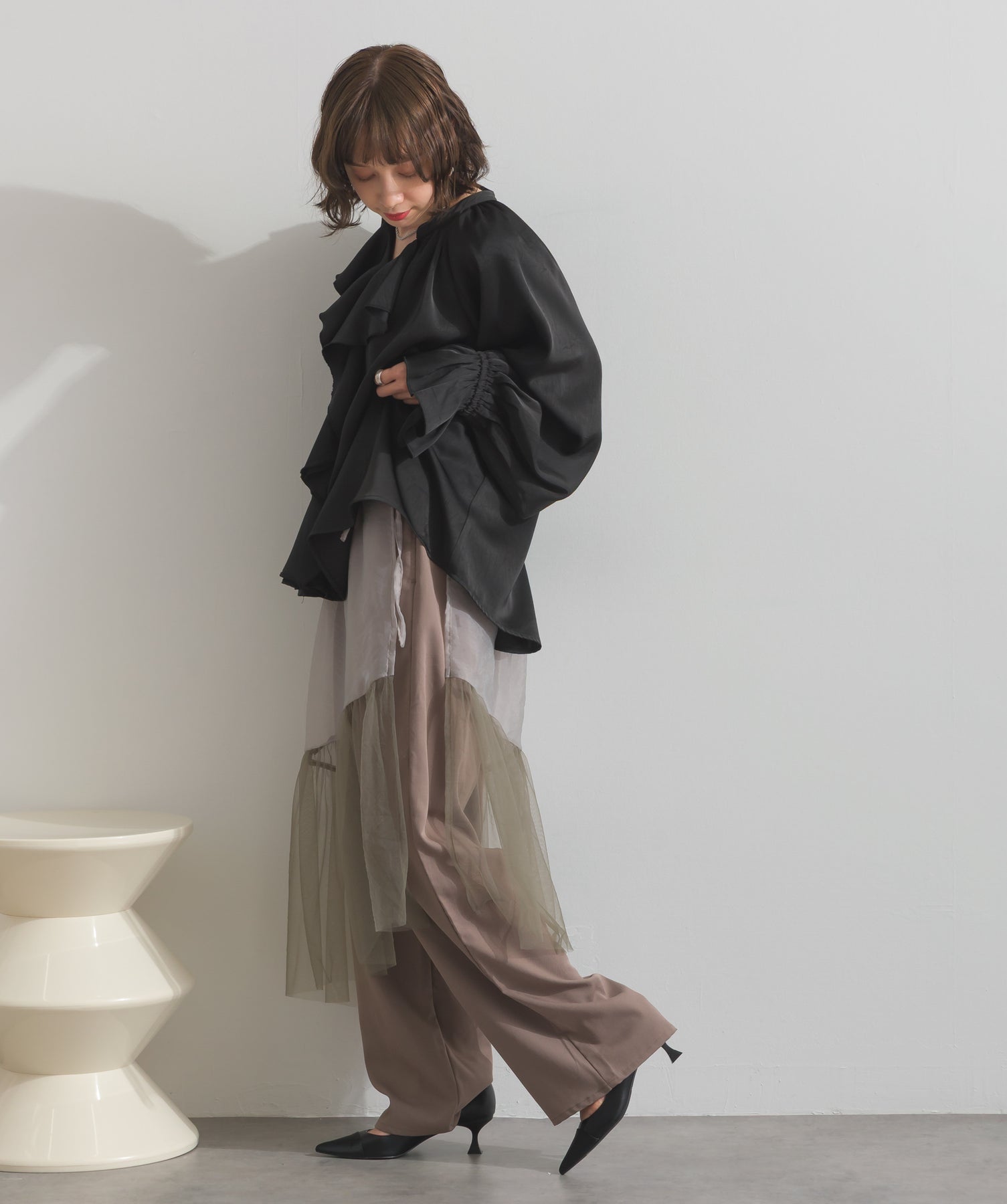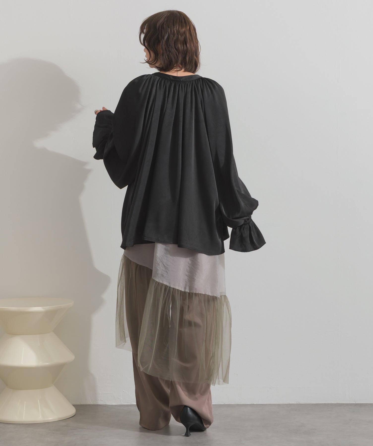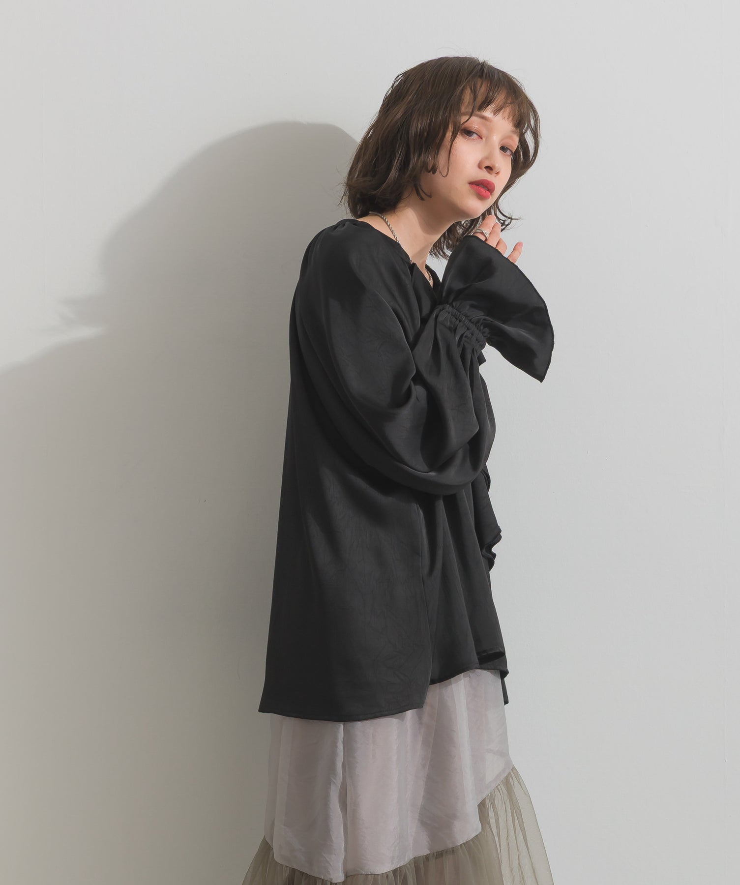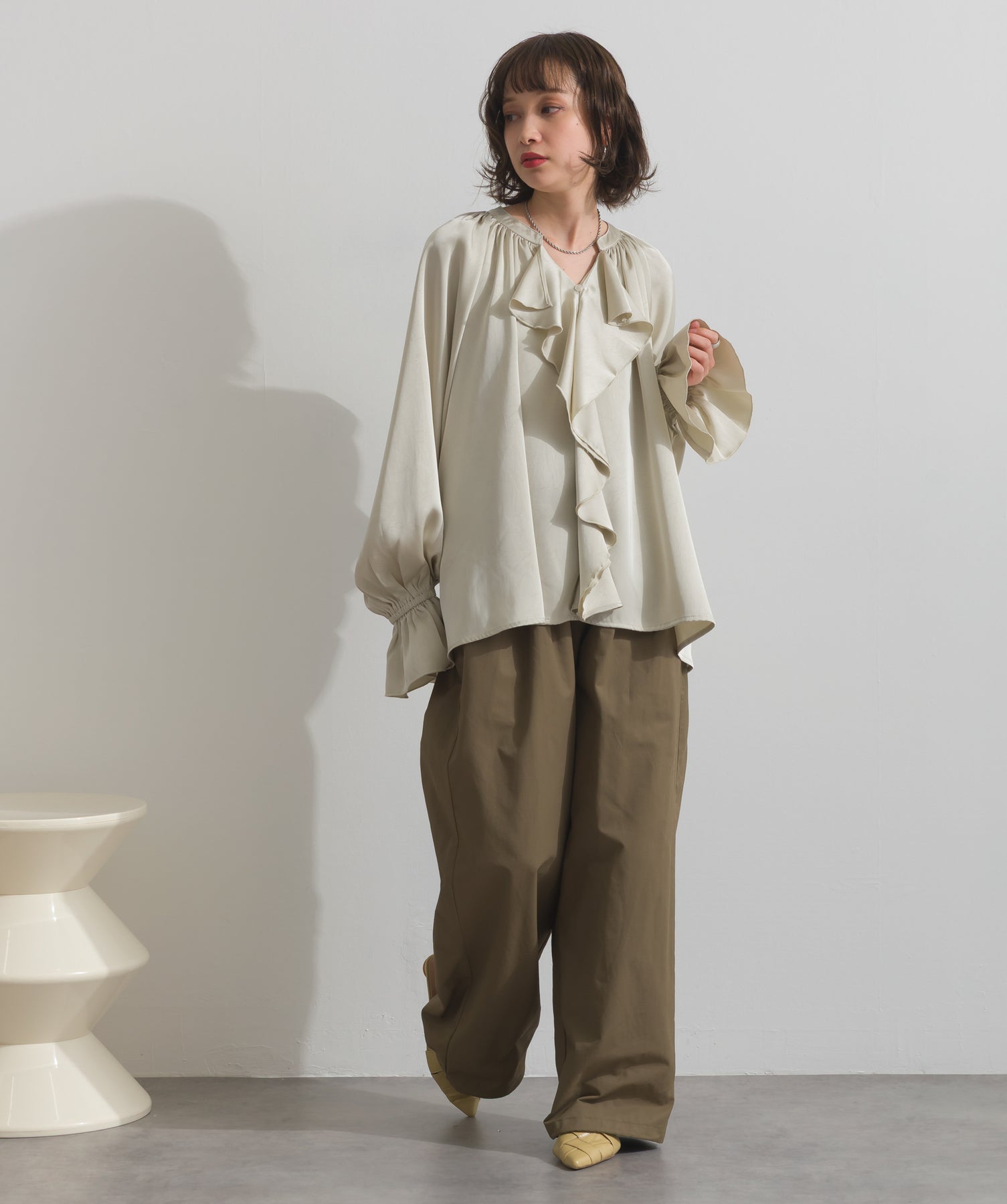 纏うだけで洗練。ドラマティックな存在感を放つ主役ブラウス-material-上品な光沢感と程よいハリのあるサテン調素材を使用。軽やかなのに落ち感が美しく、シーズンレスで着まわせる万能感も魅力です。肌触りがなめらかで、着心地の良さにも配慮されています。-design-大胆なフロントフリルとギャザーデザインが目を引く、フェミニンとモードを両立したブラウス。ボリューム感のあるスリーブとゆとりあるシルエットが、こなれ感と華やかさを演出。パンツにもスカートにも映える丈感で、スタイリングの主役になる1枚です。 ドレスアップにもデイリーにも馴染み、アクセ要らずで映える洗練デザイン。