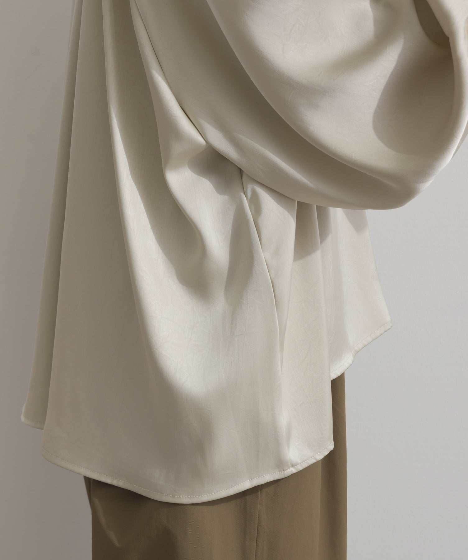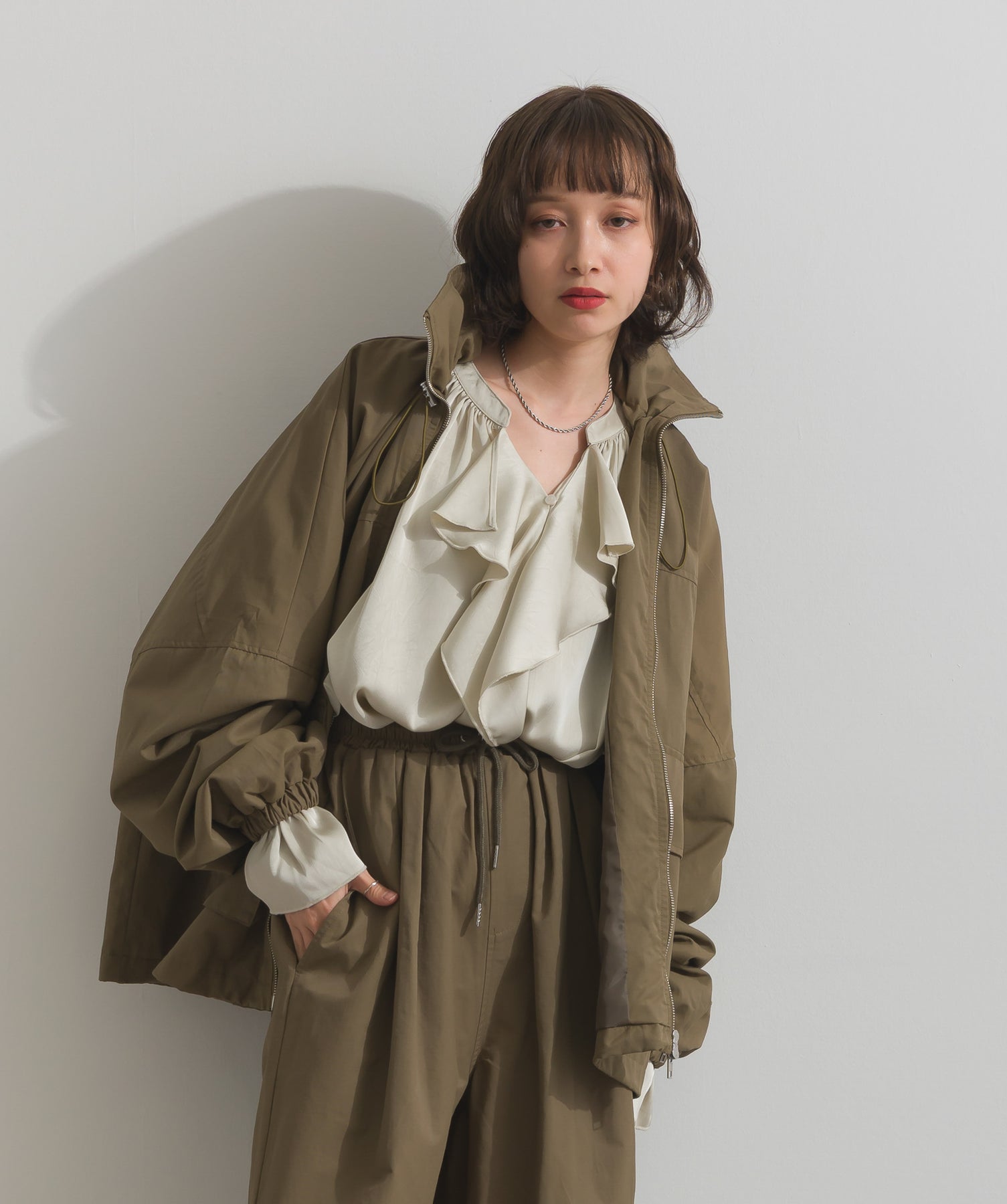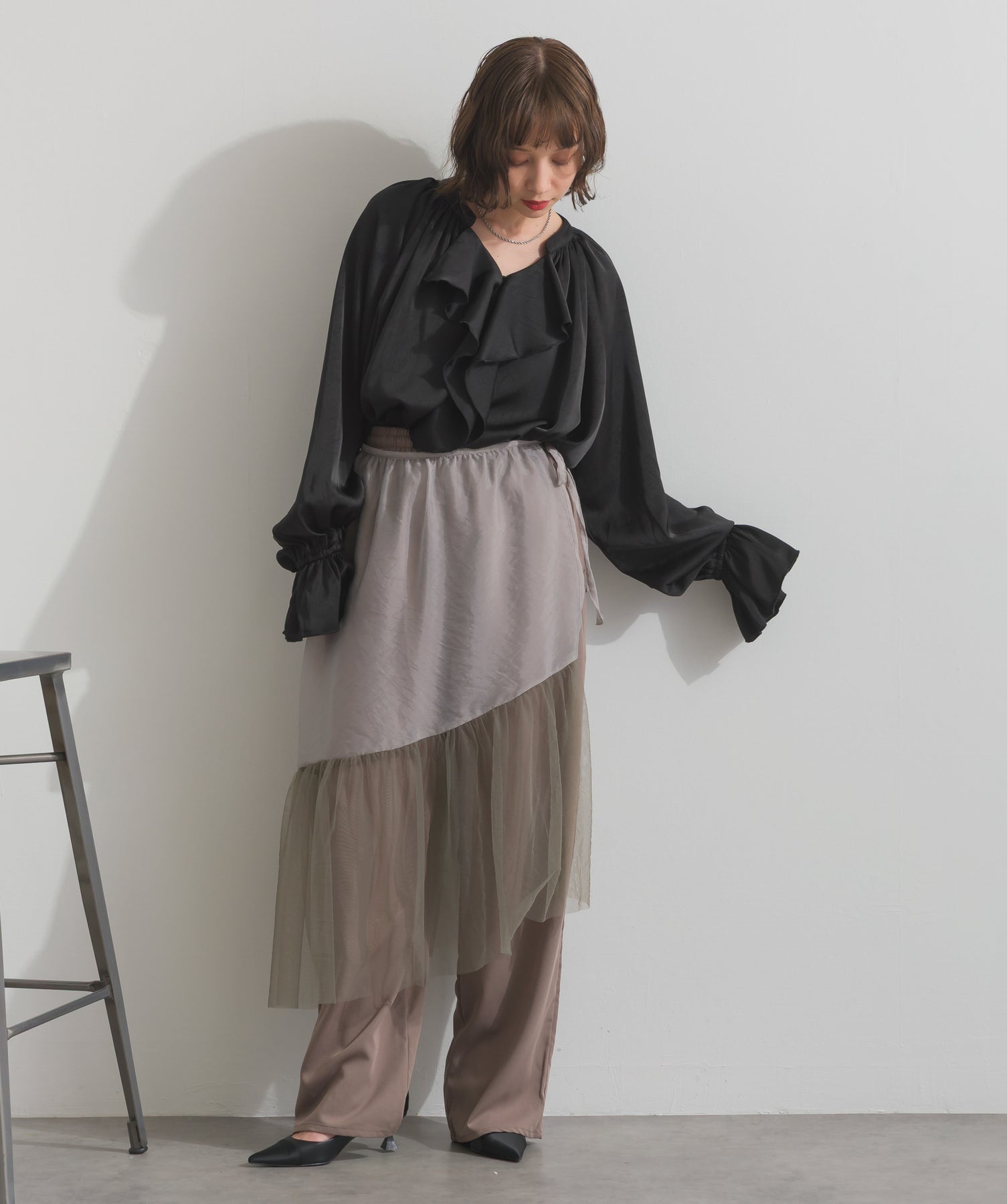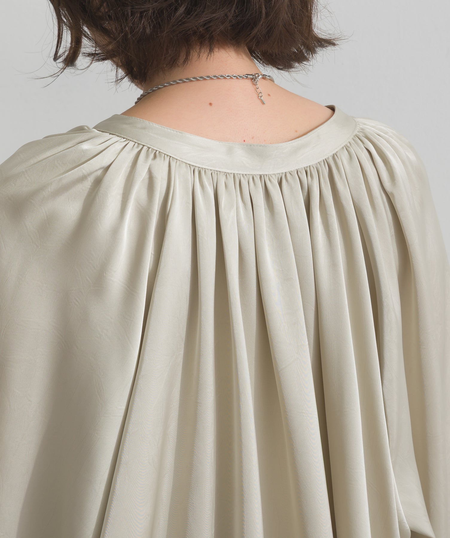 纏うだけで洗練。ドラマティックな存在感を放つ主役ブラウス-material-上品な光沢感と程よいハリのあるサテン調素材を使用。軽やかなのに落ち感が美しく、シーズンレスで着まわせる万能感も魅力です。肌触りがなめらかで、着心地の良さにも配慮されています。-design-大胆なフロントフリルとギャザーデザインが目を引く、フェミニンとモードを両立したブラウス。ボリューム感のあるスリーブとゆとりあるシルエットが、こなれ感と華やかさを演出。パンツにもスカートにも映える丈感で、スタイリングの主役になる1枚です。 ドレスアップにもデイリーにも馴染み、アクセ要らずで映える洗練デザイン。