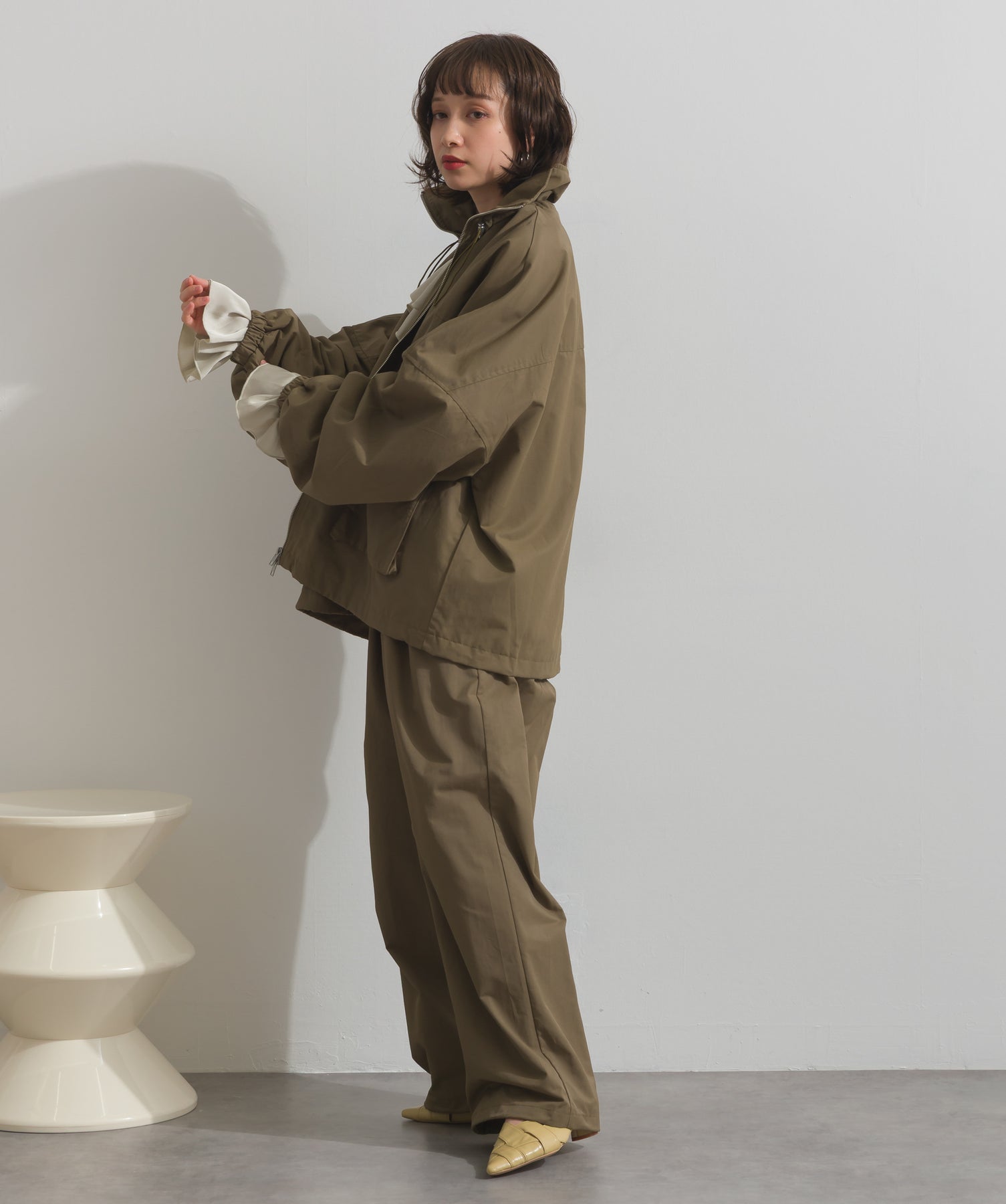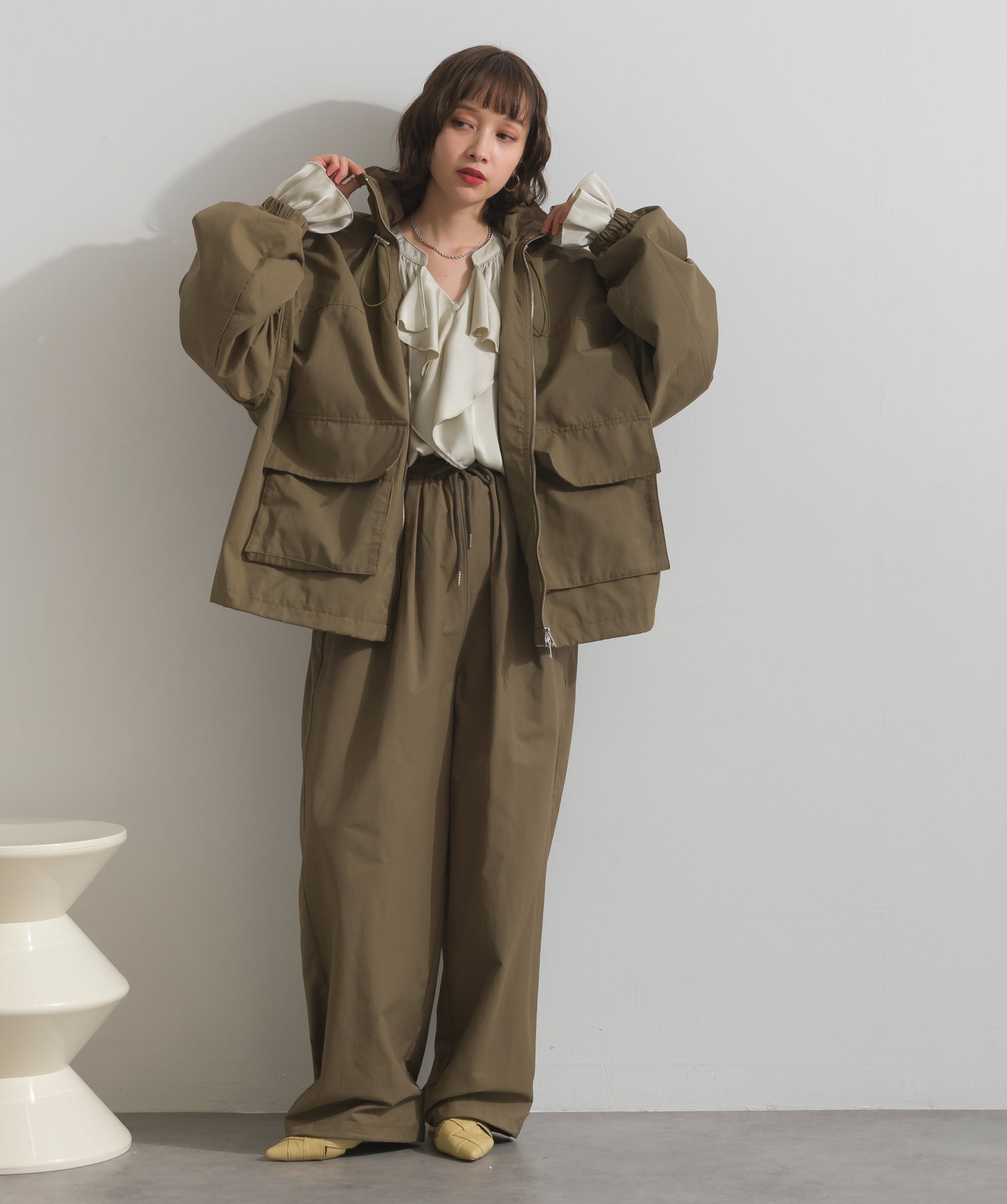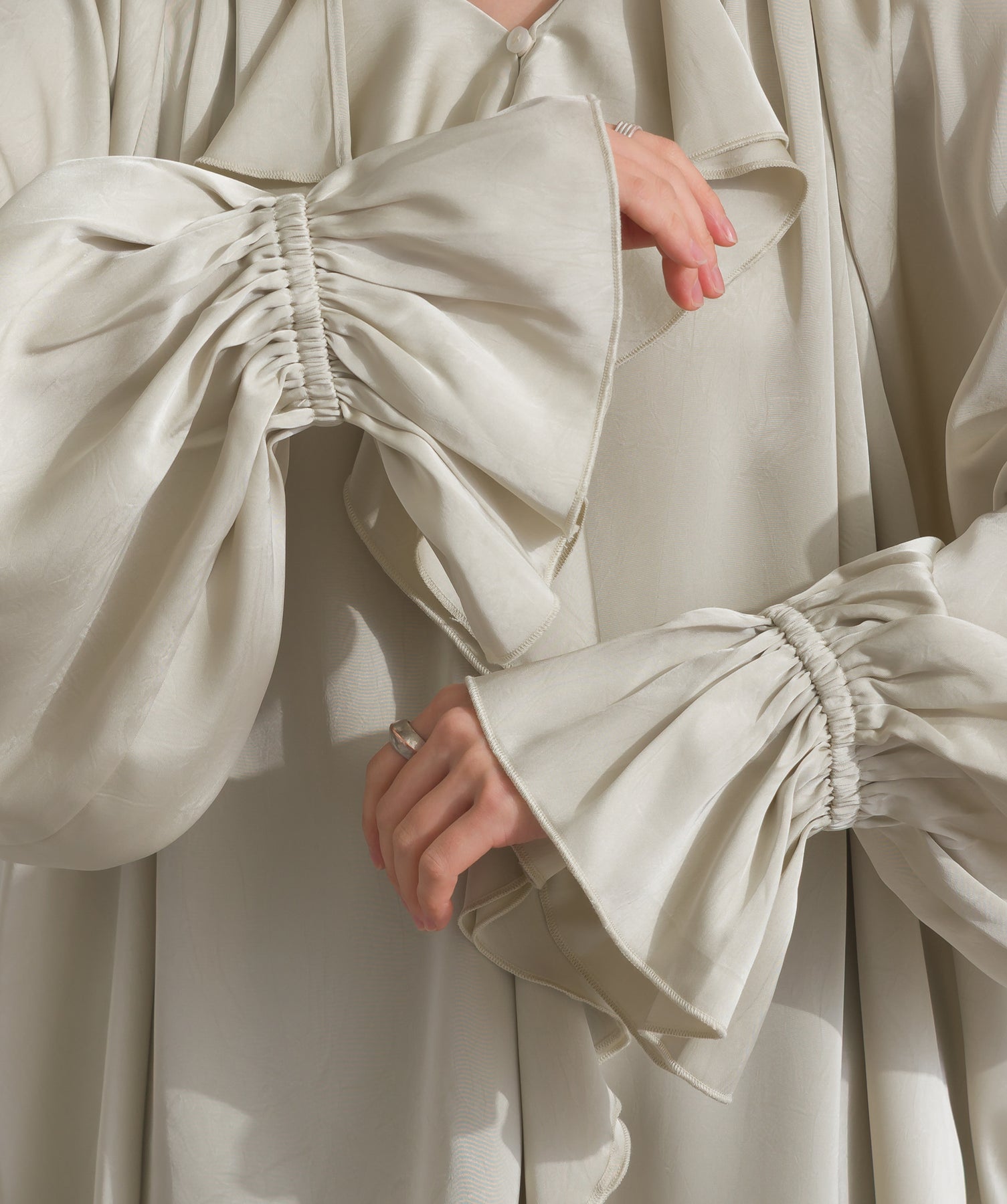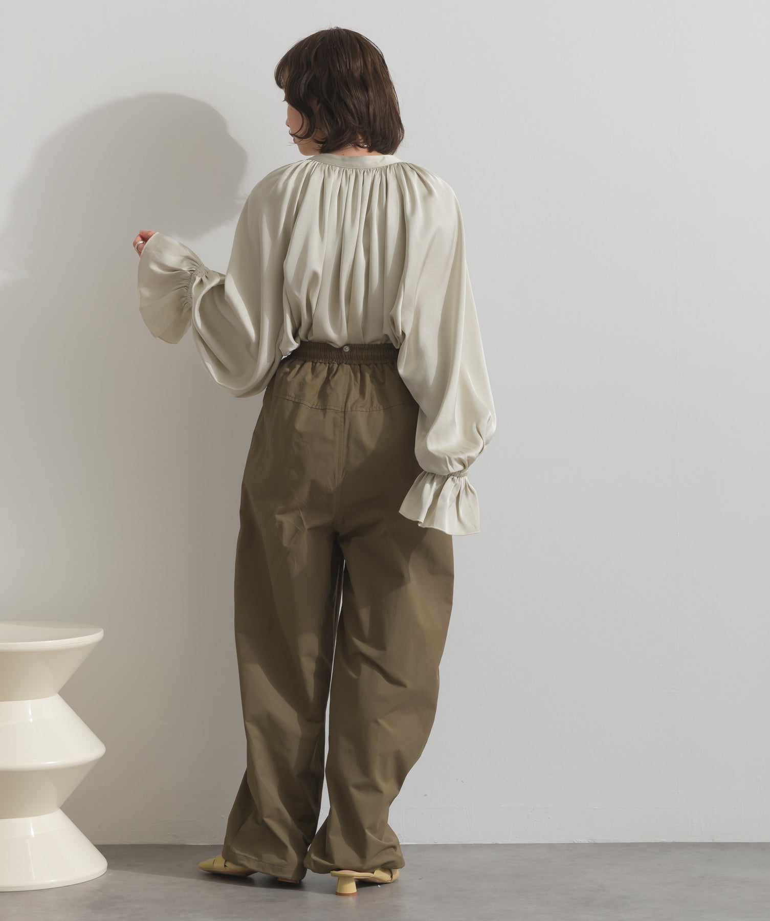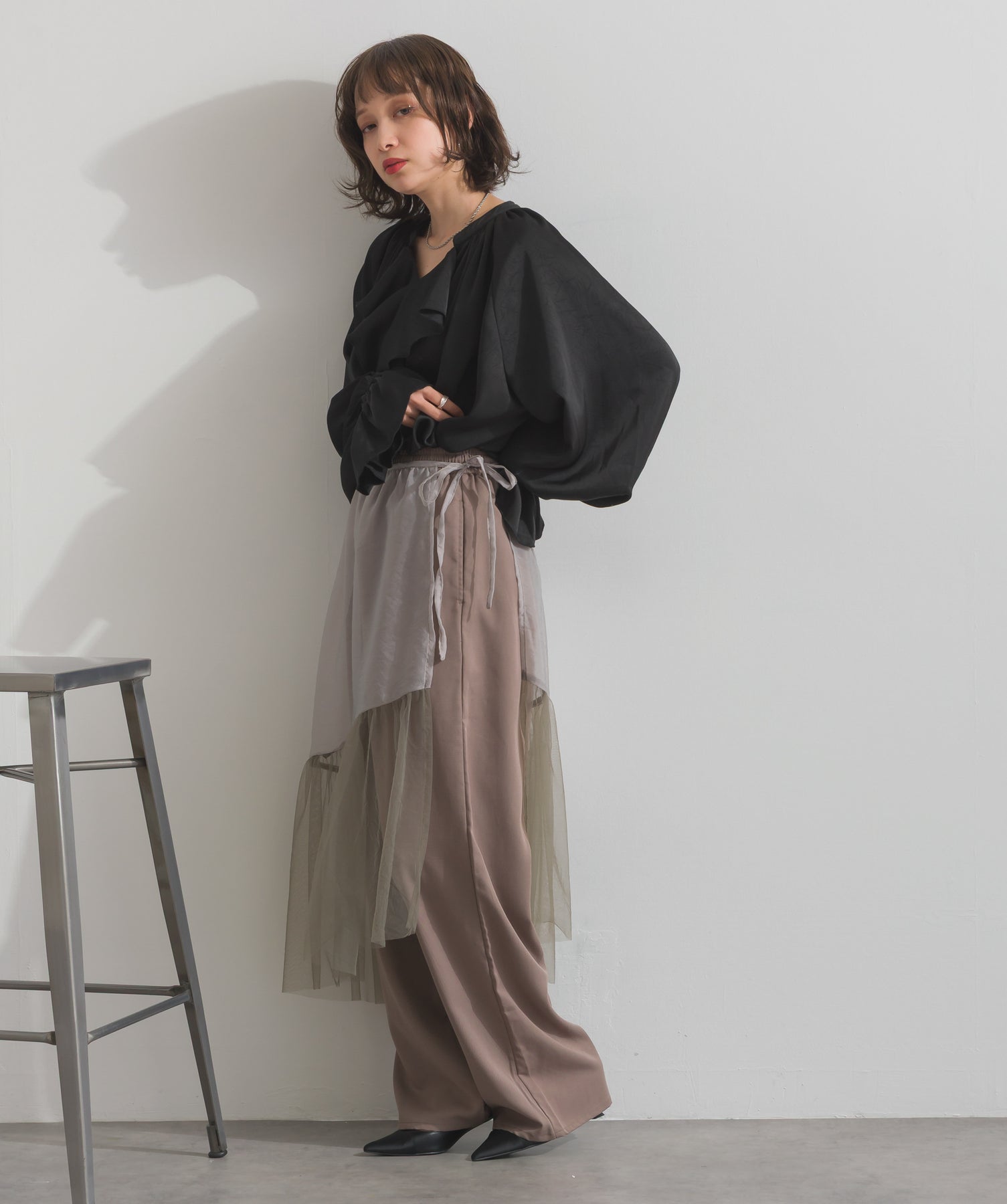 纏うだけで洗練。ドラマティックな存在感を放つ主役ブラウス-material-上品な光沢感と程よいハリのあるサテン調素材を使用。軽やかなのに落ち感が美しく、シーズンレスで着まわせる万能感も魅力です。肌触りがなめらかで、着心地の良さにも配慮されています。-design-大胆なフロントフリルとギャザーデザインが目を引く、フェミニンとモードを両立したブラウス。ボリューム感のあるスリーブとゆとりあるシルエットが、こなれ感と華やかさを演出。パンツにもスカートにも映える丈感で、スタイリングの主役になる1枚です。 ドレスアップにもデイリーにも馴染み、アクセ要らずで映える洗練デザイン。
