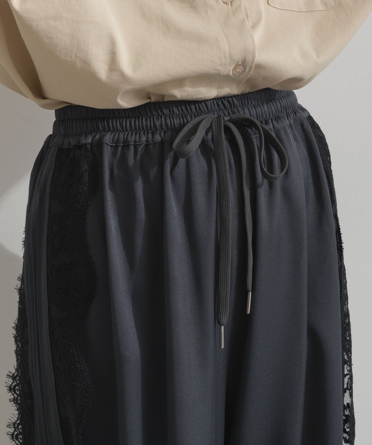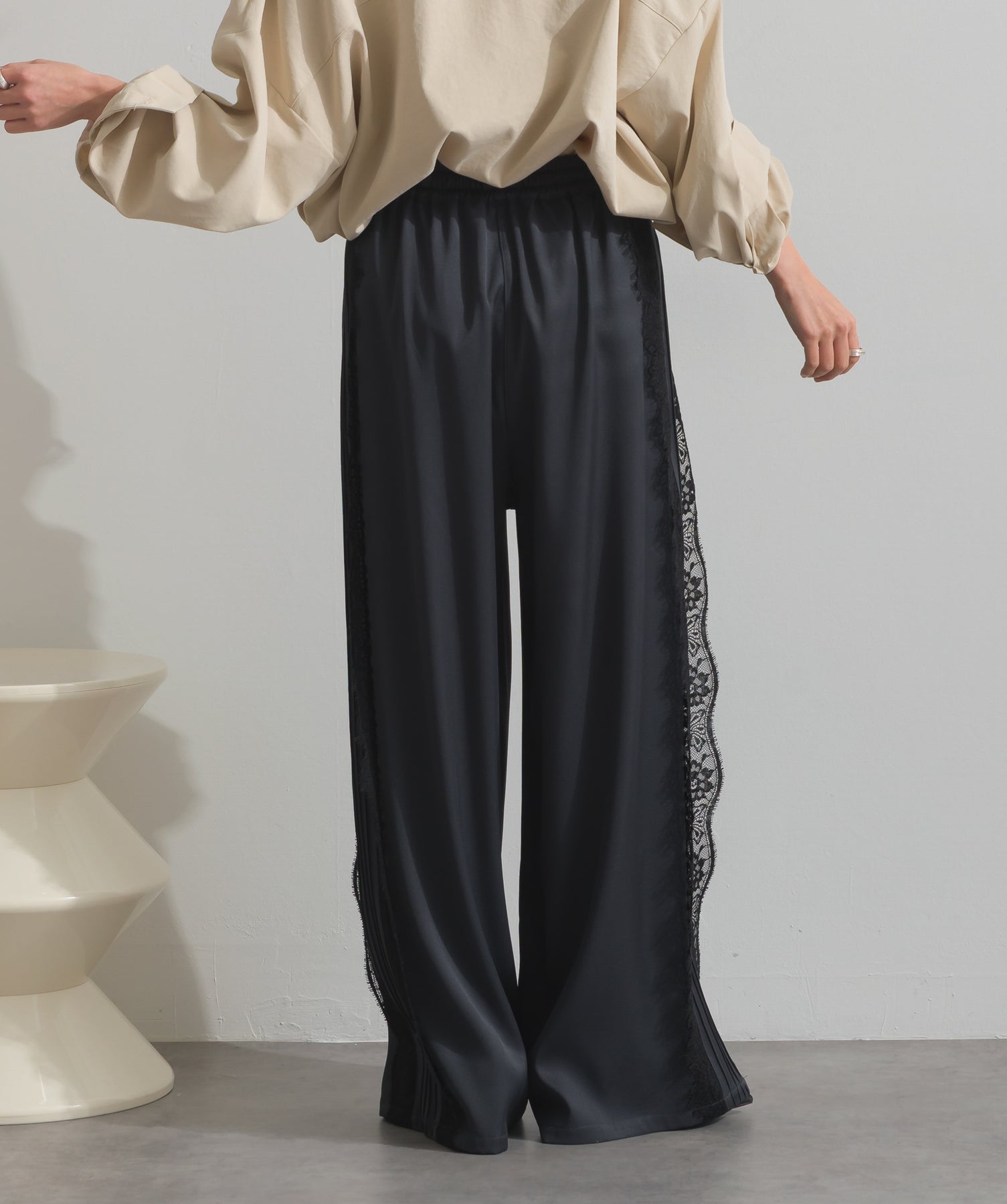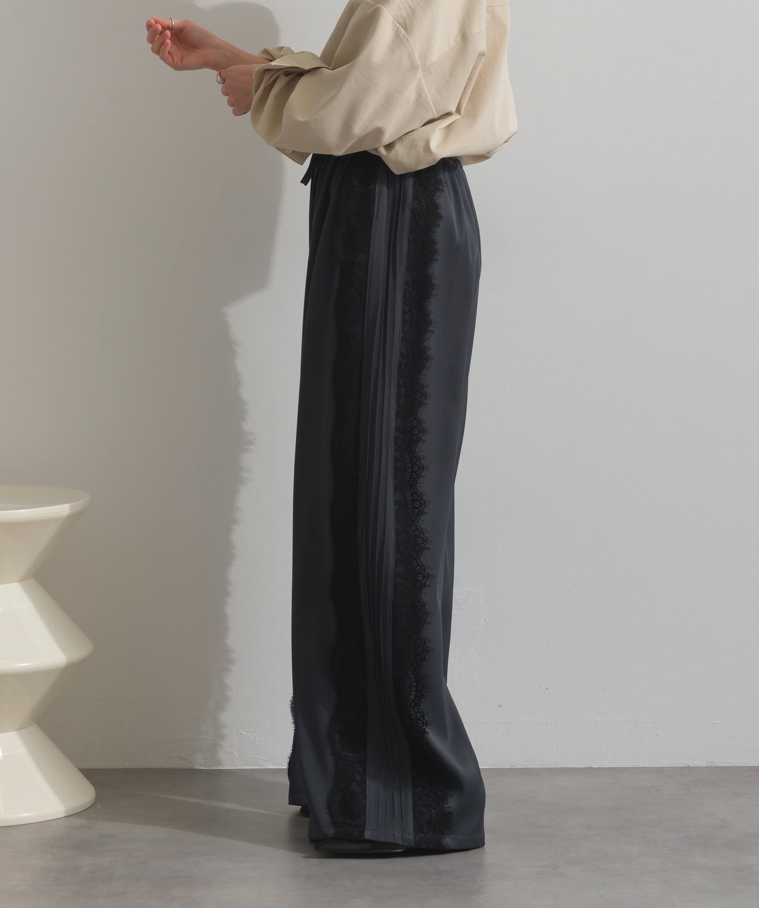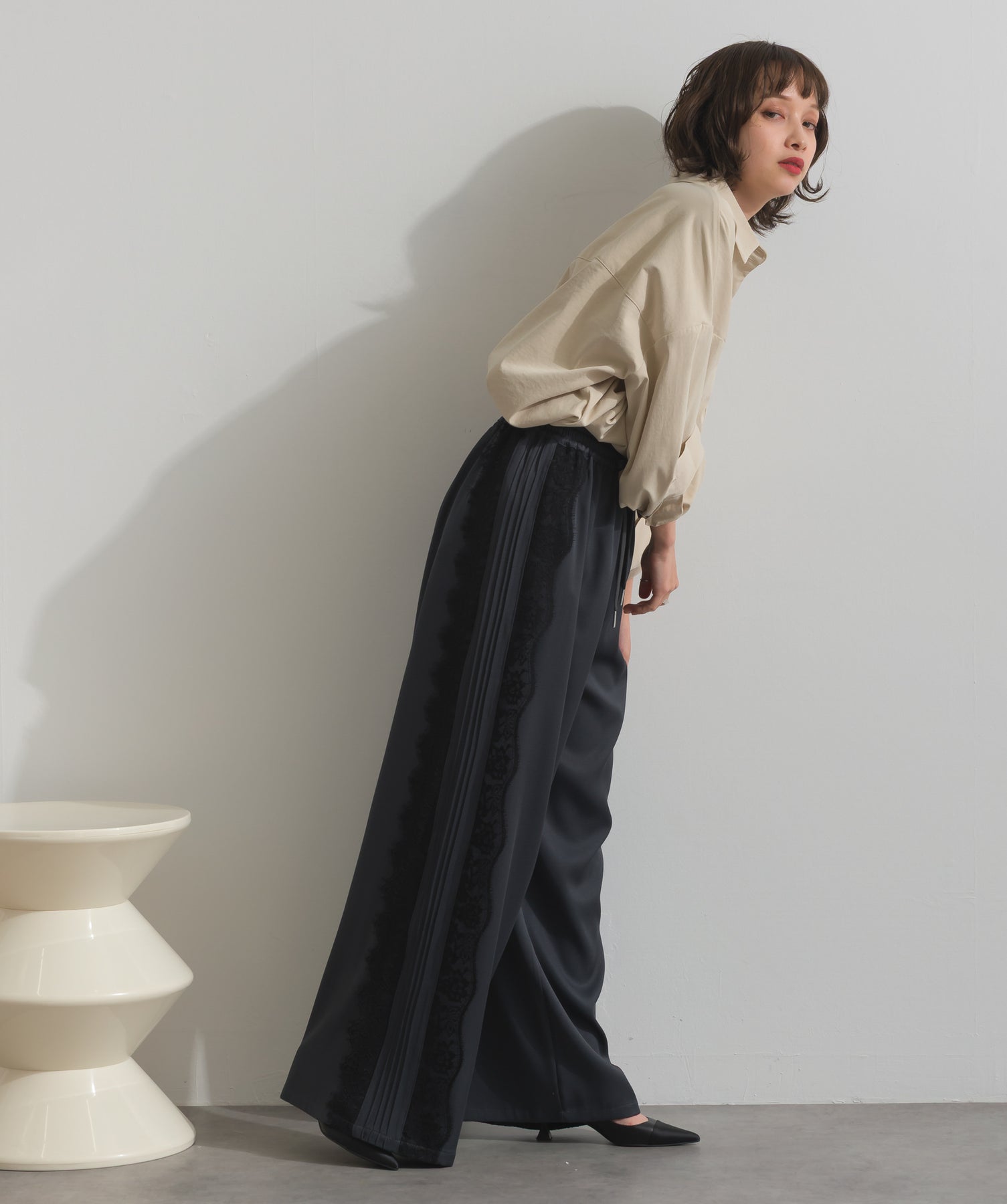 甘さとモードを両立する、レース×ワイドの新定番。繊細なレースがサイドを彩る、媚びないフェミニン。動くたびに揺れるニュアンスが、スタイリングを格上げ。-material-さらりとしたタッチと落ち感が美しい、軽量ポリエステル素材を採用。シーズンレスで着用できる快適な着心地と、シワになりにくいイージーケア性も魅力。ウエストはゴム+ドローストリング仕様でリラクシーなフィット感に。-design-サイドにあしらったレースラインが、ワイドシルエットに華やかさを添えるデザインパンツ。センターをスッキリ見せつつ、レースの甘さを抑えた絶妙なバランス感がポイント。ルーズなトップスやスウェットと合わせてカジュアルダウンしても、きれいめトップスと合わせてエレガントにも。ワントーンでまとめられているため、合わせるアイテムを選ばず、コーディネートの幅が広がる1本です。