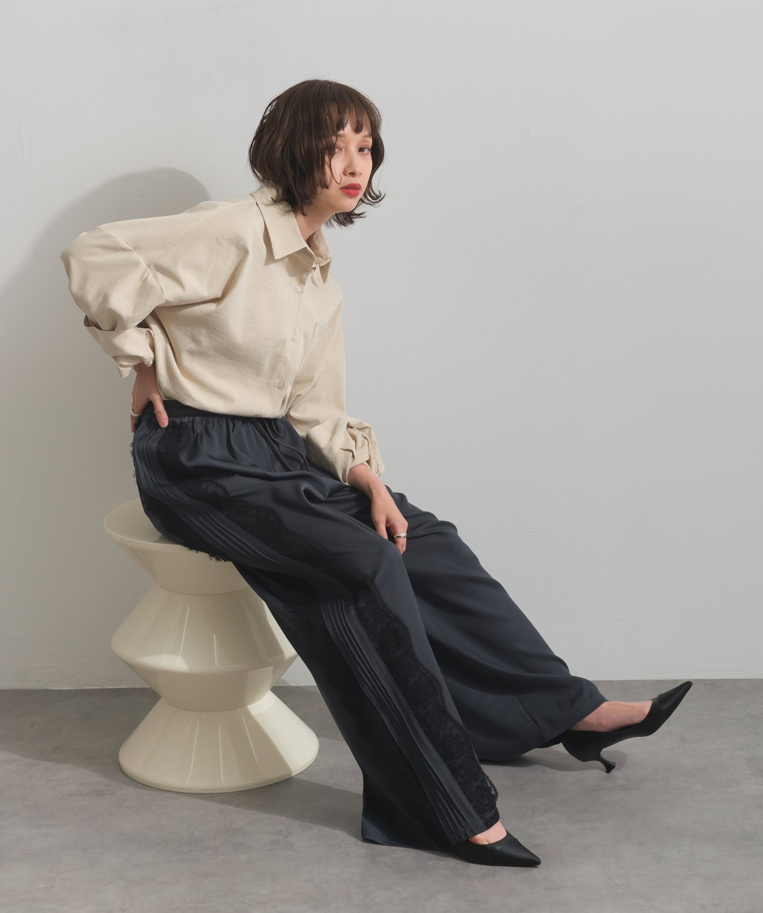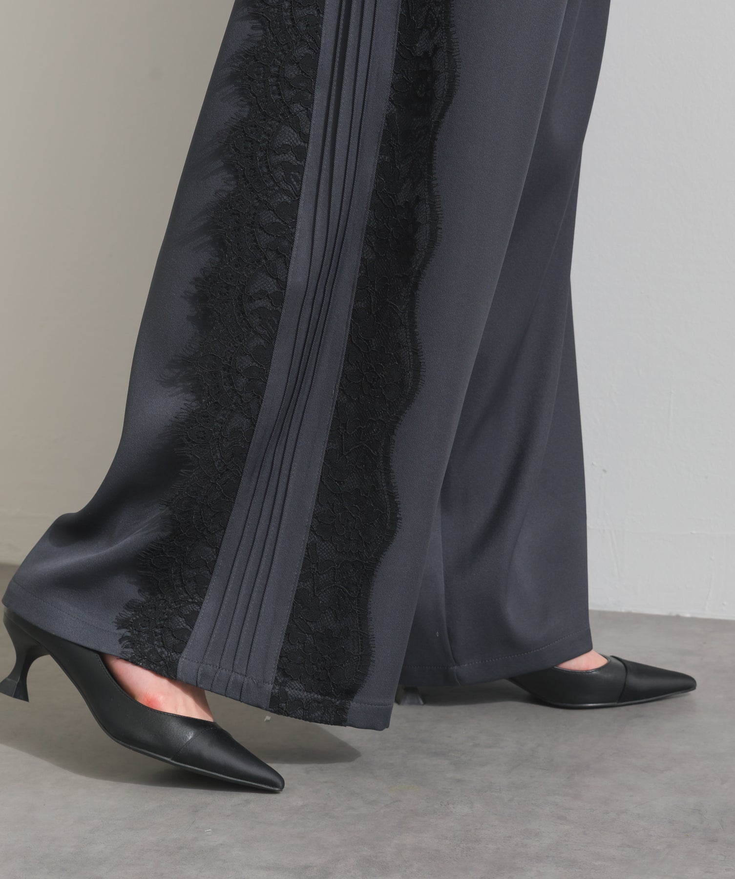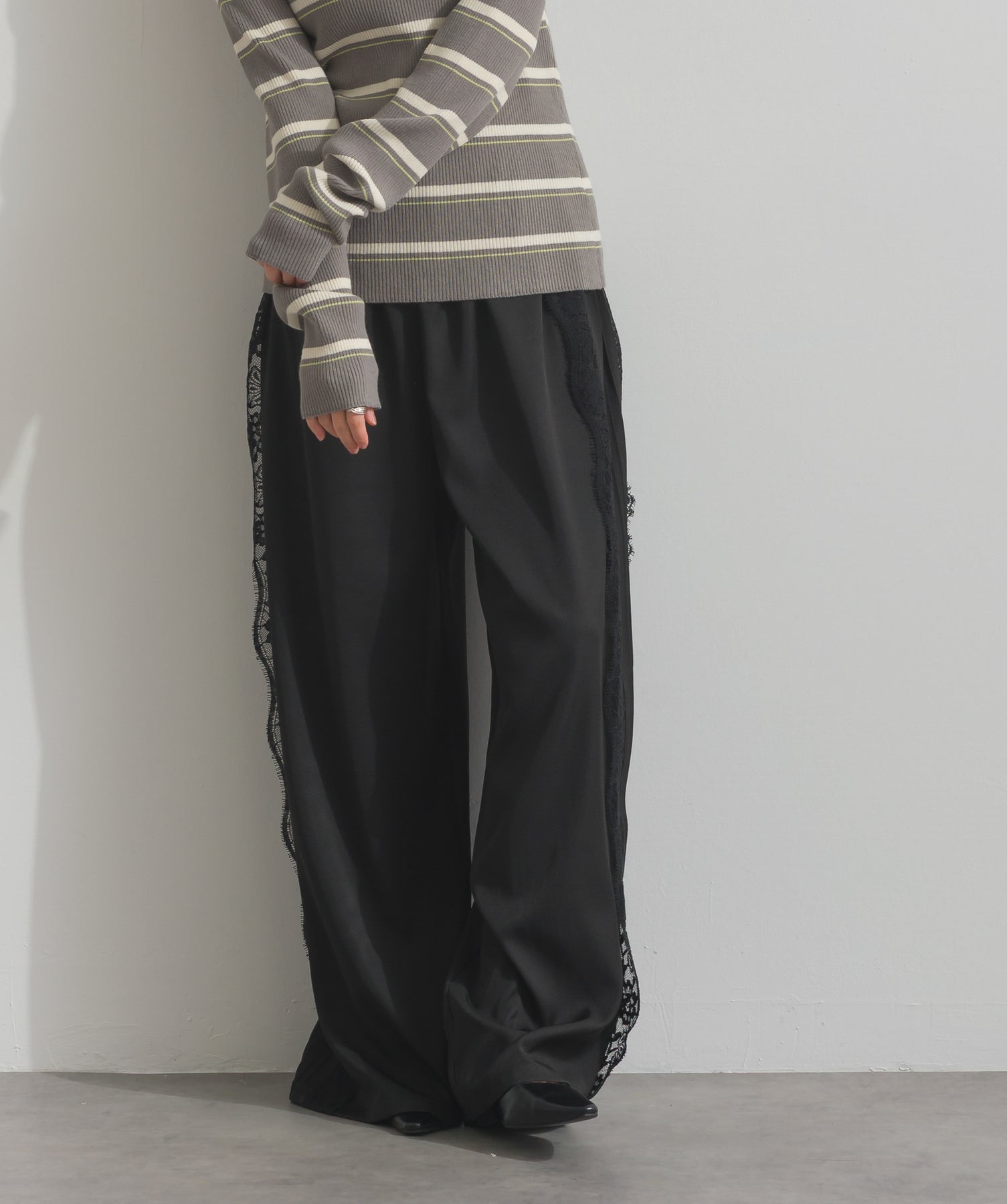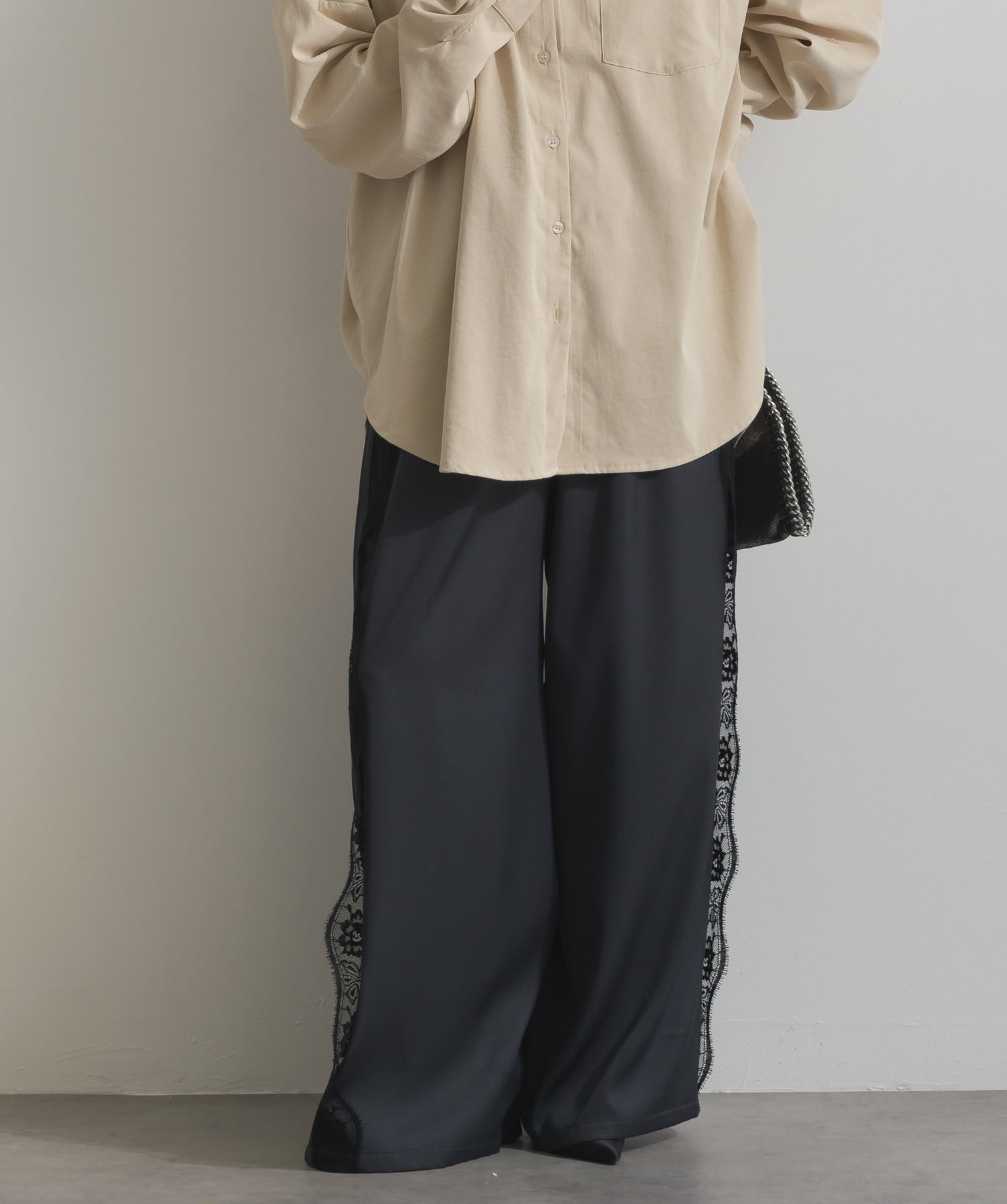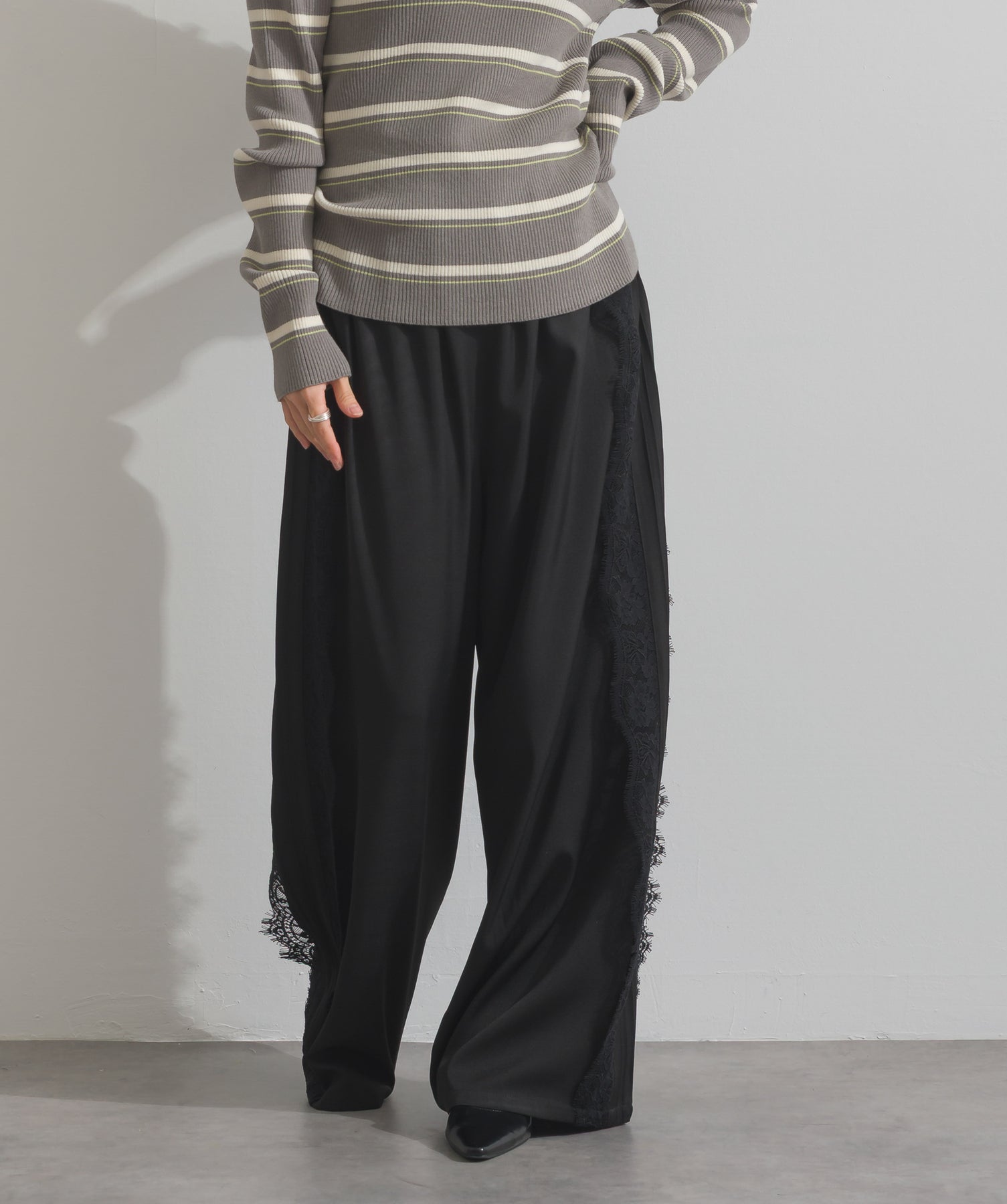 甘さとモードを両立する、レース×ワイドの新定番。繊細なレースがサイドを彩る、媚びないフェミニン。動くたびに揺れるニュアンスが、スタイリングを格上げ。-material-さらりとしたタッチと落ち感が美しい、軽量ポリエステル素材を採用。シーズンレスで着用できる快適な着心地と、シワになりにくいイージーケア性も魅力。ウエストはゴム+ドローストリング仕様でリラクシーなフィット感に。-design-サイドにあしらったレースラインが、ワイドシルエットに華やかさを添えるデザインパンツ。センターをスッキリ見せつつ、レースの甘さを抑えた絶妙なバランス感がポイント。ルーズなトップスやスウェットと合わせてカジュアルダウンしても、きれいめトップスと合わせてエレガントにも。ワントーンでまとめられているため、合わせるアイテムを選ばず、コーディネートの幅が広がる1本です。