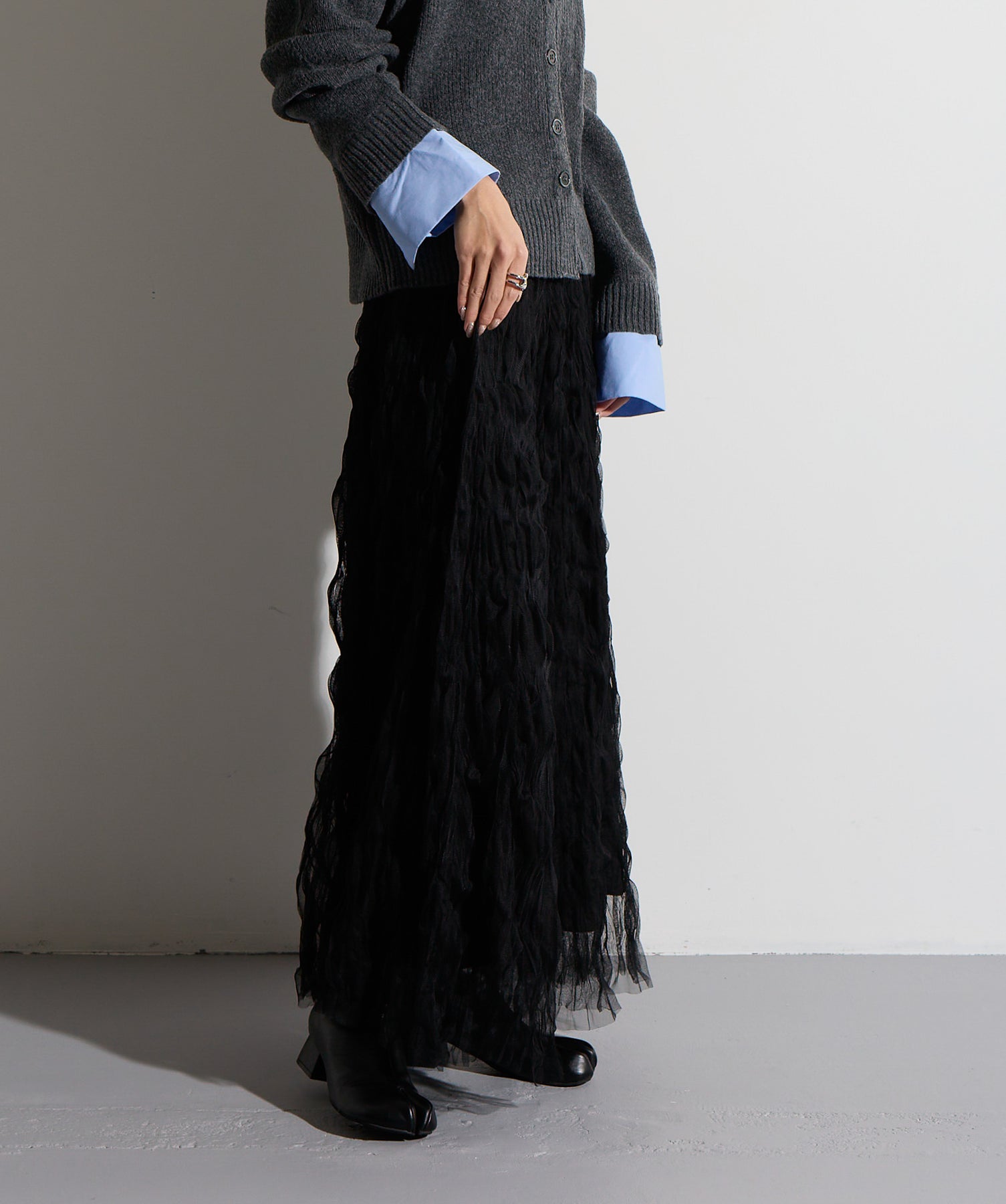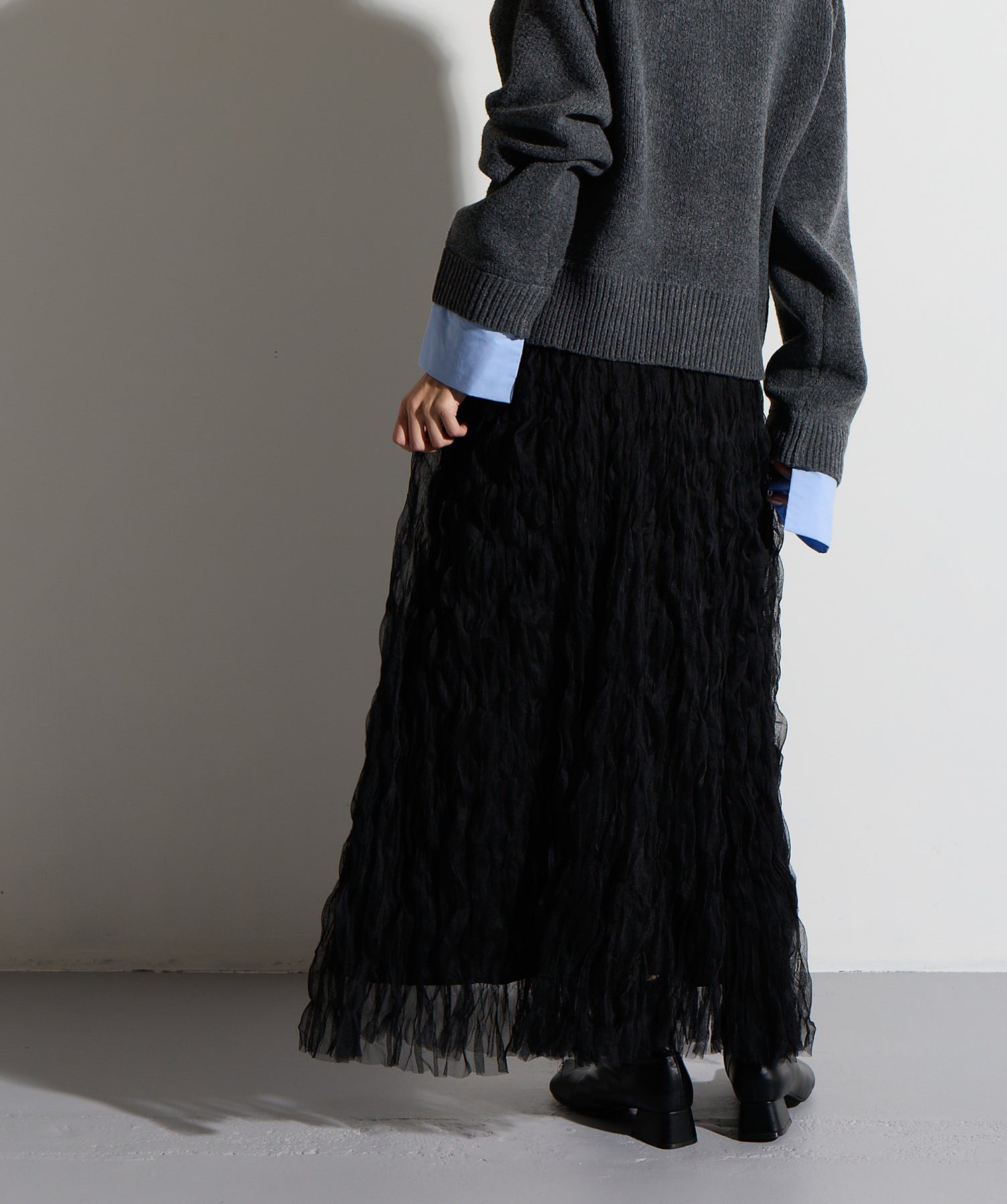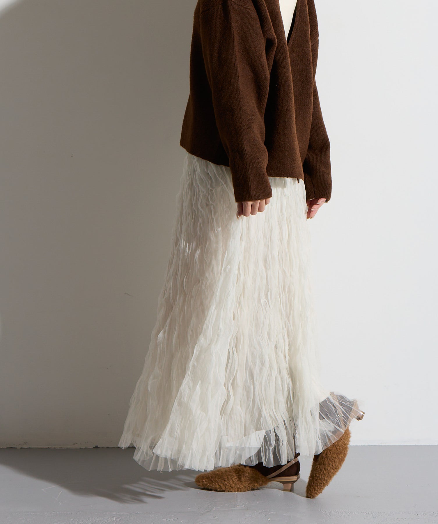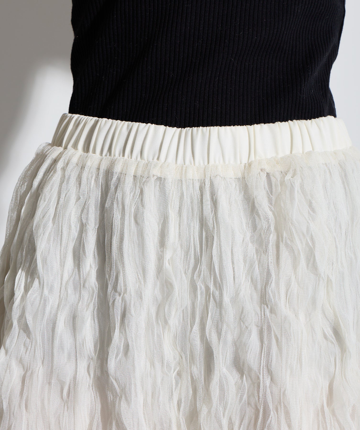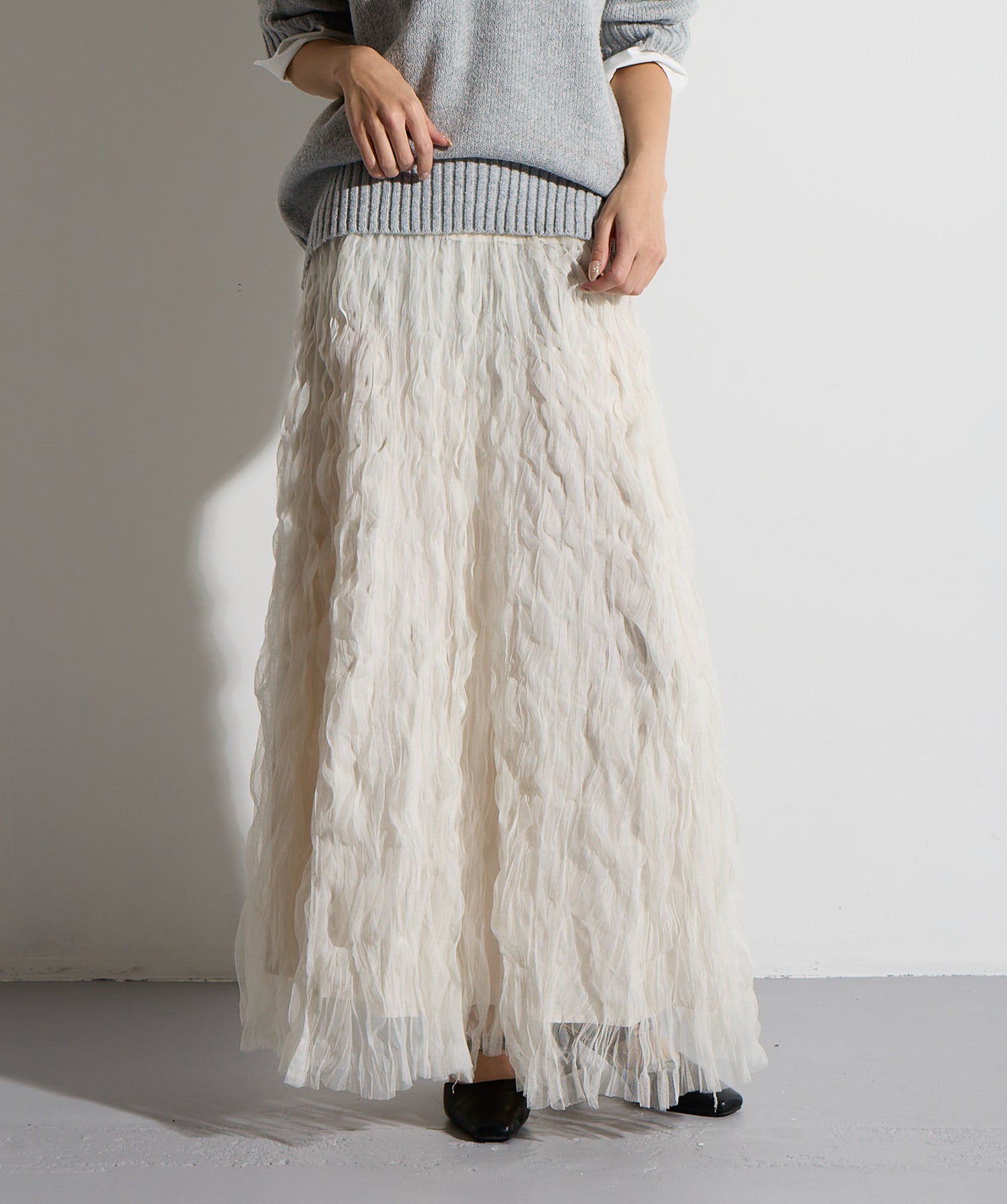 揺れ感も空気感も纏う、唯一無二の存在感。ドラマティックなワッシャースカート。-material-軽やかで透け感のあるワッシャーレース素材を贅沢に使用。柔らかなチュールに波打つような凹凸感をプラスすることで、表情豊かで動きのある仕上がりに。裏地付きで透けすぎず、1枚で安心して着用いただけます。-design-ウエストから裾にかけてふんわりと広がるフレアシルエットが、歩くたびに揺れて目を惹くデザイン。シンプルなトップスと合わせるだけでスタイリングが決まる主役級の1枚。ウエストは総ゴム仕様でストレスフリーな穿き心地も魅力。スニーカーでカジュアルダウン、ヒールでレディに、と幅広い着こなしに対応します。