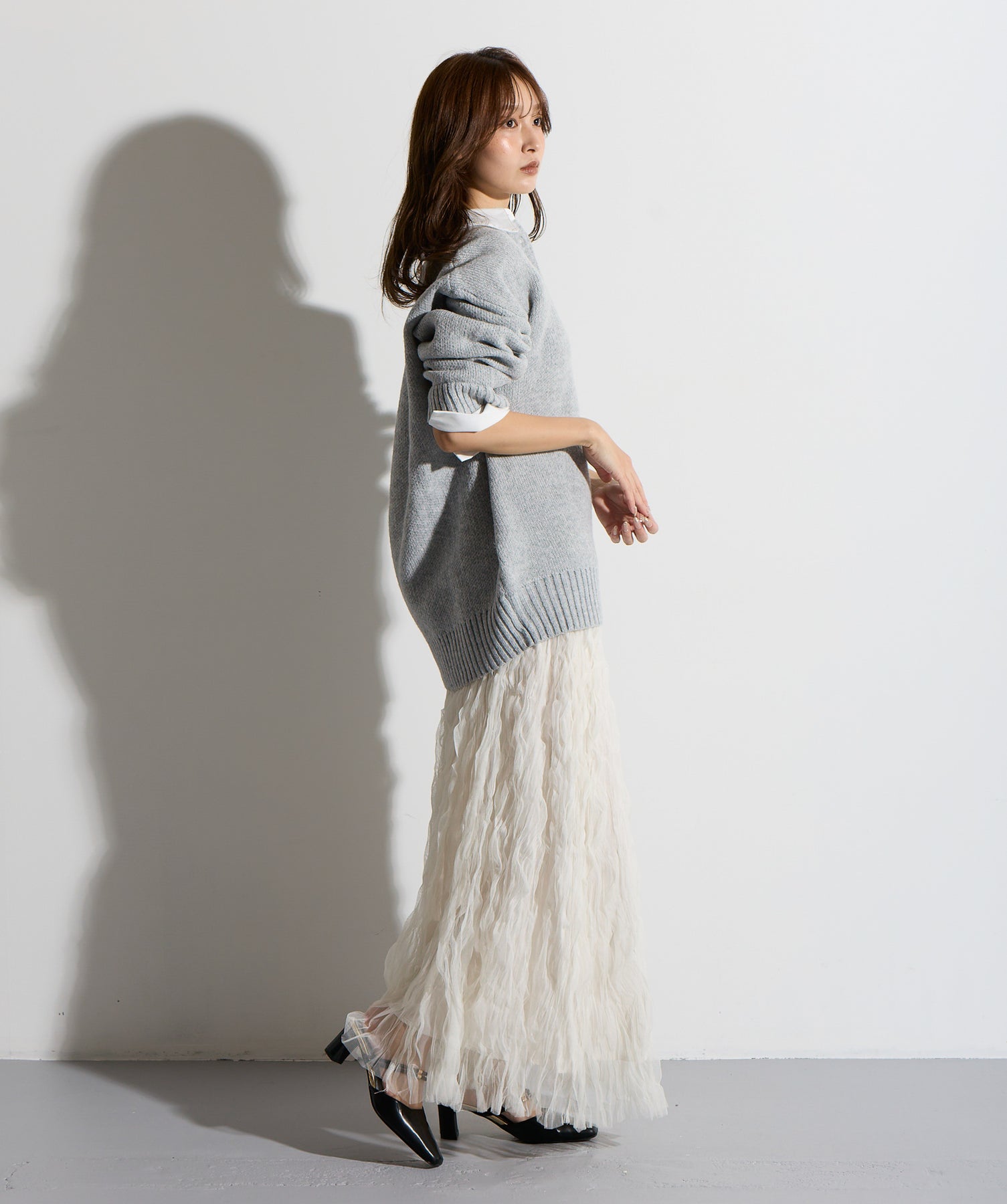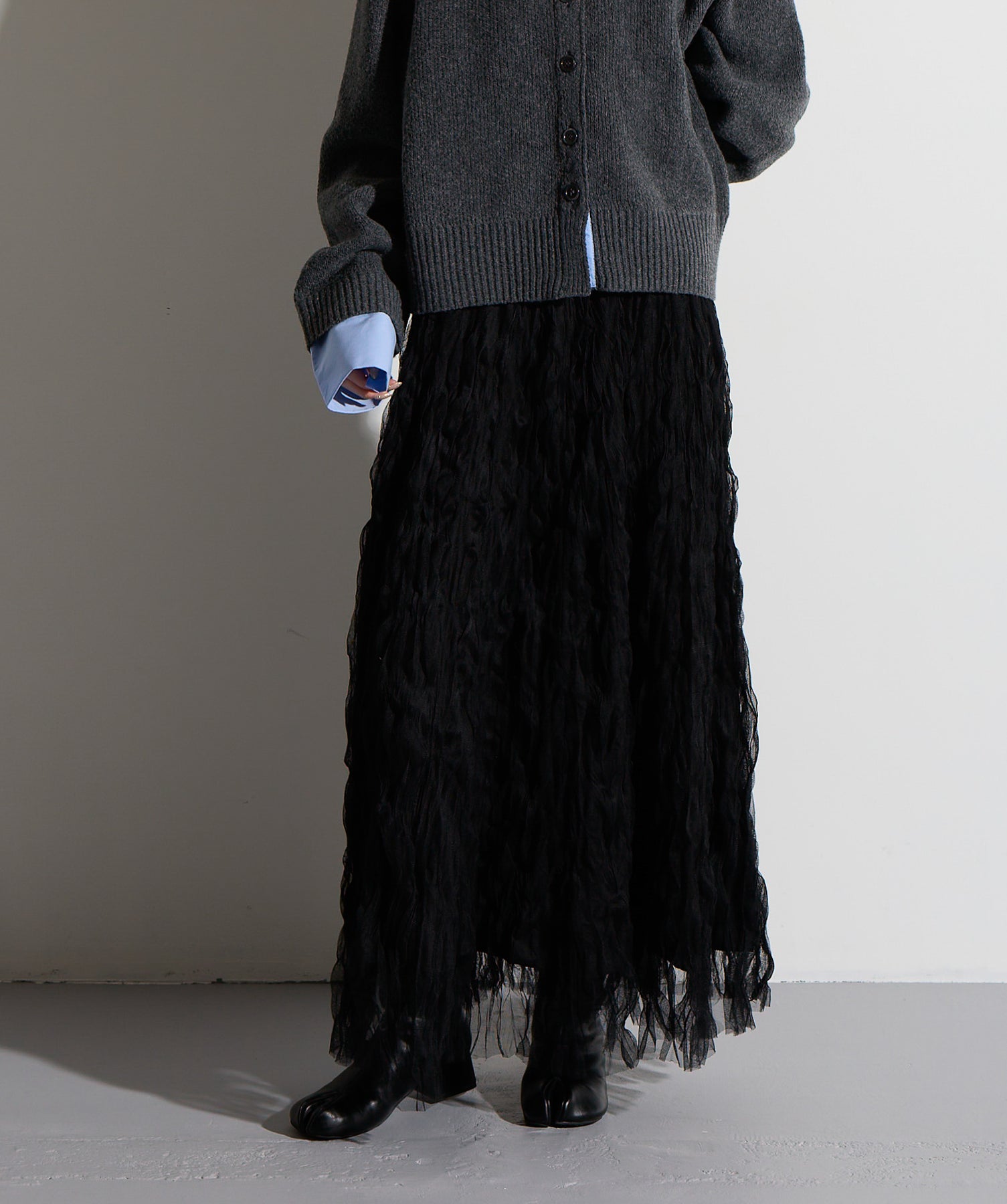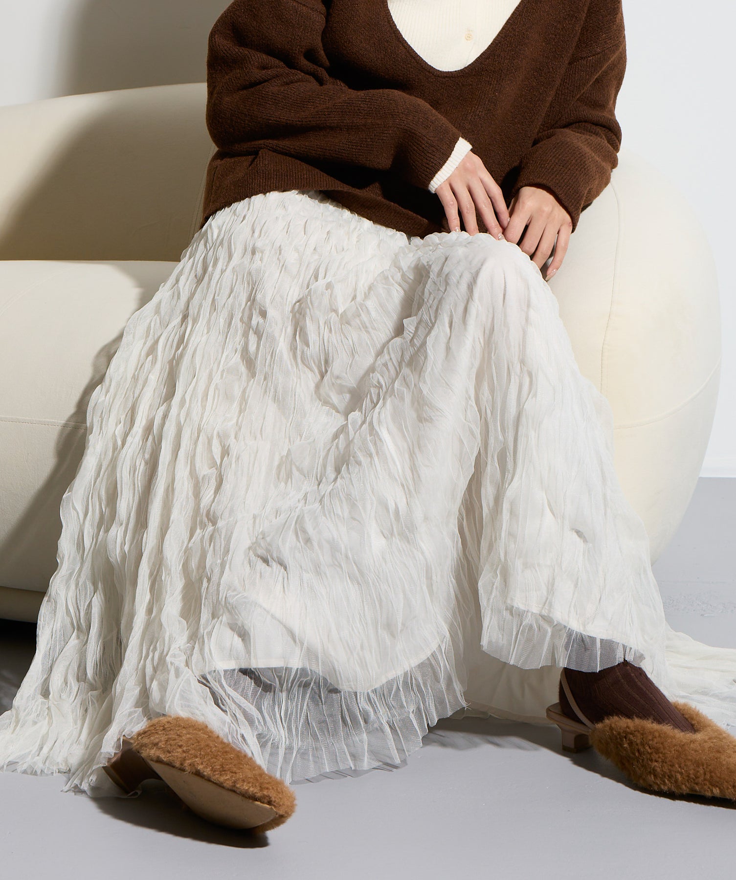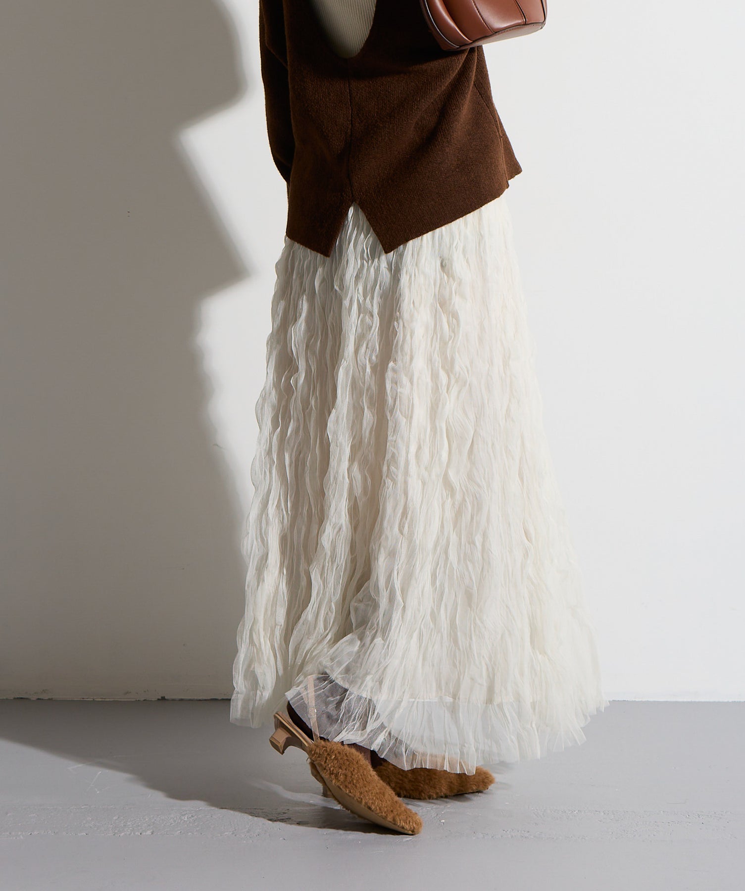 揺れ感も空気感も纏う、唯一無二の存在感。ドラマティックなワッシャースカート。-material-軽やかで透け感のあるワッシャーレース素材を贅沢に使用。柔らかなチュールに波打つような凹凸感をプラスすることで、表情豊かで動きのある仕上がりに。裏地付きで透けすぎず、1枚で安心して着用いただけます。-design-ウエストから裾にかけてふんわりと広がるフレアシルエットが、歩くたびに揺れて目を惹くデザイン。シンプルなトップスと合わせるだけでスタイリングが決まる主役級の1枚。ウエストは総ゴム仕様でストレスフリーな穿き心地も魅力。スニーカーでカジュアルダウン、ヒールでレディに、と幅広い着こなしに対応します。