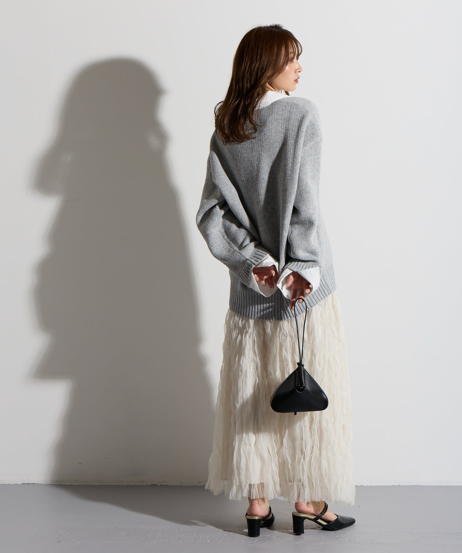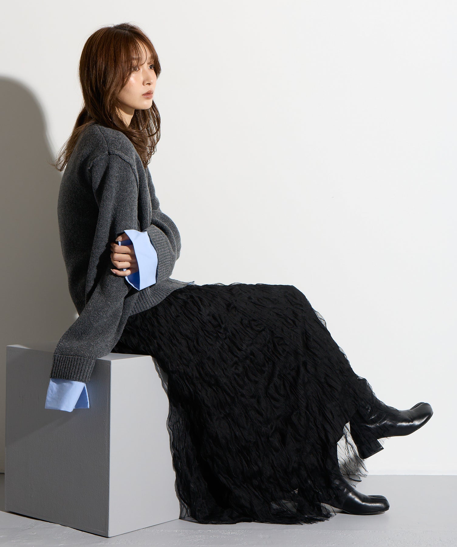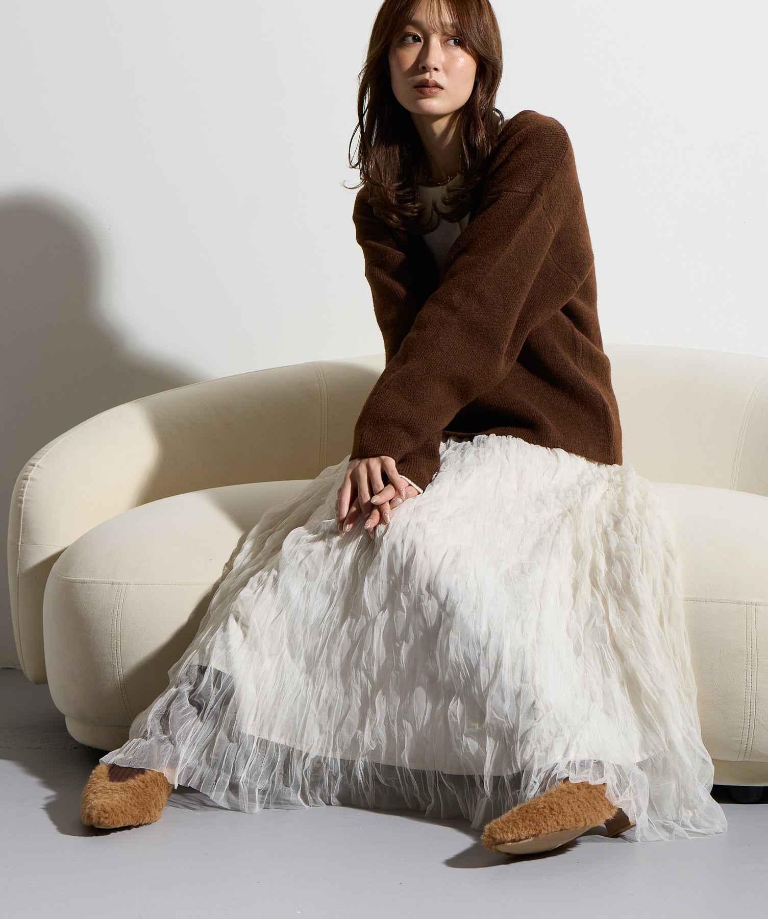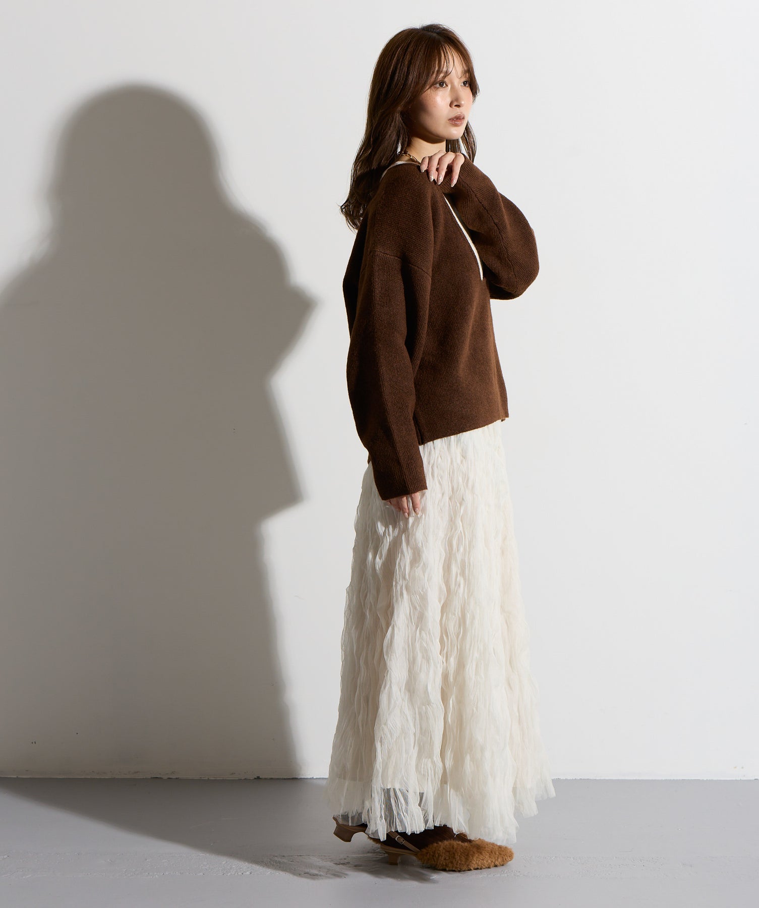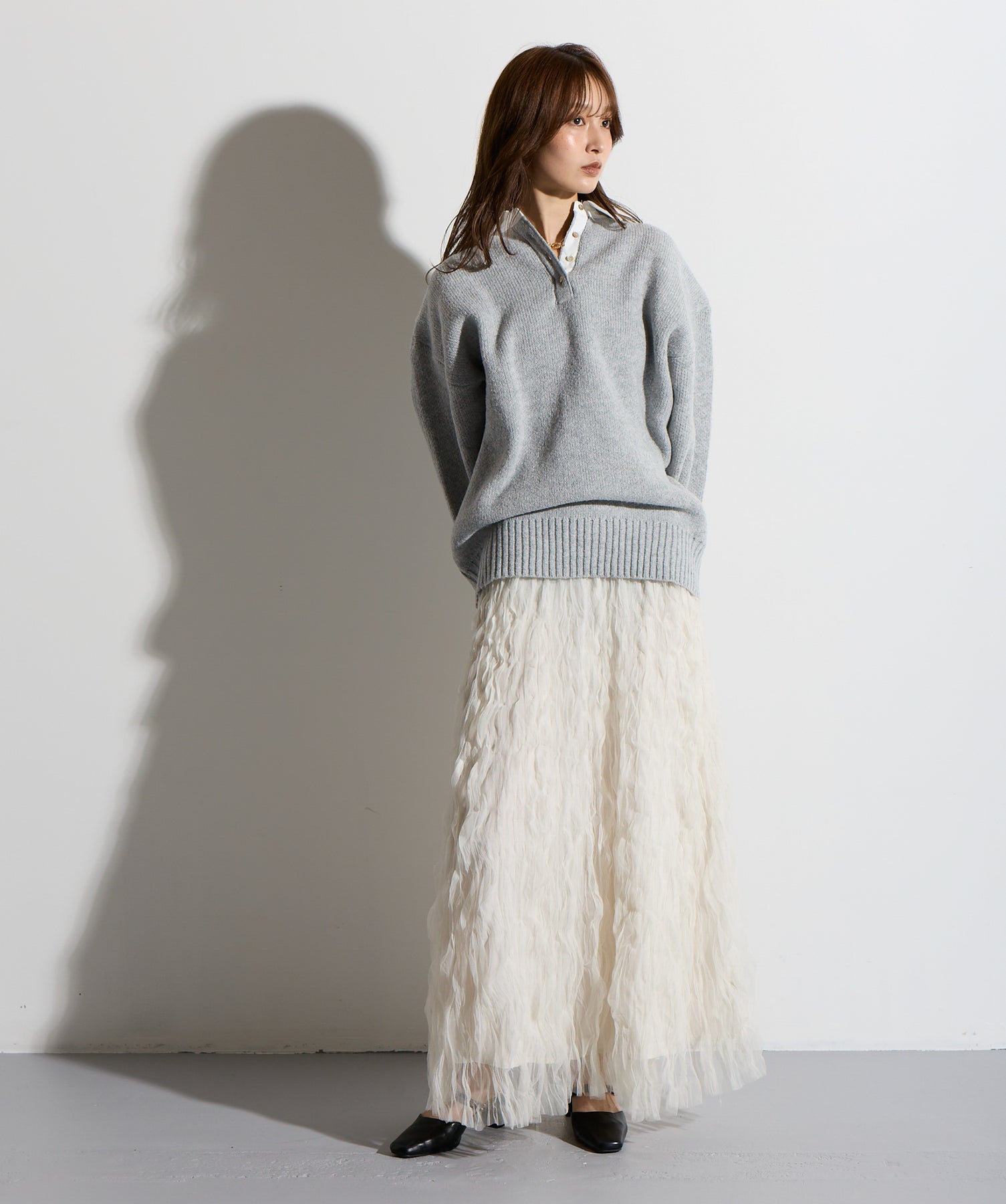 揺れ感も空気感も纏う、唯一無二の存在感。ドラマティックなワッシャースカート。-material-軽やかで透け感のあるワッシャーレース素材を贅沢に使用。柔らかなチュールに波打つような凹凸感をプラスすることで、表情豊かで動きのある仕上がりに。裏地付きで透けすぎず、1枚で安心して着用いただけます。-design-ウエストから裾にかけてふんわりと広がるフレアシルエットが、歩くたびに揺れて目を惹くデザイン。シンプルなトップスと合わせるだけでスタイリングが決まる主役級の1枚。ウエストは総ゴム仕様でストレスフリーな穿き心地も魅力。スニーカーでカジュアルダウン、ヒールでレディに、と幅広い着こなしに対応します。