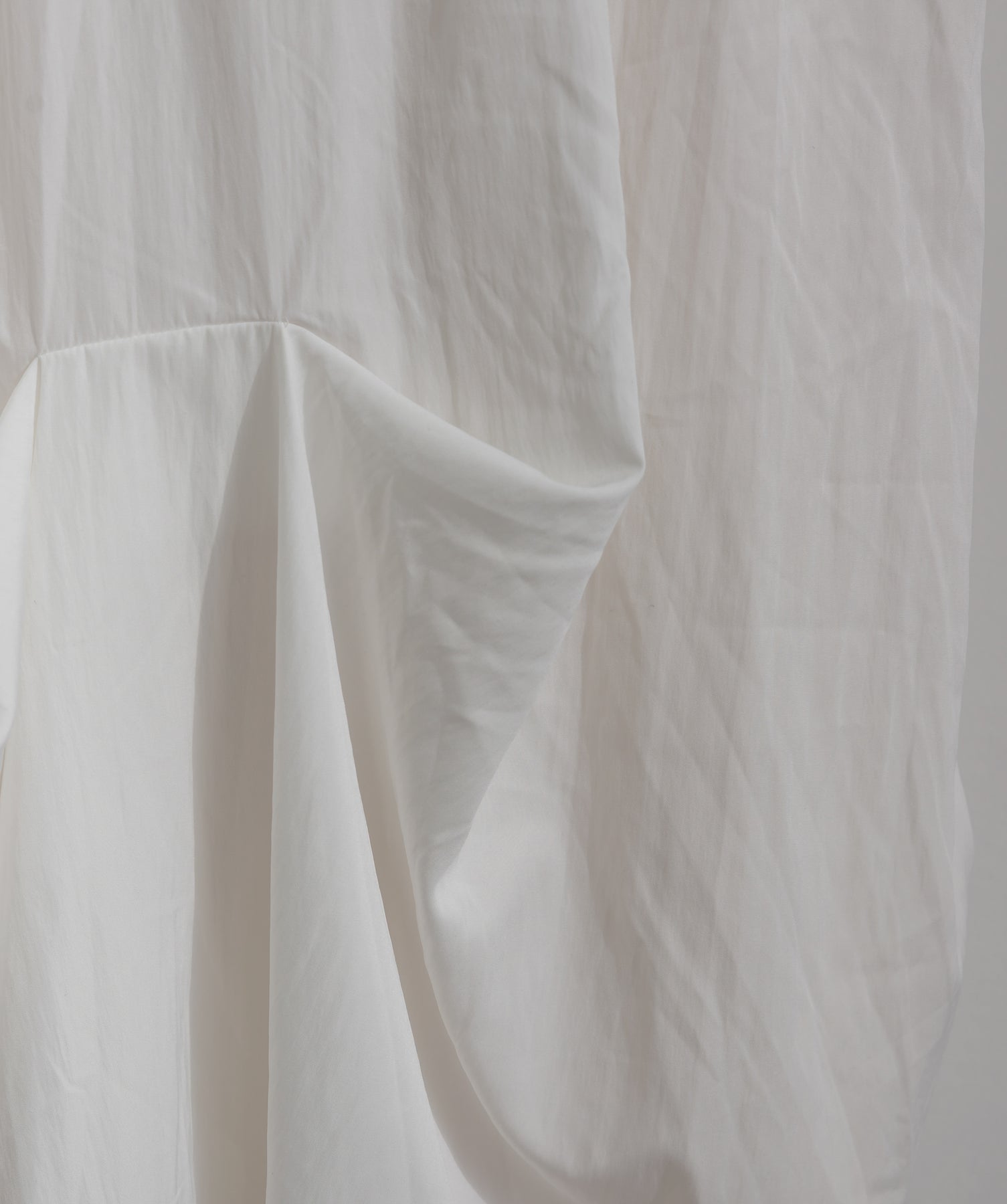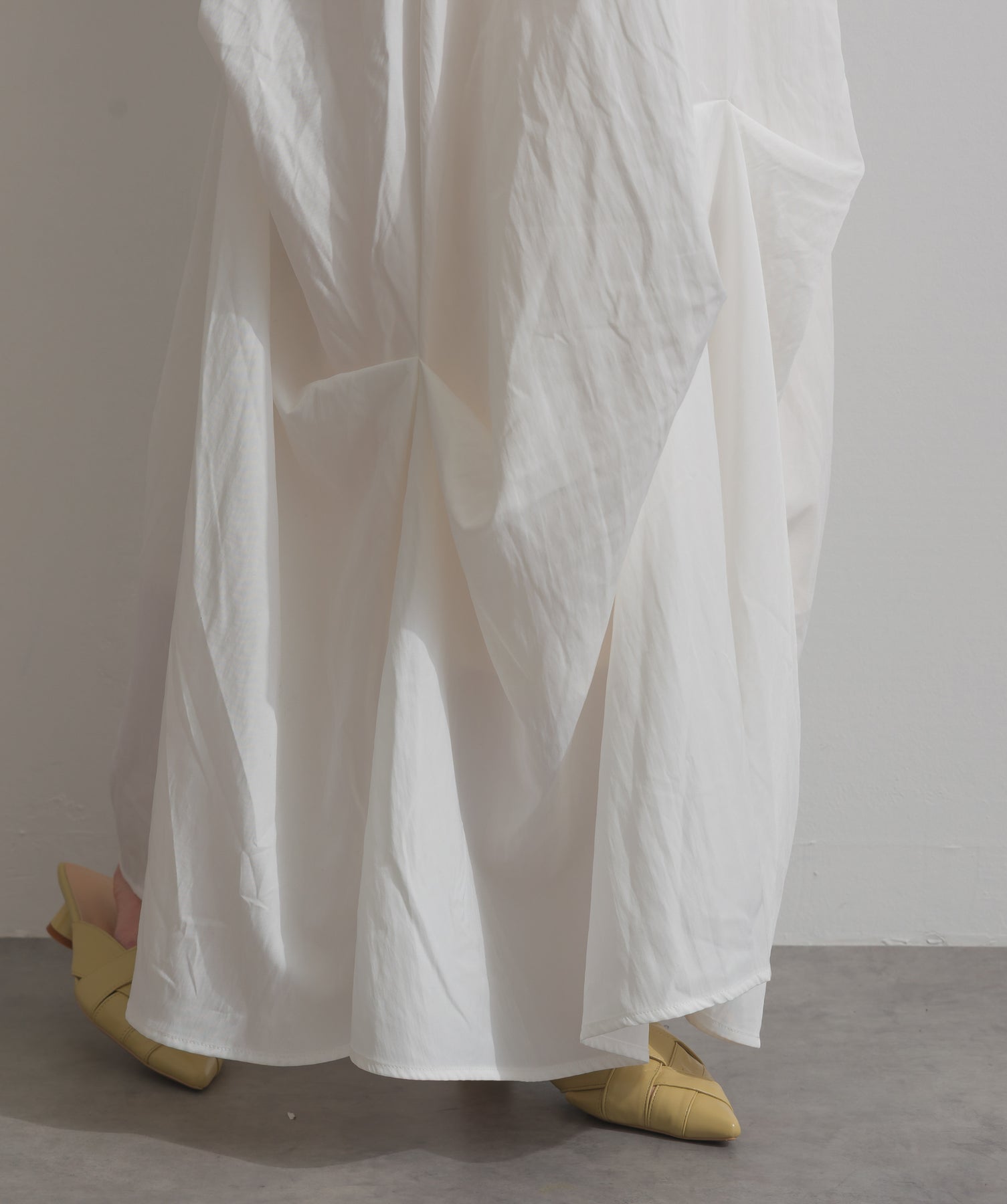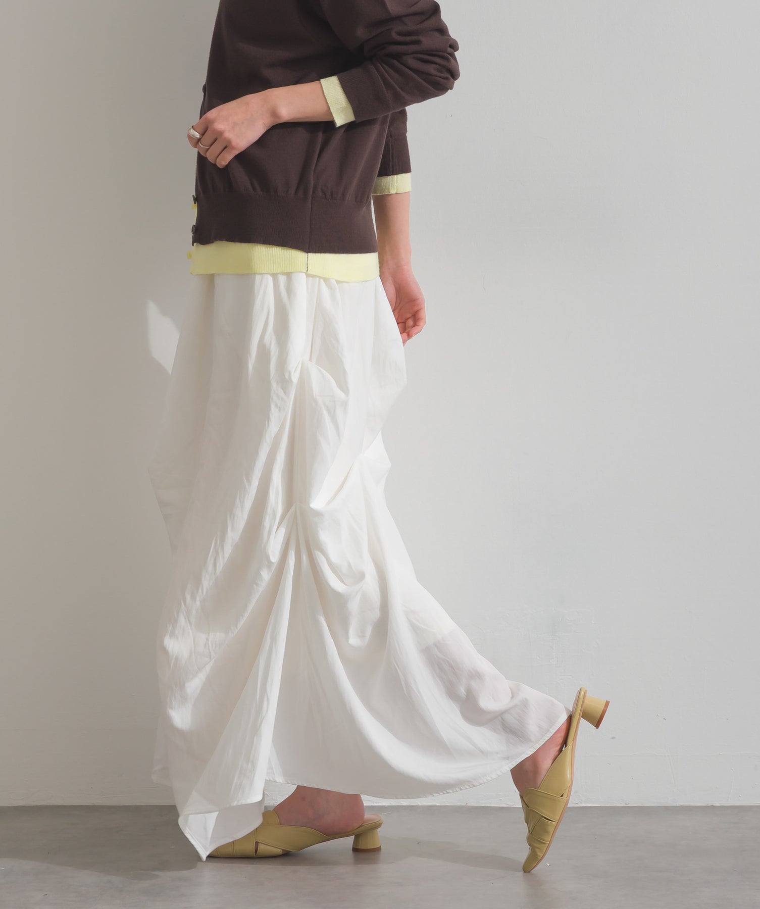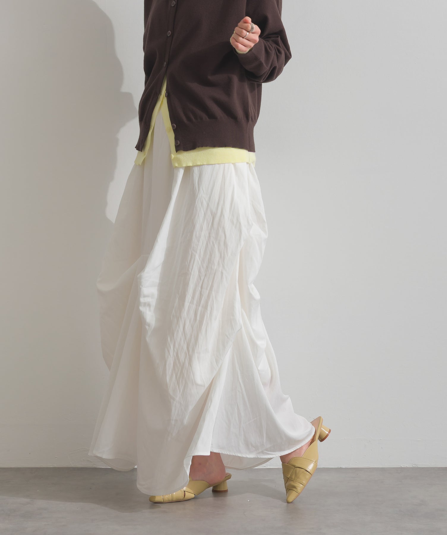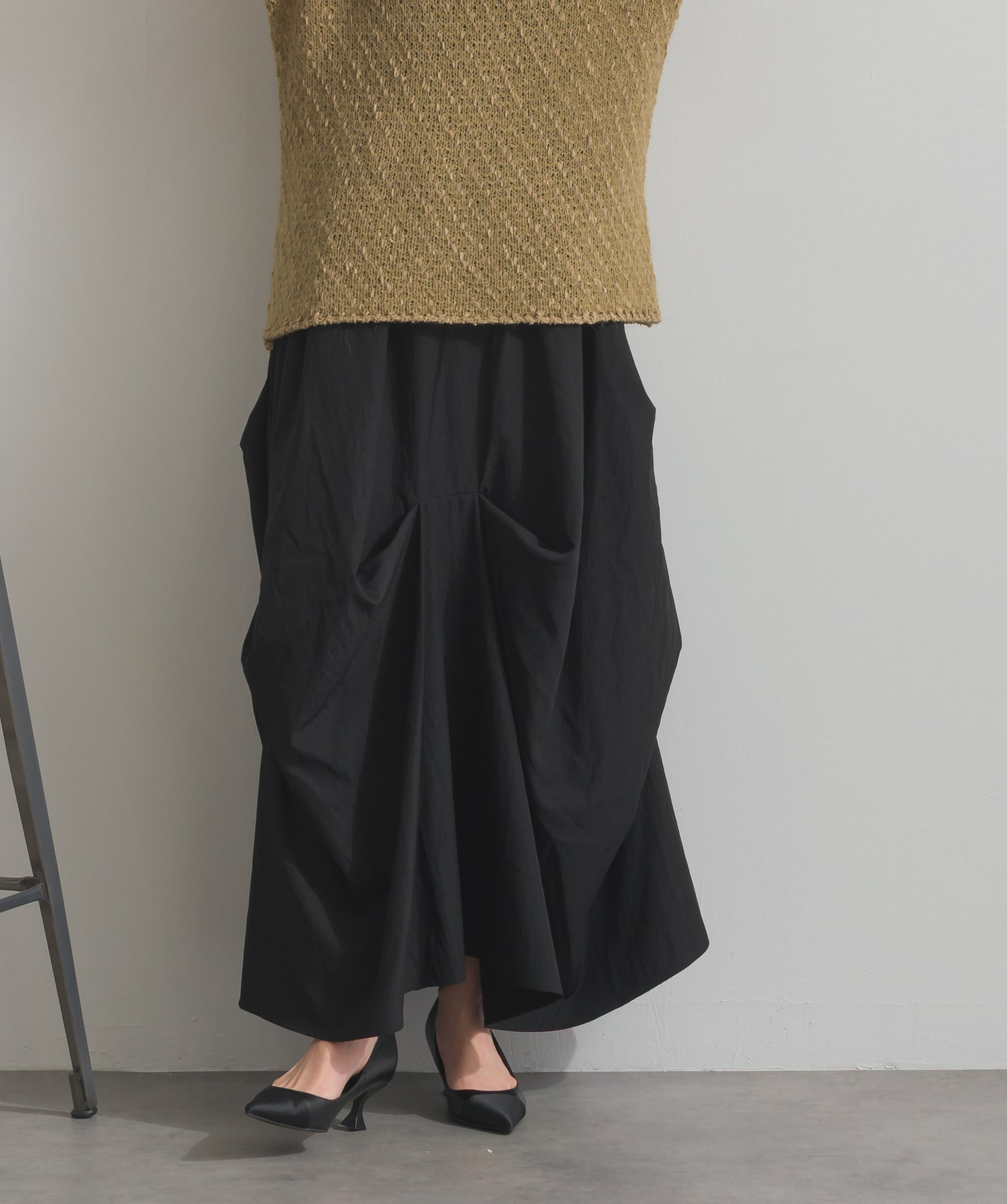 動きにアートを宿す、構築的タックの美学。-material-程よいハリ感とナチュラルなシワ加工が魅力のビンテージブロード素材。軽やかさと丈夫さを兼ね備えたコットン混生地で、シーズンレスに活躍します。透けにくく、素肌にも心地よい肌当たり。-design-アシンメトリーに施したランダムタックが、動きに合わせて立体的なシルエットを生み出す一枚。ウエストはゴム仕様で快適なフィット感を叶えつつ、ヒップまわりにボリュームを持たせすぎずすっきりとした印象に。モードにもナチュラルにも寄せられる万能デザインで、いつものコーデを格上げしてくれます。