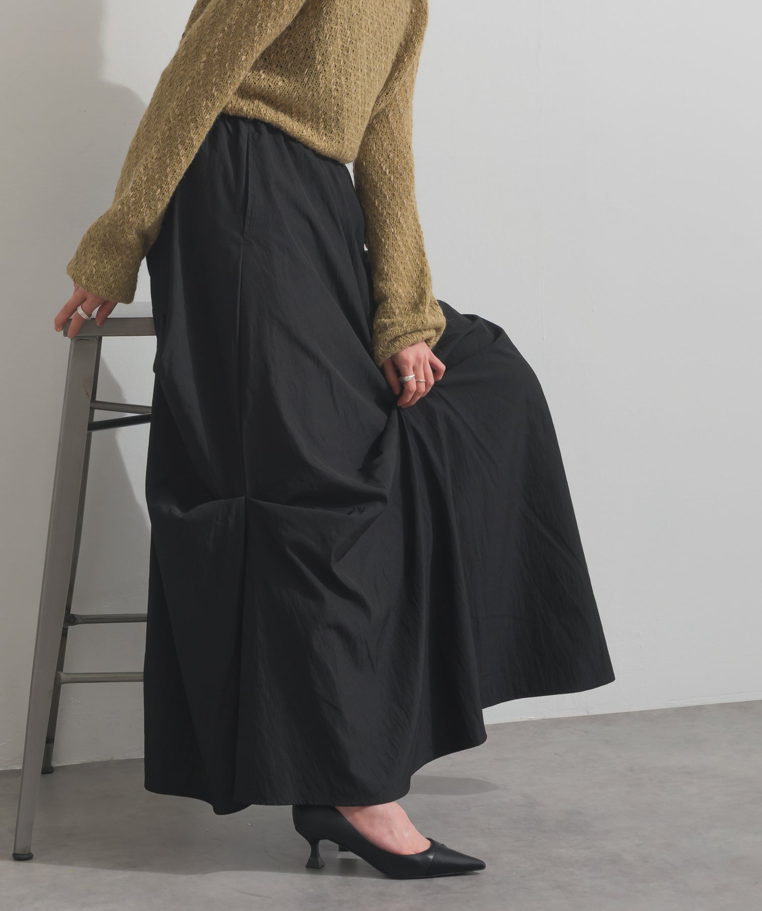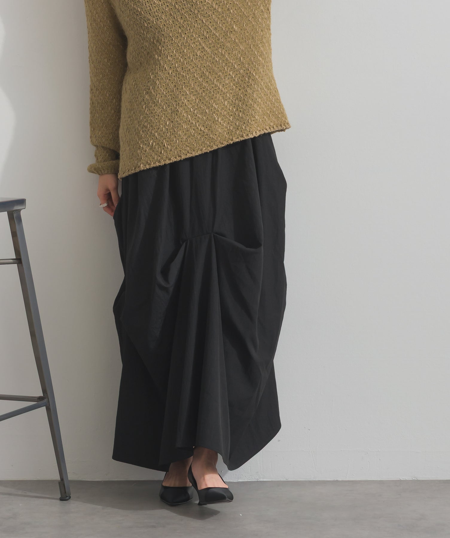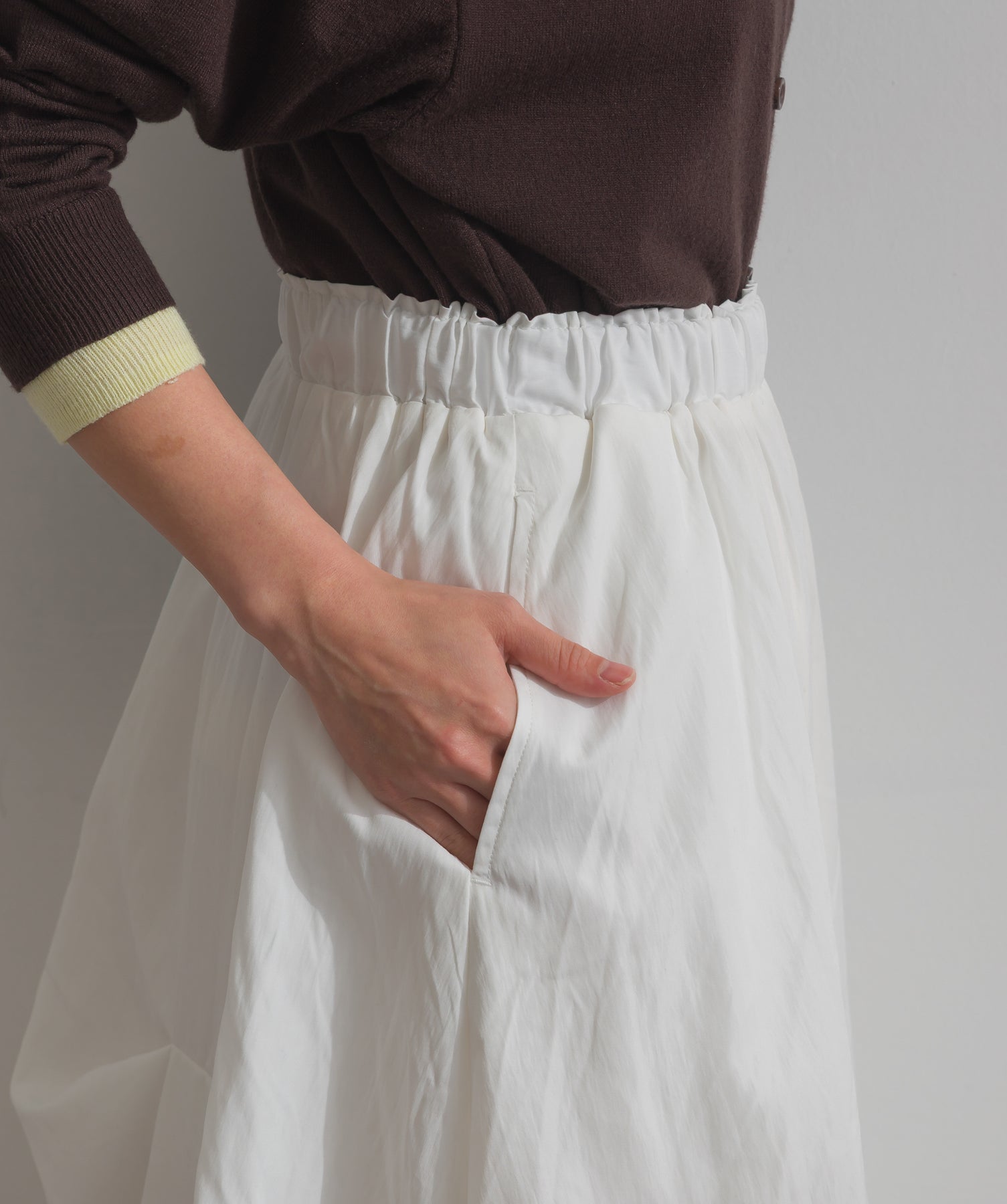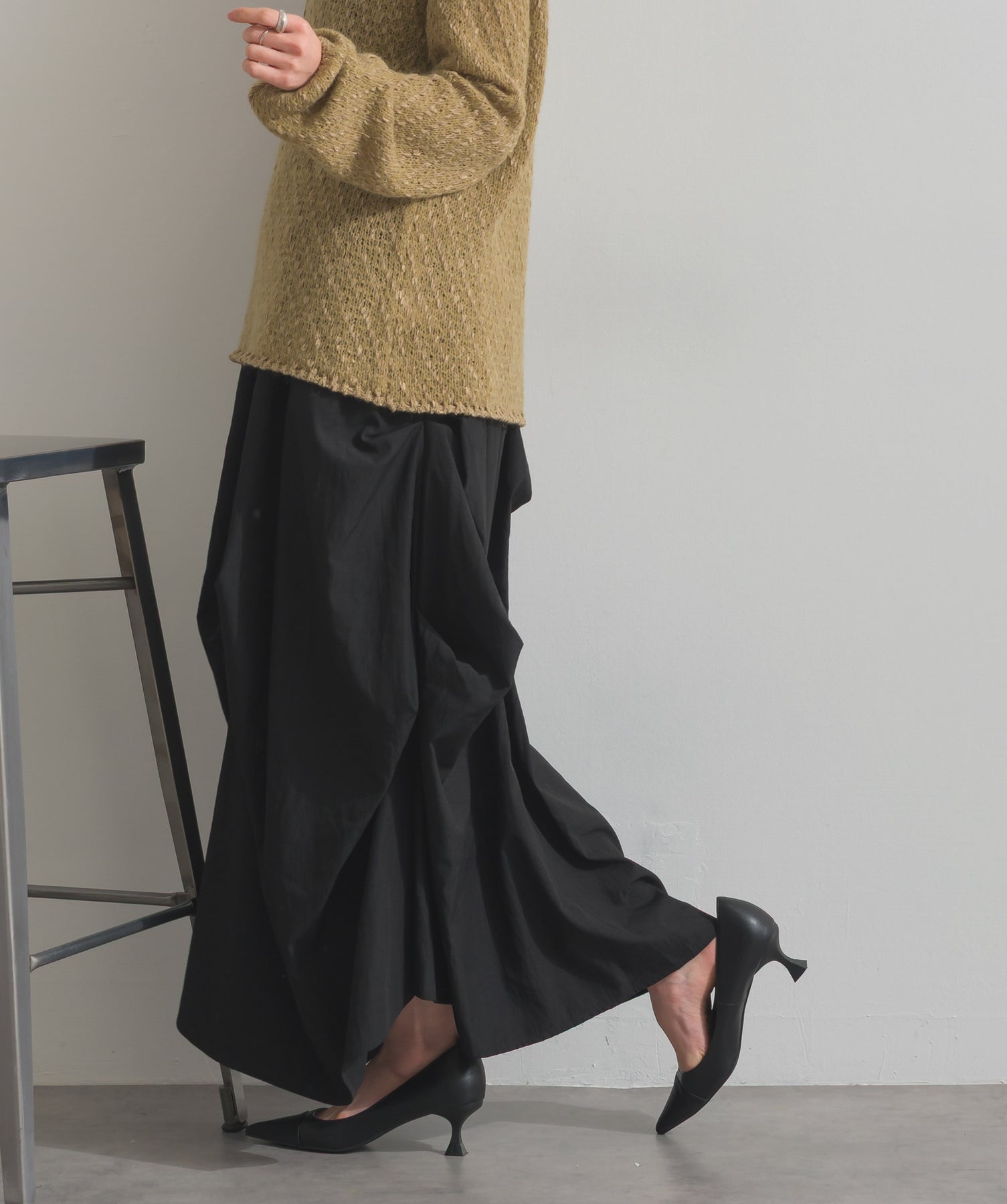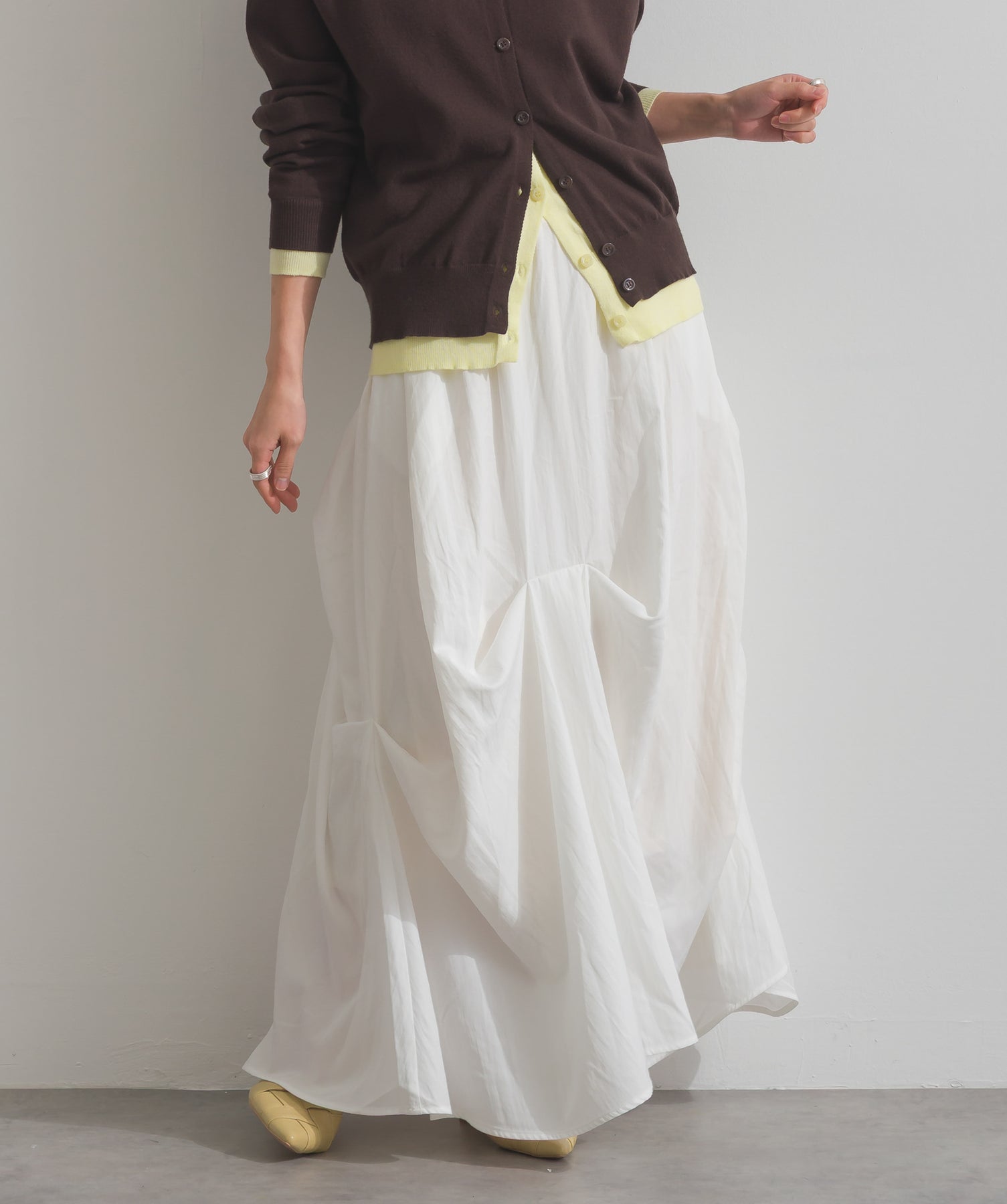 動きにアートを宿す、構築的タックの美学。-material-程よいハリ感とナチュラルなシワ加工が魅力のビンテージブロード素材。軽やかさと丈夫さを兼ね備えたコットン混生地で、シーズンレスに活躍します。透けにくく、素肌にも心地よい肌当たり。-design-アシンメトリーに施したランダムタックが、動きに合わせて立体的なシルエットを生み出す一枚。ウエストはゴム仕様で快適なフィット感を叶えつつ、ヒップまわりにボリュームを持たせすぎずすっきりとした印象に。モードにもナチュラルにも寄せられる万能デザインで、いつものコーデを格上げしてくれます。