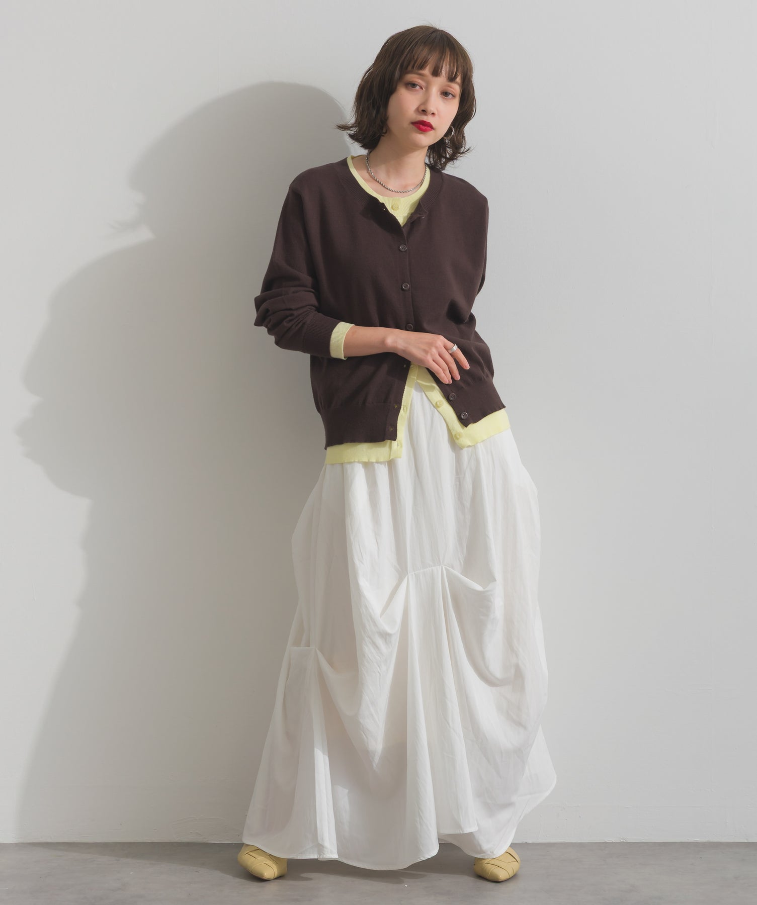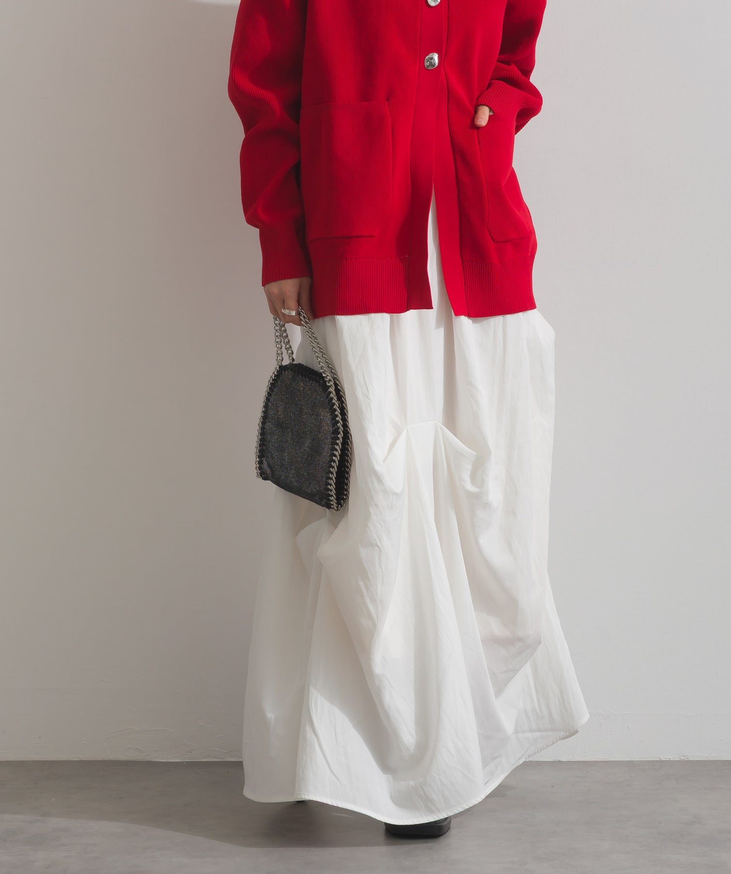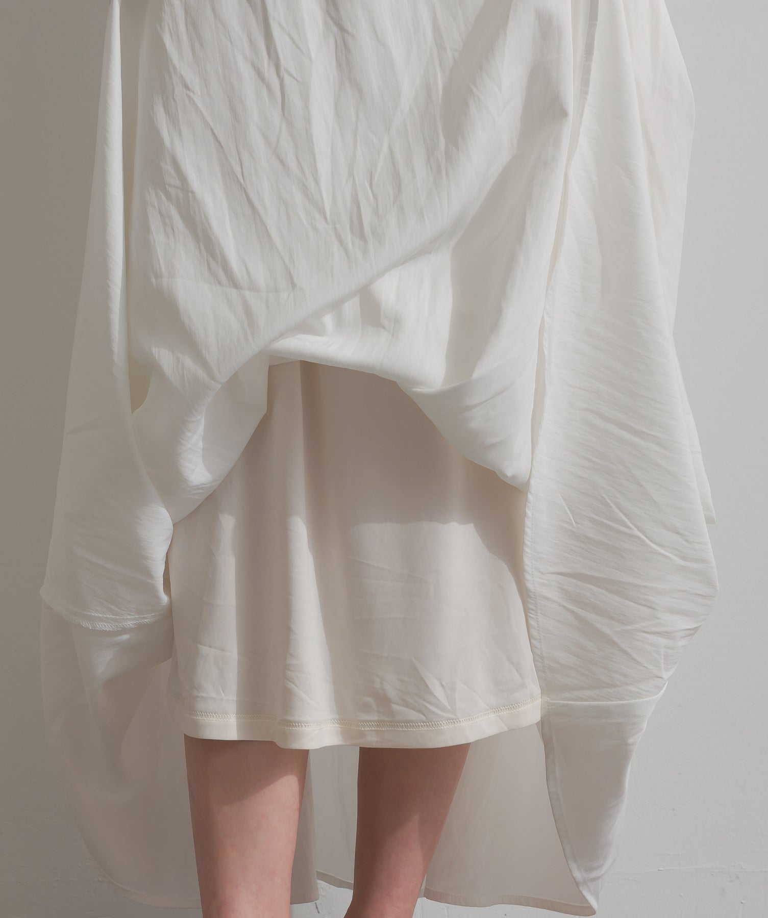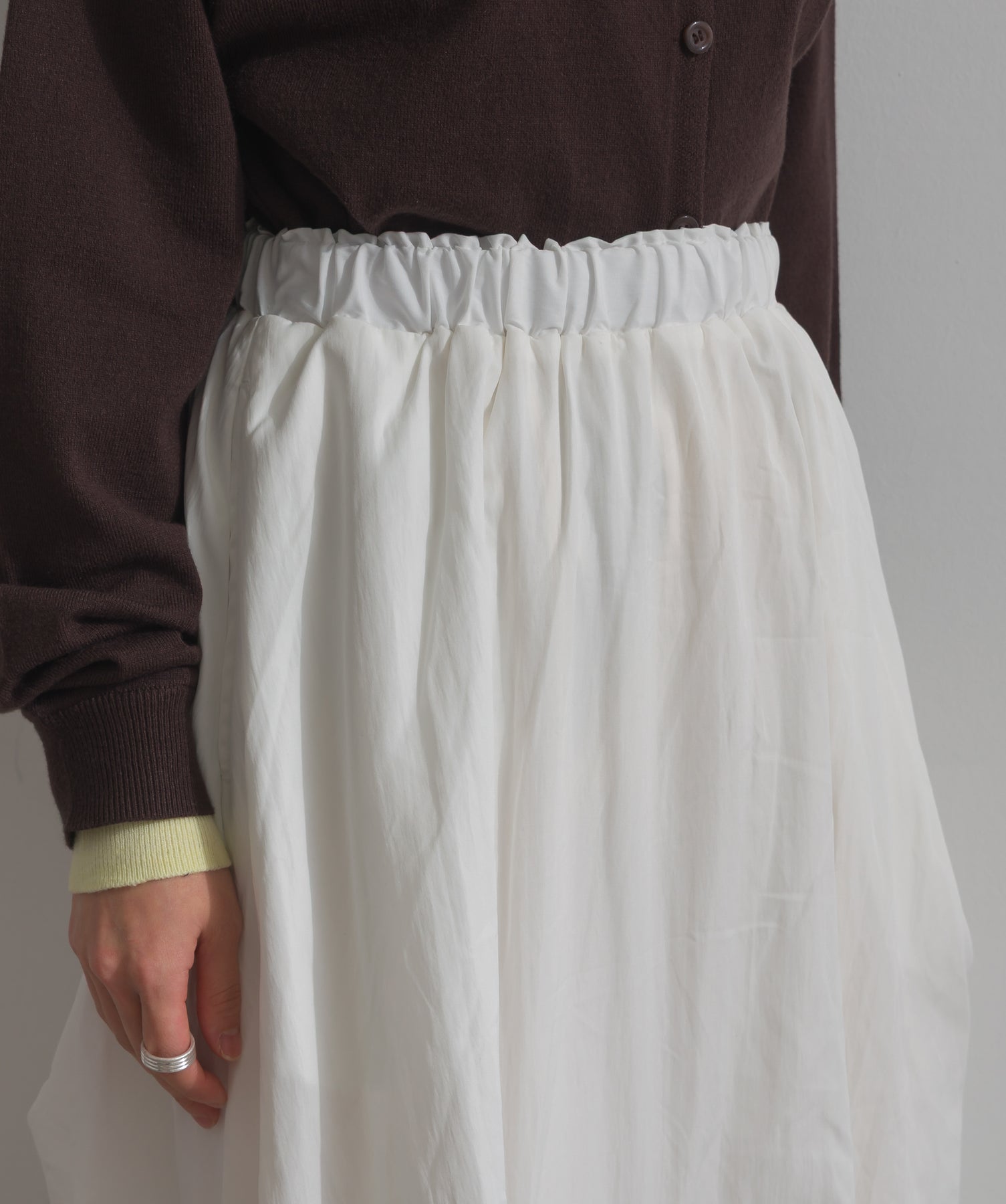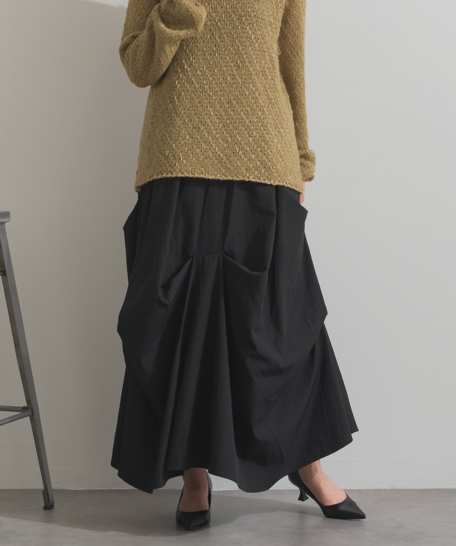 動きにアートを宿す、構築的タックの美学。-material-程よいハリ感とナチュラルなシワ加工が魅力のビンテージブロード素材。軽やかさと丈夫さを兼ね備えたコットン混生地で、シーズンレスに活躍します。透けにくく、素肌にも心地よい肌当たり。-design-アシンメトリーに施したランダムタックが、動きに合わせて立体的なシルエットを生み出す一枚。ウエストはゴム仕様で快適なフィット感を叶えつつ、ヒップまわりにボリュームを持たせすぎずすっきりとした印象に。モードにもナチュラルにも寄せられる万能デザインで、いつものコーデを格上げしてくれます。