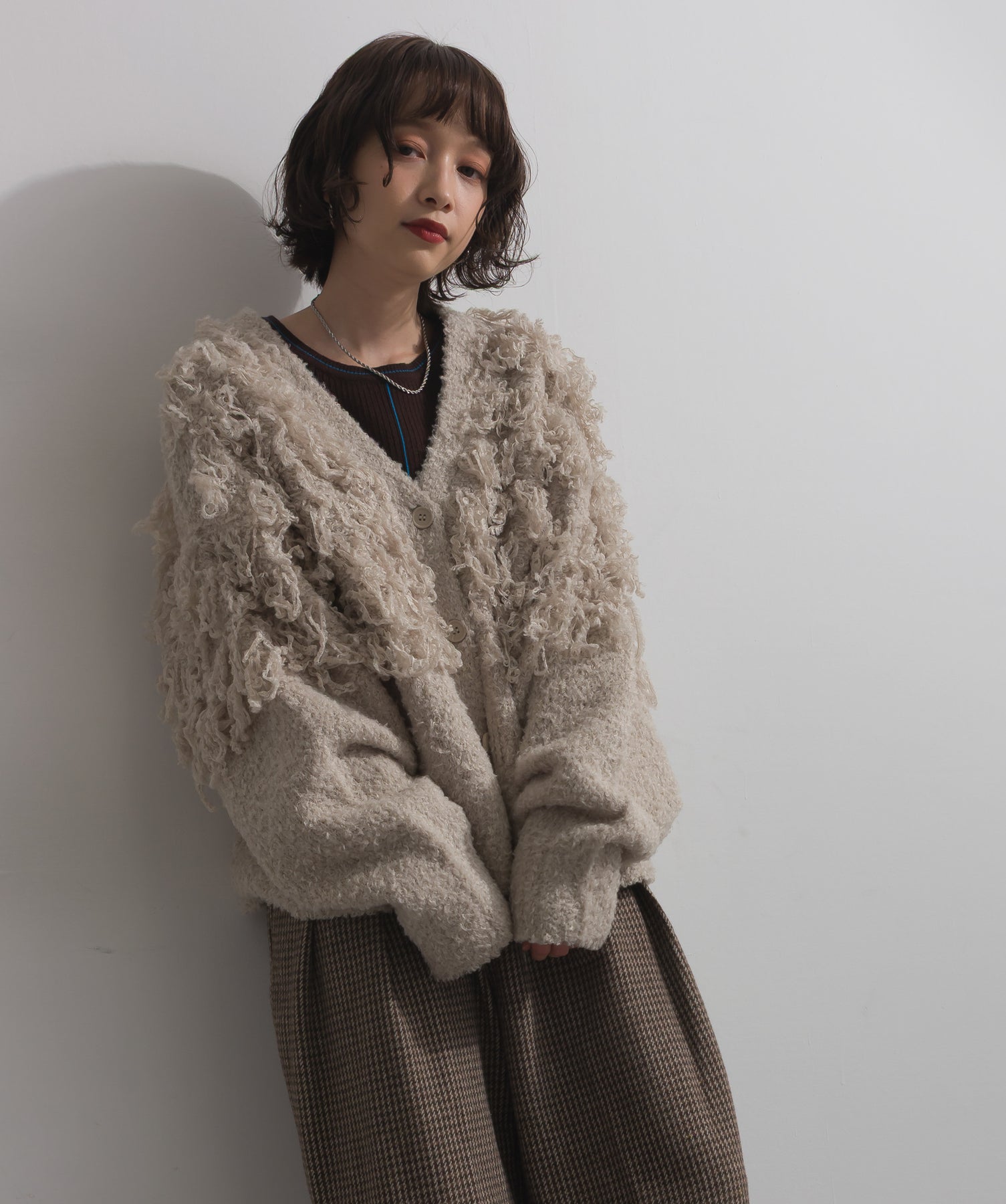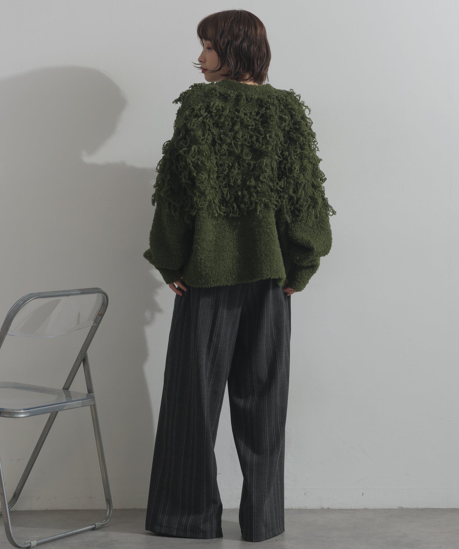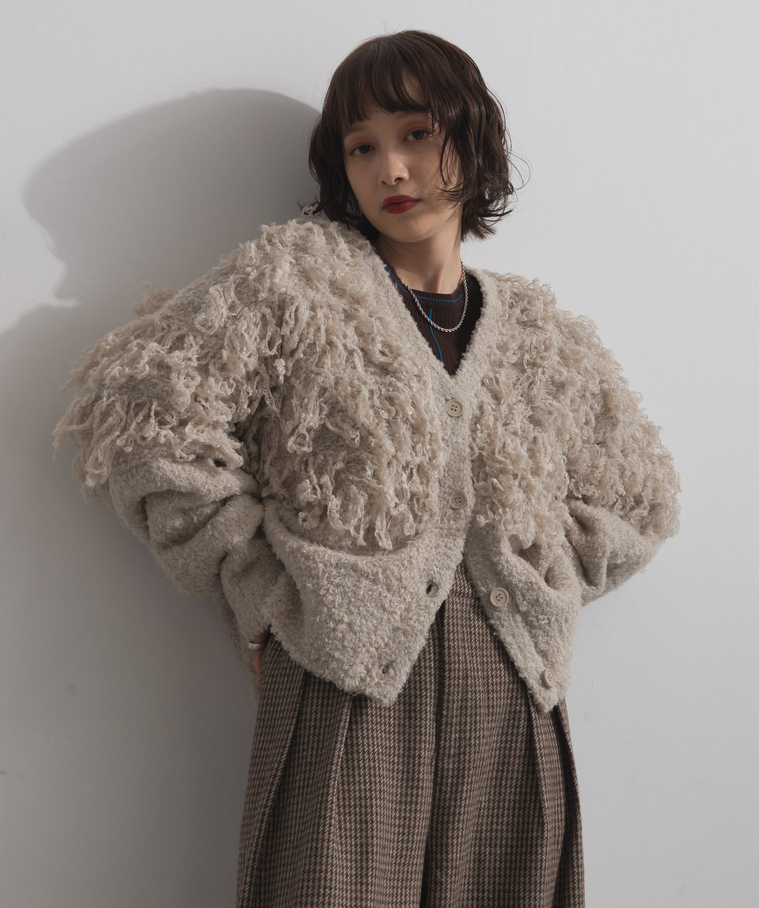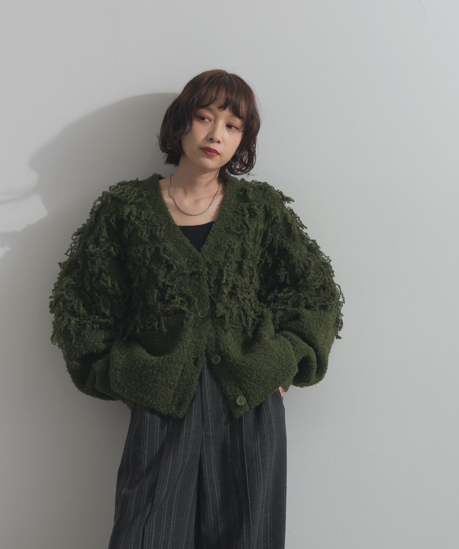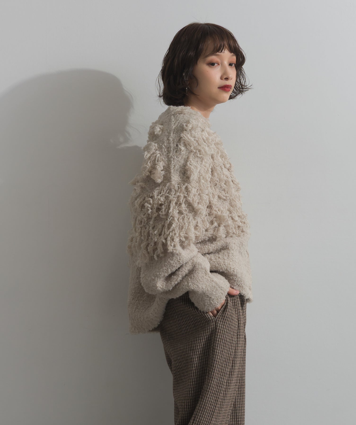 存在感で魅せる、表情豊かなループニット。-material-毛足の長いループヤーンを使用した表情豊かなニット素材。 ふわっとした柔らかさとしっかりとしたボリューム感があり、見た目にもあたたかみのある一枚です。肌当たりも優しく、チクチクしにくい着心地が魅力。-design-フロントから背中にかけて施されたループ編みのデザインが、他にはないインパクトを演出。程よくオーバーサイズなシルエットとドロップショルダーで抜け感があり、羽織るだけでコーデの主役に。 ざっくりと開いたVネックがデコルテを美しく見せ、インナーとのレイヤードも楽しめます。パンツにもスカートにも合わせやすく、デイリーからイベントシーンまで活躍。