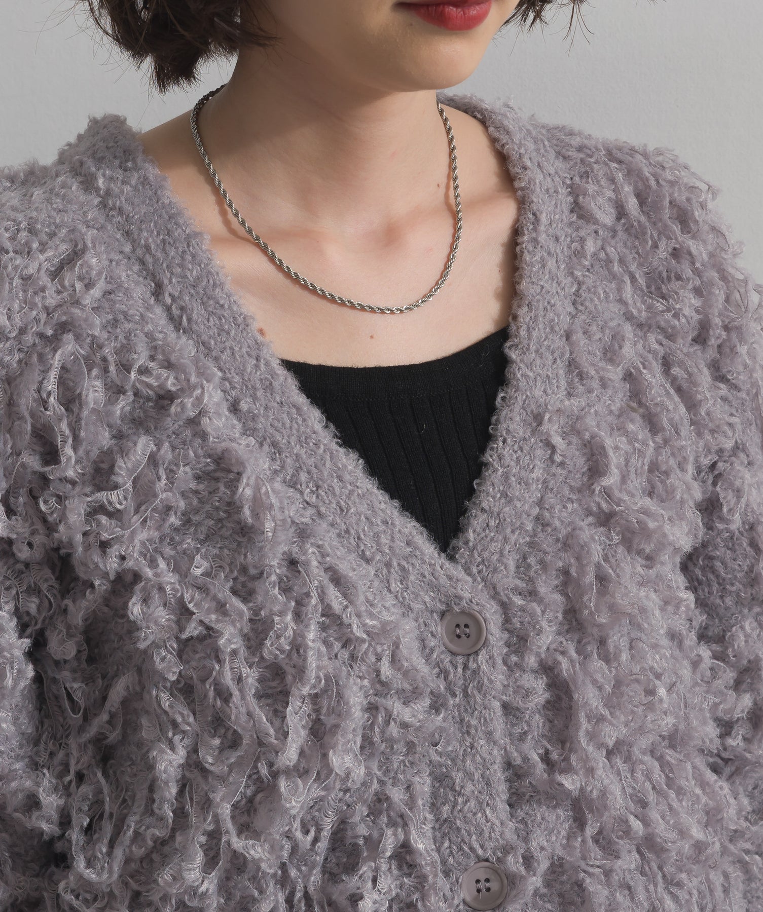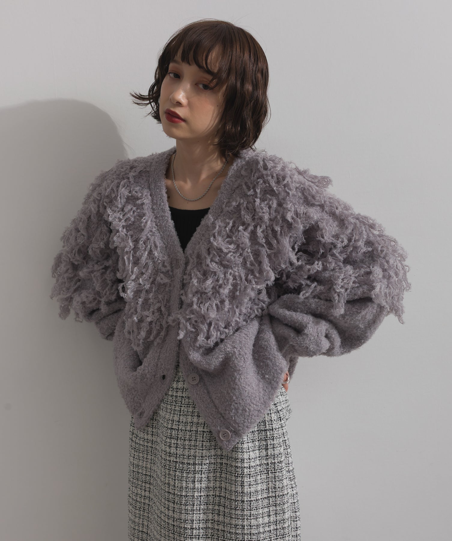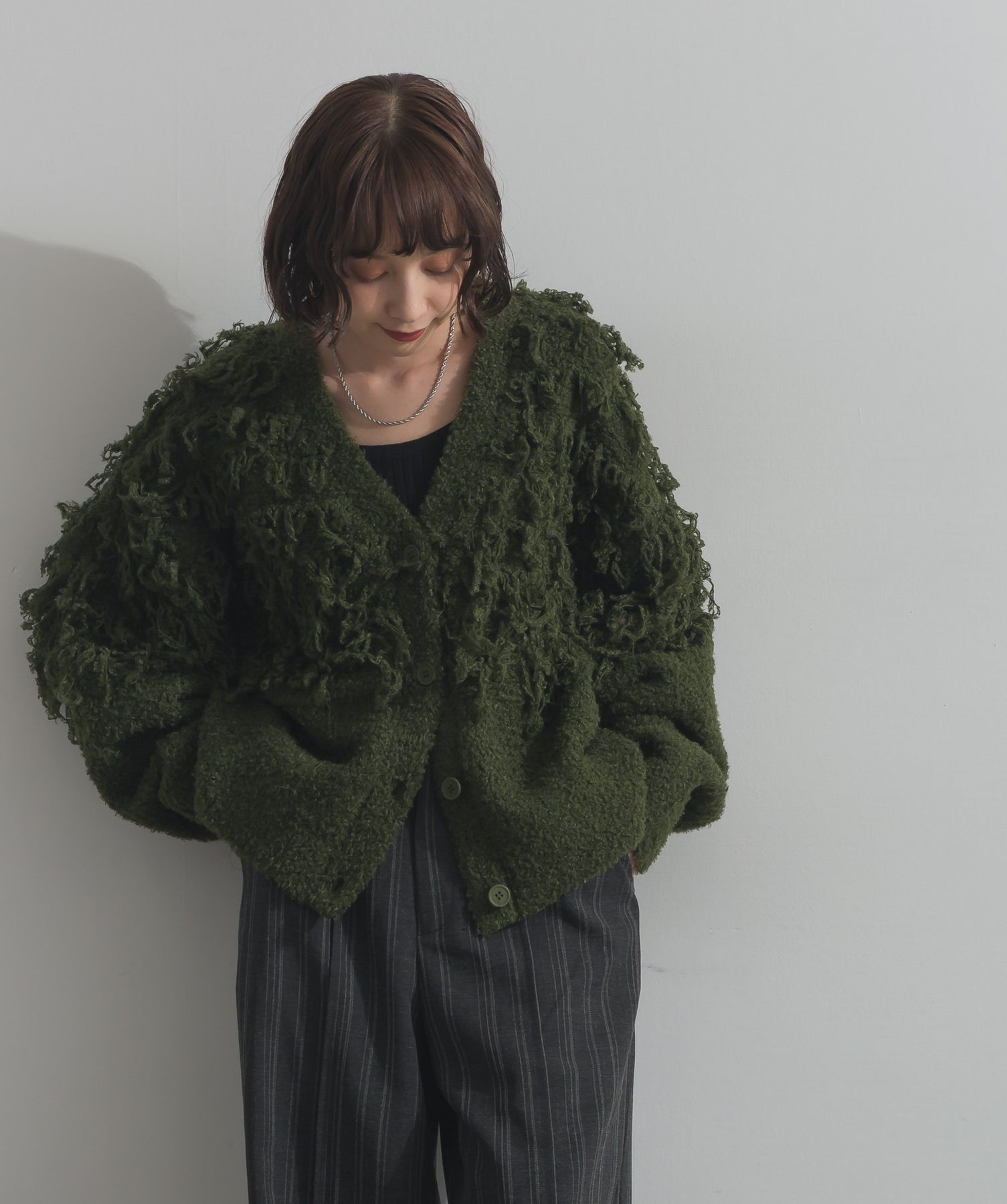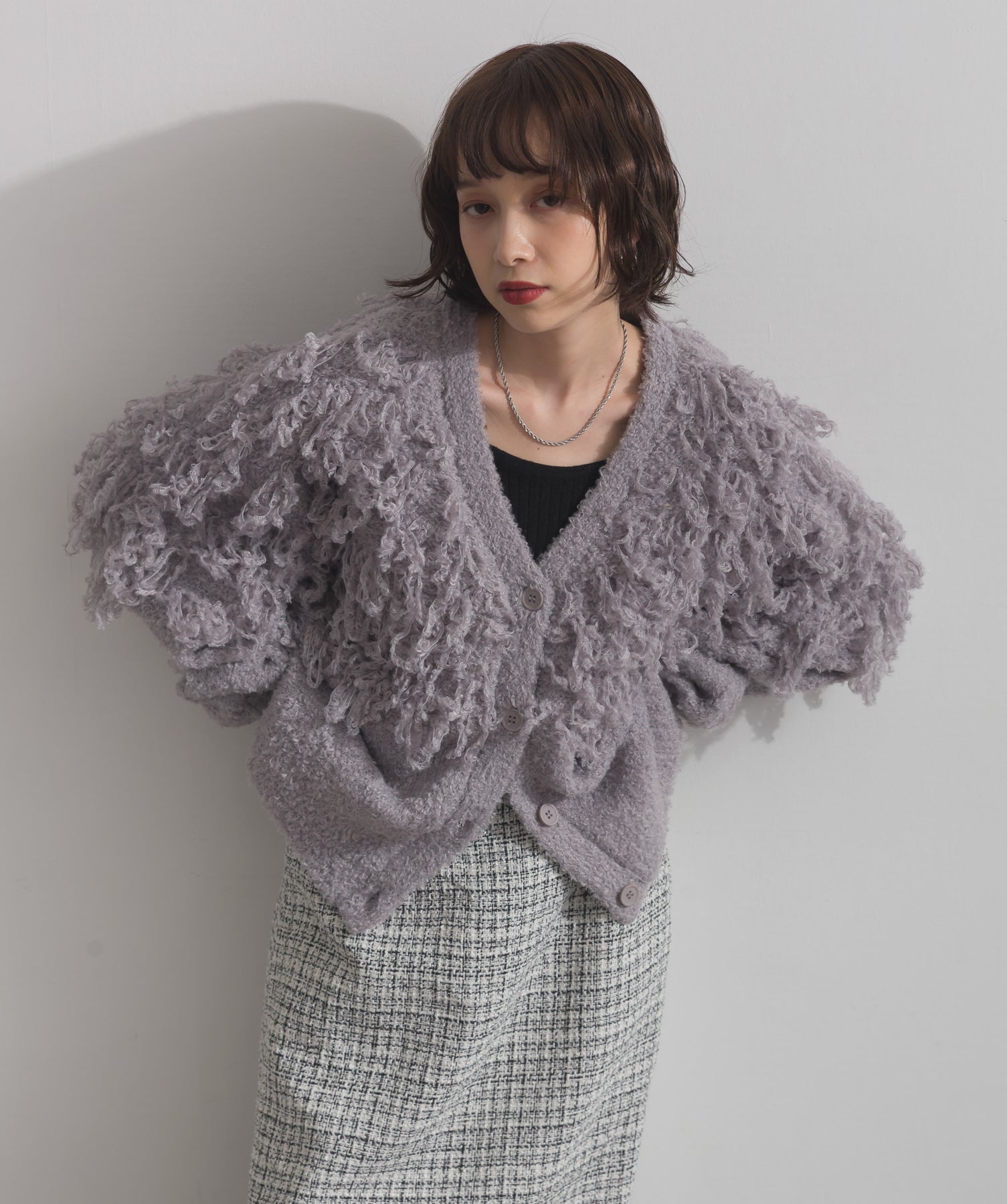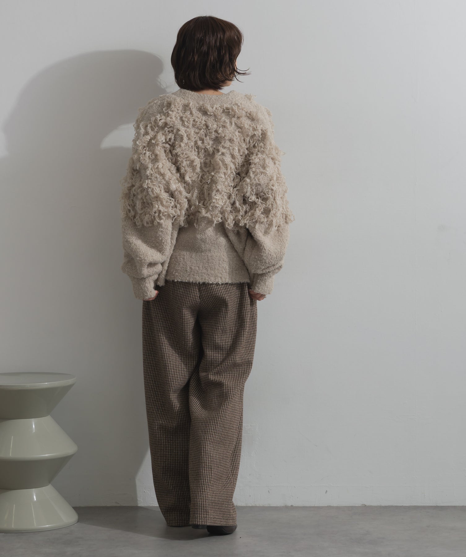存在感で魅せる、表情豊かなループニット。-material-毛足の長いループヤーンを使用した表情豊かなニット素材。 ふわっとした柔らかさとしっかりとしたボリューム感があり、見た目にもあたたかみのある一枚です。肌当たりも優しく、チクチクしにくい着心地が魅力。-design-フロントから背中にかけて施されたループ編みのデザインが、他にはないインパクトを演出。程よくオーバーサイズなシルエットとドロップショルダーで抜け感があり、羽織るだけでコーデの主役に。 ざっくりと開いたVネックがデコルテを美しく見せ、インナーとのレイヤードも楽しめます。パンツにもスカートにも合わせやすく、デイリーからイベントシーンまで活躍。