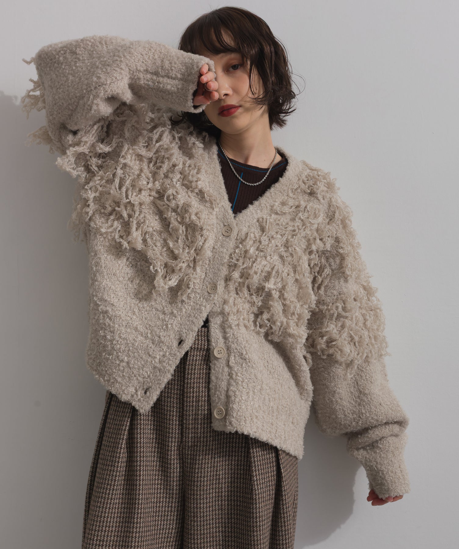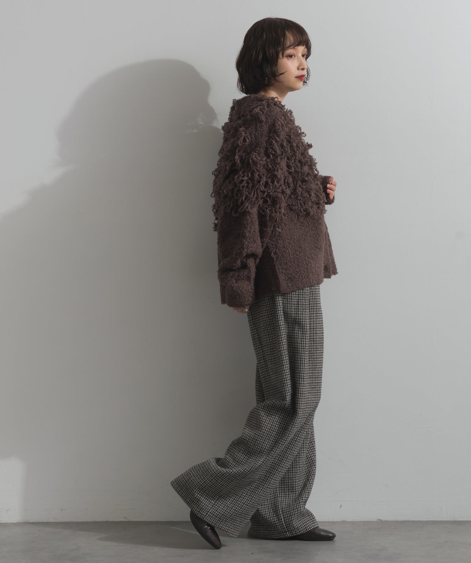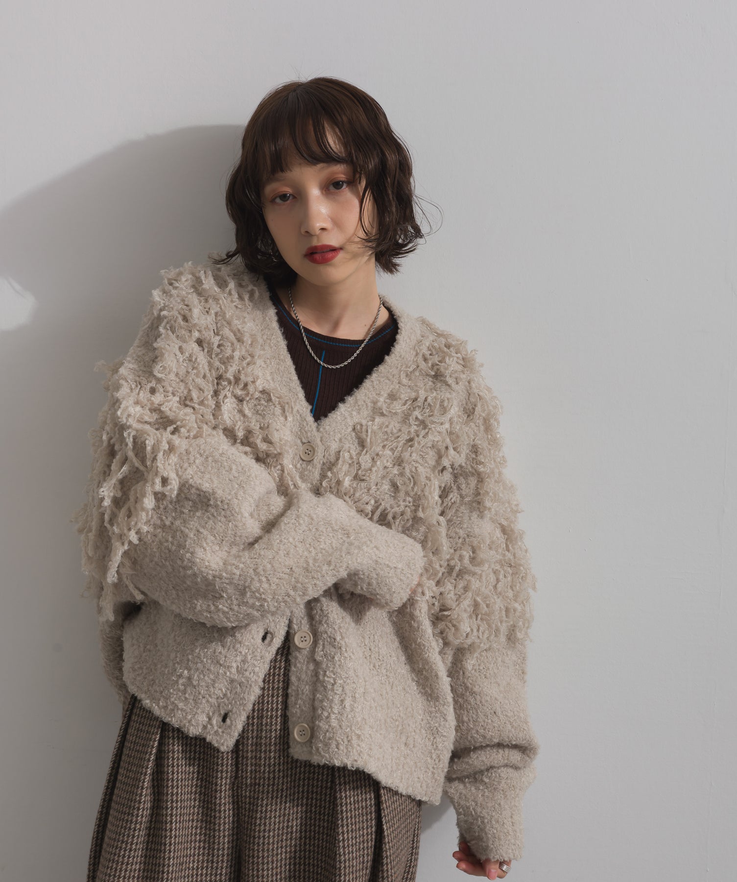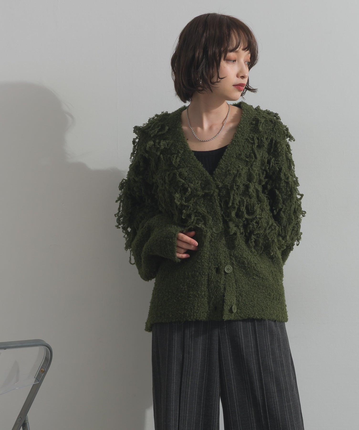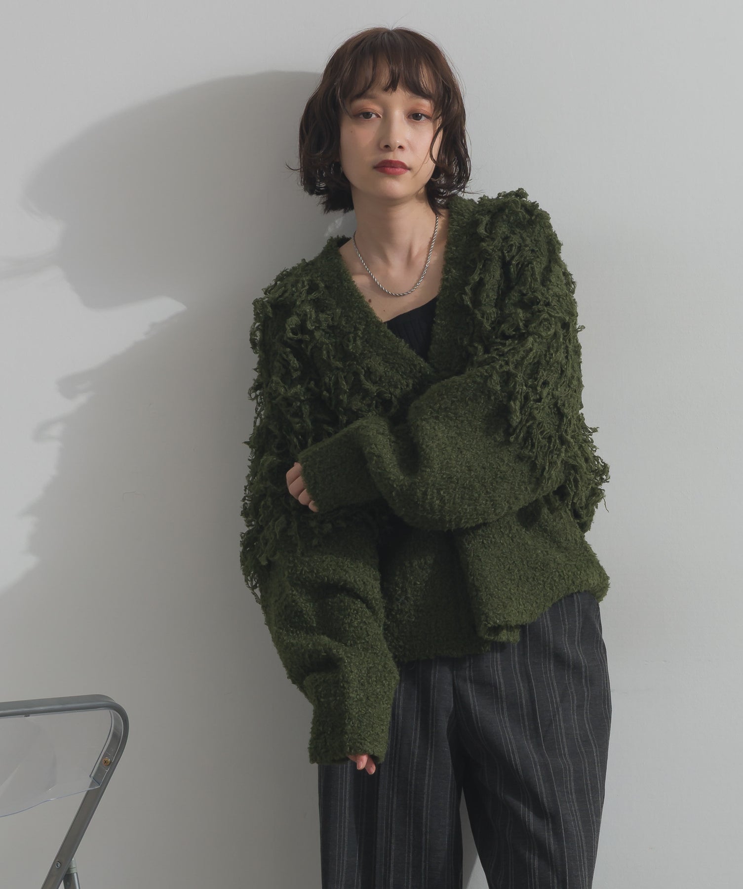 存在感で魅せる、表情豊かなループニット。-material-毛足の長いループヤーンを使用した表情豊かなニット素材。 ふわっとした柔らかさとしっかりとしたボリューム感があり、見た目にもあたたかみのある一枚です。肌当たりも優しく、チクチクしにくい着心地が魅力。-design-フロントから背中にかけて施されたループ編みのデザインが、他にはないインパクトを演出。程よくオーバーサイズなシルエットとドロップショルダーで抜け感があり、羽織るだけでコーデの主役に。 ざっくりと開いたVネックがデコルテを美しく見せ、インナーとのレイヤードも楽しめます。パンツにもスカートにも合わせやすく、デイリーからイベントシーンまで活躍。