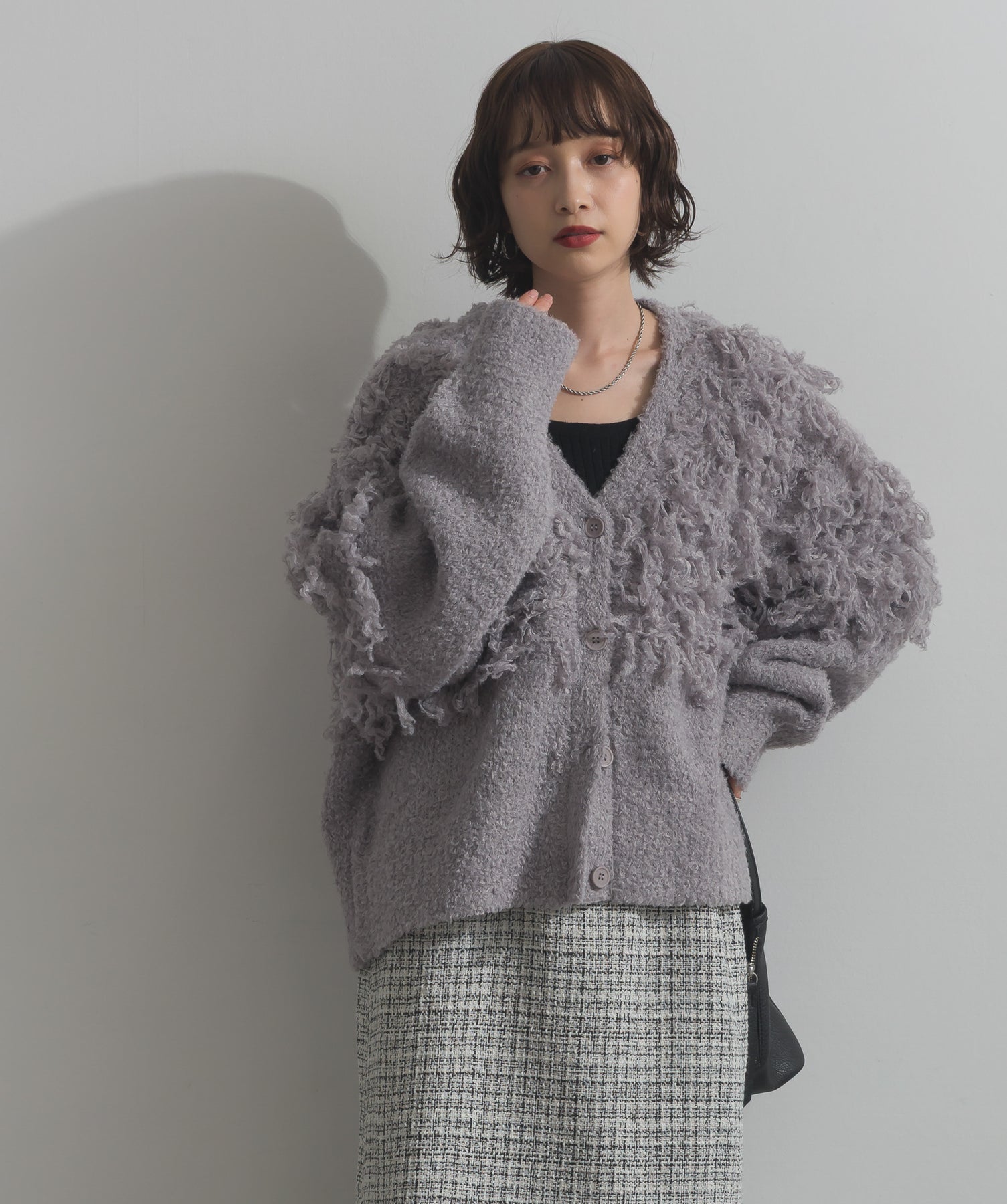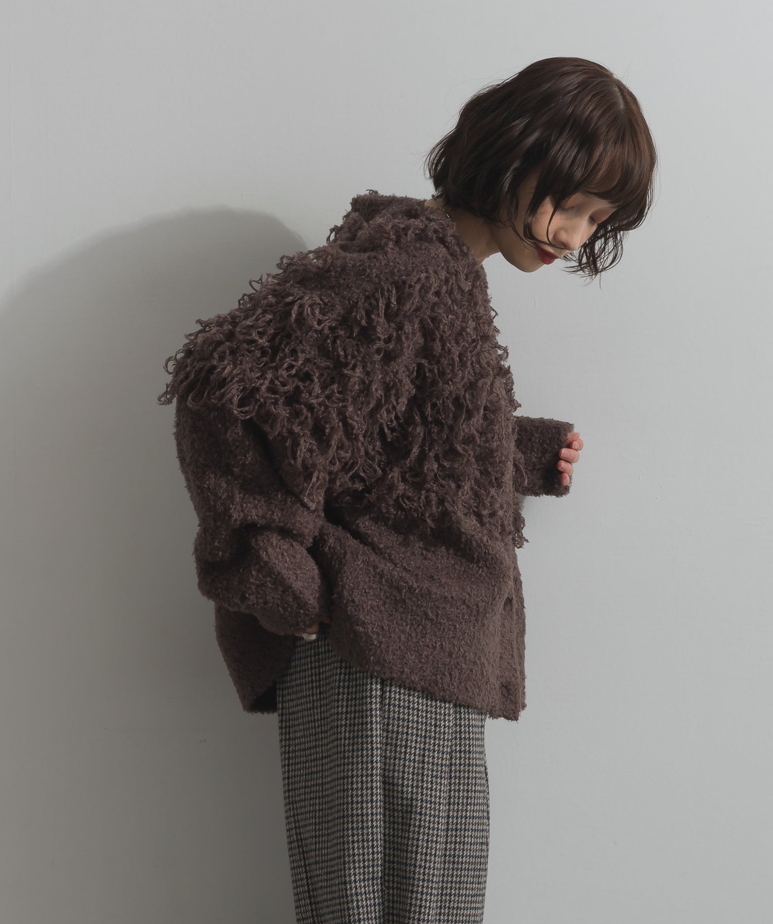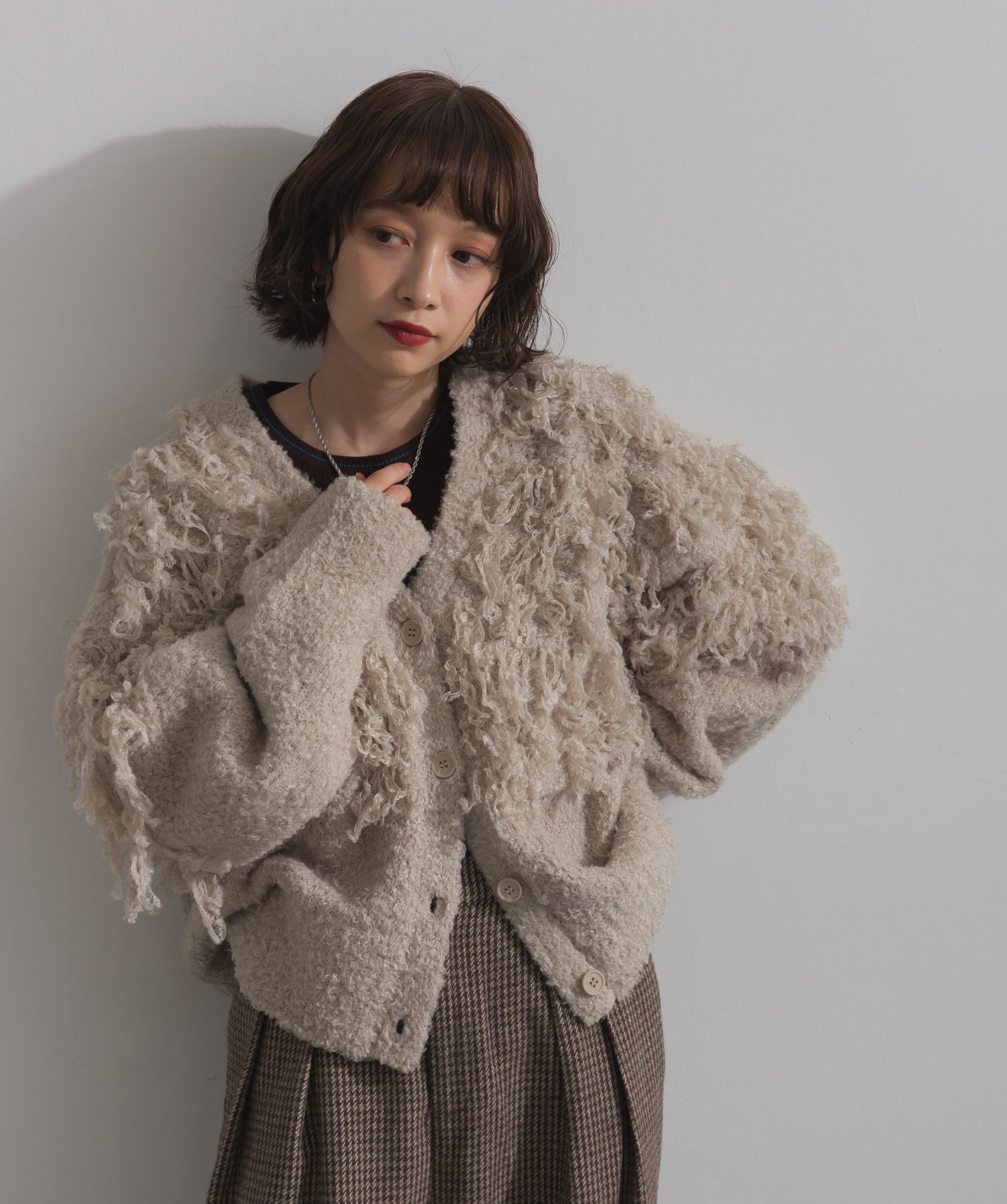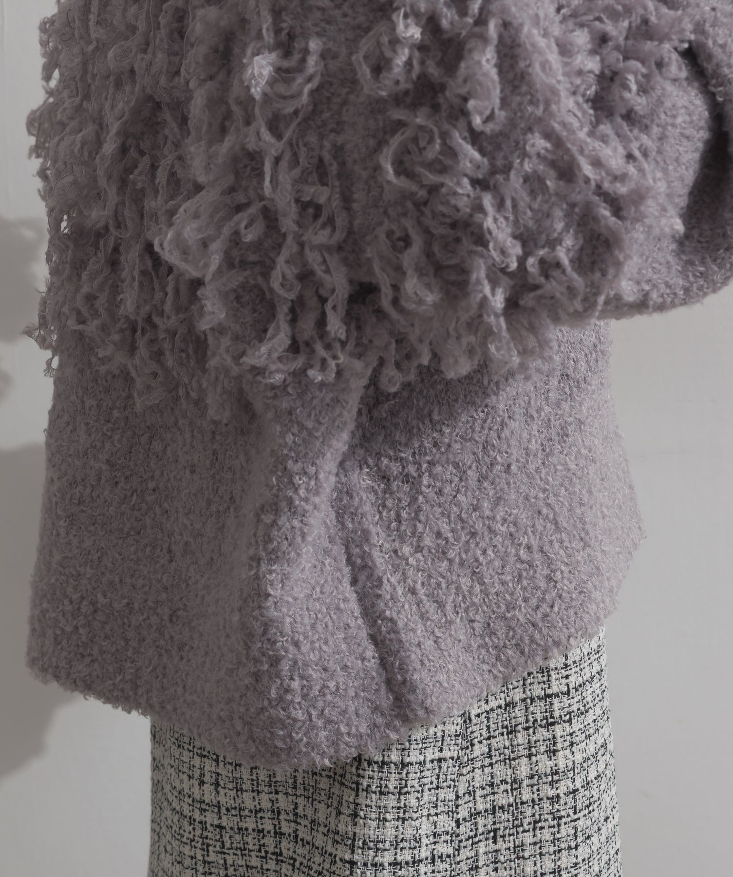 存在感で魅せる、表情豊かなループニット。-material-毛足の長いループヤーンを使用した表情豊かなニット素材。 ふわっとした柔らかさとしっかりとしたボリューム感があり、見た目にもあたたかみのある一枚です。肌当たりも優しく、チクチクしにくい着心地が魅力。-design-フロントから背中にかけて施されたループ編みのデザインが、他にはないインパクトを演出。程よくオーバーサイズなシルエットとドロップショルダーで抜け感があり、羽織るだけでコーデの主役に。 ざっくりと開いたVネックがデコルテを美しく見せ、インナーとのレイヤードも楽しめます。パンツにもスカートにも合わせやすく、デイリーからイベントシーンまで活躍。
