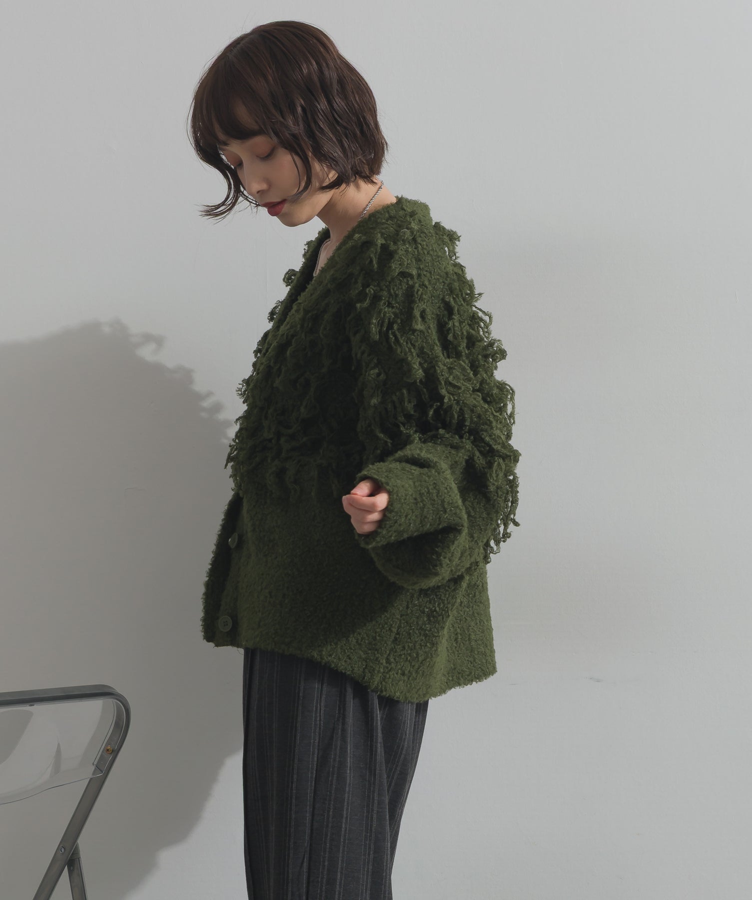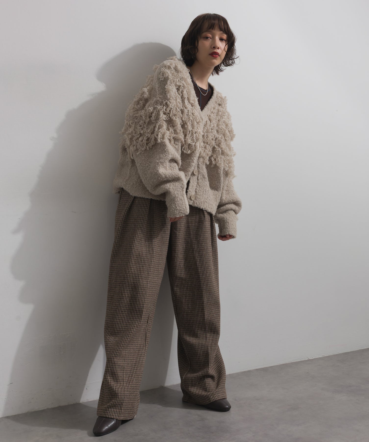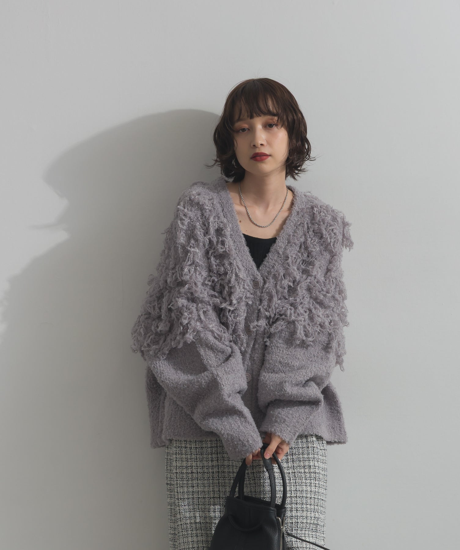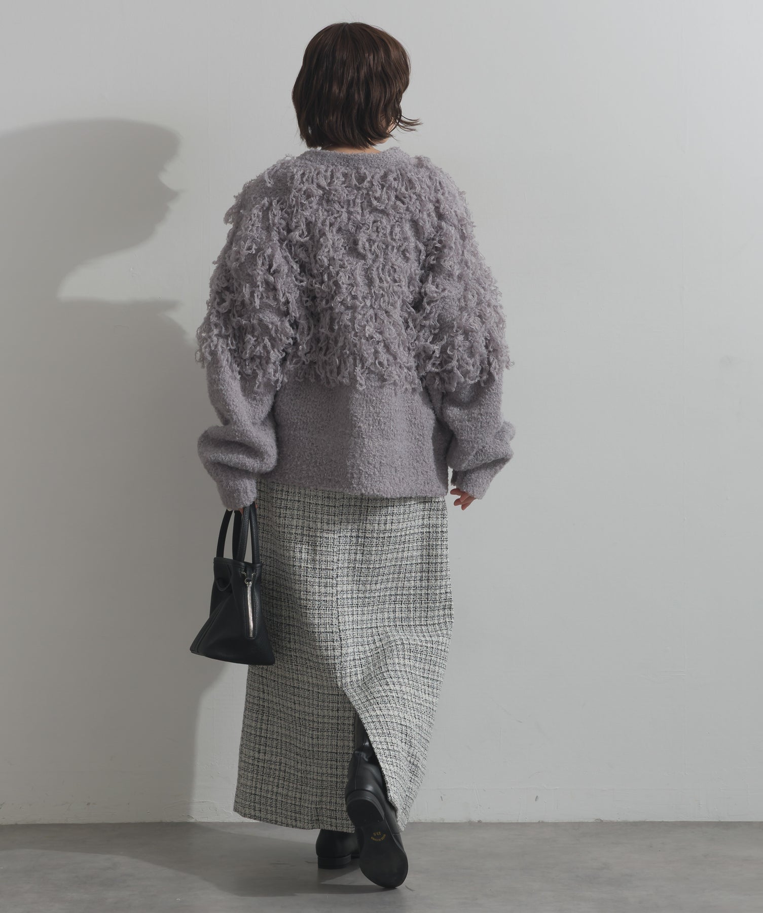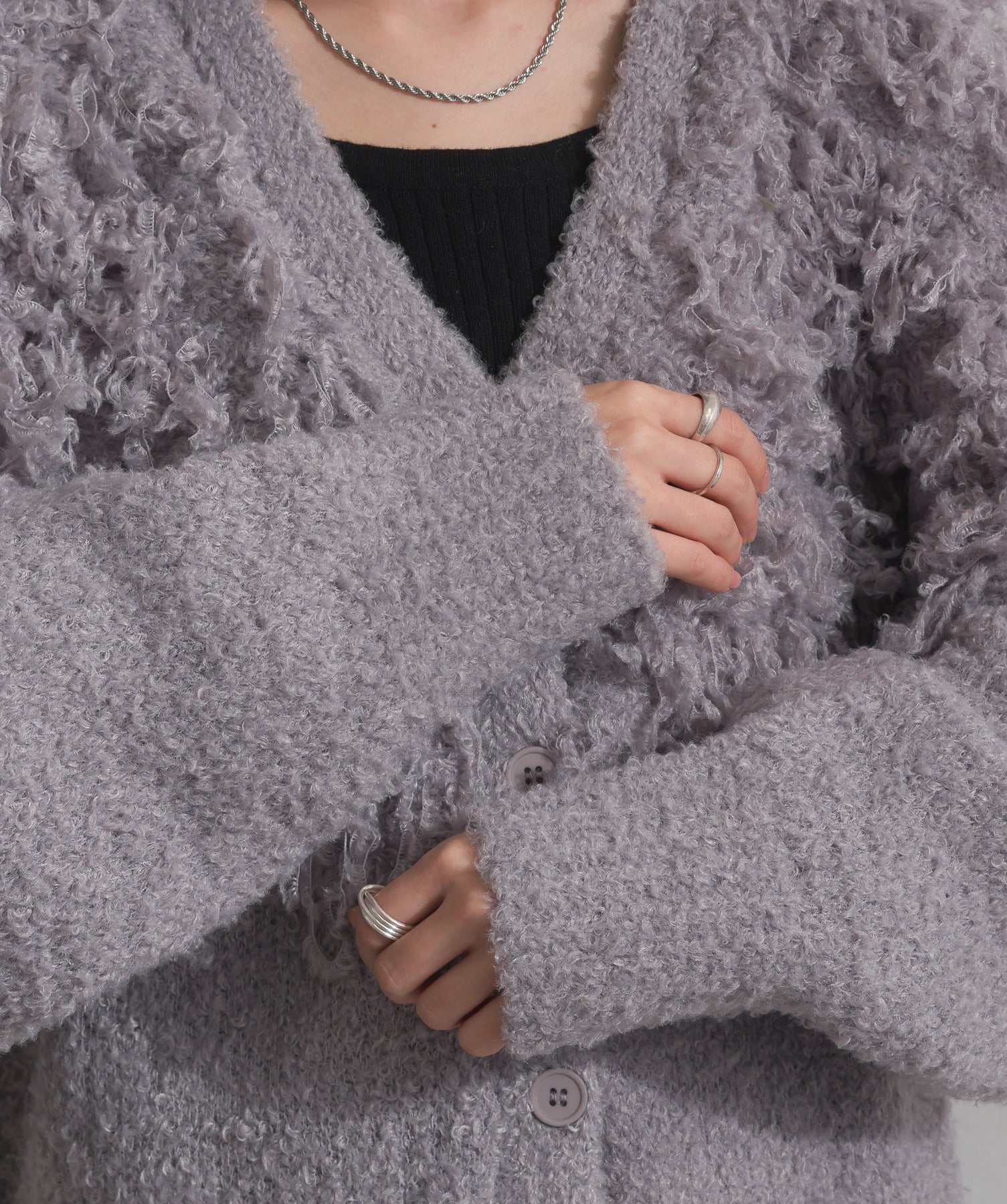 存在感で魅せる、表情豊かなループニット。-material-毛足の長いループヤーンを使用した表情豊かなニット素材。 ふわっとした柔らかさとしっかりとしたボリューム感があり、見た目にもあたたかみのある一枚です。肌当たりも優しく、チクチクしにくい着心地が魅力。-design-フロントから背中にかけて施されたループ編みのデザインが、他にはないインパクトを演出。程よくオーバーサイズなシルエットとドロップショルダーで抜け感があり、羽織るだけでコーデの主役に。 ざっくりと開いたVネックがデコルテを美しく見せ、インナーとのレイヤードも楽しめます。パンツにもスカートにも合わせやすく、デイリーからイベントシーンまで活躍。