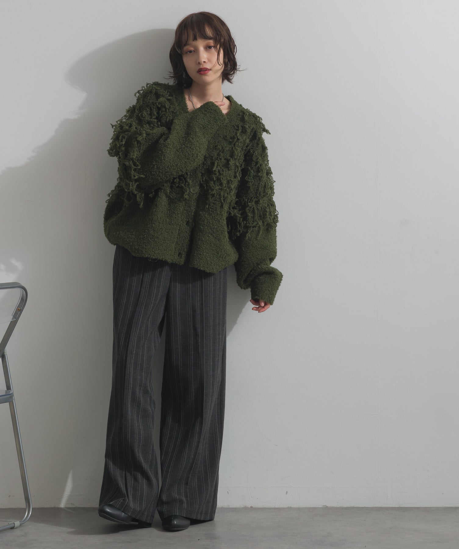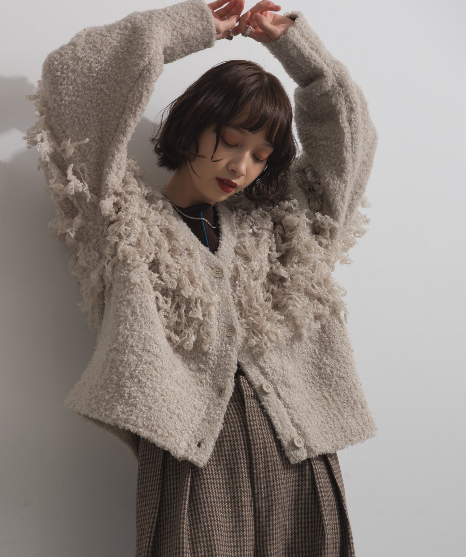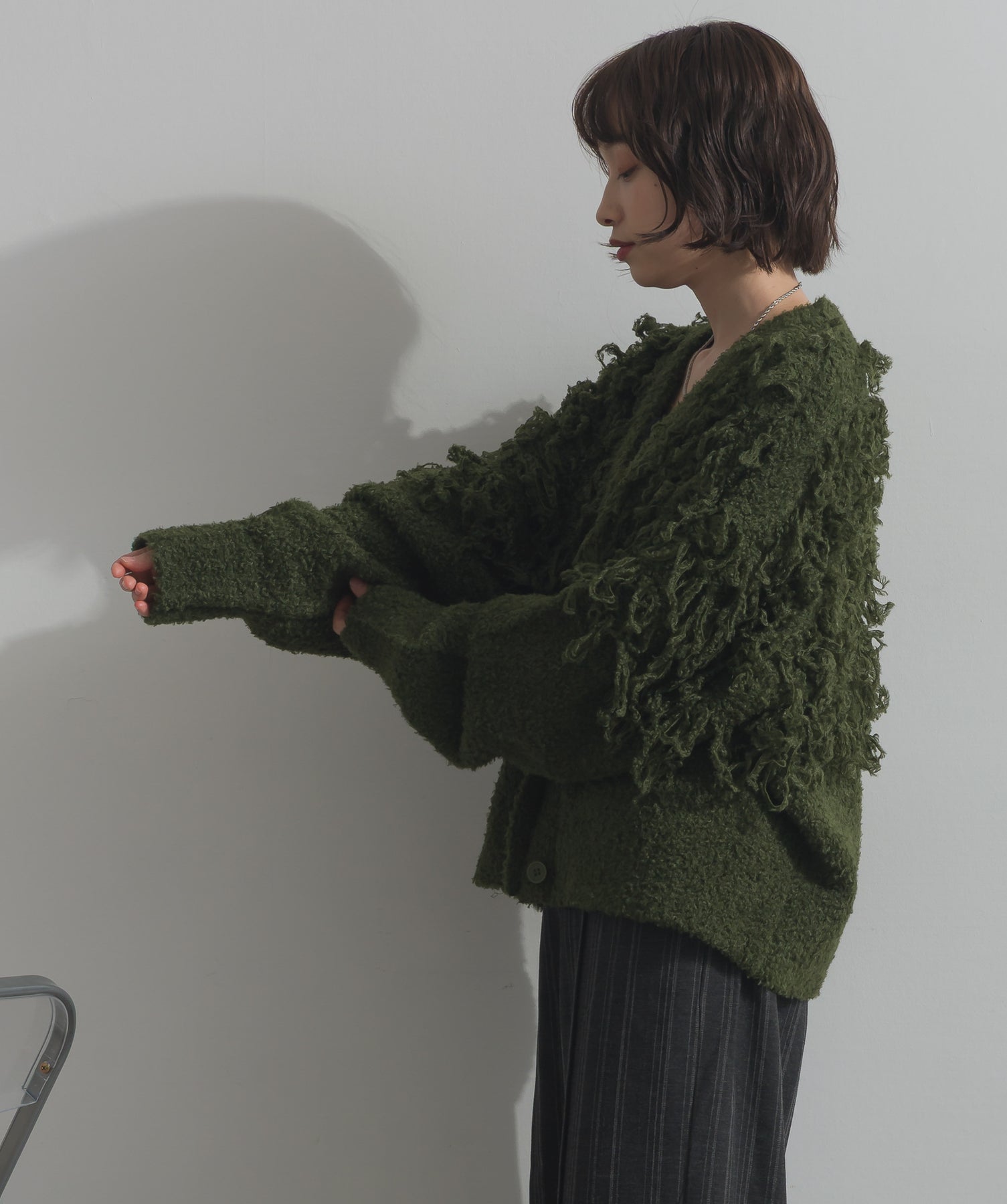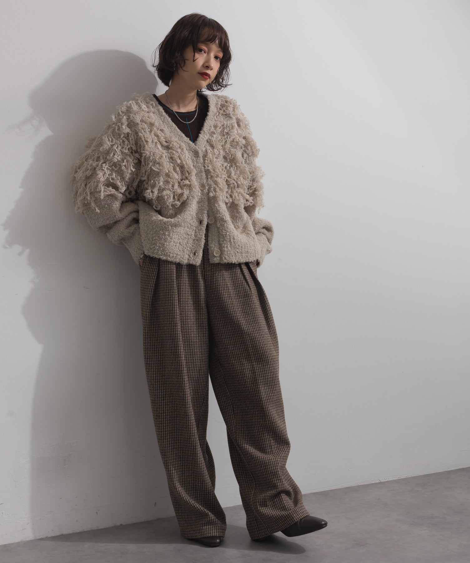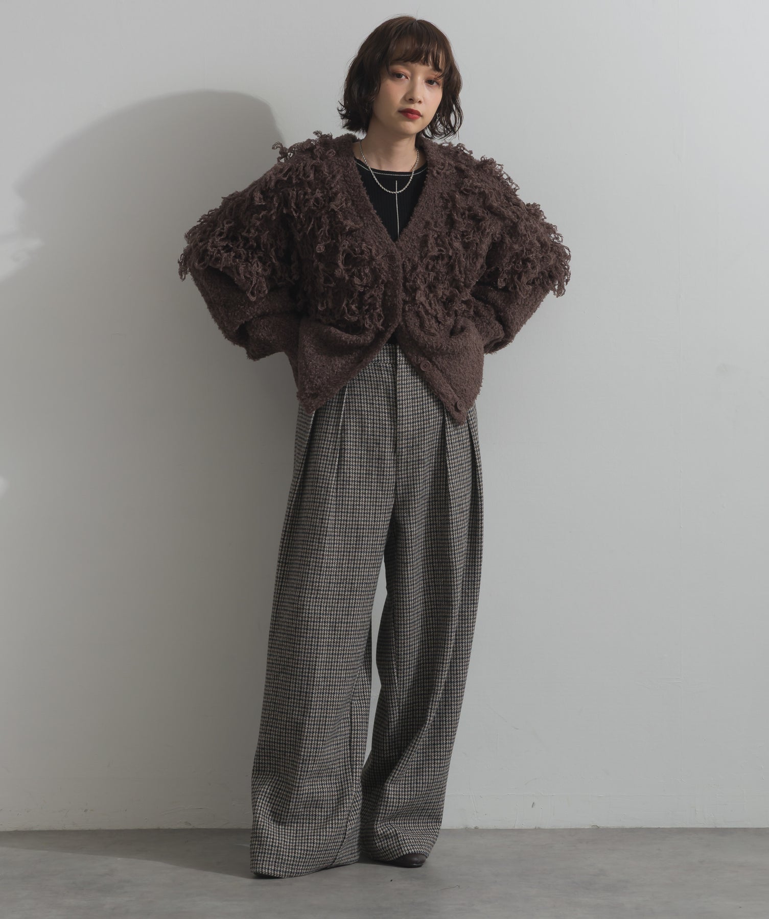 存在感で魅せる、表情豊かなループニット。-material-毛足の長いループヤーンを使用した表情豊かなニット素材。 ふわっとした柔らかさとしっかりとしたボリューム感があり、見た目にもあたたかみのある一枚です。肌当たりも優しく、チクチクしにくい着心地が魅力。-design-フロントから背中にかけて施されたループ編みのデザインが、他にはないインパクトを演出。程よくオーバーサイズなシルエットとドロップショルダーで抜け感があり、羽織るだけでコーデの主役に。 ざっくりと開いたVネックがデコルテを美しく見せ、インナーとのレイヤードも楽しめます。パンツにもスカートにも合わせやすく、デイリーからイベントシーンまで活躍。