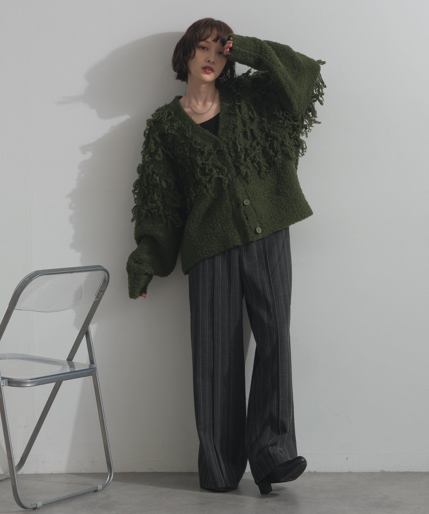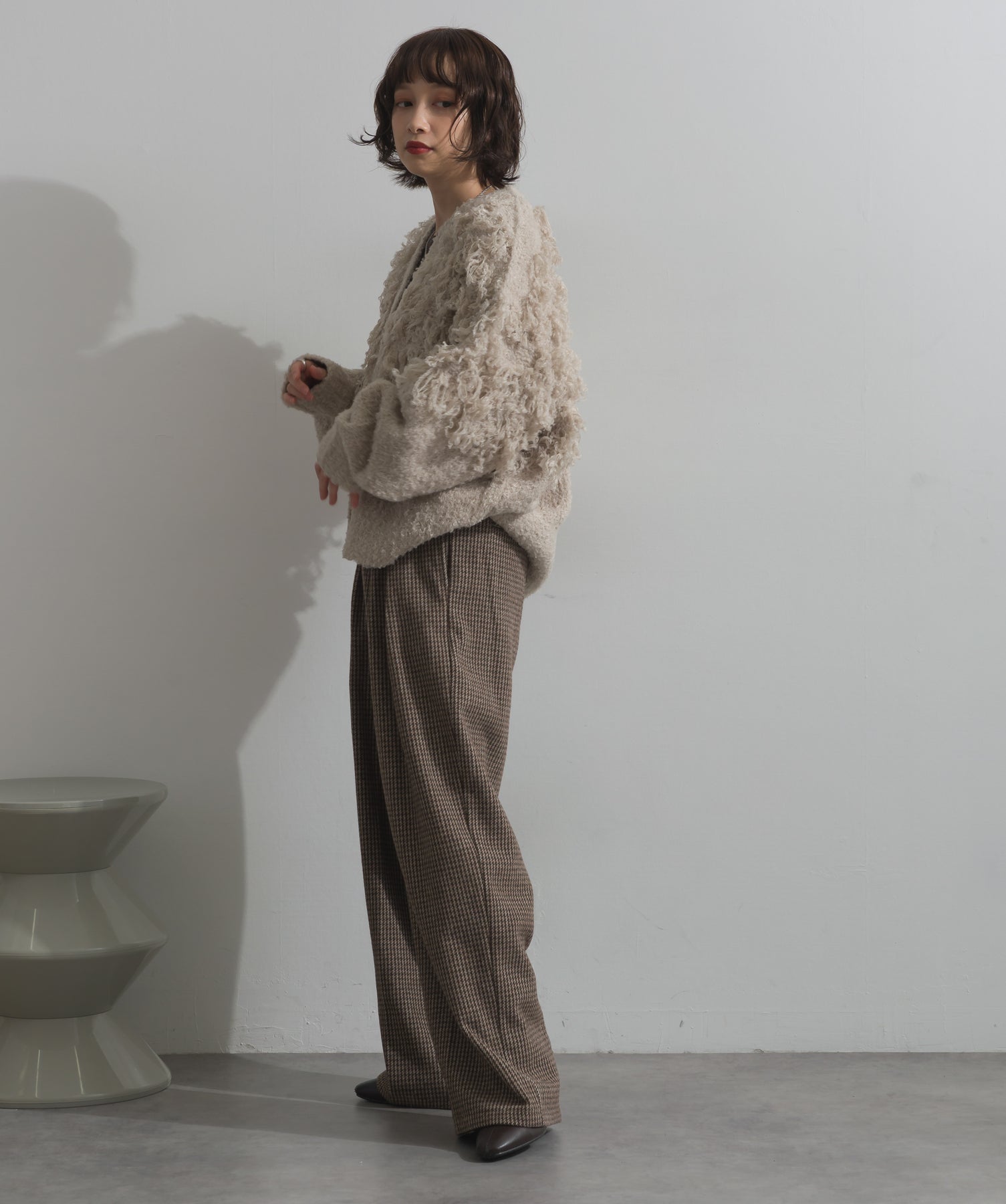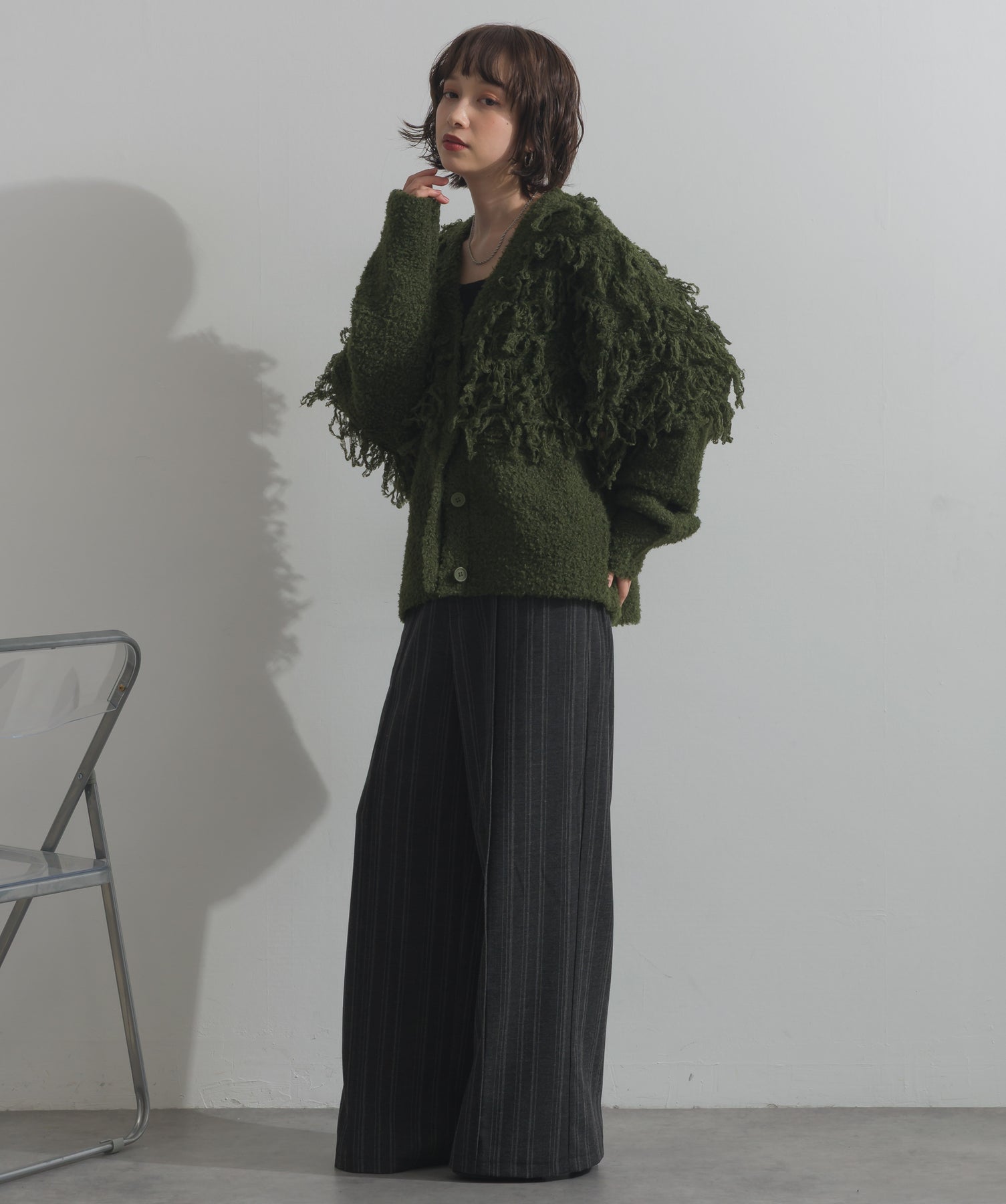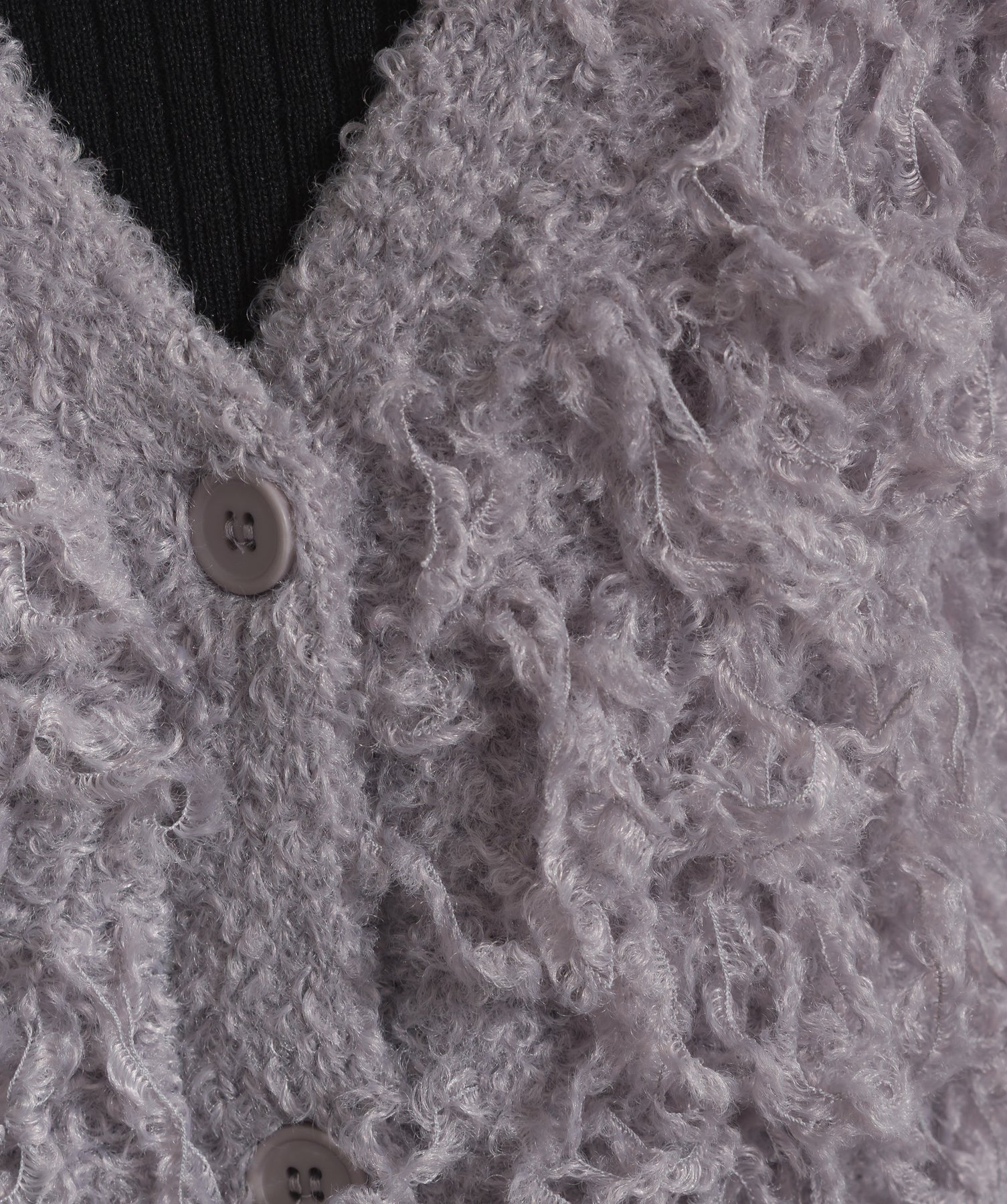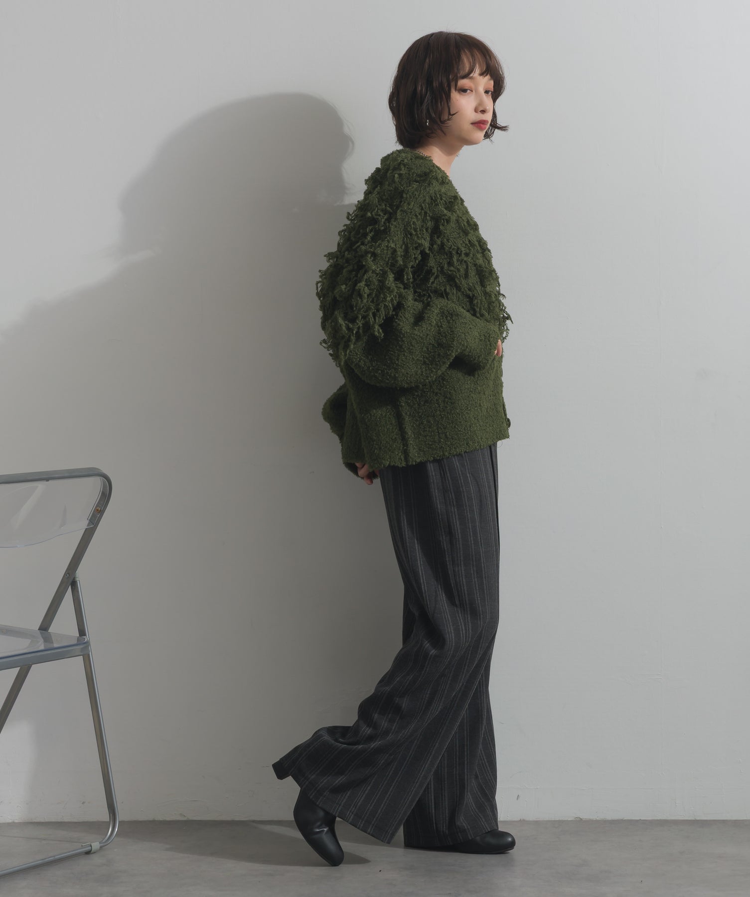 存在感で魅せる、表情豊かなループニット。-material-毛足の長いループヤーンを使用した表情豊かなニット素材。 ふわっとした柔らかさとしっかりとしたボリューム感があり、見た目にもあたたかみのある一枚です。肌当たりも優しく、チクチクしにくい着心地が魅力。-design-フロントから背中にかけて施されたループ編みのデザインが、他にはないインパクトを演出。程よくオーバーサイズなシルエットとドロップショルダーで抜け感があり、羽織るだけでコーデの主役に。 ざっくりと開いたVネックがデコルテを美しく見せ、インナーとのレイヤードも楽しめます。パンツにもスカートにも合わせやすく、デイリーからイベントシーンまで活躍。