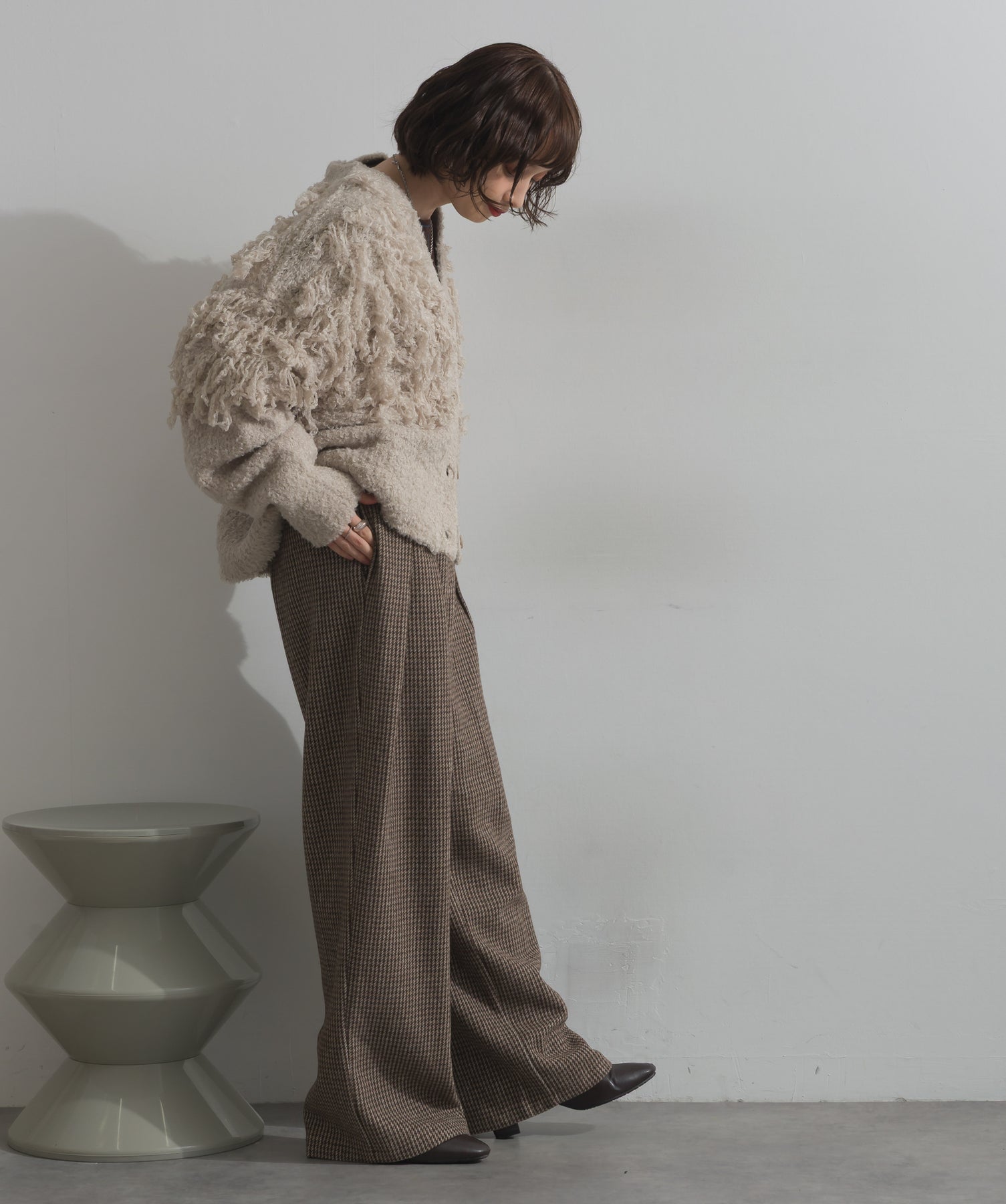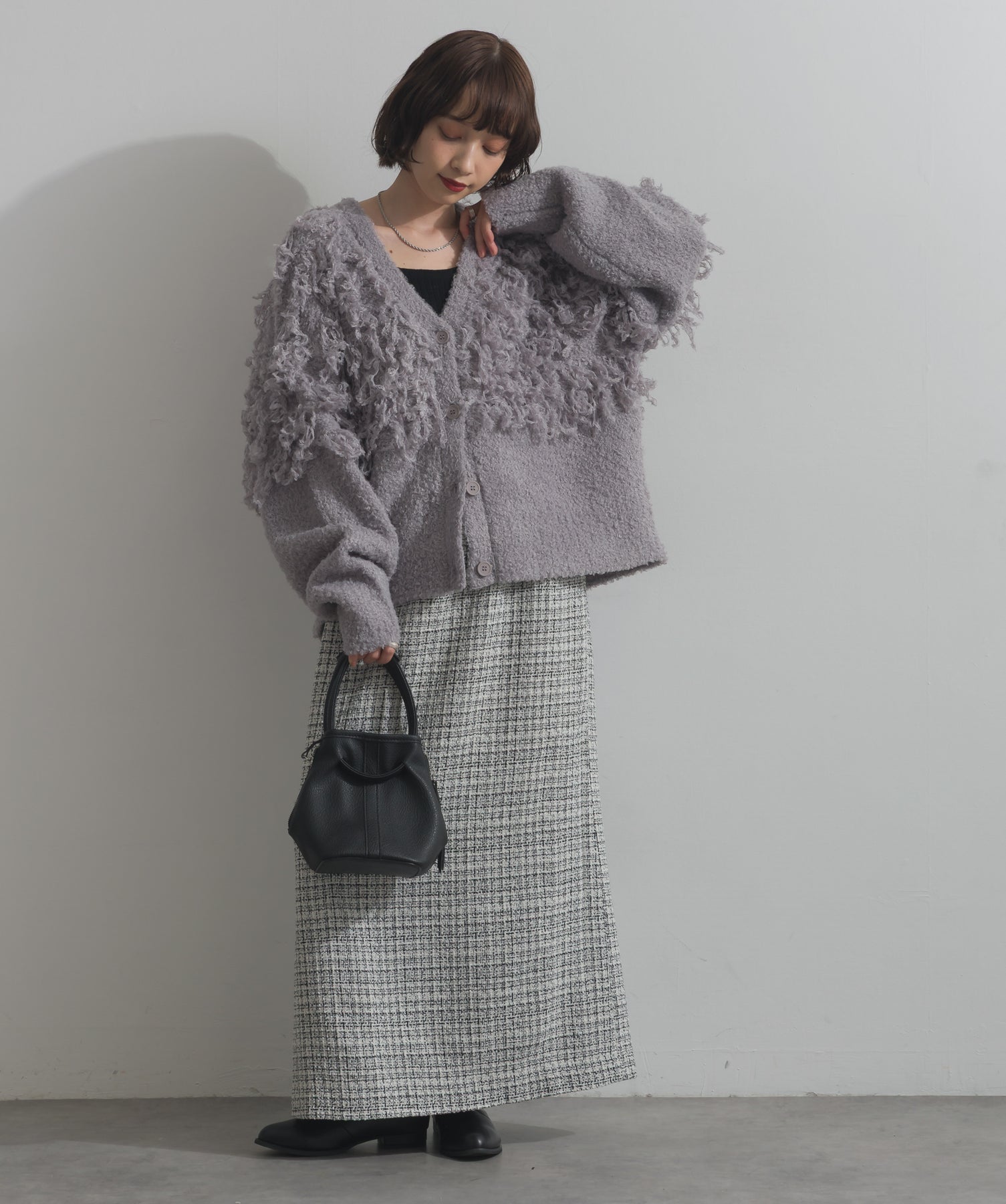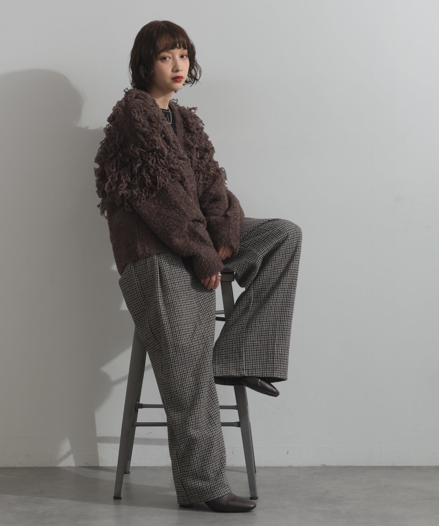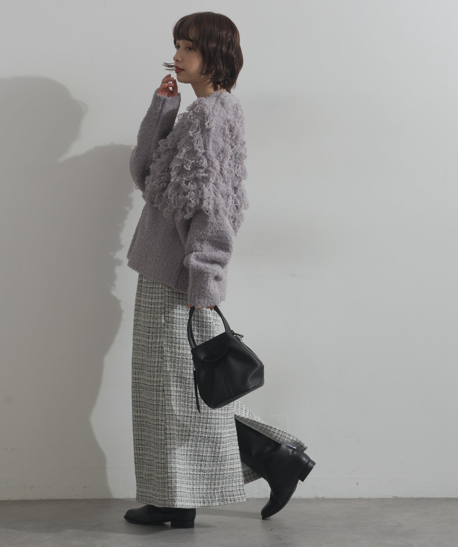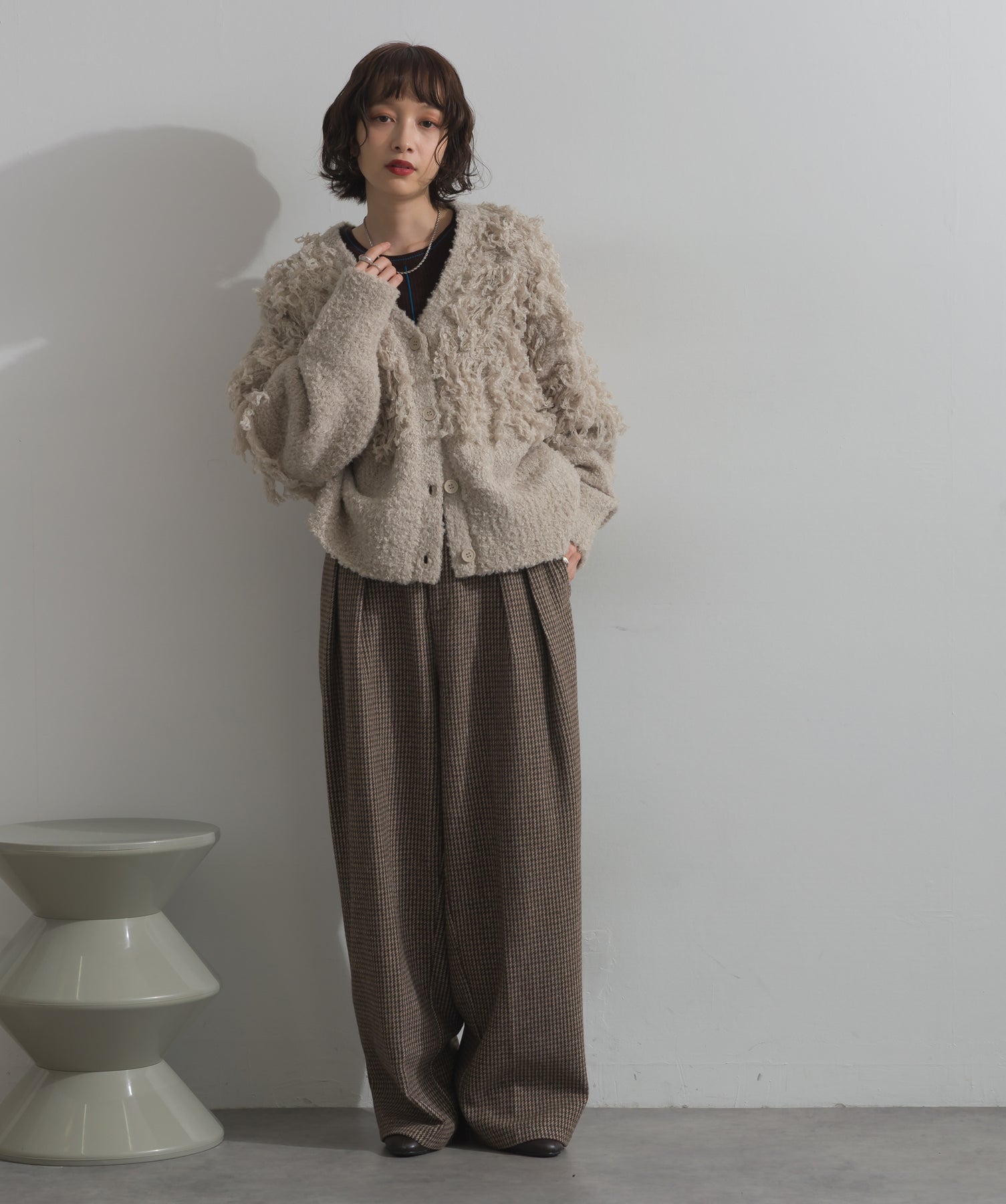 存在感で魅せる、表情豊かなループニット。-material-毛足の長いループヤーンを使用した表情豊かなニット素材。 ふわっとした柔らかさとしっかりとしたボリューム感があり、見た目にもあたたかみのある一枚です。肌当たりも優しく、チクチクしにくい着心地が魅力。-design-フロントから背中にかけて施されたループ編みのデザインが、他にはないインパクトを演出。程よくオーバーサイズなシルエットとドロップショルダーで抜け感があり、羽織るだけでコーデの主役に。 ざっくりと開いたVネックがデコルテを美しく見せ、インナーとのレイヤードも楽しめます。パンツにもスカートにも合わせやすく、デイリーからイベントシーンまで活躍。