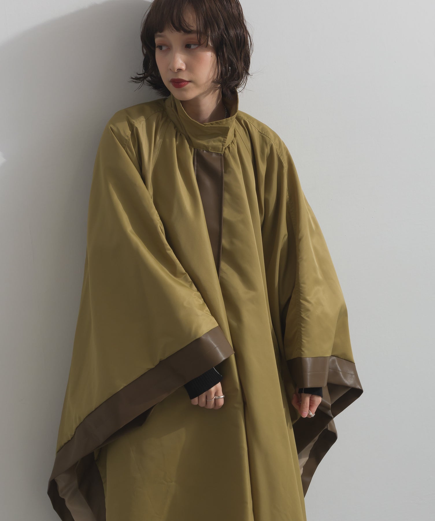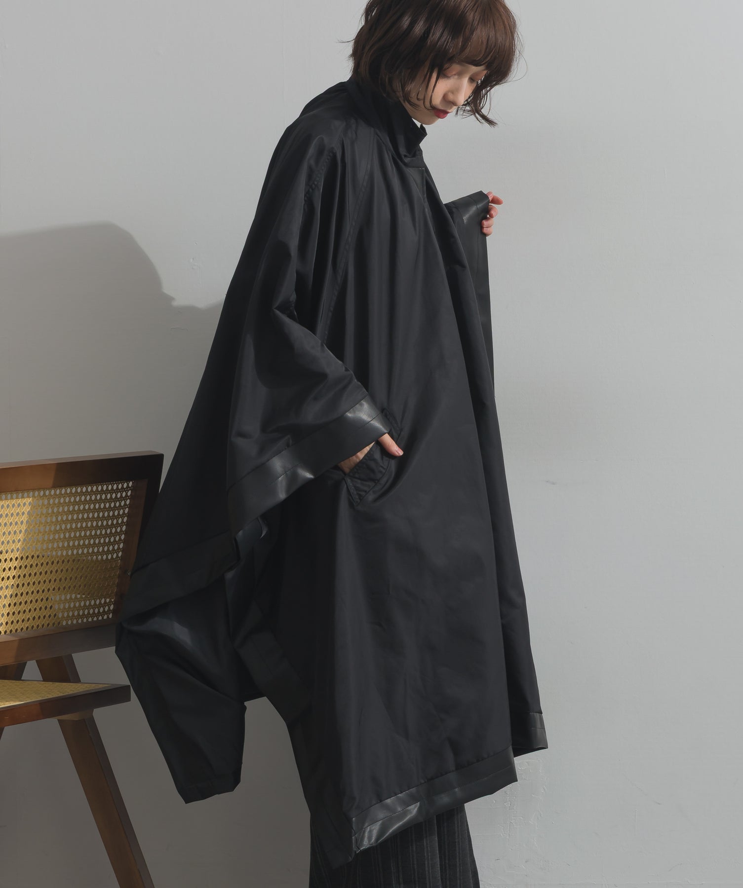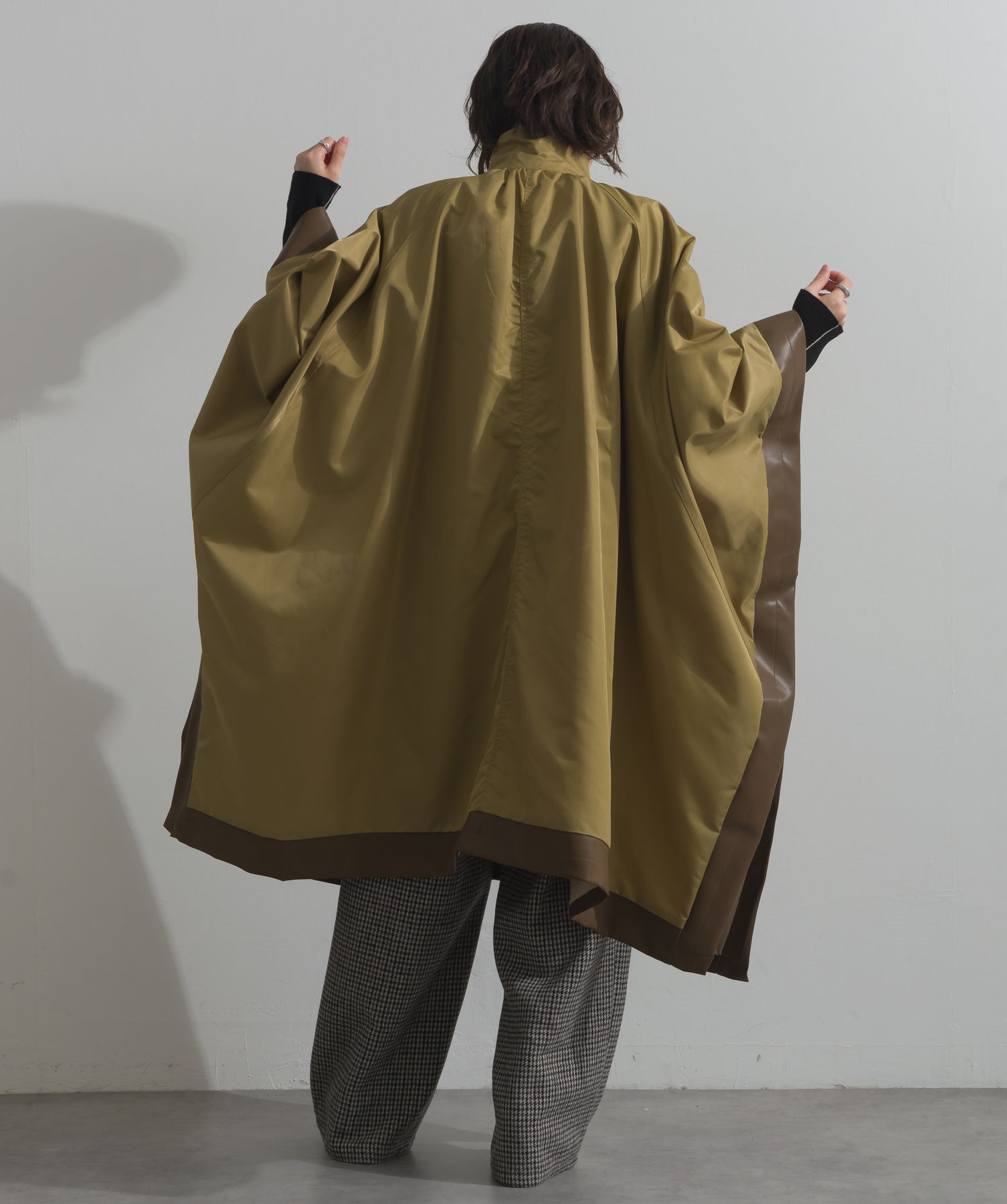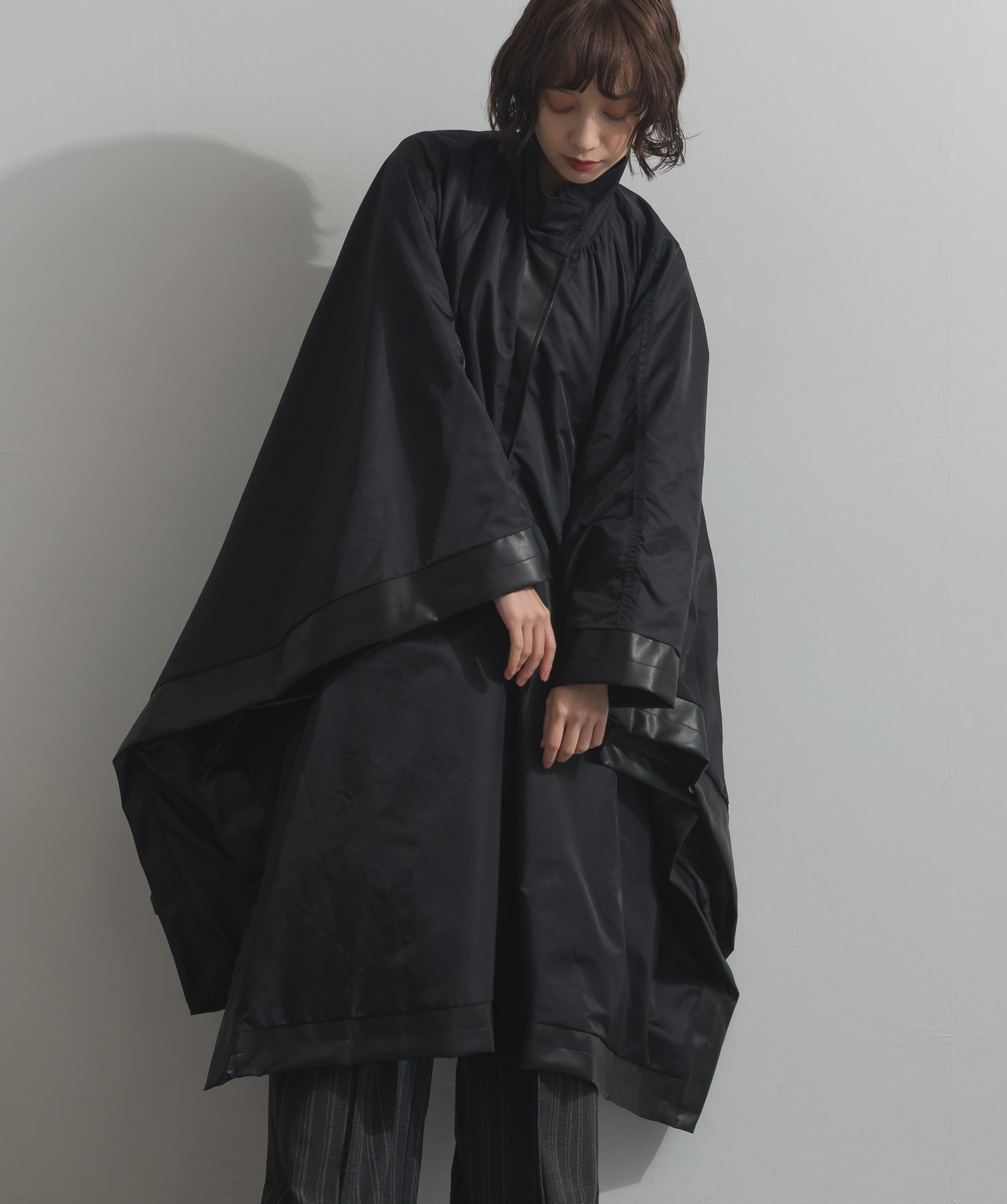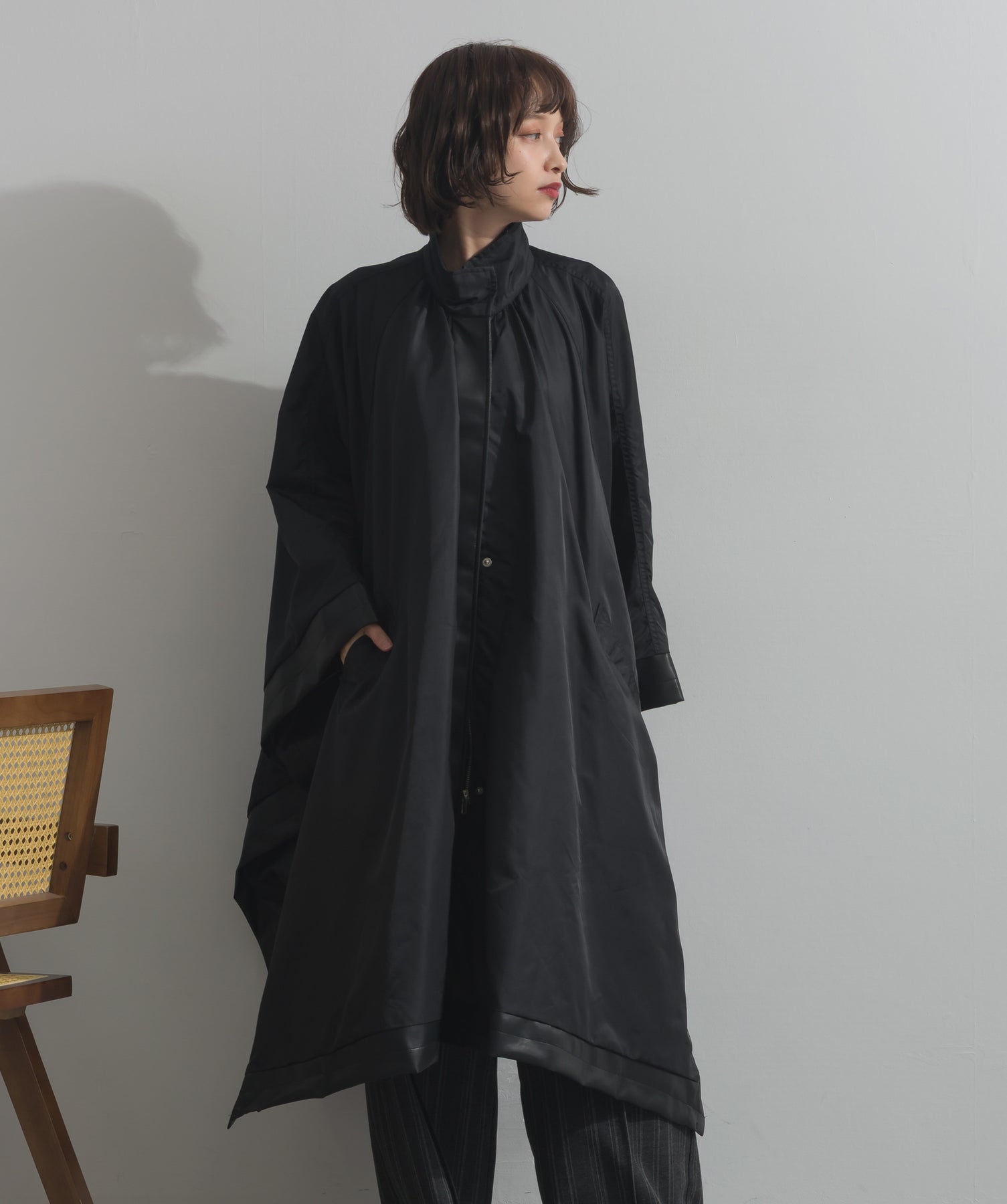 包み込むシルエットで魅せる、存在感と軽やかさの融合。-material-ハリのある高密度タフタ素材を使用。マットな光沢と滑らかな表面感が特徴で、軽量ながらもしっかりとした風合いを実現。裏地付きで風を通しにくく、防寒性と着心地のバランスも秀逸。-design-クラシックなポンチョ型を現代的に再構築したミニマルデザイン。肩のラインを落としたラグラン風シルエットと、裾に向かって広がるフレアラインが体のラインを自然にカバー。ボタンを閉めるとすっきりしたスタンドネックに、開ければリラックス感ある羽織りスタイルにも。袖口のホール使いで手元に立体感を演出しつつ、裾まわりのパイピング配色がアクセントに。ワイドパンツや柄スカートなど、ボリュームのあるボトムとも好相性。ワードローブに一枚あるだけで、洗練されたレイヤードが完成します。モード感を程よく取り入れたい大人のデイリーアウターとして活躍。