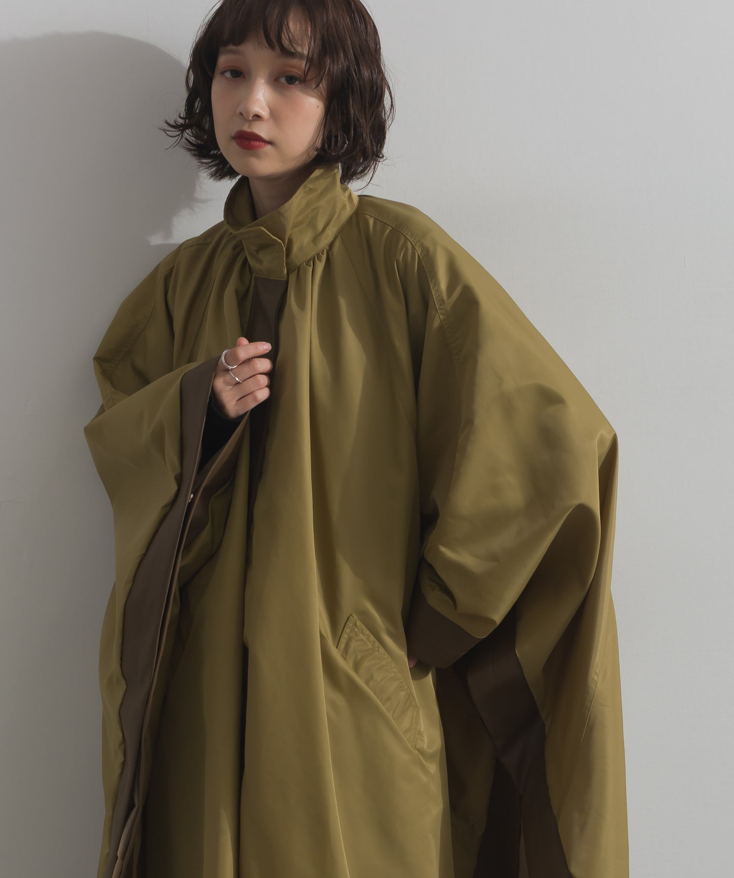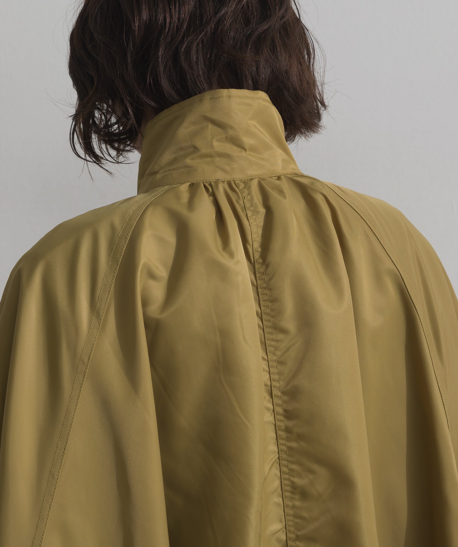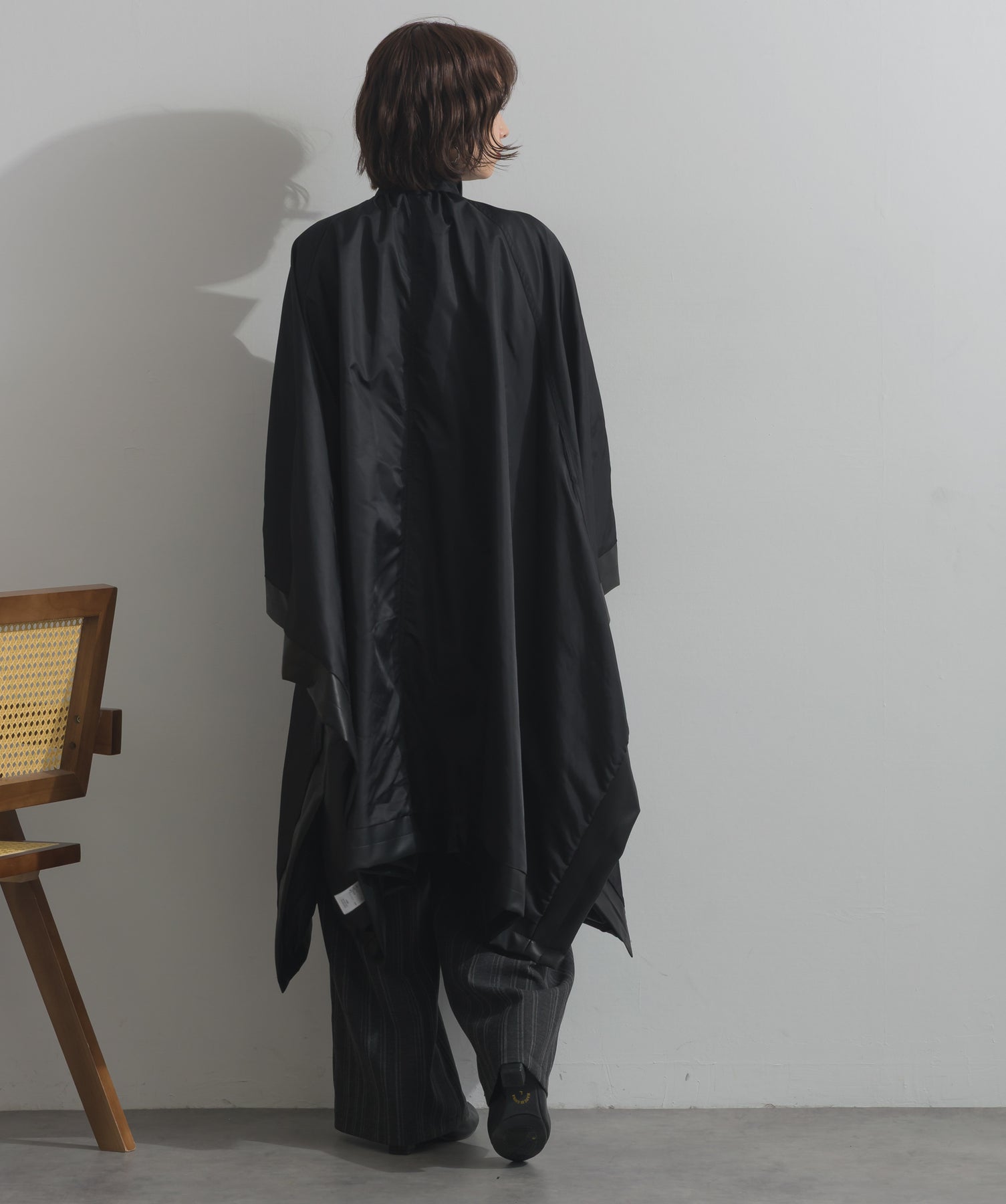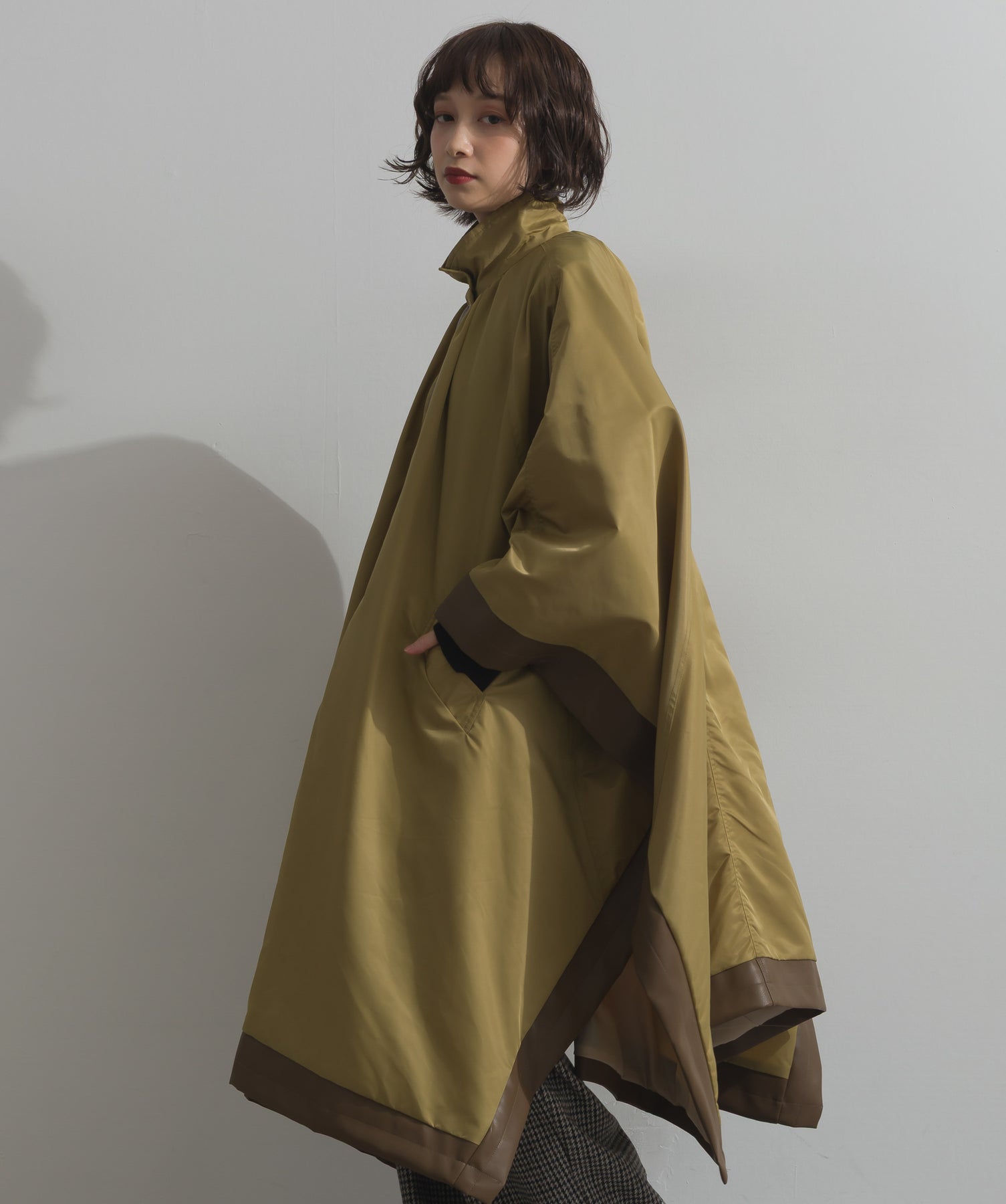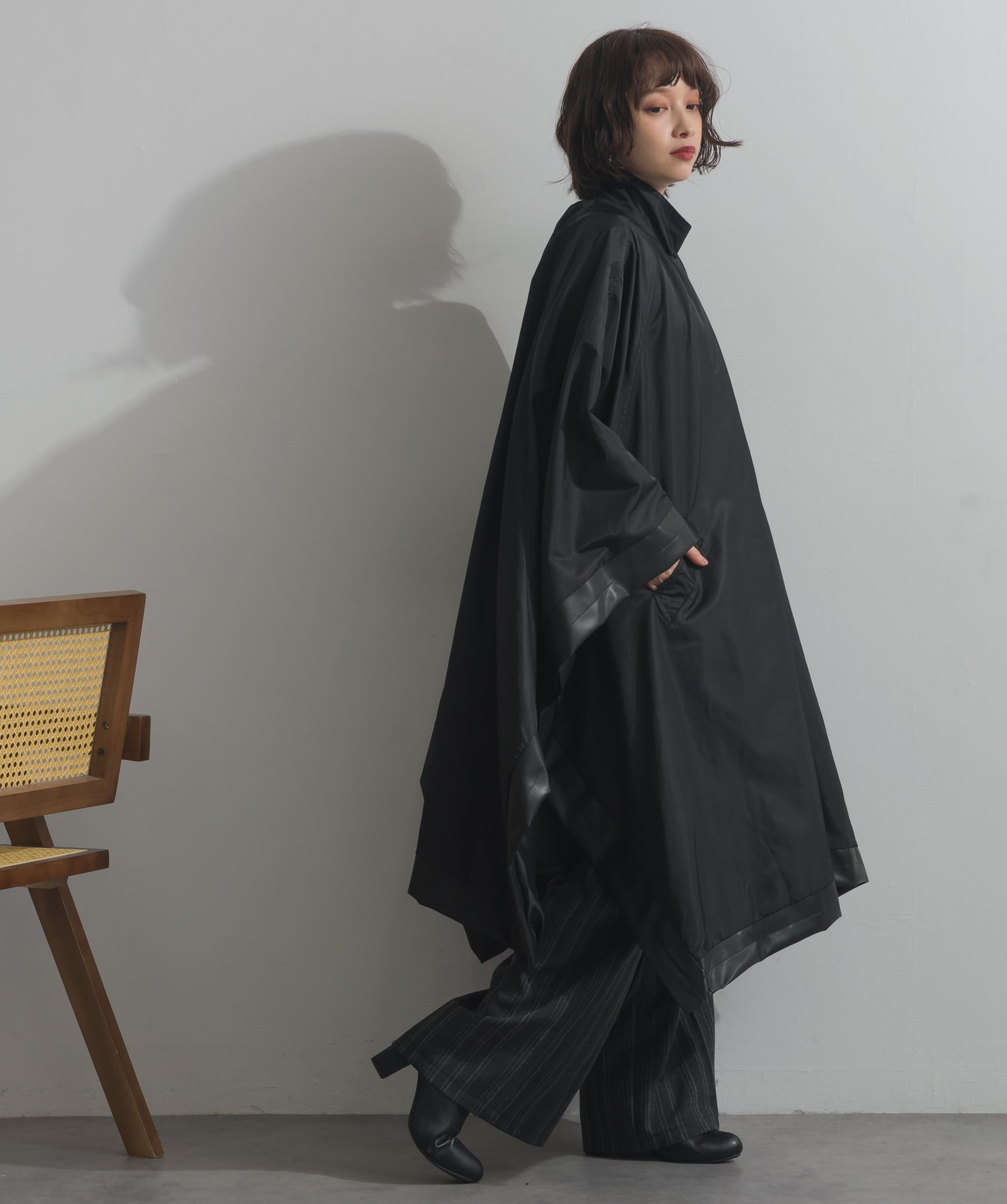 包み込むシルエットで魅せる、存在感と軽やかさの融合。-material-ハリのある高密度タフタ素材を使用。マットな光沢と滑らかな表面感が特徴で、軽量ながらもしっかりとした風合いを実現。裏地付きで風を通しにくく、防寒性と着心地のバランスも秀逸。-design-クラシックなポンチョ型を現代的に再構築したミニマルデザイン。肩のラインを落としたラグラン風シルエットと、裾に向かって広がるフレアラインが体のラインを自然にカバー。ボタンを閉めるとすっきりしたスタンドネックに、開ければリラックス感ある羽織りスタイルにも。袖口のホール使いで手元に立体感を演出しつつ、裾まわりのパイピング配色がアクセントに。ワイドパンツや柄スカートなど、ボリュームのあるボトムとも好相性。ワードローブに一枚あるだけで、洗練されたレイヤードが完成します。モード感を程よく取り入れたい大人のデイリーアウターとして活躍。