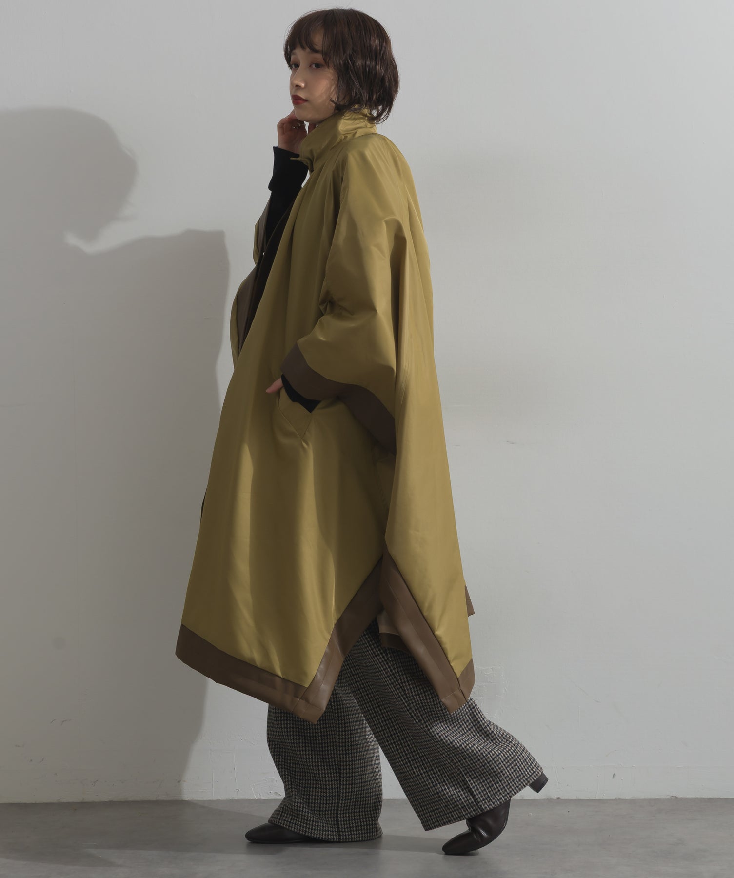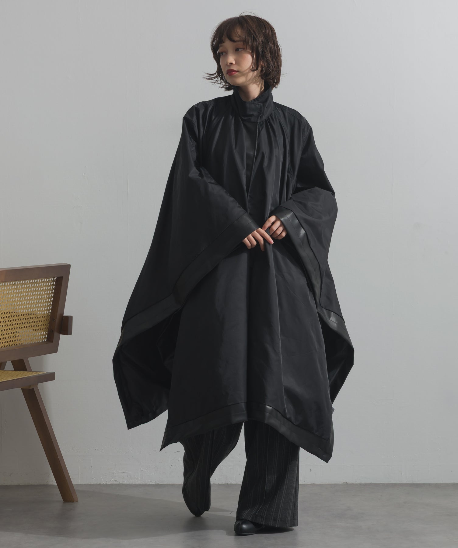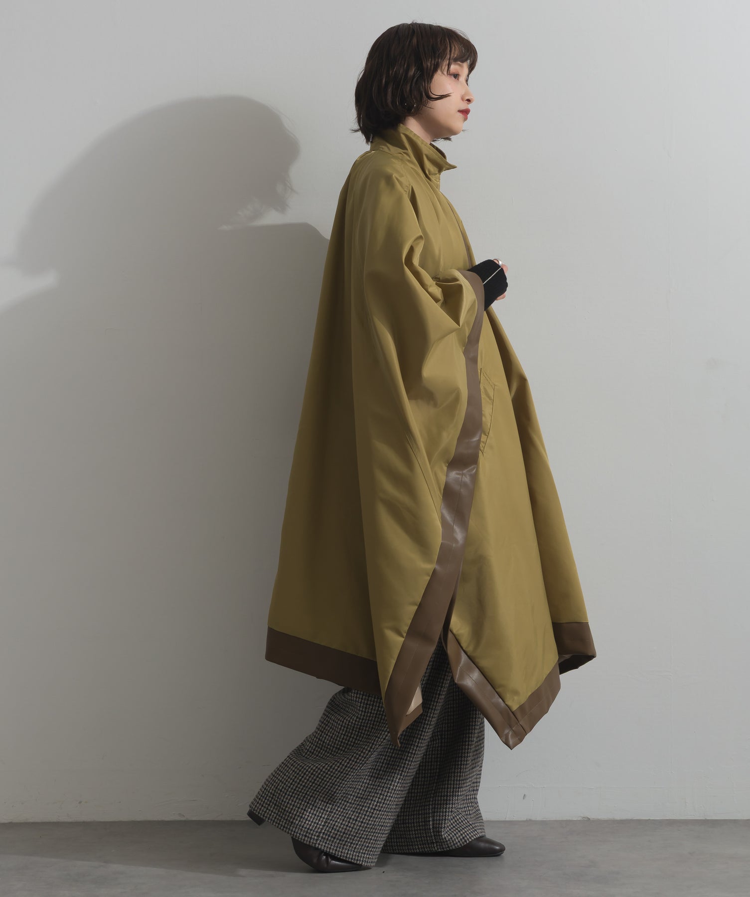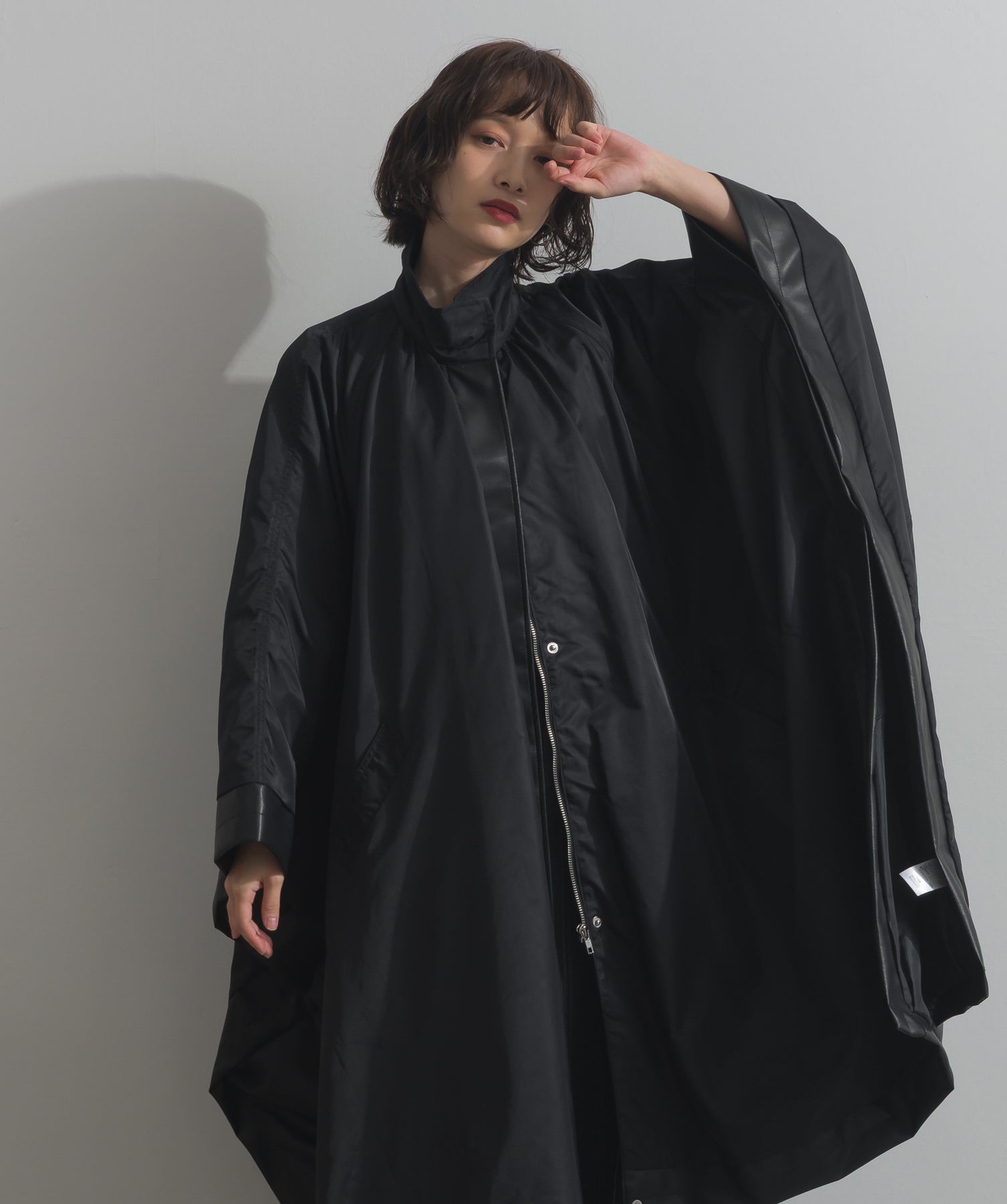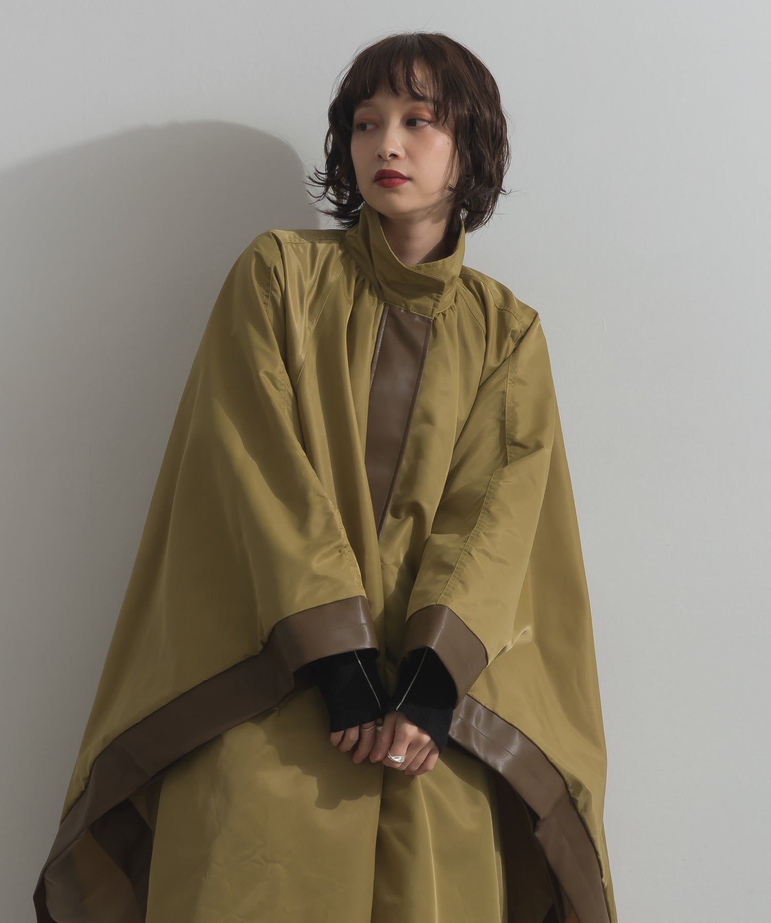 包み込むシルエットで魅せる、存在感と軽やかさの融合。-material-ハリのある高密度タフタ素材を使用。マットな光沢と滑らかな表面感が特徴で、軽量ながらもしっかりとした風合いを実現。裏地付きで風を通しにくく、防寒性と着心地のバランスも秀逸。-design-クラシックなポンチョ型を現代的に再構築したミニマルデザイン。肩のラインを落としたラグラン風シルエットと、裾に向かって広がるフレアラインが体のラインを自然にカバー。ボタンを閉めるとすっきりしたスタンドネックに、開ければリラックス感ある羽織りスタイルにも。袖口のホール使いで手元に立体感を演出しつつ、裾まわりのパイピング配色がアクセントに。ワイドパンツや柄スカートなど、ボリュームのあるボトムとも好相性。ワードローブに一枚あるだけで、洗練されたレイヤードが完成します。モード感を程よく取り入れたい大人のデイリーアウターとして活躍。