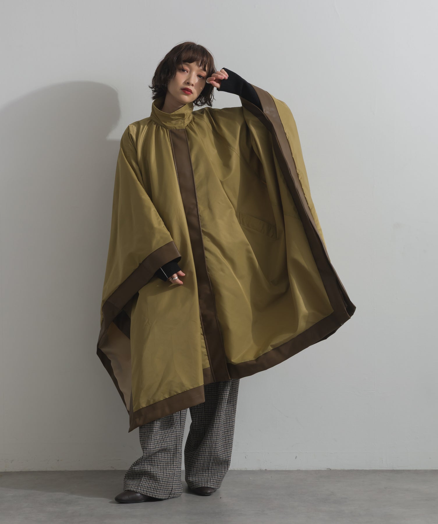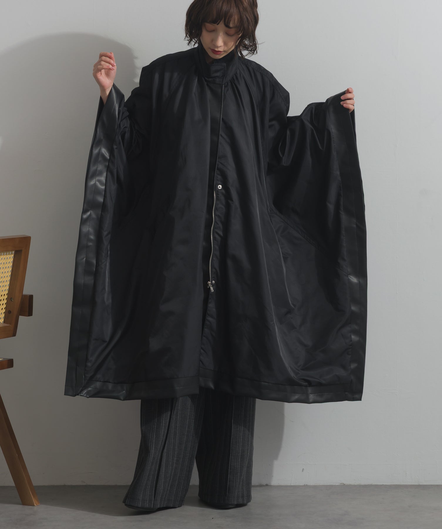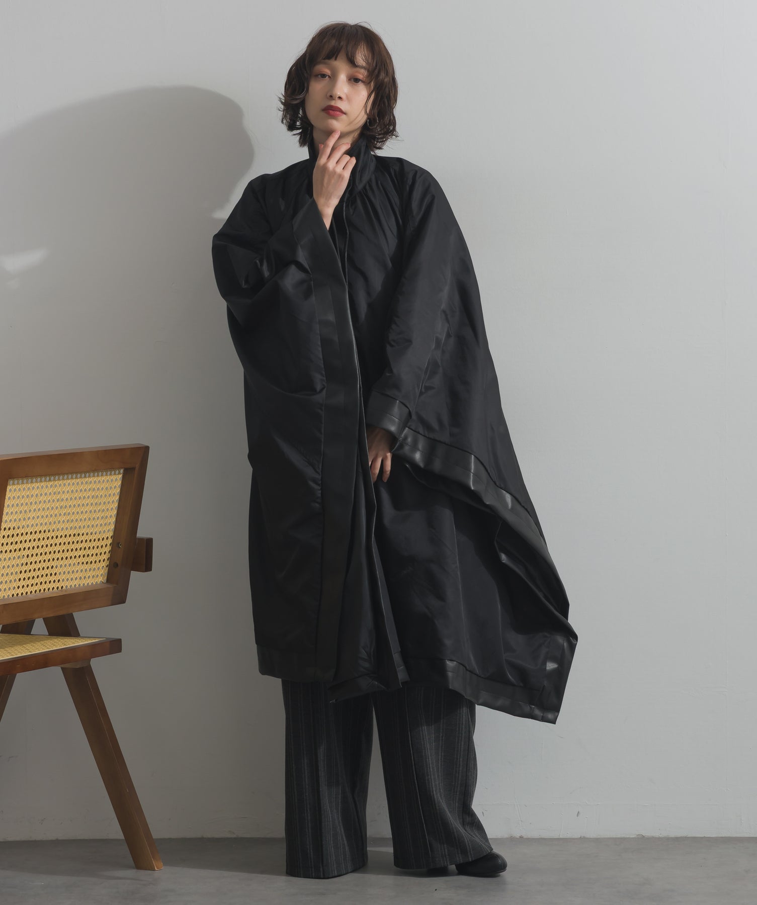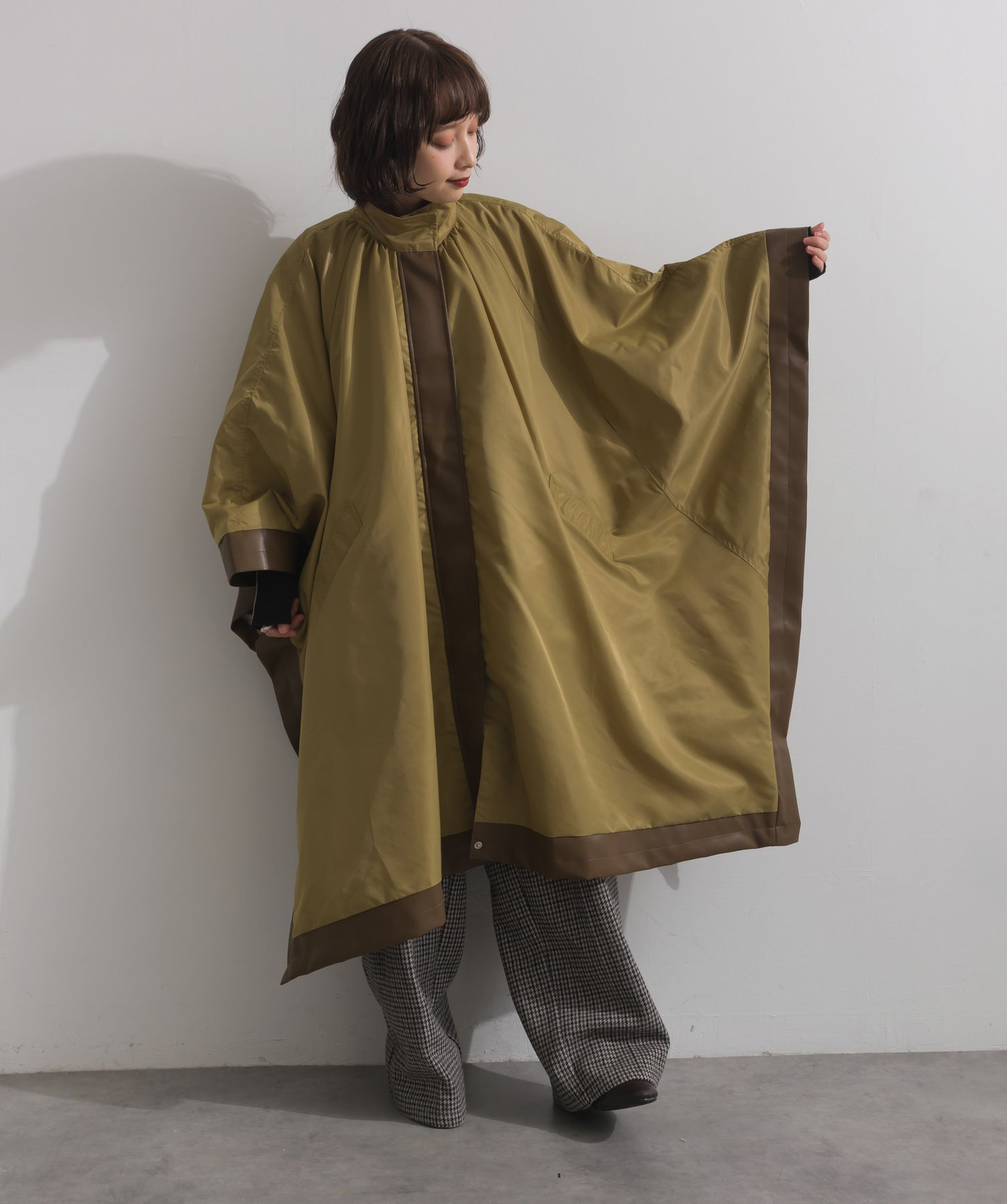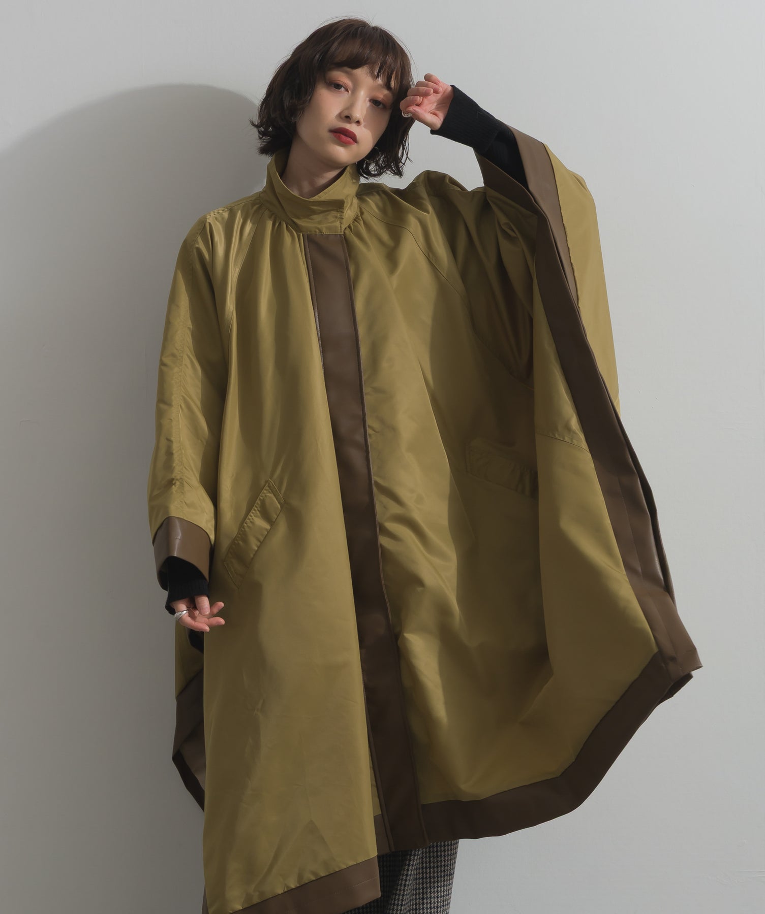 包み込むシルエットで魅せる、存在感と軽やかさの融合。-material-ハリのある高密度タフタ素材を使用。マットな光沢と滑らかな表面感が特徴で、軽量ながらもしっかりとした風合いを実現。裏地付きで風を通しにくく、防寒性と着心地のバランスも秀逸。-design-クラシックなポンチョ型を現代的に再構築したミニマルデザイン。肩のラインを落としたラグラン風シルエットと、裾に向かって広がるフレアラインが体のラインを自然にカバー。ボタンを閉めるとすっきりしたスタンドネックに、開ければリラックス感ある羽織りスタイルにも。袖口のホール使いで手元に立体感を演出しつつ、裾まわりのパイピング配色がアクセントに。ワイドパンツや柄スカートなど、ボリュームのあるボトムとも好相性。ワードローブに一枚あるだけで、洗練されたレイヤードが完成します。モード感を程よく取り入れたい大人のデイリーアウターとして活躍。