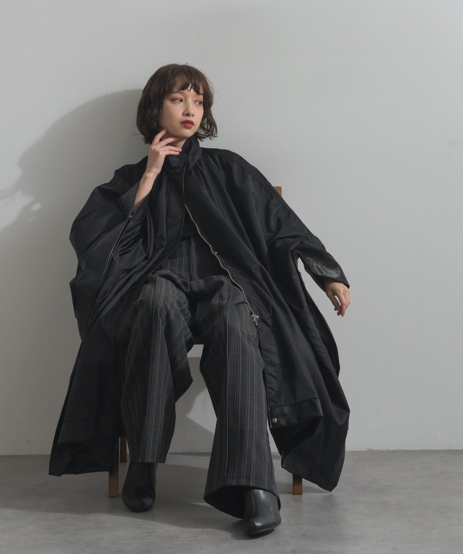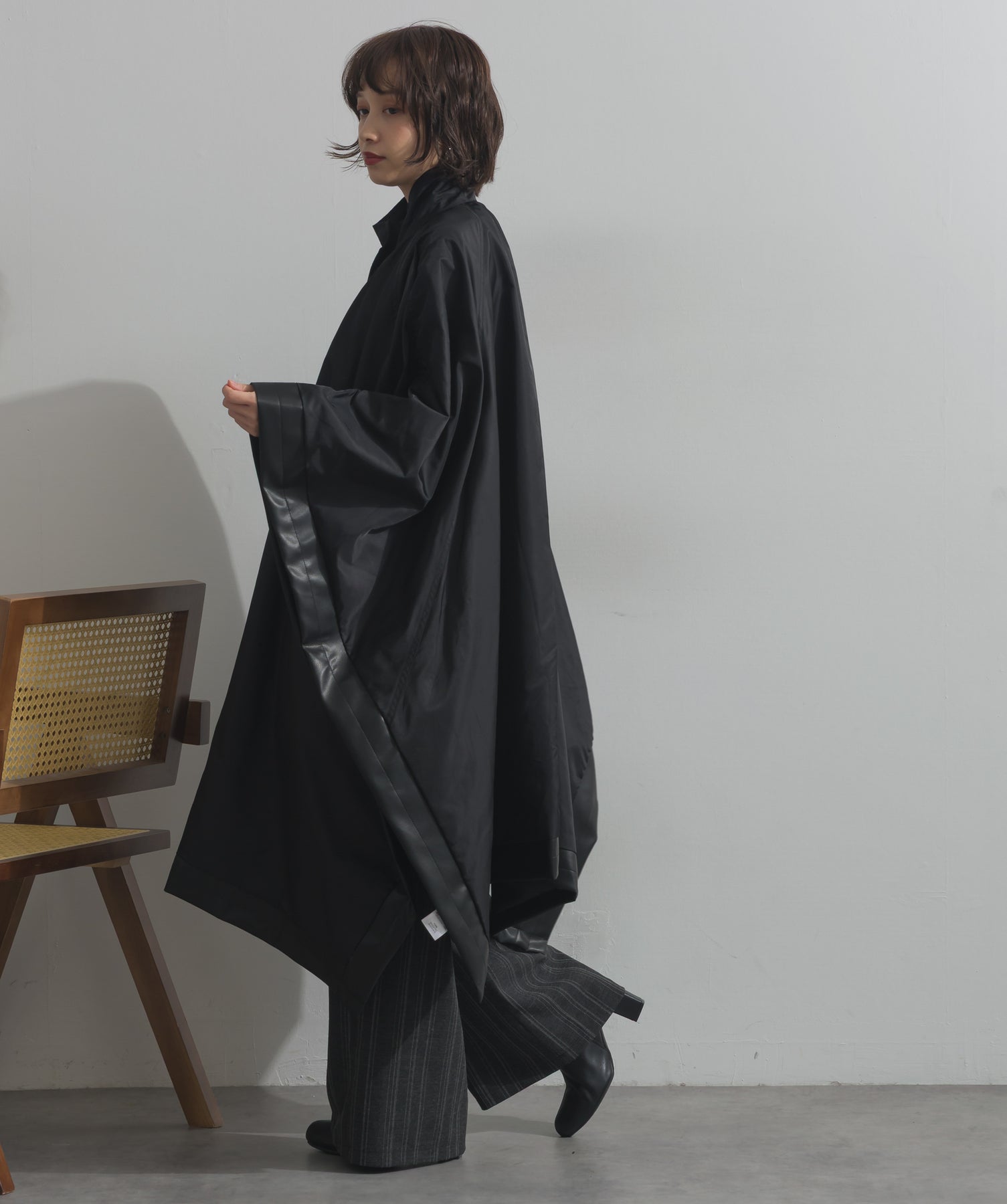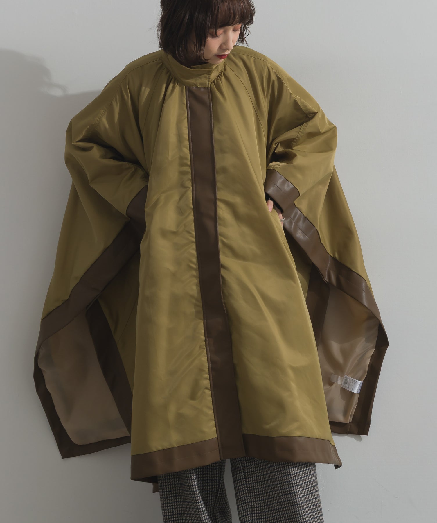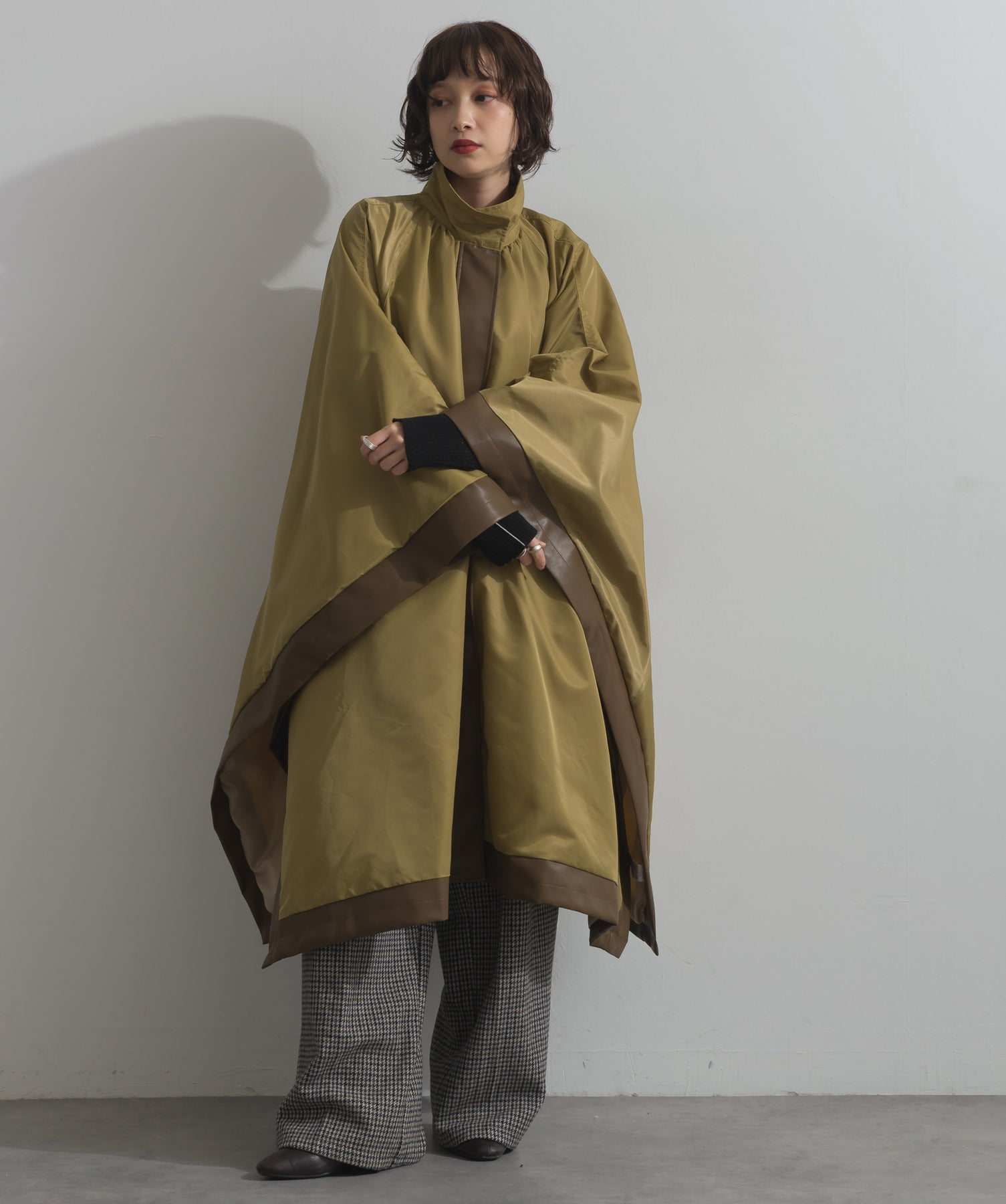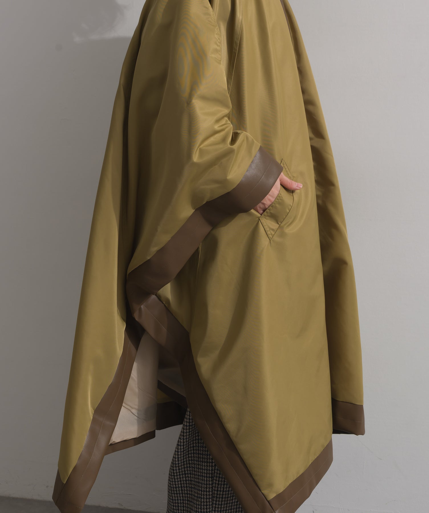包み込むシルエットで魅せる、存在感と軽やかさの融合。-material-ハリのある高密度タフタ素材を使用。マットな光沢と滑らかな表面感が特徴で、軽量ながらもしっかりとした風合いを実現。裏地付きで風を通しにくく、防寒性と着心地のバランスも秀逸。-design-クラシックなポンチョ型を現代的に再構築したミニマルデザイン。肩のラインを落としたラグラン風シルエットと、裾に向かって広がるフレアラインが体のラインを自然にカバー。ボタンを閉めるとすっきりしたスタンドネックに、開ければリラックス感ある羽織りスタイルにも。袖口のホール使いで手元に立体感を演出しつつ、裾まわりのパイピング配色がアクセントに。ワイドパンツや柄スカートなど、ボリュームのあるボトムとも好相性。ワードローブに一枚あるだけで、洗練されたレイヤードが完成します。モード感を程よく取り入れたい大人のデイリーアウターとして活躍。