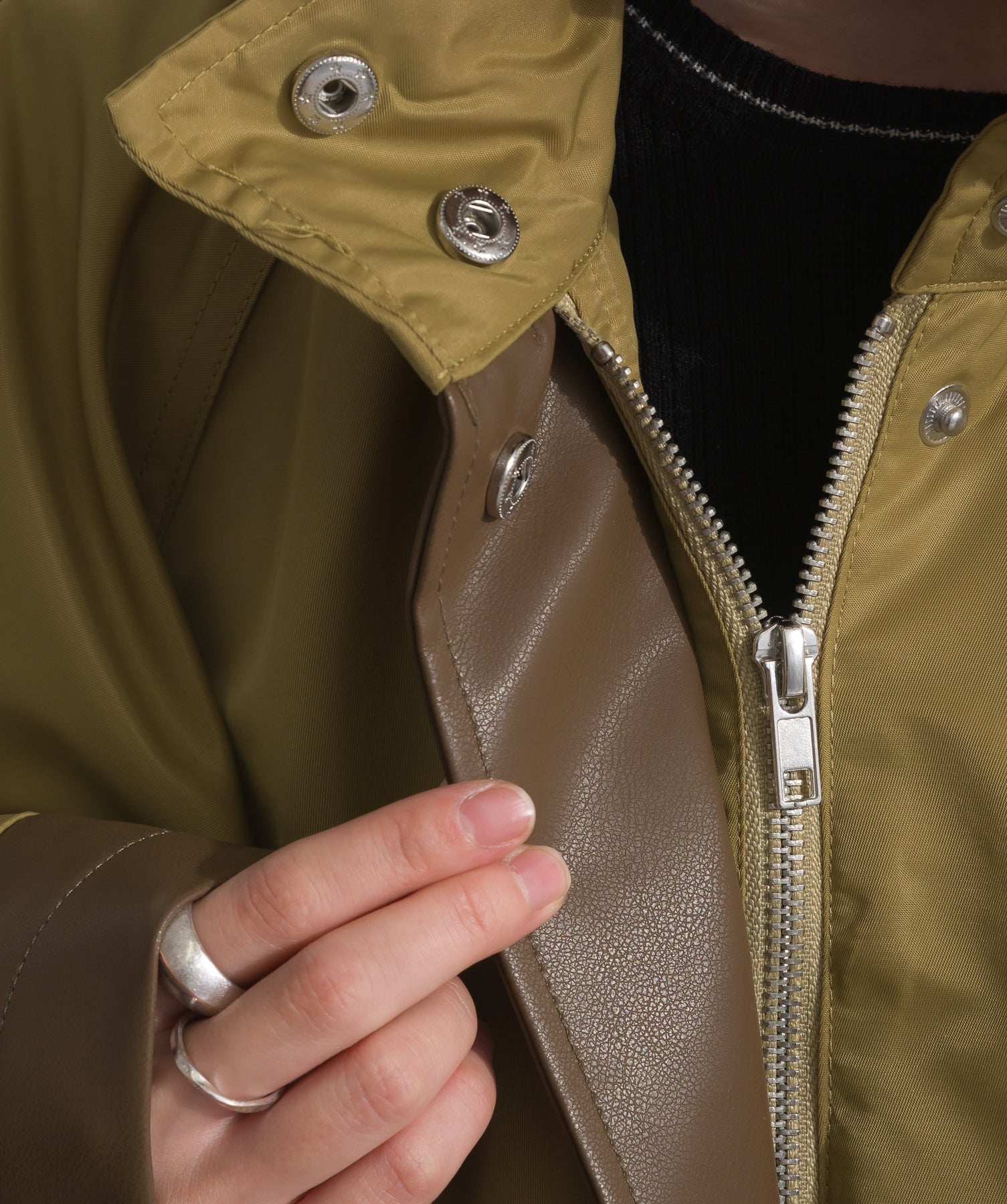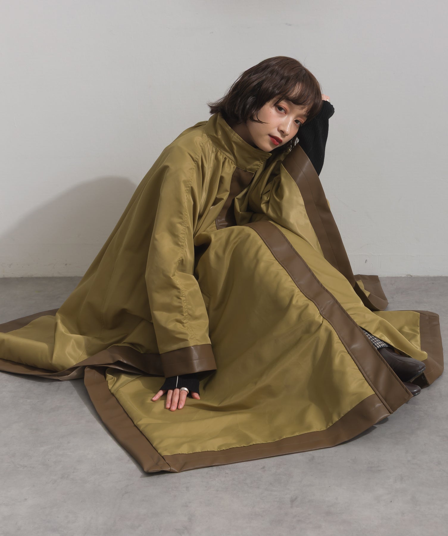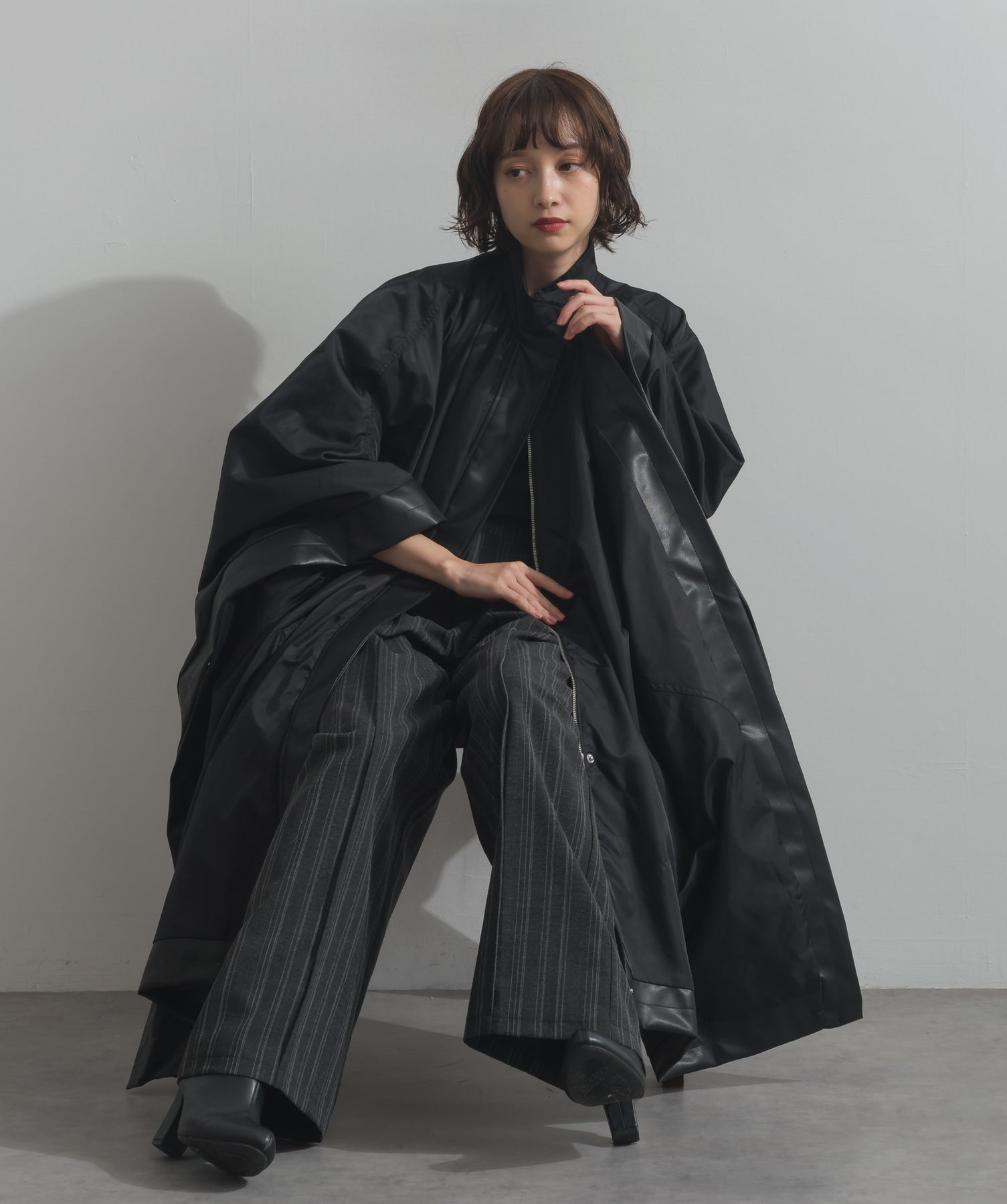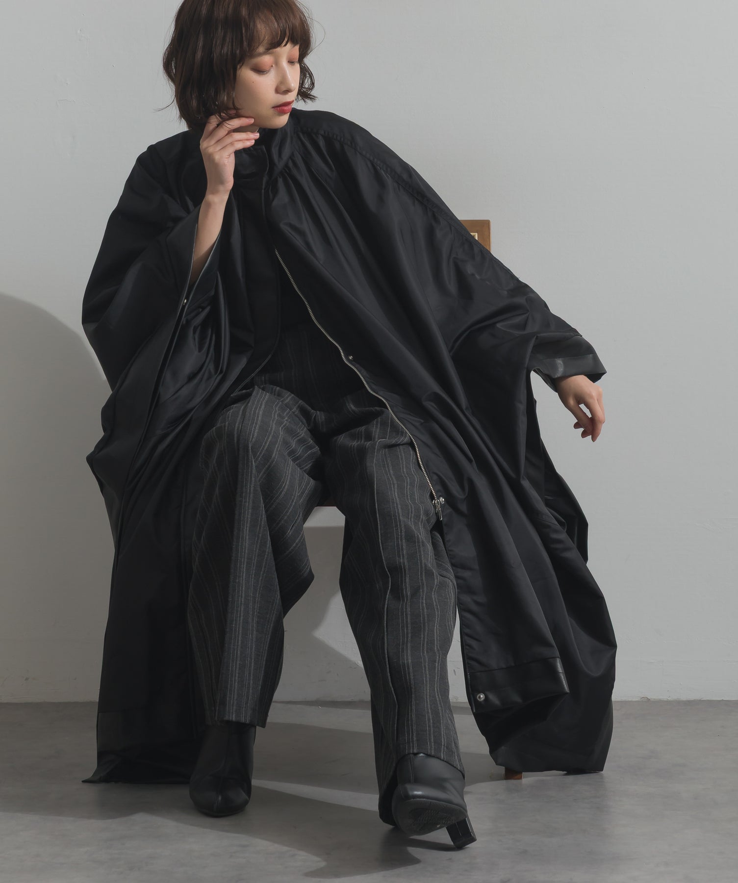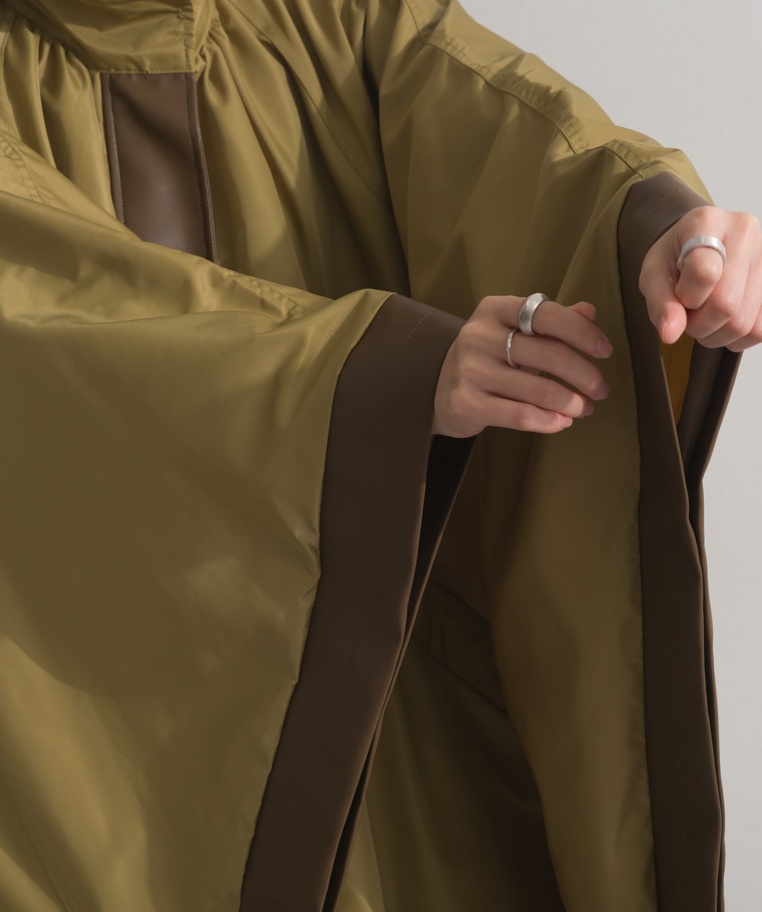 包み込むシルエットで魅せる、存在感と軽やかさの融合。-material-ハリのある高密度タフタ素材を使用。マットな光沢と滑らかな表面感が特徴で、軽量ながらもしっかりとした風合いを実現。裏地付きで風を通しにくく、防寒性と着心地のバランスも秀逸。-design-クラシックなポンチョ型を現代的に再構築したミニマルデザイン。肩のラインを落としたラグラン風シルエットと、裾に向かって広がるフレアラインが体のラインを自然にカバー。ボタンを閉めるとすっきりしたスタンドネックに、開ければリラックス感ある羽織りスタイルにも。袖口のホール使いで手元に立体感を演出しつつ、裾まわりのパイピング配色がアクセントに。ワイドパンツや柄スカートなど、ボリュームのあるボトムとも好相性。ワードローブに一枚あるだけで、洗練されたレイヤードが完成します。モード感を程よく取り入れたい大人のデイリーアウターとして活躍。