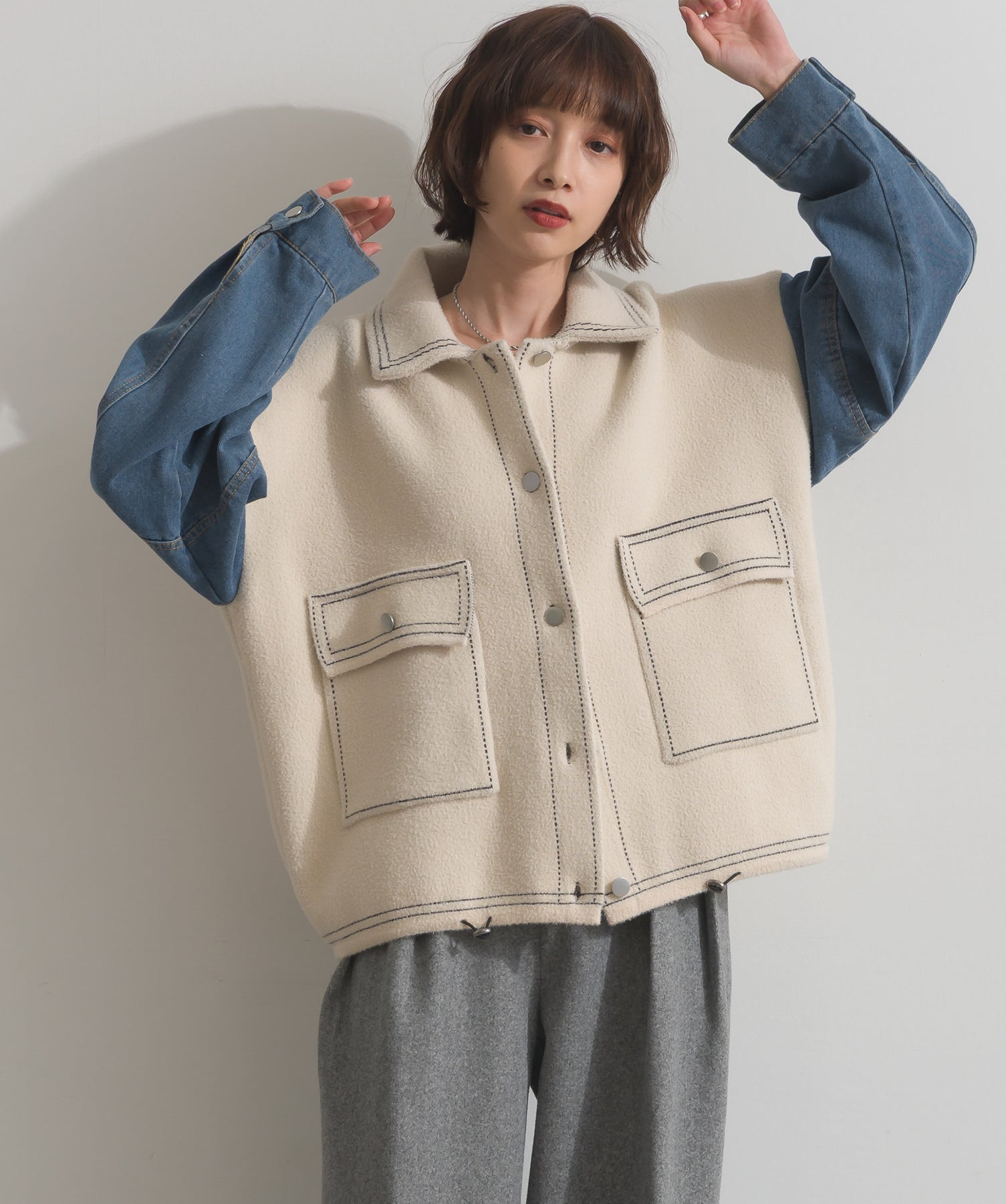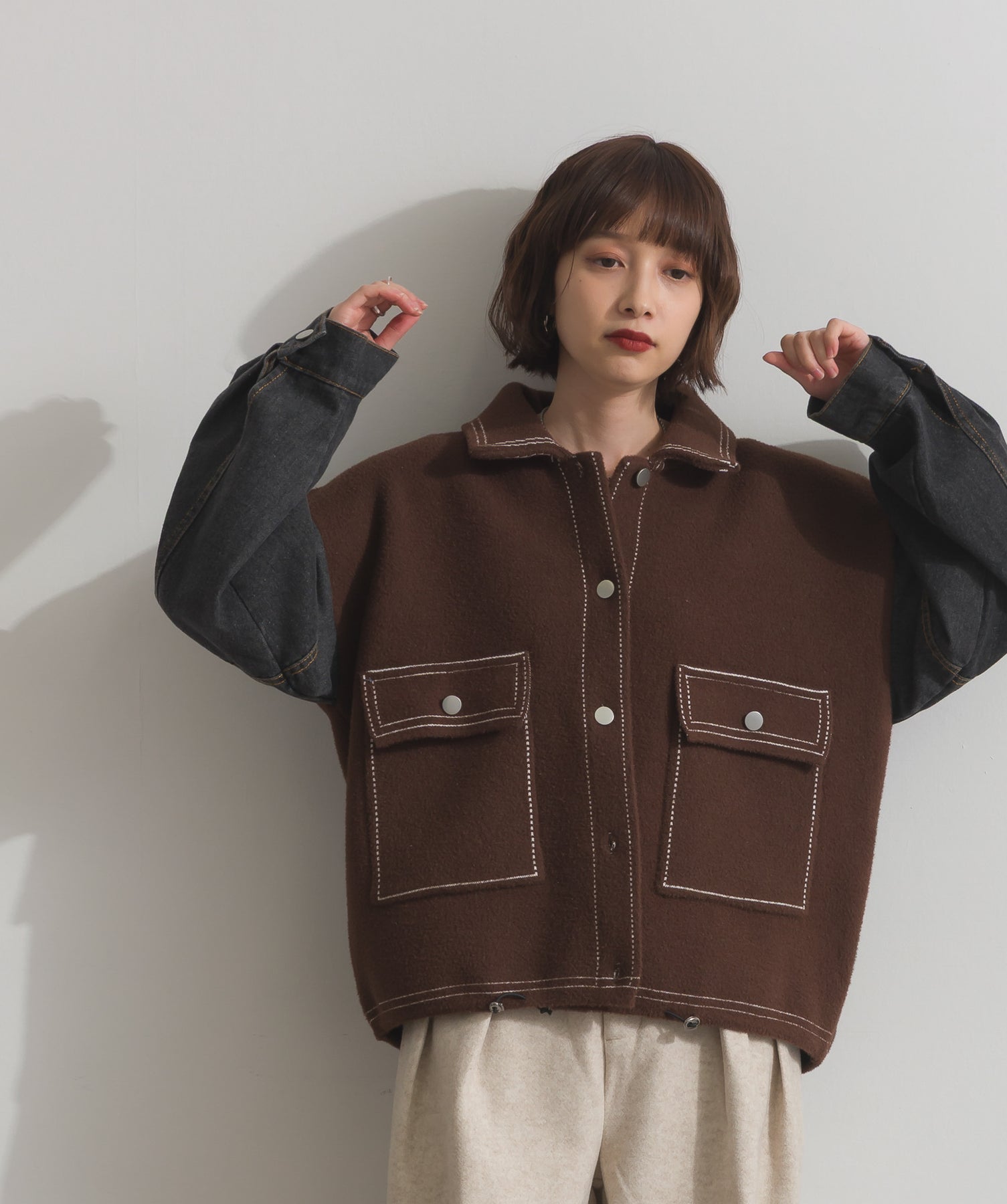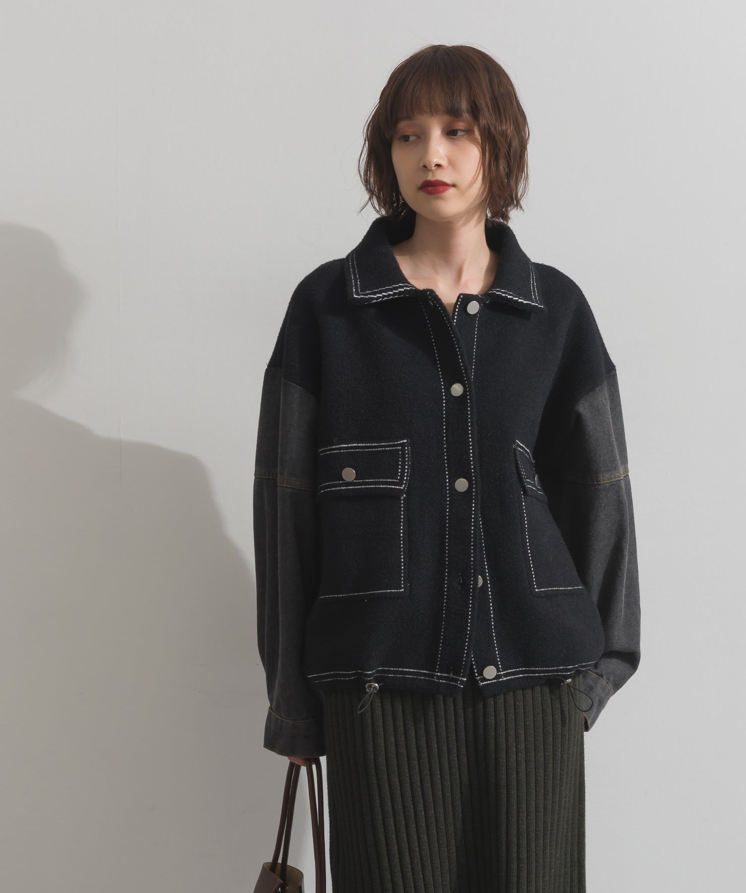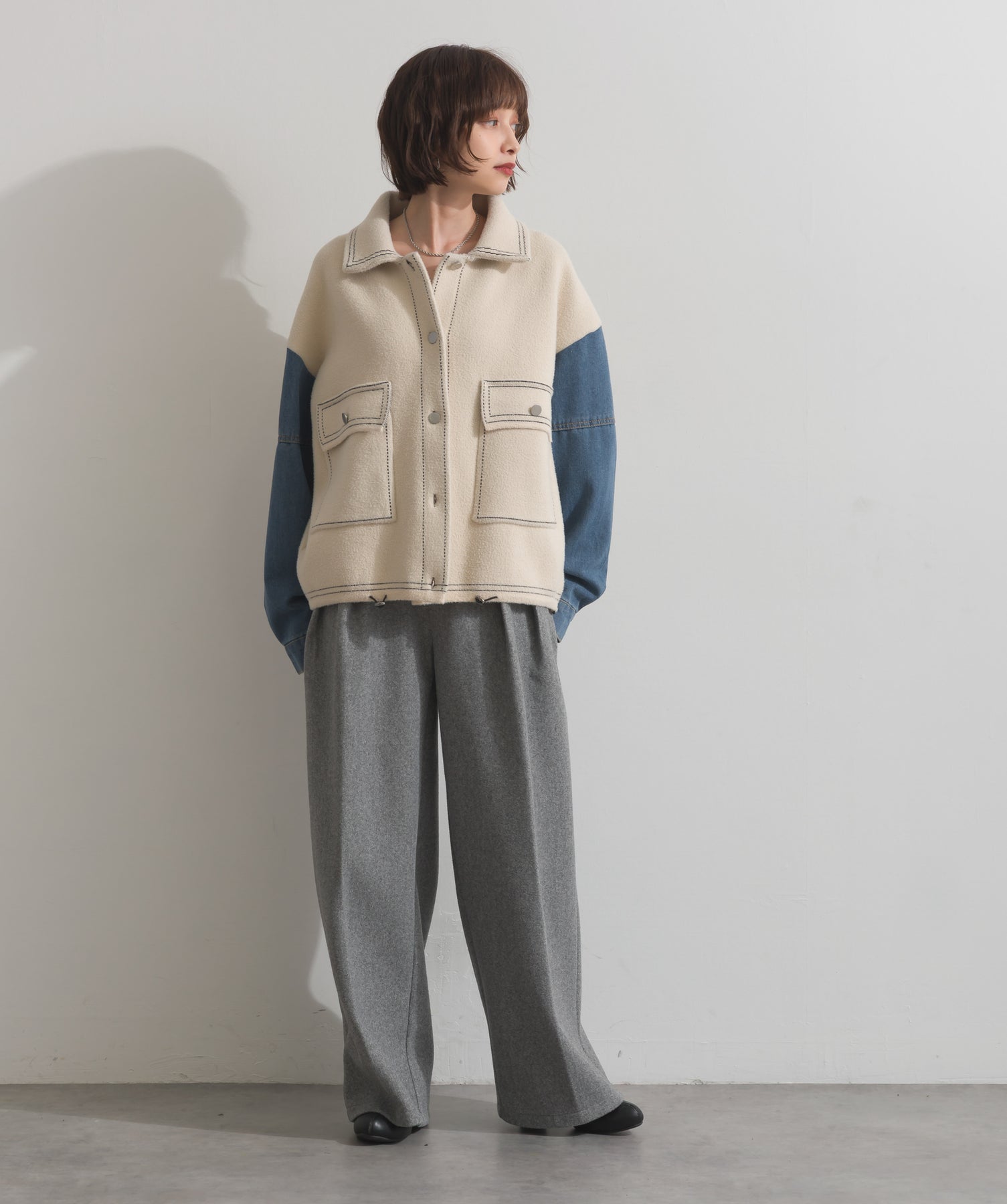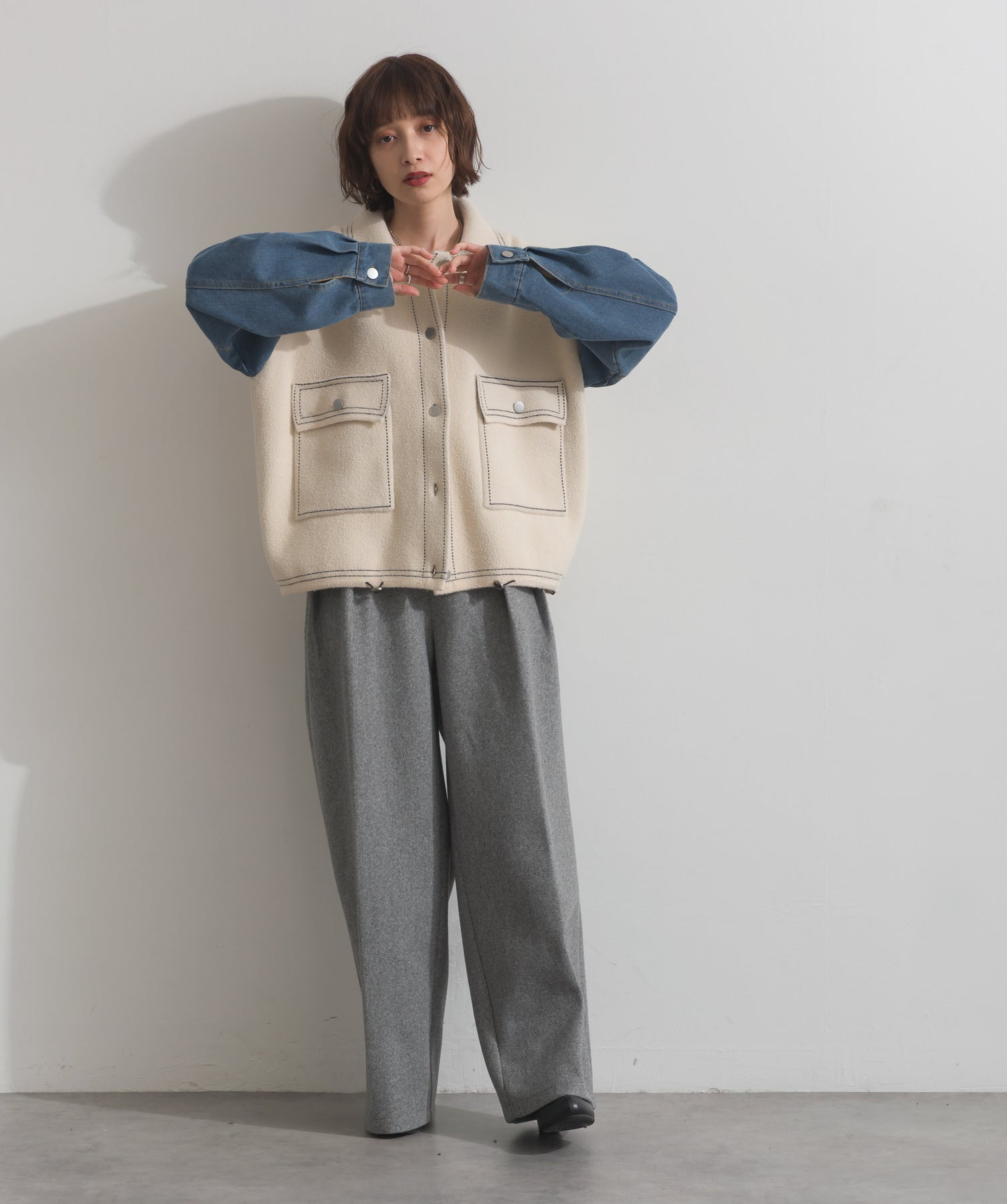 異素材MIXで魅せる、主役級ジャケットカーデ。-material-厚手でハリ感のあるしっかりとしたニット素材をベースに。配色のデニム切り替えを袖に施し、タフさとラフさを兼ね備えたモダンな印象に仕上げました。-design-ワークジャケットの要素を取り入れたビッグポケットとステッチデザインが、存在感を高めるアクセントに。ヒップまで隠れるオーバーシルエットで、羽織るだけで旬なスタイリングが完成します。ボタンを留めてトップス使いにも、アウター感覚でさらっと羽織っても◎。ユニセックスライクな雰囲気と、こなれ感のあるバランスが今の気分にぴったり。