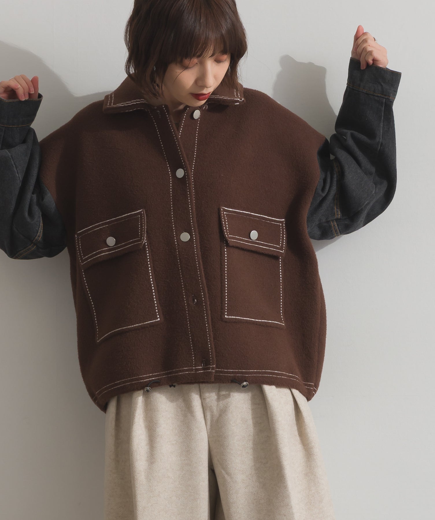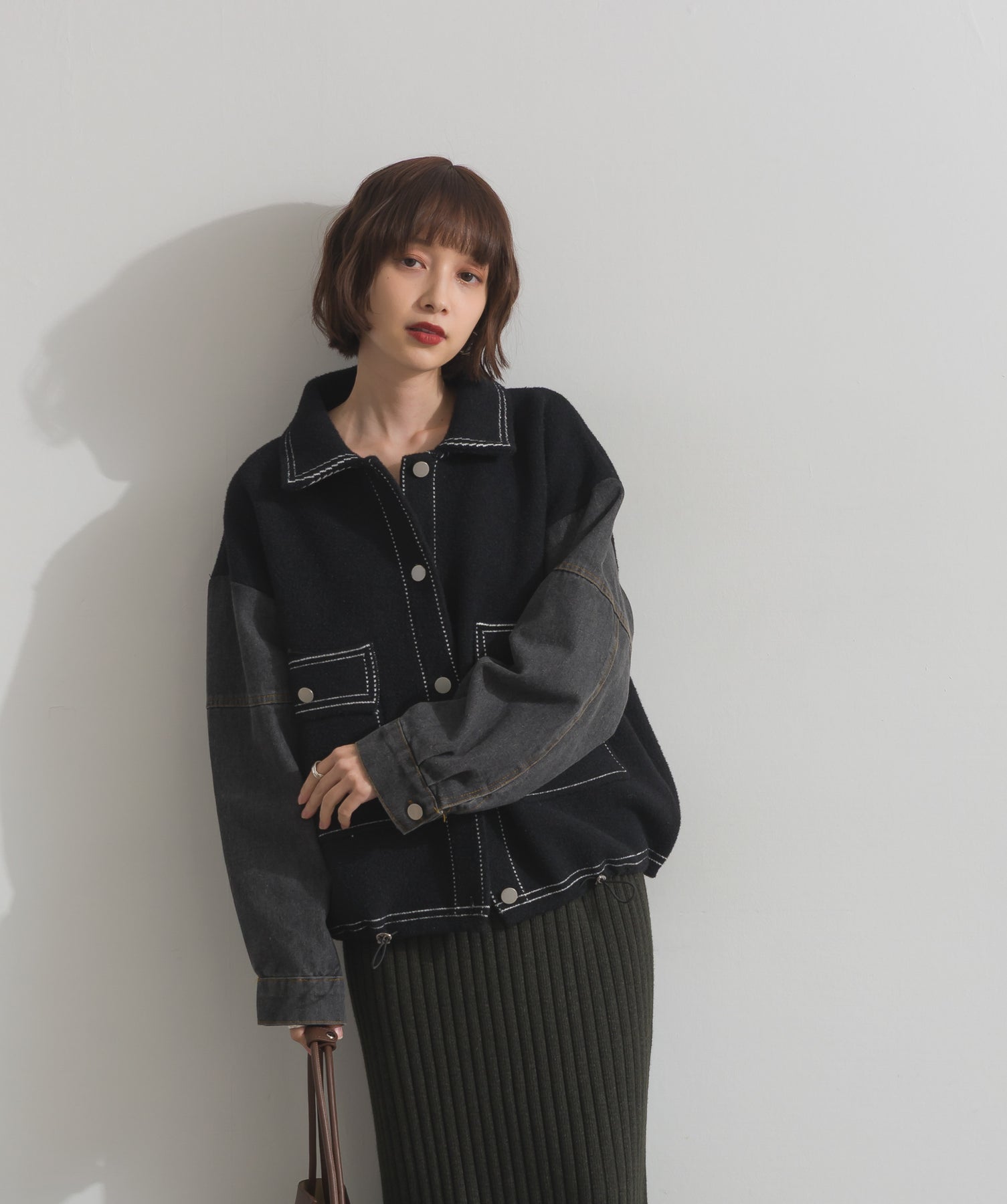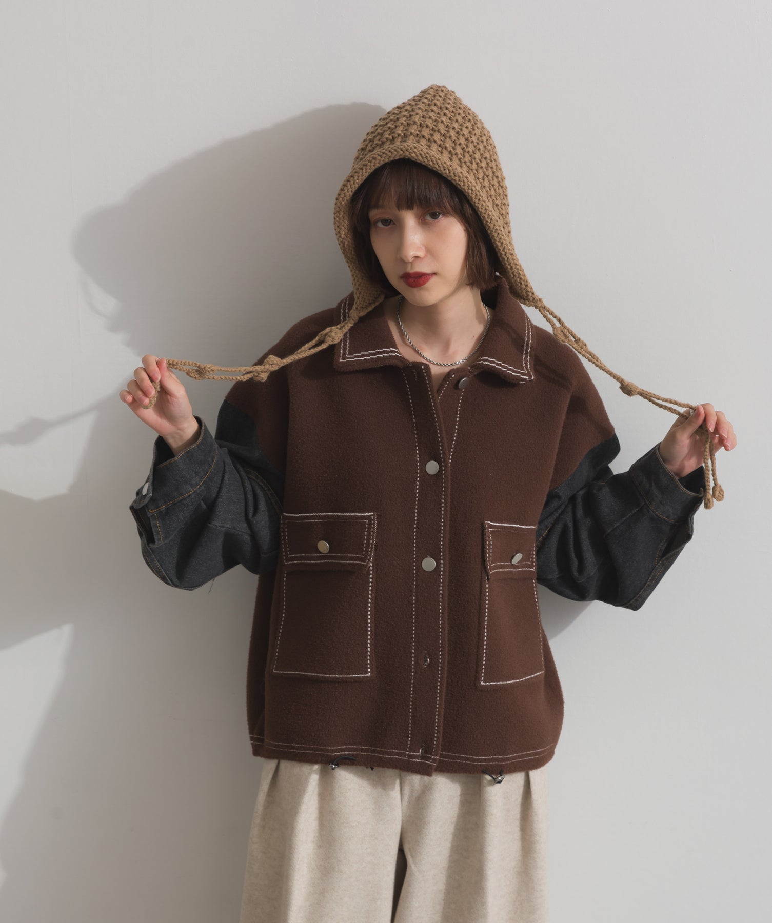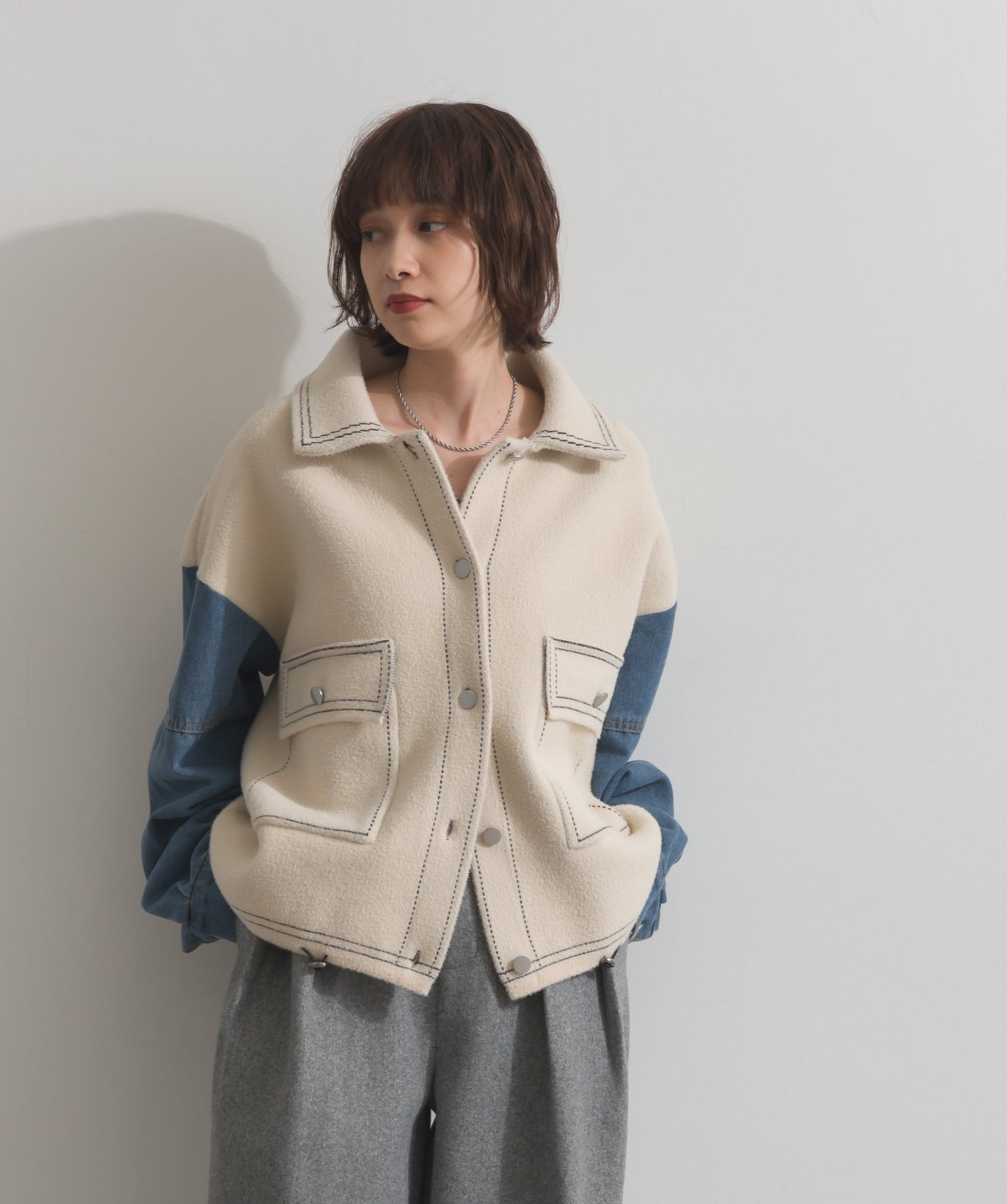 異素材MIXで魅せる、主役級ジャケットカーデ。-material-厚手でハリ感のあるしっかりとしたニット素材をベースに。配色のデニム切り替えを袖に施し、タフさとラフさを兼ね備えたモダンな印象に仕上げました。-design-ワークジャケットの要素を取り入れたビッグポケットとステッチデザインが、存在感を高めるアクセントに。ヒップまで隠れるオーバーシルエットで、羽織るだけで旬なスタイリングが完成します。ボタンを留めてトップス使いにも、アウター感覚でさらっと羽織っても◎。ユニセックスライクな雰囲気と、こなれ感のあるバランスが今の気分にぴったり。