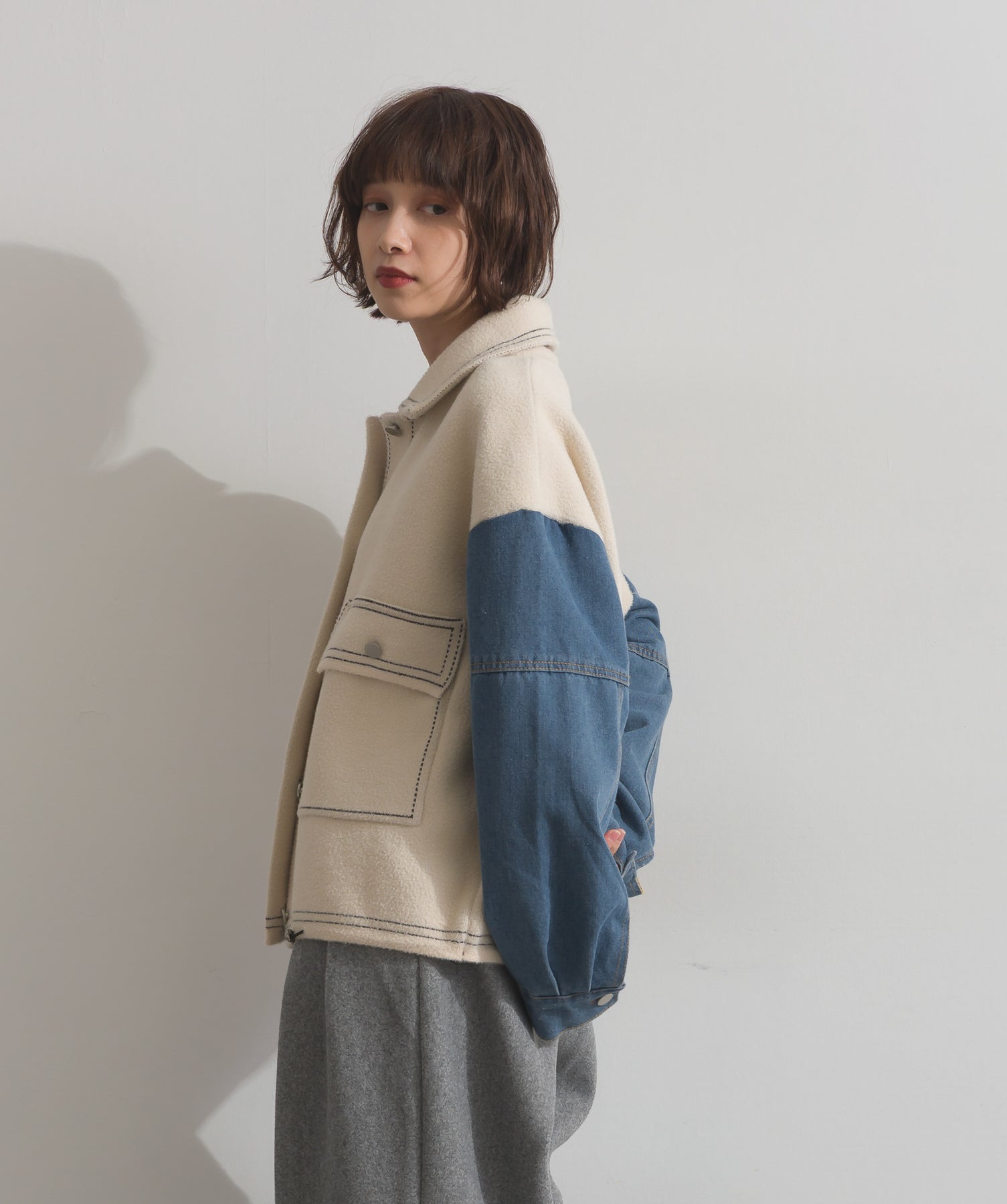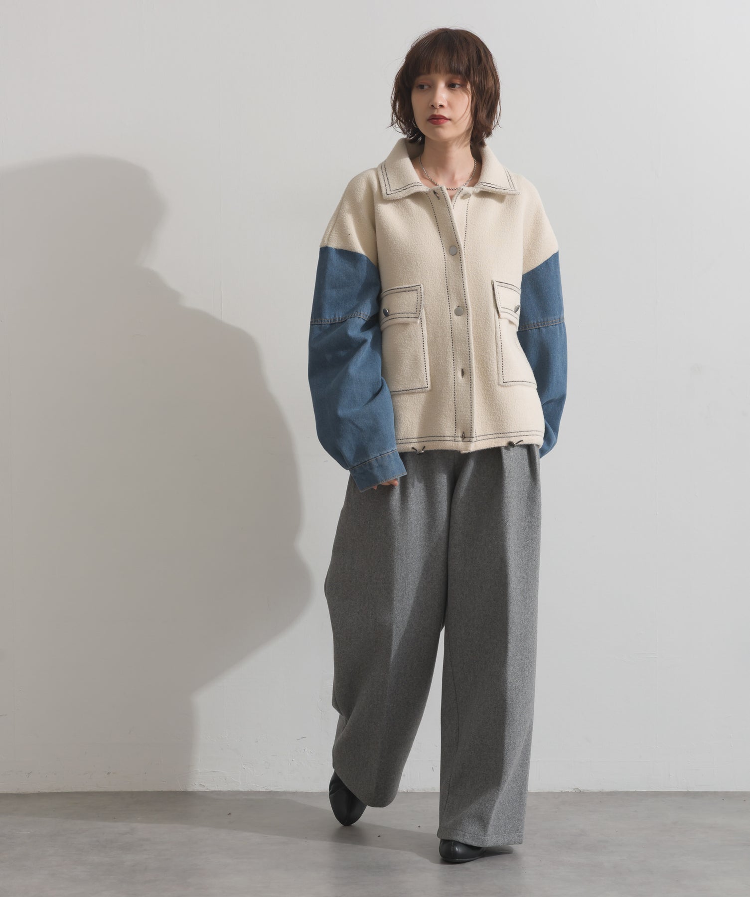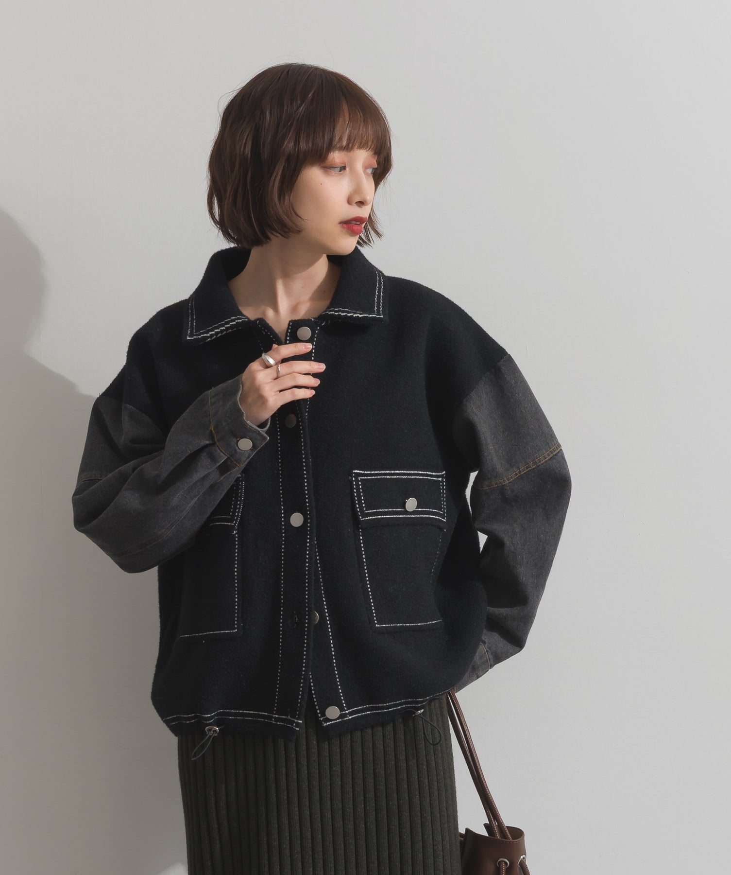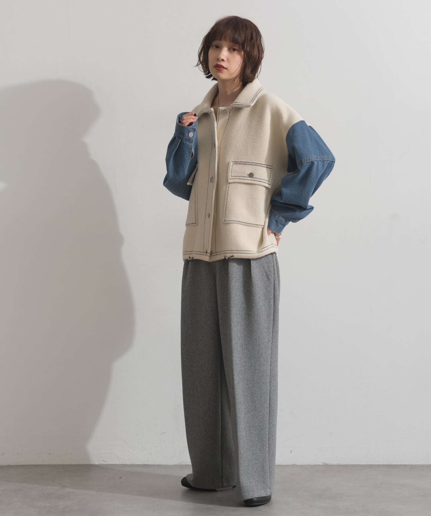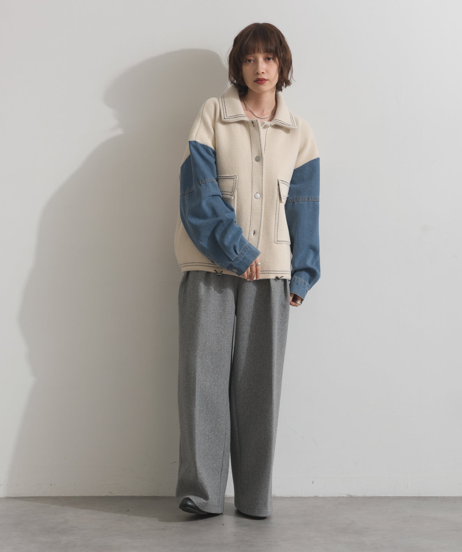 異素材MIXで魅せる、主役級ジャケットカーデ。-material-厚手でハリ感のあるしっかりとしたニット素材をベースに。配色のデニム切り替えを袖に施し、タフさとラフさを兼ね備えたモダンな印象に仕上げました。-design-ワークジャケットの要素を取り入れたビッグポケットとステッチデザインが、存在感を高めるアクセントに。ヒップまで隠れるオーバーシルエットで、羽織るだけで旬なスタイリングが完成します。ボタンを留めてトップス使いにも、アウター感覚でさらっと羽織っても◎。ユニセックスライクな雰囲気と、こなれ感のあるバランスが今の気分にぴったり。
