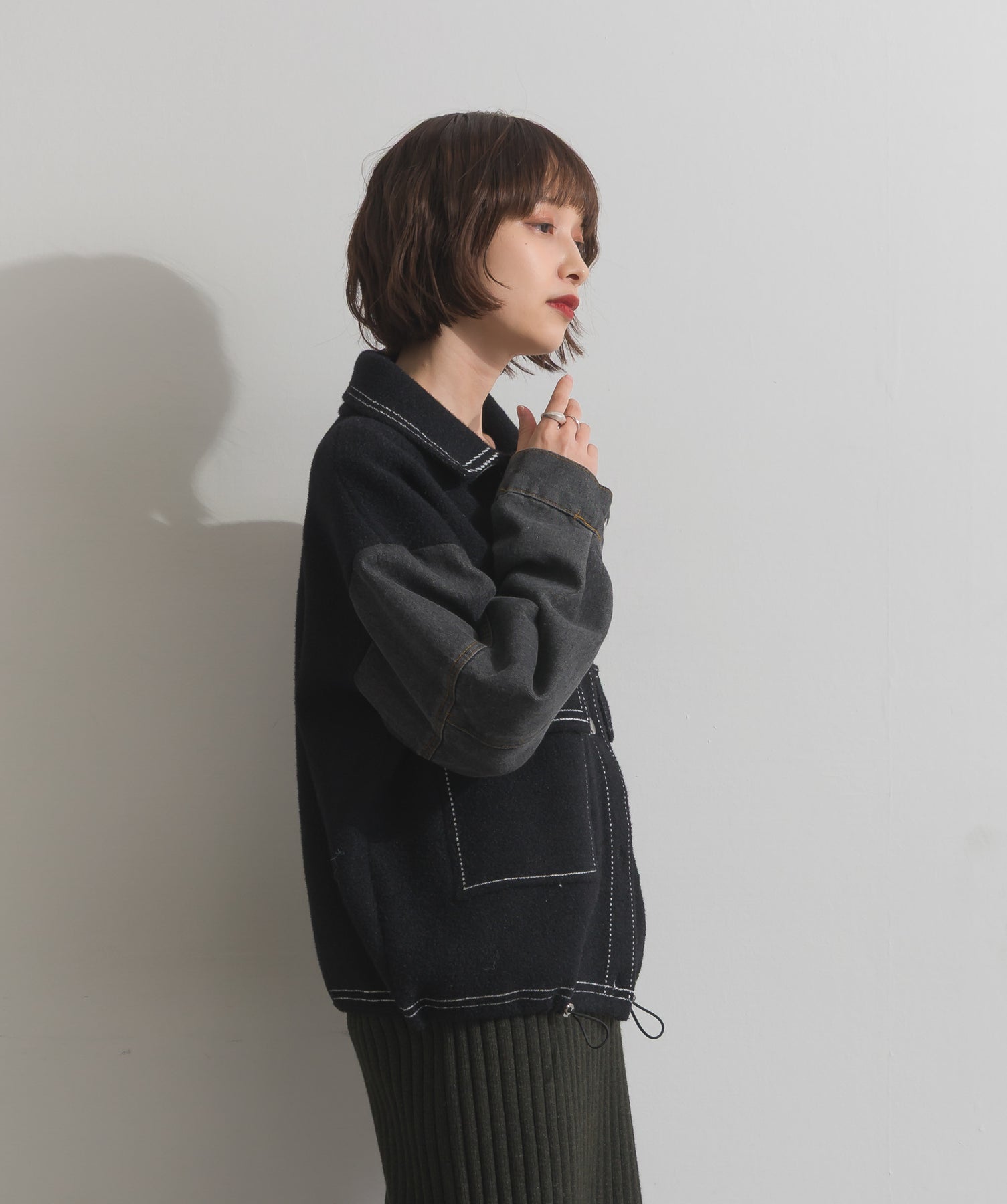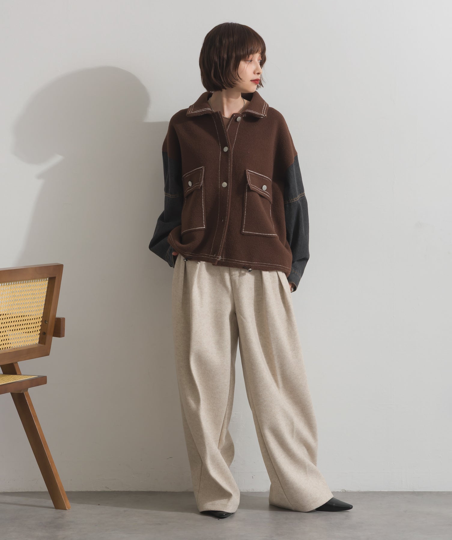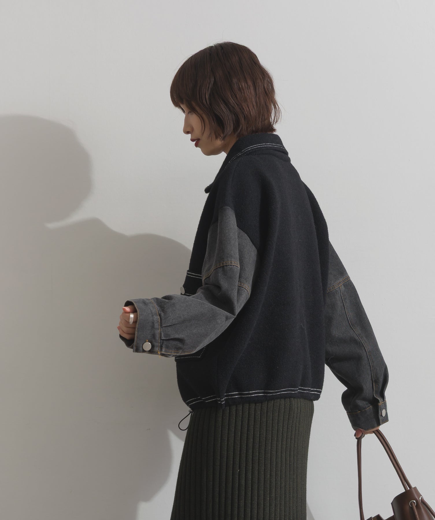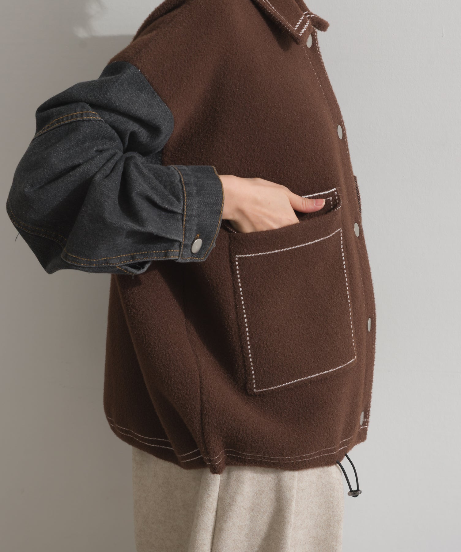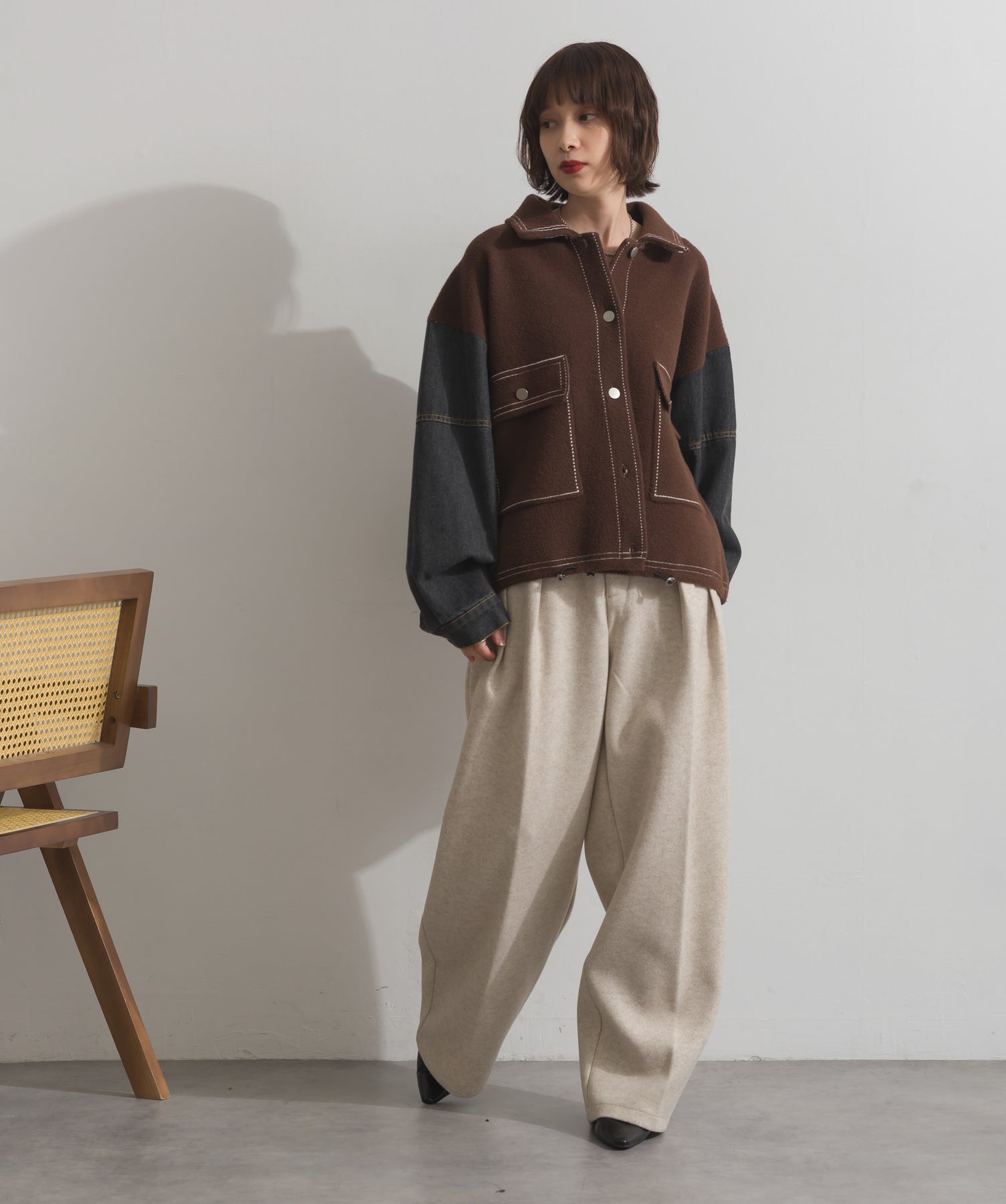 異素材MIXで魅せる、主役級ジャケットカーデ。-material-厚手でハリ感のあるしっかりとしたニット素材をベースに。配色のデニム切り替えを袖に施し、タフさとラフさを兼ね備えたモダンな印象に仕上げました。-design-ワークジャケットの要素を取り入れたビッグポケットとステッチデザインが、存在感を高めるアクセントに。ヒップまで隠れるオーバーシルエットで、羽織るだけで旬なスタイリングが完成します。ボタンを留めてトップス使いにも、アウター感覚でさらっと羽織っても◎。ユニセックスライクな雰囲気と、こなれ感のあるバランスが今の気分にぴったり。