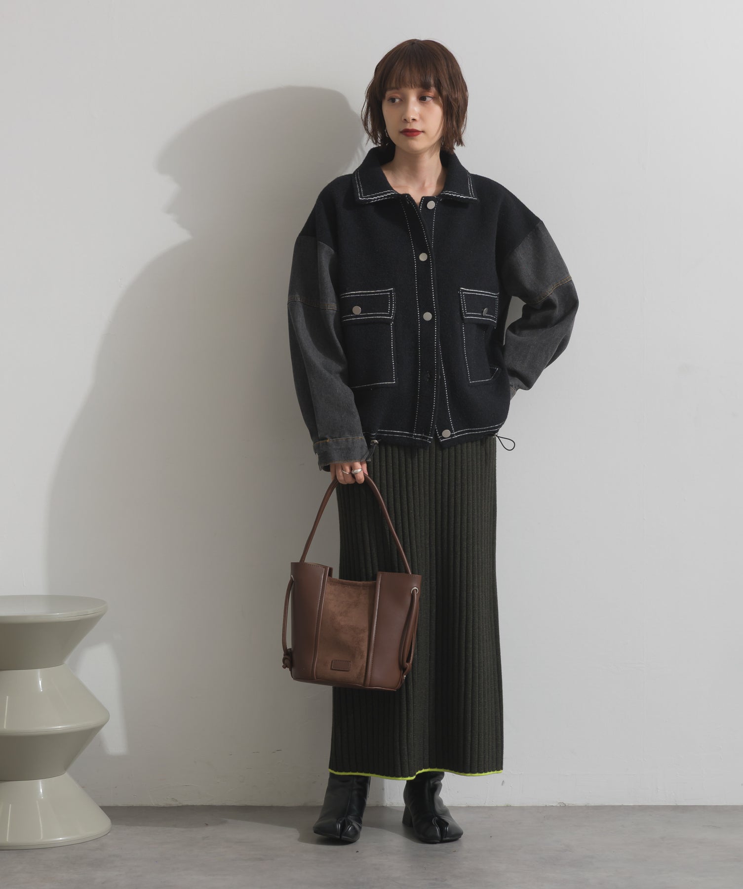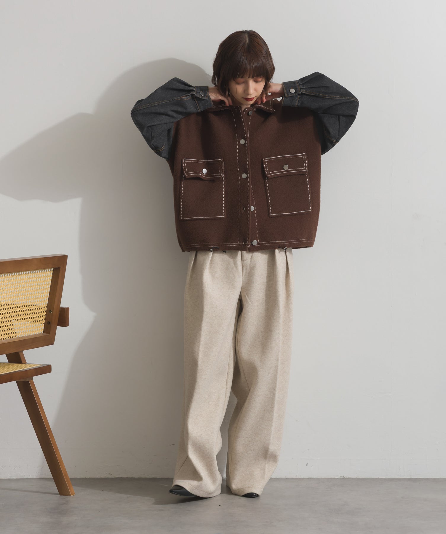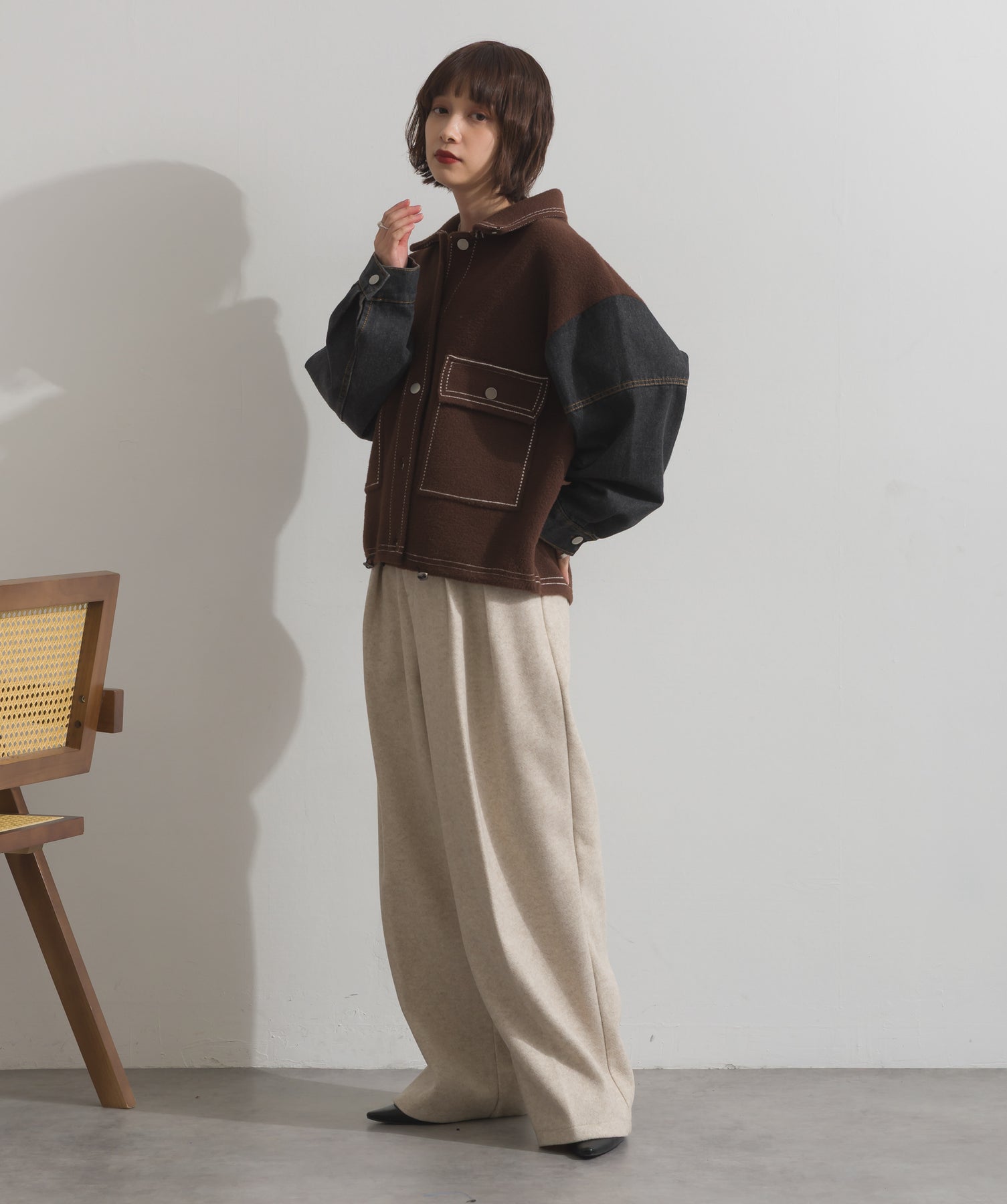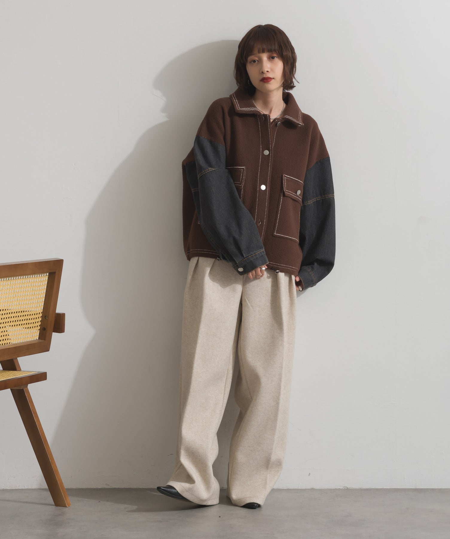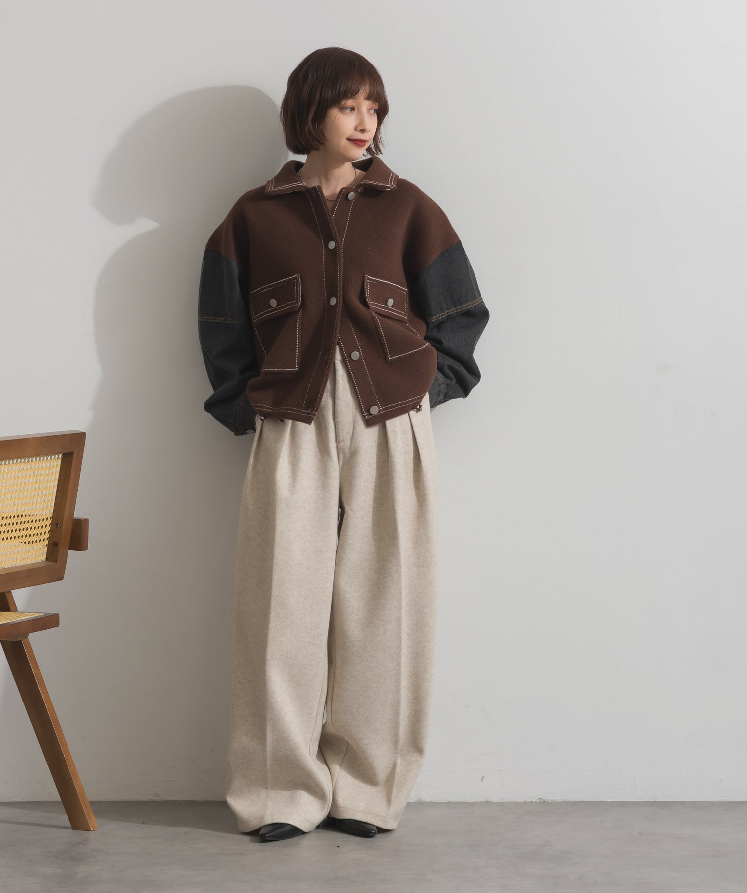 異素材MIXで魅せる、主役級ジャケットカーデ。-material-厚手でハリ感のあるしっかりとしたニット素材をベースに。配色のデニム切り替えを袖に施し、タフさとラフさを兼ね備えたモダンな印象に仕上げました。-design-ワークジャケットの要素を取り入れたビッグポケットとステッチデザインが、存在感を高めるアクセントに。ヒップまで隠れるオーバーシルエットで、羽織るだけで旬なスタイリングが完成します。ボタンを留めてトップス使いにも、アウター感覚でさらっと羽織っても◎。ユニセックスライクな雰囲気と、こなれ感のあるバランスが今の気分にぴったり。