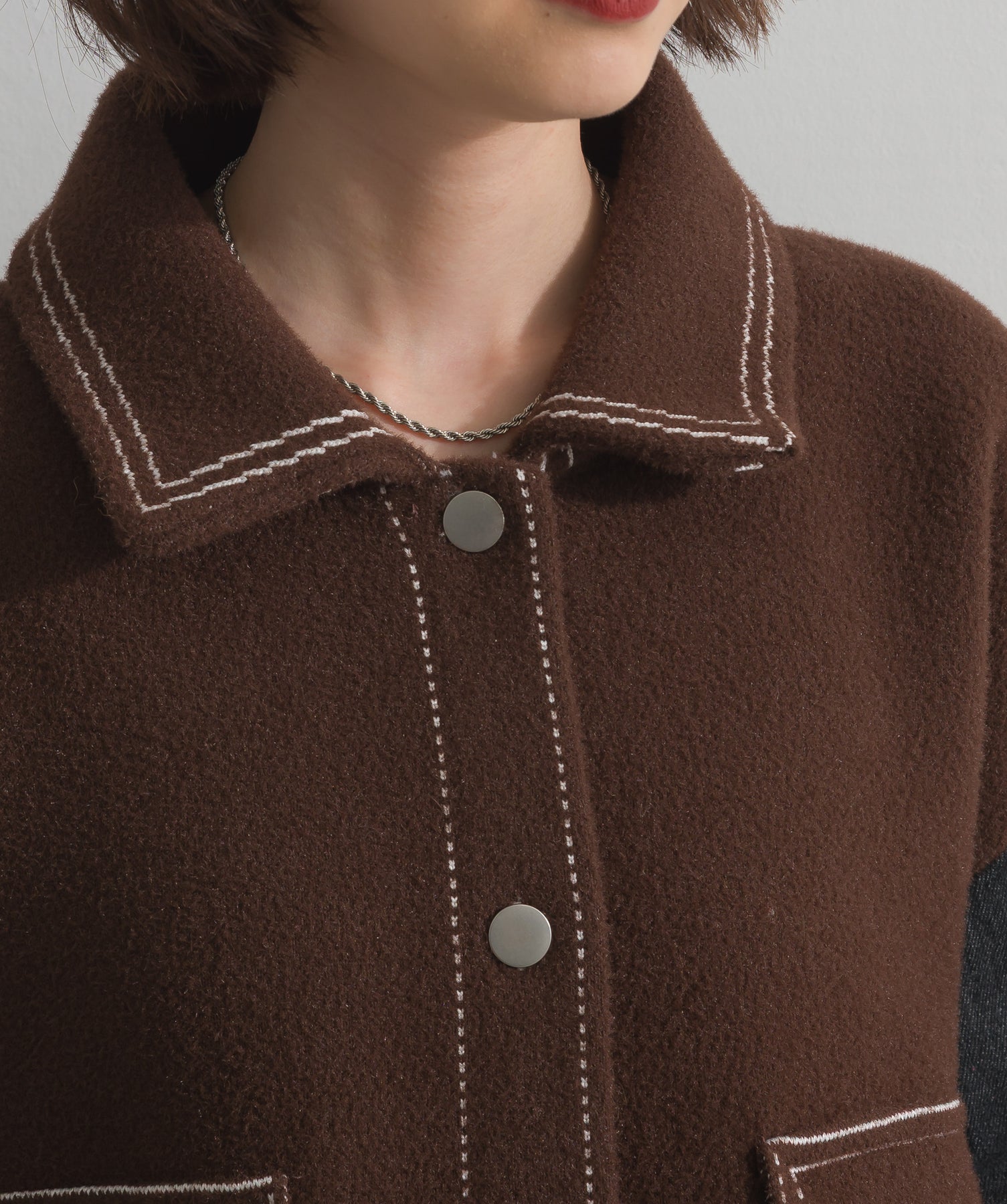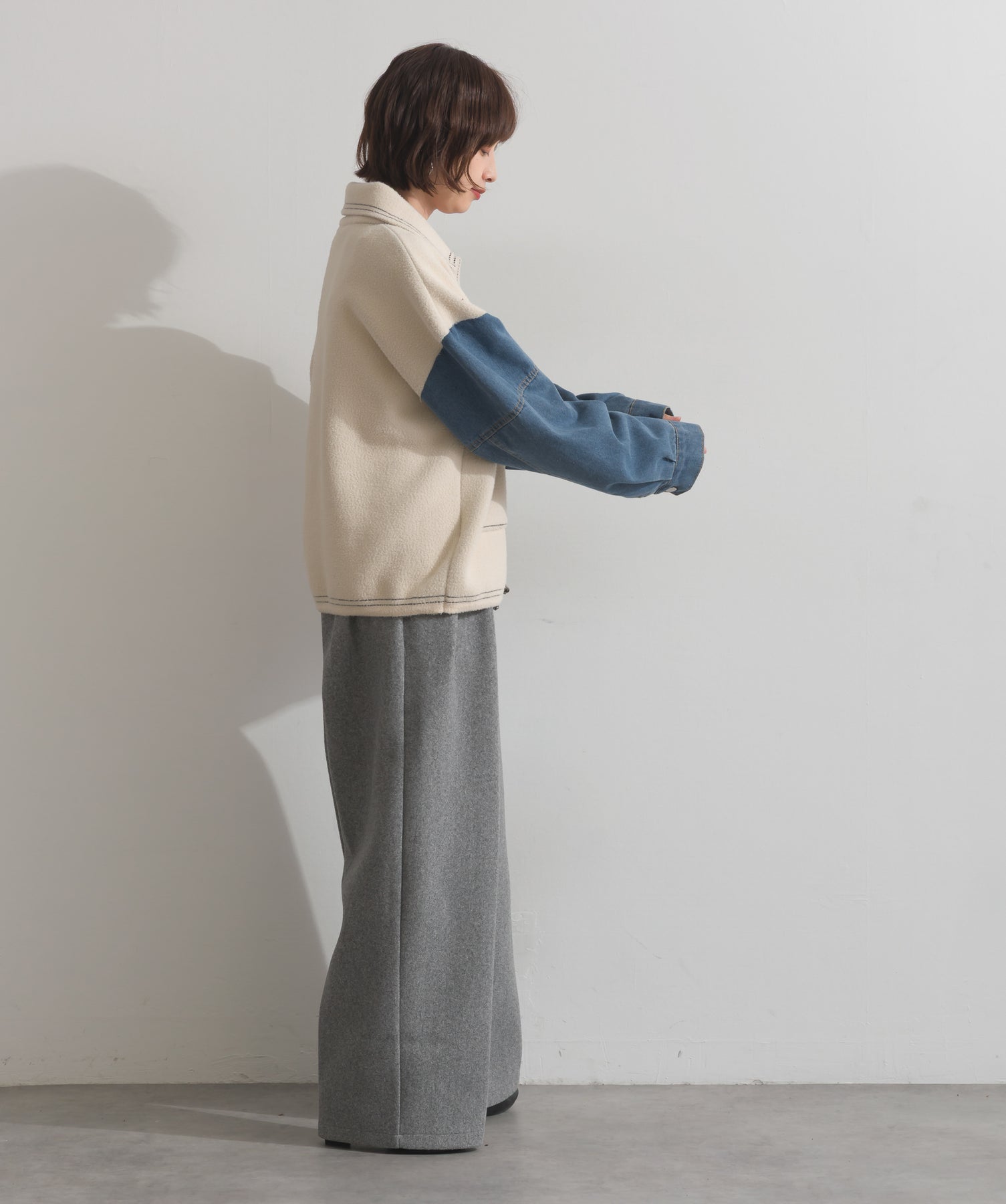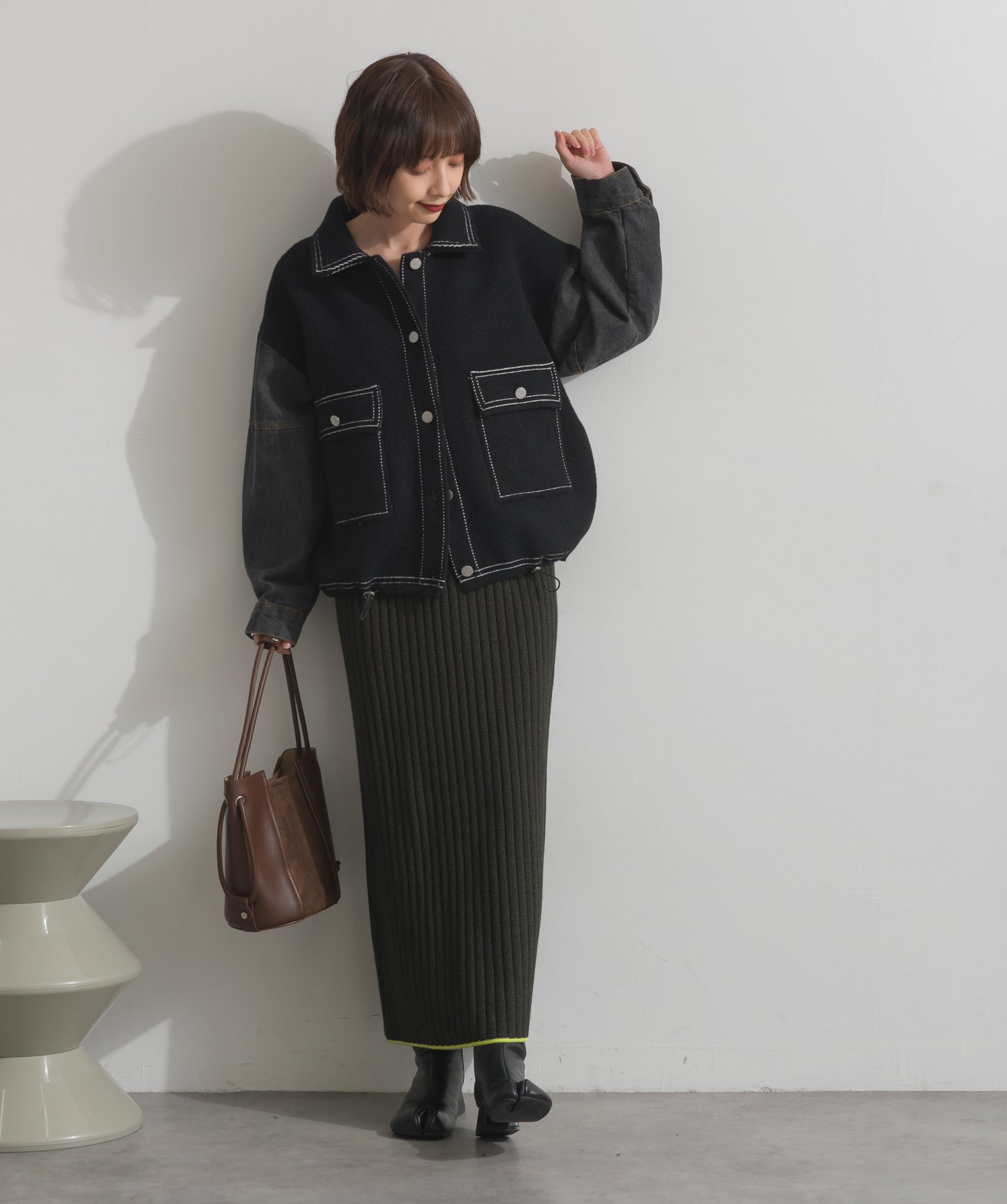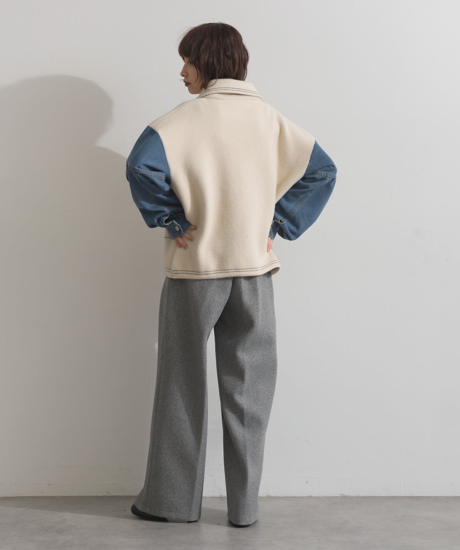 異素材MIXで魅せる、主役級ジャケットカーデ。-material-厚手でハリ感のあるしっかりとしたニット素材をベースに。配色のデニム切り替えを袖に施し、タフさとラフさを兼ね備えたモダンな印象に仕上げました。-design-ワークジャケットの要素を取り入れたビッグポケットとステッチデザインが、存在感を高めるアクセントに。ヒップまで隠れるオーバーシルエットで、羽織るだけで旬なスタイリングが完成します。ボタンを留めてトップス使いにも、アウター感覚でさらっと羽織っても◎。ユニセックスライクな雰囲気と、こなれ感のあるバランスが今の気分にぴったり。