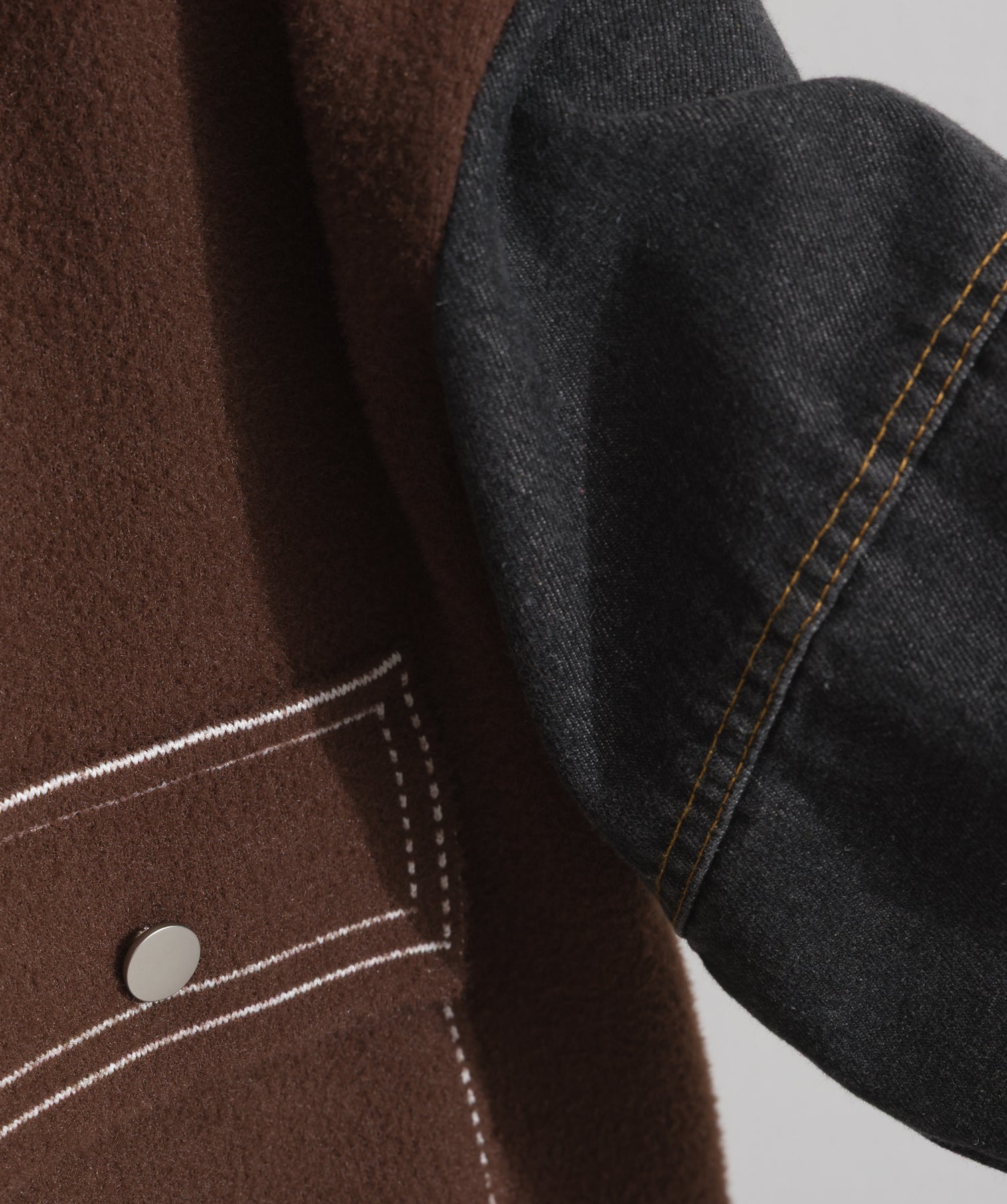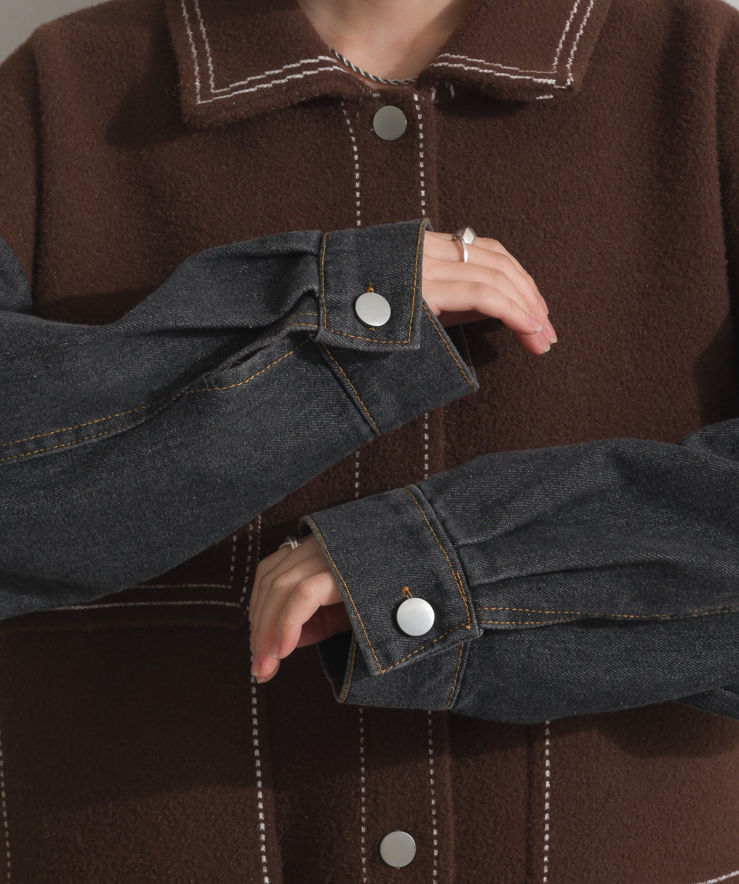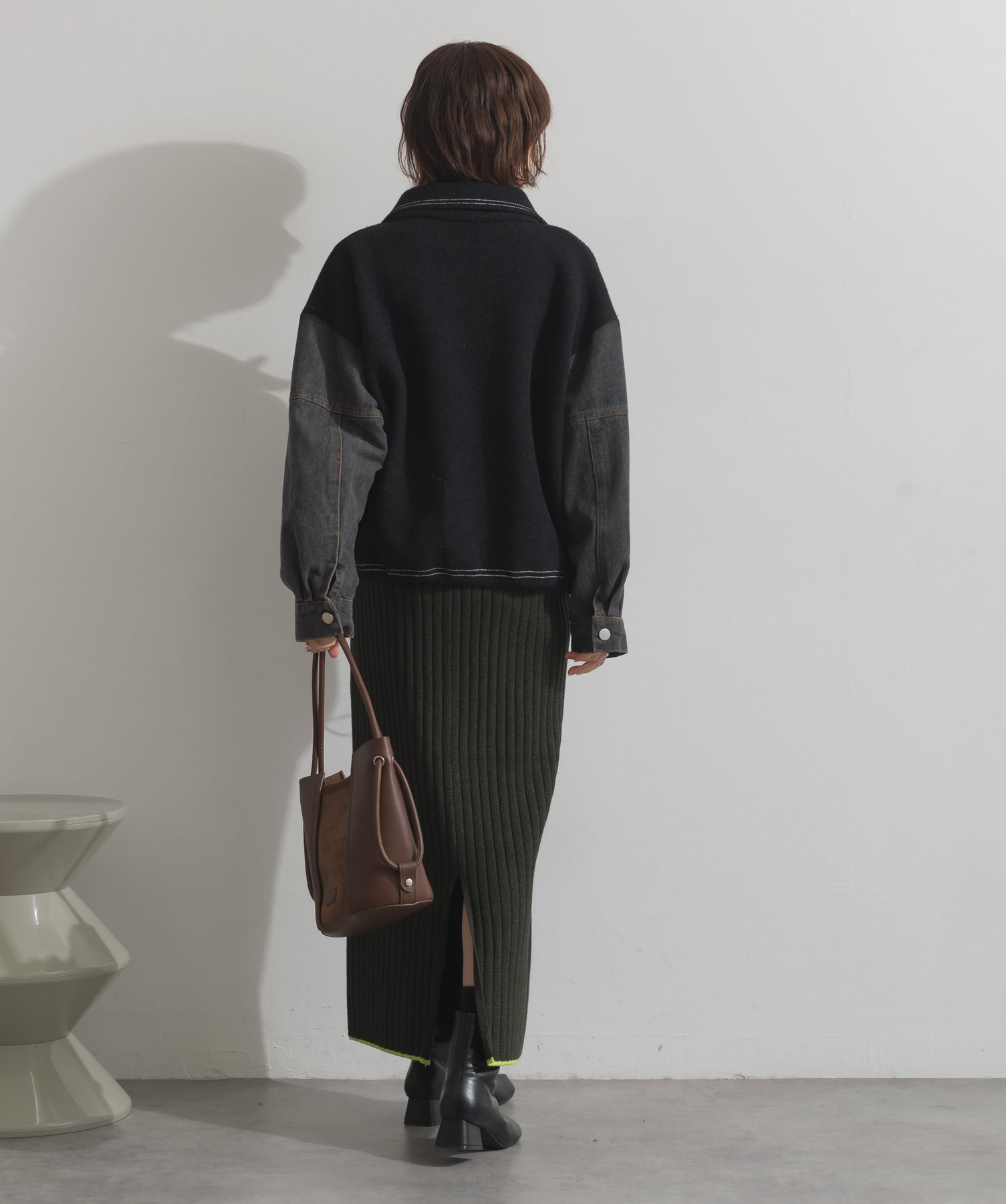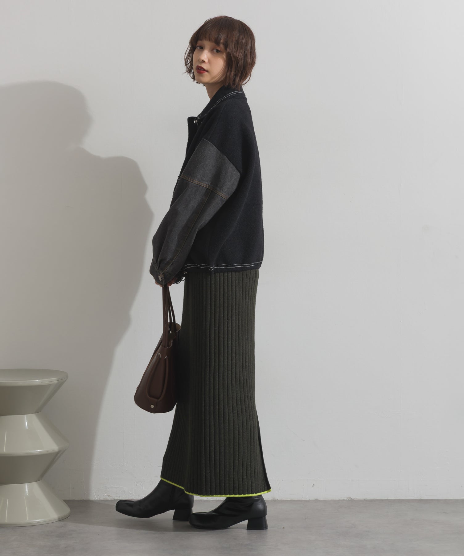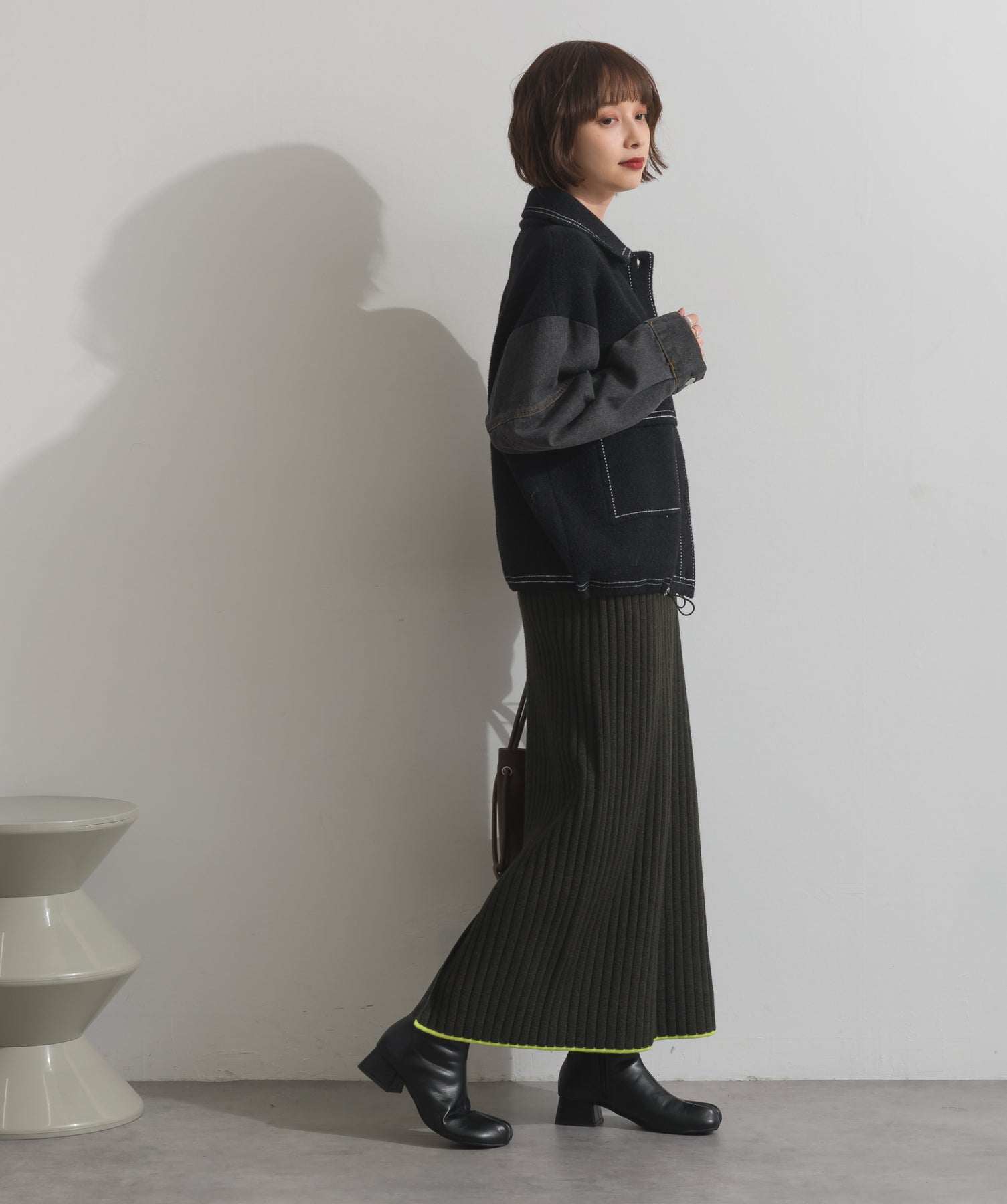 異素材MIXで魅せる、主役級ジャケットカーデ。-material-厚手でハリ感のあるしっかりとしたニット素材をベースに。配色のデニム切り替えを袖に施し、タフさとラフさを兼ね備えたモダンな印象に仕上げました。-design-ワークジャケットの要素を取り入れたビッグポケットとステッチデザインが、存在感を高めるアクセントに。ヒップまで隠れるオーバーシルエットで、羽織るだけで旬なスタイリングが完成します。ボタンを留めてトップス使いにも、アウター感覚でさらっと羽織っても◎。ユニセックスライクな雰囲気と、こなれ感のあるバランスが今の気分にぴったり。