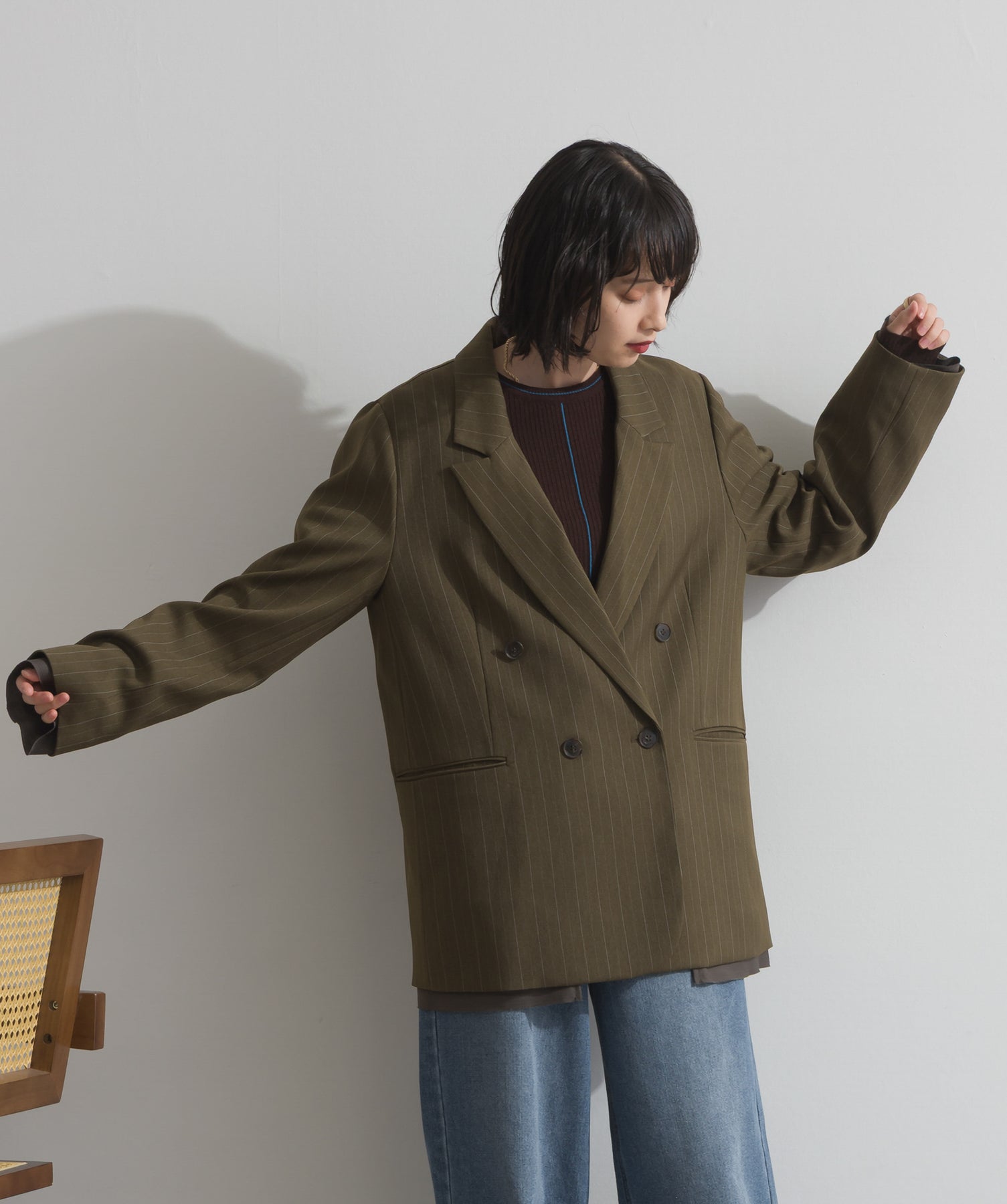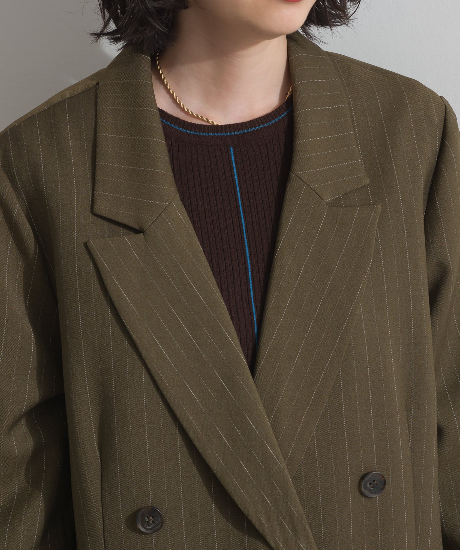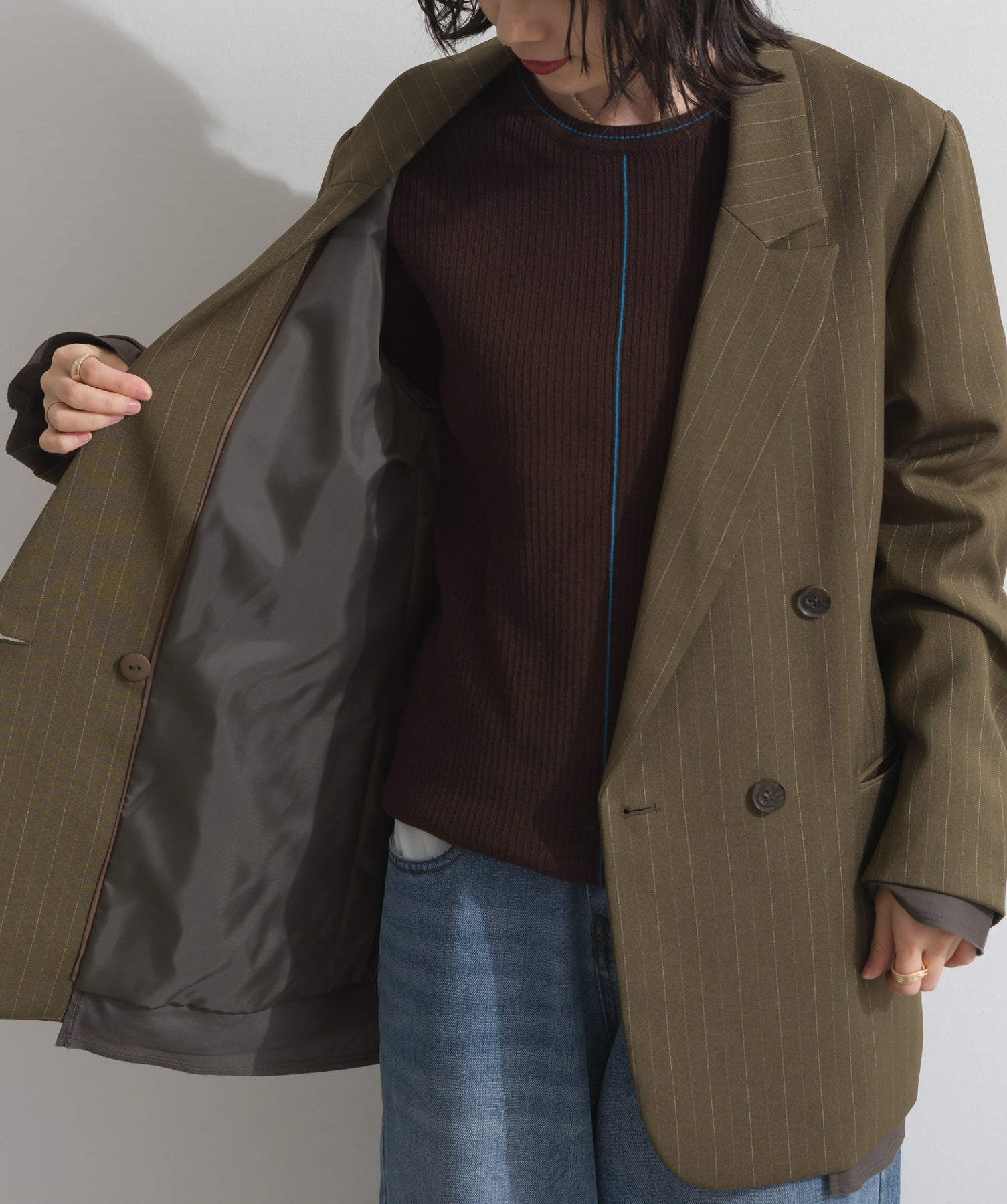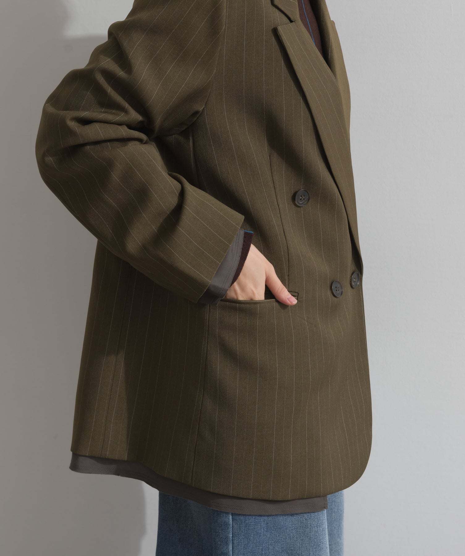 旬顔を叶える、大人のダブルブレストジャケット。さりげないストライプ柄が品よく映える、ポリスパン素材のダブルジャケット。ゆとりあるサイズ感と長めの丈感が今っぽく、さらっと羽織るだけでトレンド感のある着こなしに。ヒップが隠れる丈なので体型カバー効果も◎。Tシャツやタートル、ワンピースとのレイヤードもバランスよくまとまる万能アイテムです。