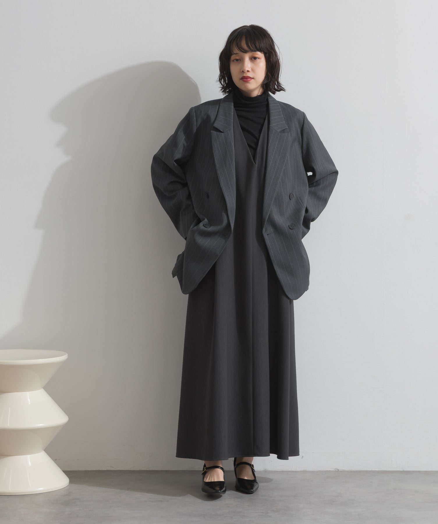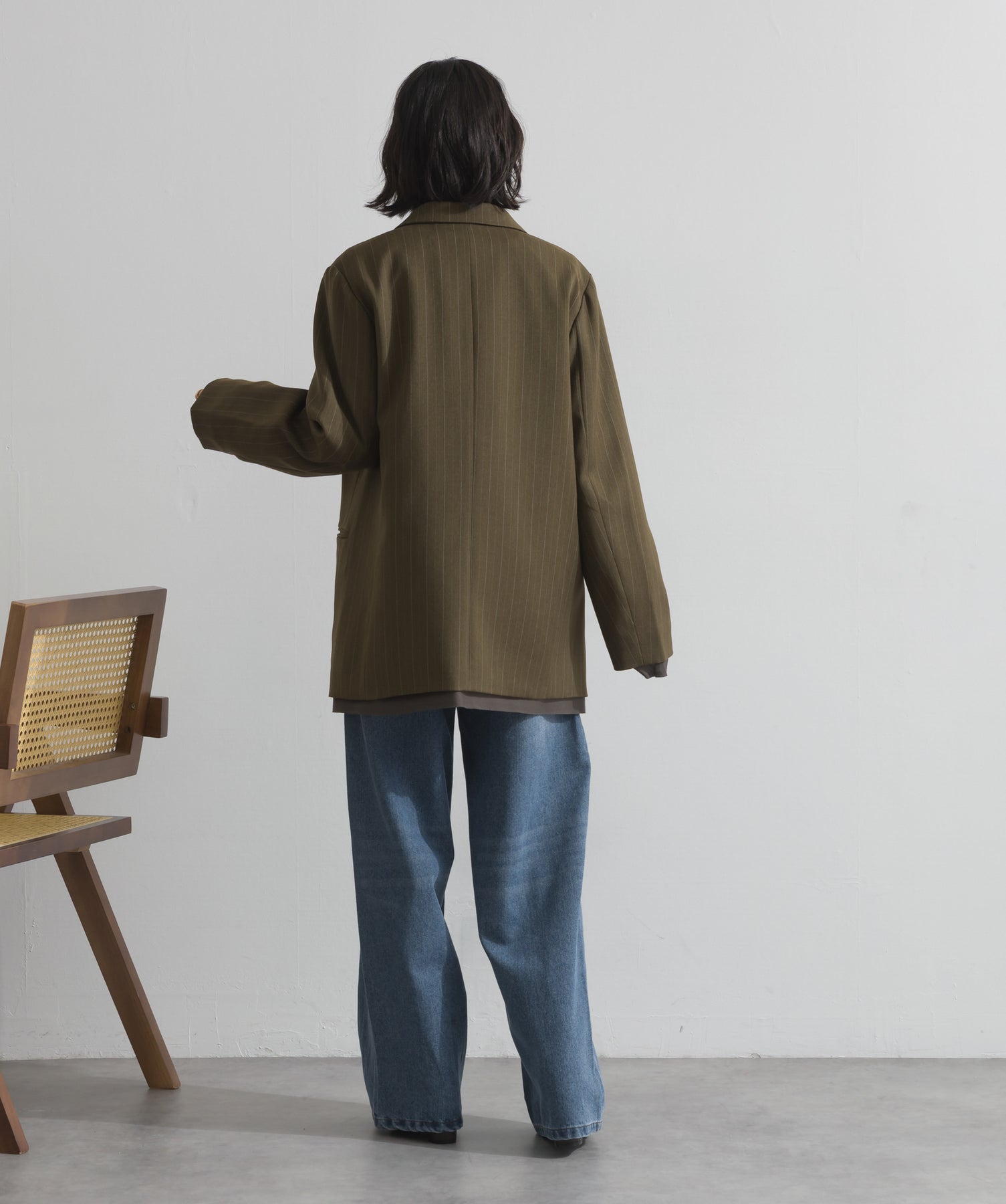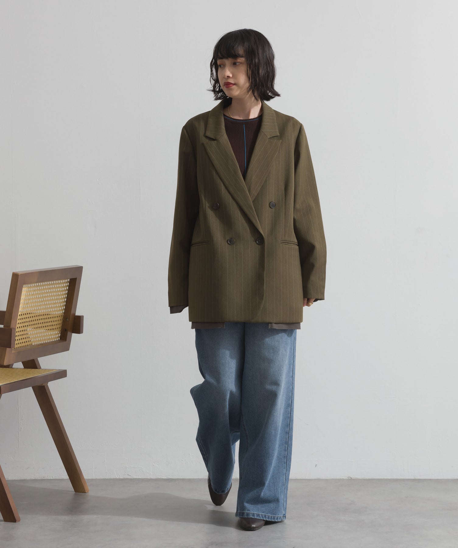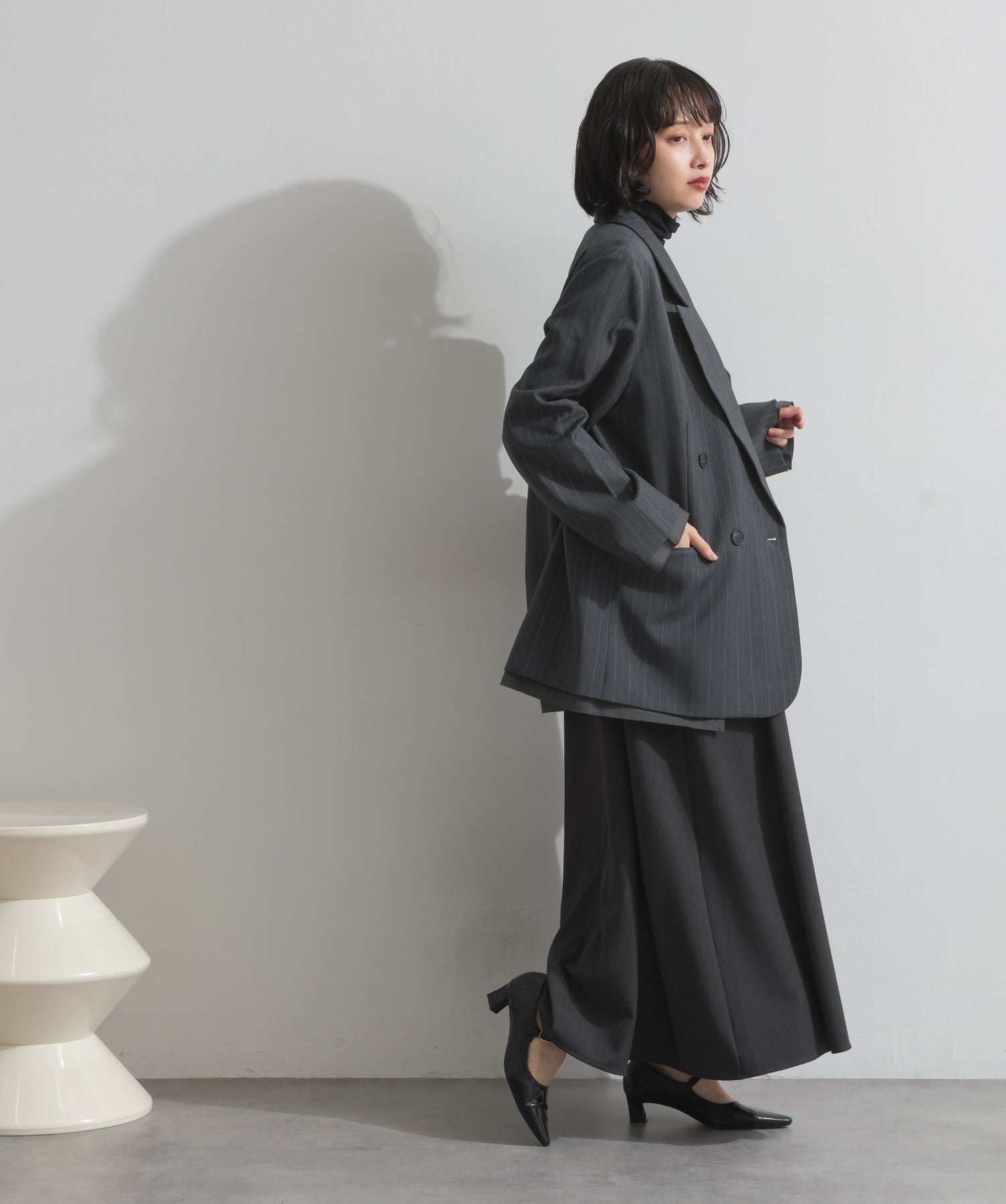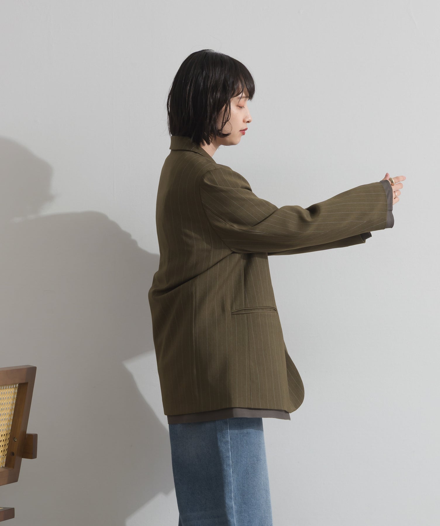 旬顔を叶える、大人のダブルブレストジャケット。さりげないストライプ柄が品よく映える、ポリスパン素材のダブルジャケット。ゆとりあるサイズ感と長めの丈感が今っぽく、さらっと羽織るだけでトレンド感のある着こなしに。ヒップが隠れる丈なので体型カバー効果も◎。Tシャツやタートル、ワンピースとのレイヤードもバランスよくまとまる万能アイテムです。