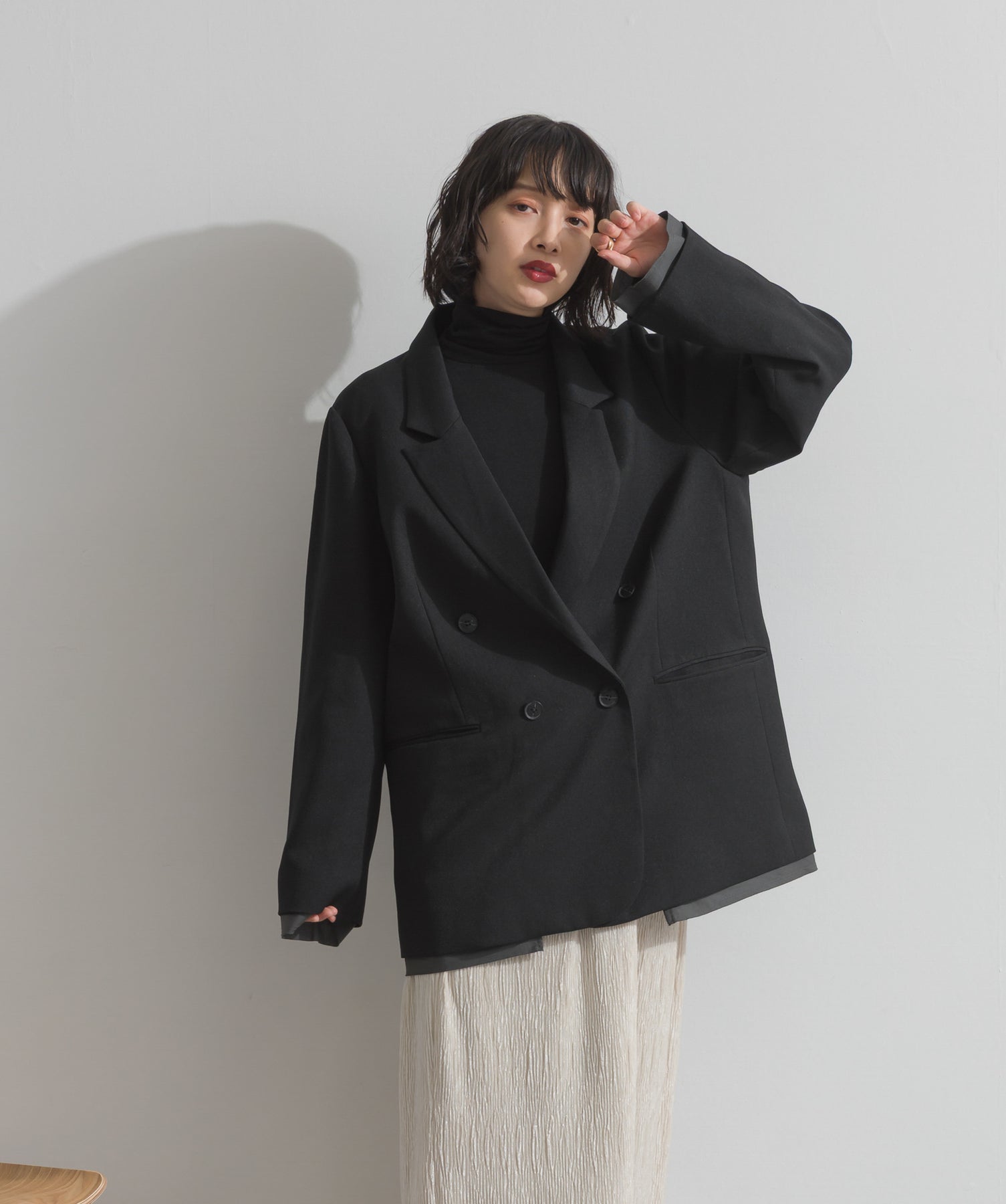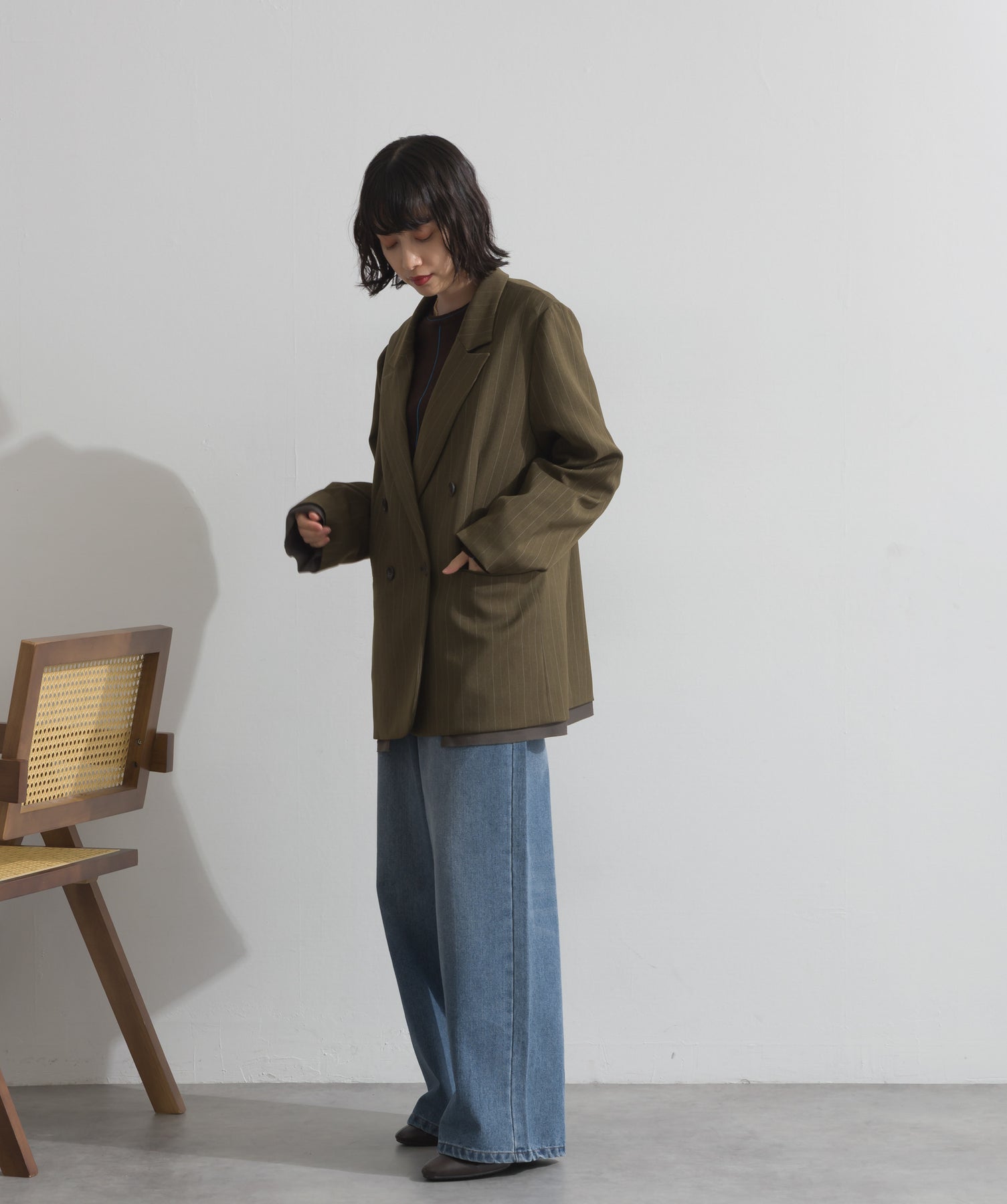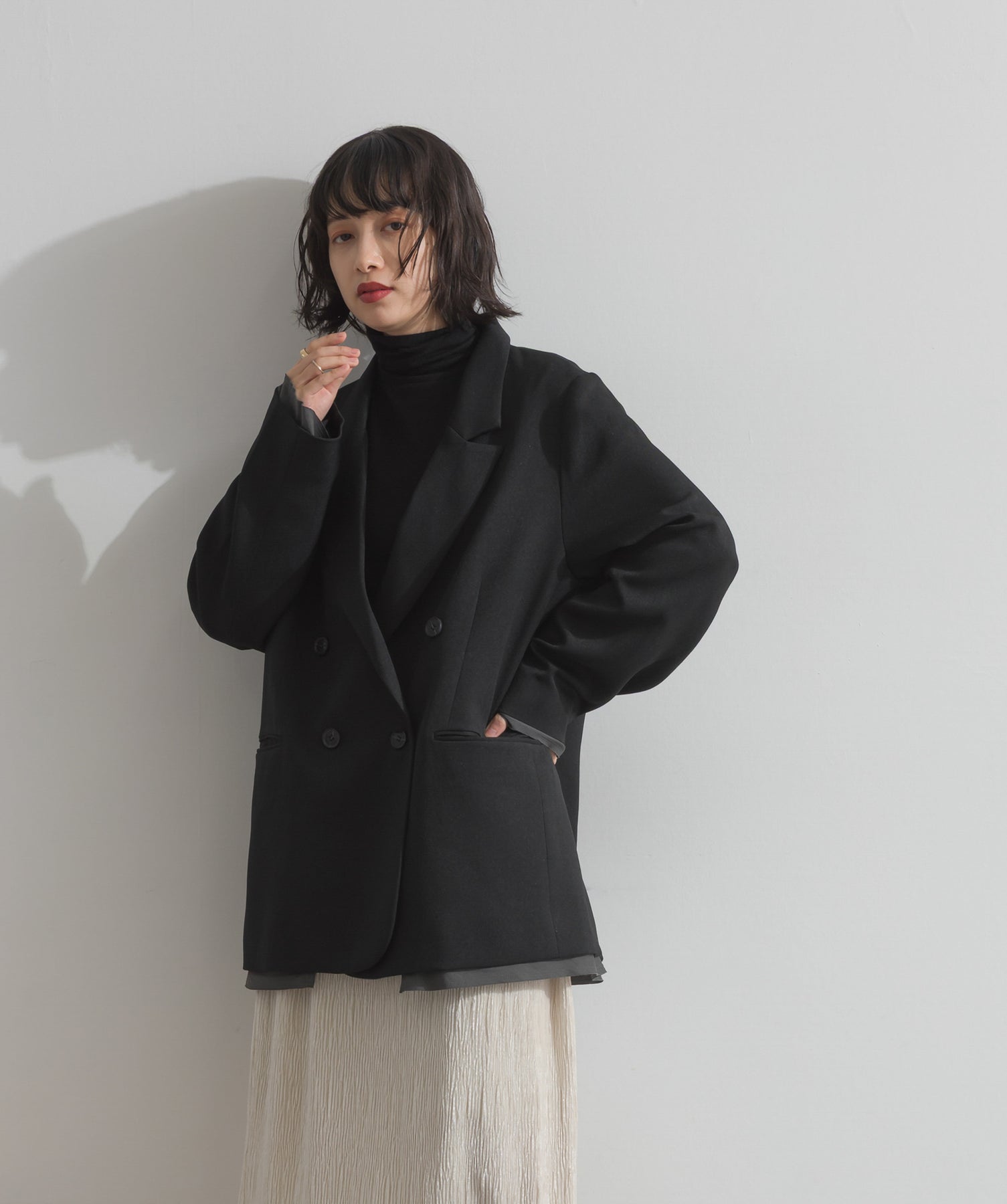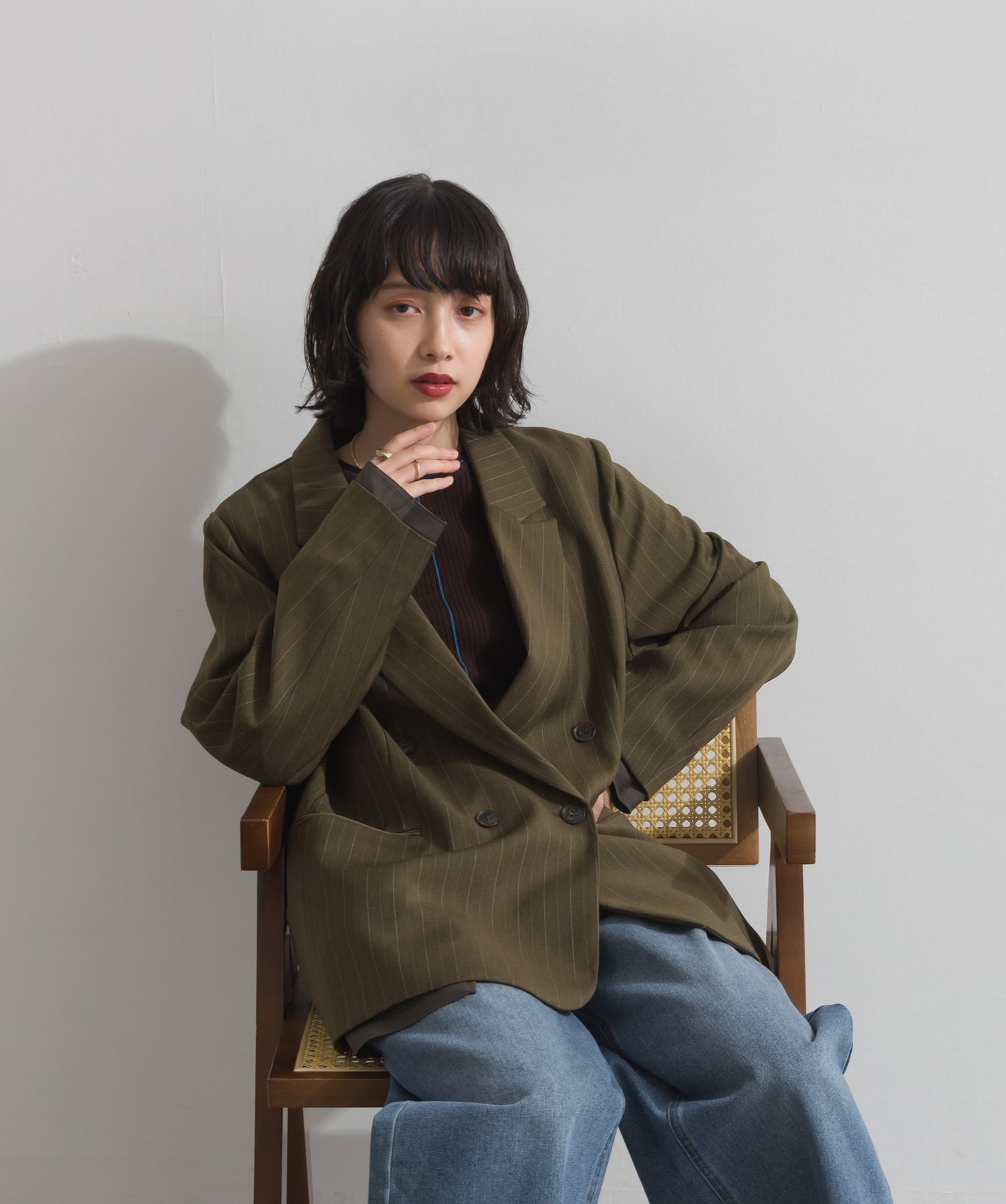 旬顔を叶える、大人のダブルブレストジャケット。さりげないストライプ柄が品よく映える、ポリスパン素材のダブルジャケット。ゆとりあるサイズ感と長めの丈感が今っぽく、さらっと羽織るだけでトレンド感のある着こなしに。ヒップが隠れる丈なので体型カバー効果も◎。Tシャツやタートル、ワンピースとのレイヤードもバランスよくまとまる万能アイテムです。