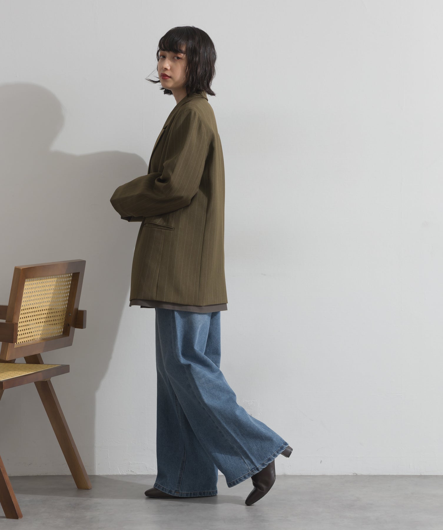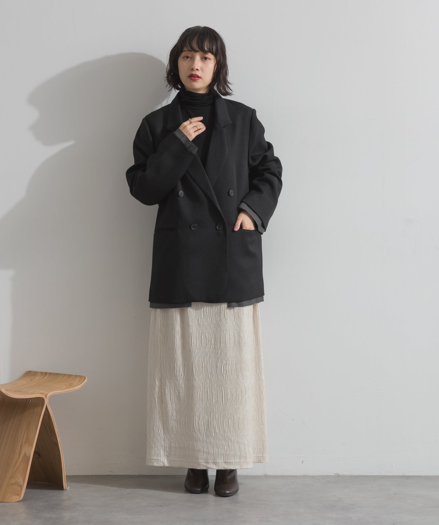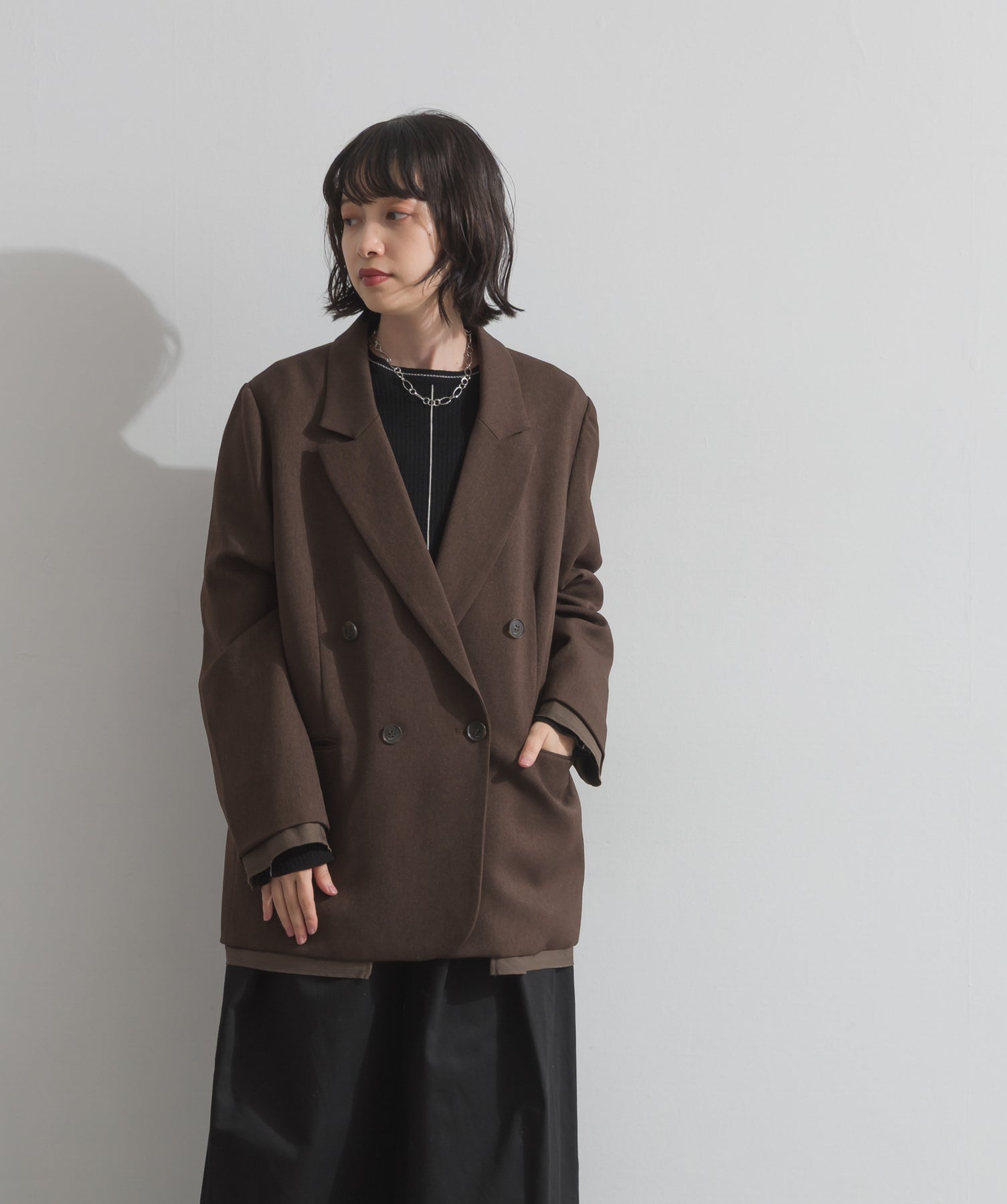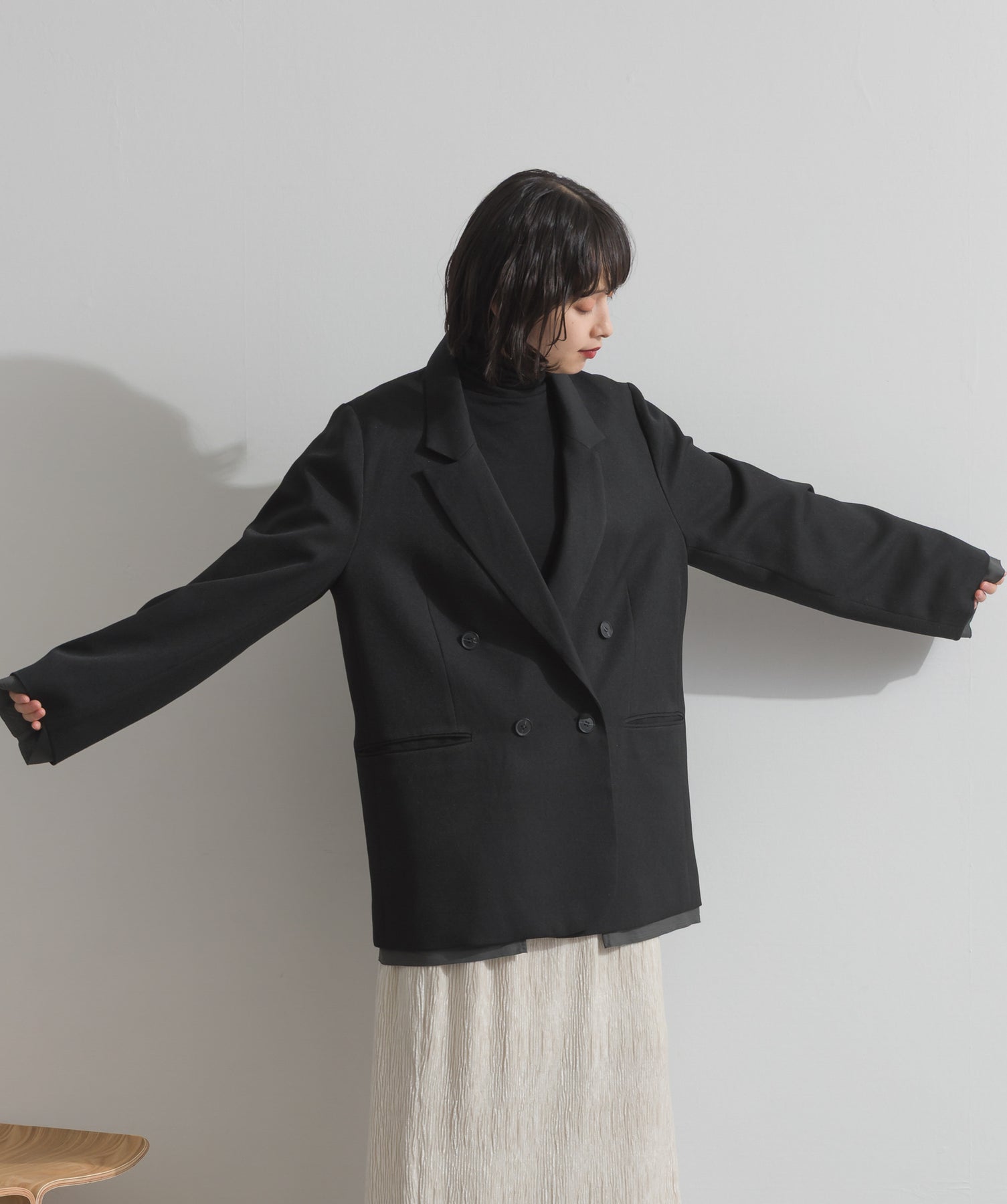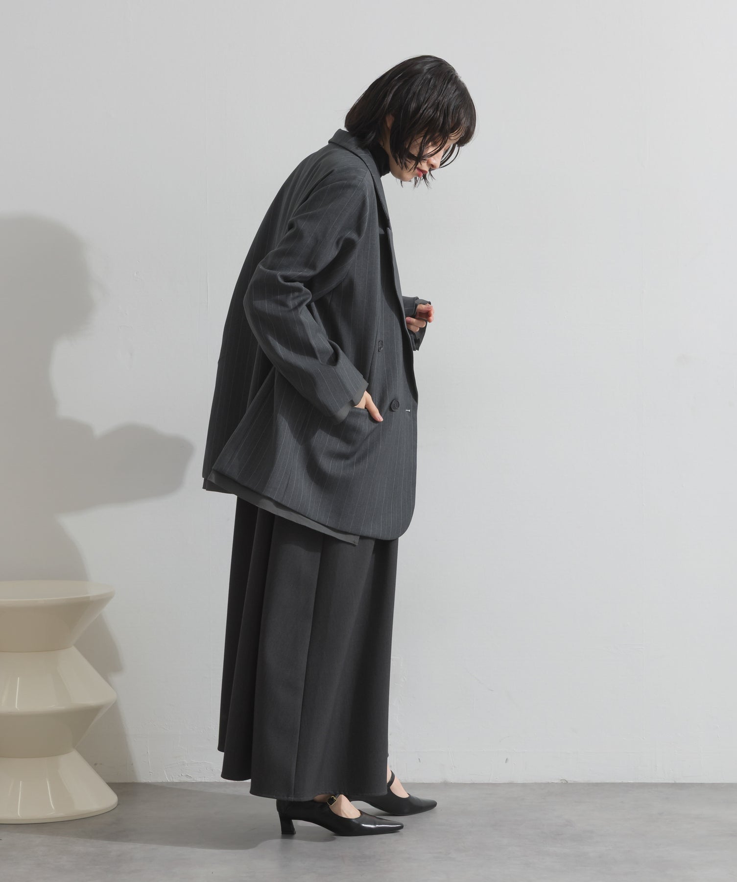 旬顔を叶える、大人のダブルブレストジャケット。さりげないストライプ柄が品よく映える、ポリスパン素材のダブルジャケット。ゆとりあるサイズ感と長めの丈感が今っぽく、さらっと羽織るだけでトレンド感のある着こなしに。ヒップが隠れる丈なので体型カバー効果も◎。Tシャツやタートル、ワンピースとのレイヤードもバランスよくまとまる万能アイテムです。