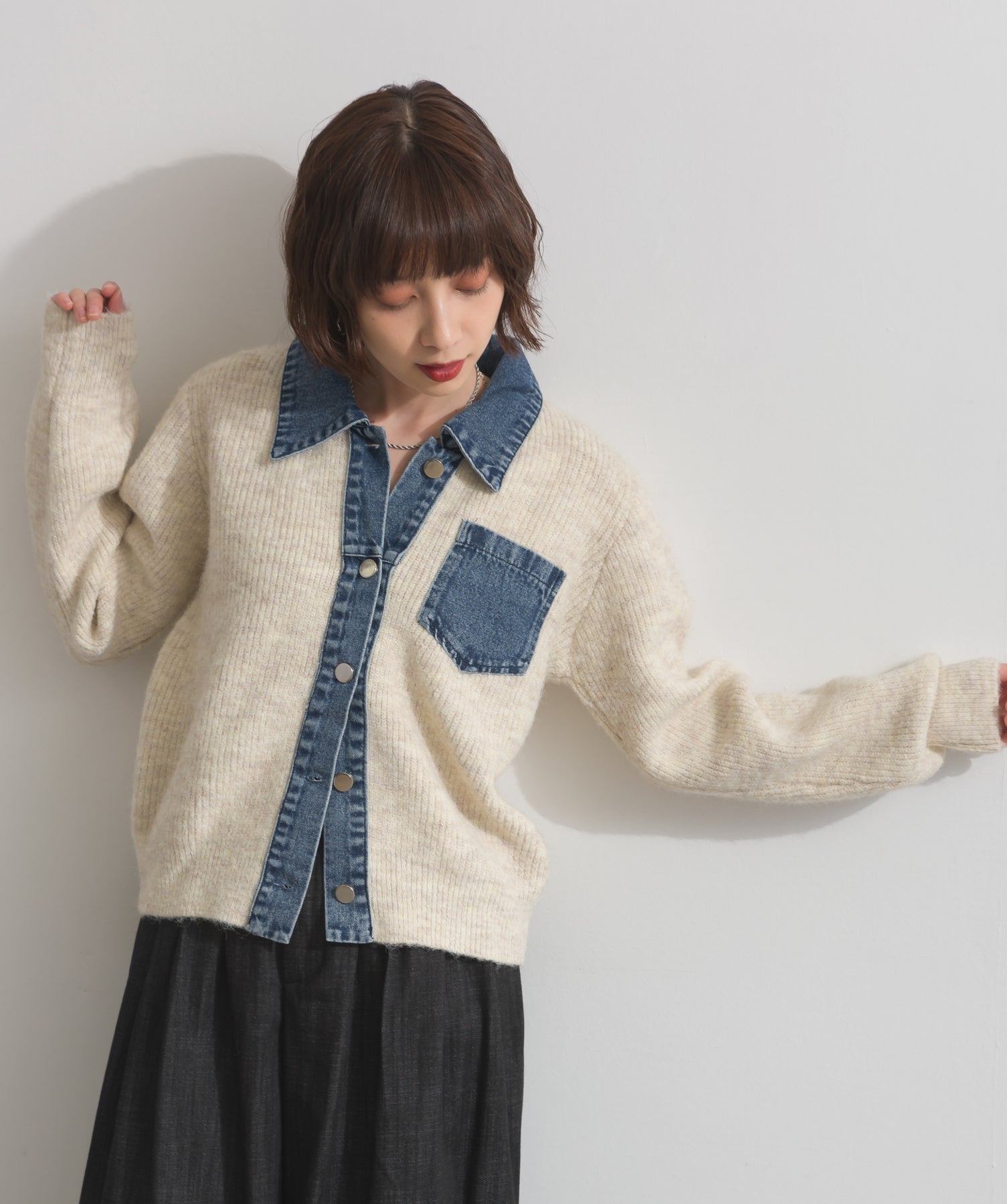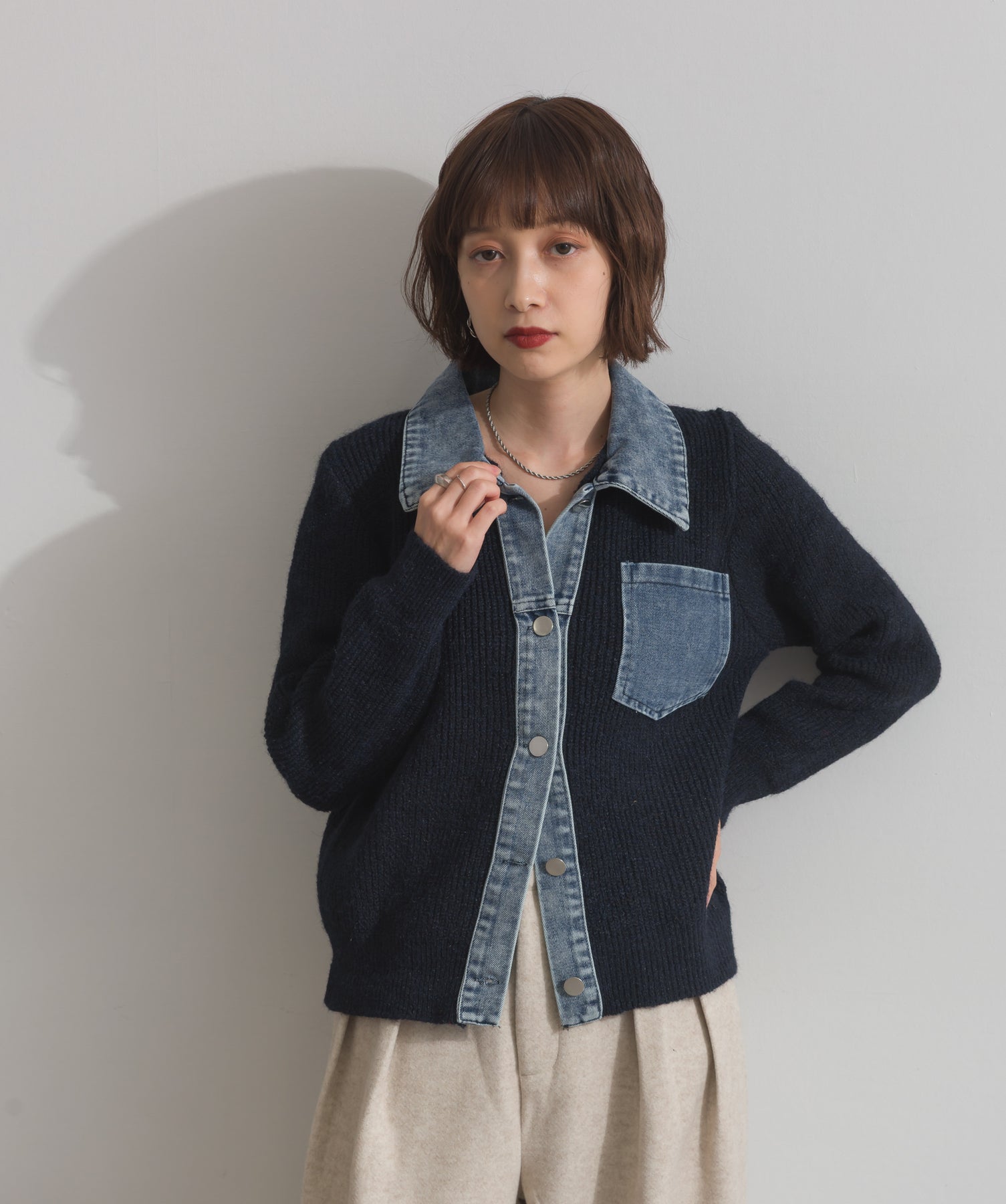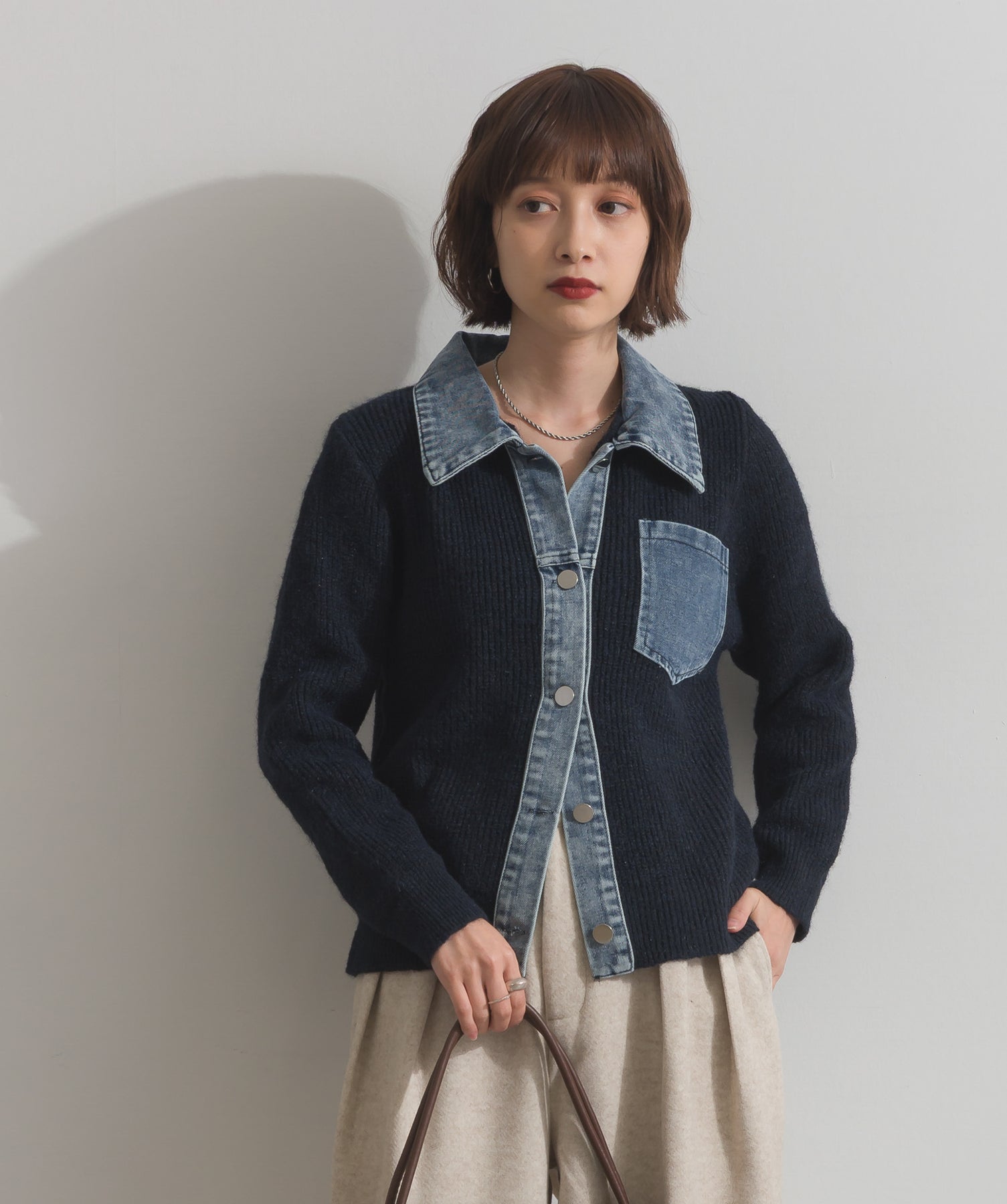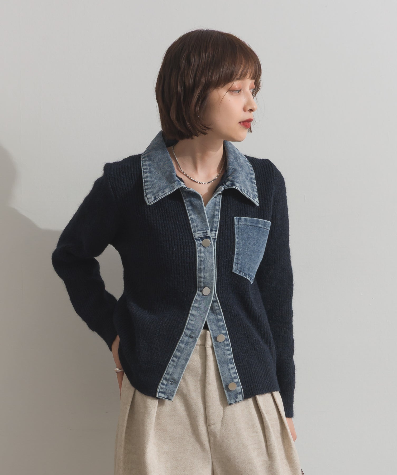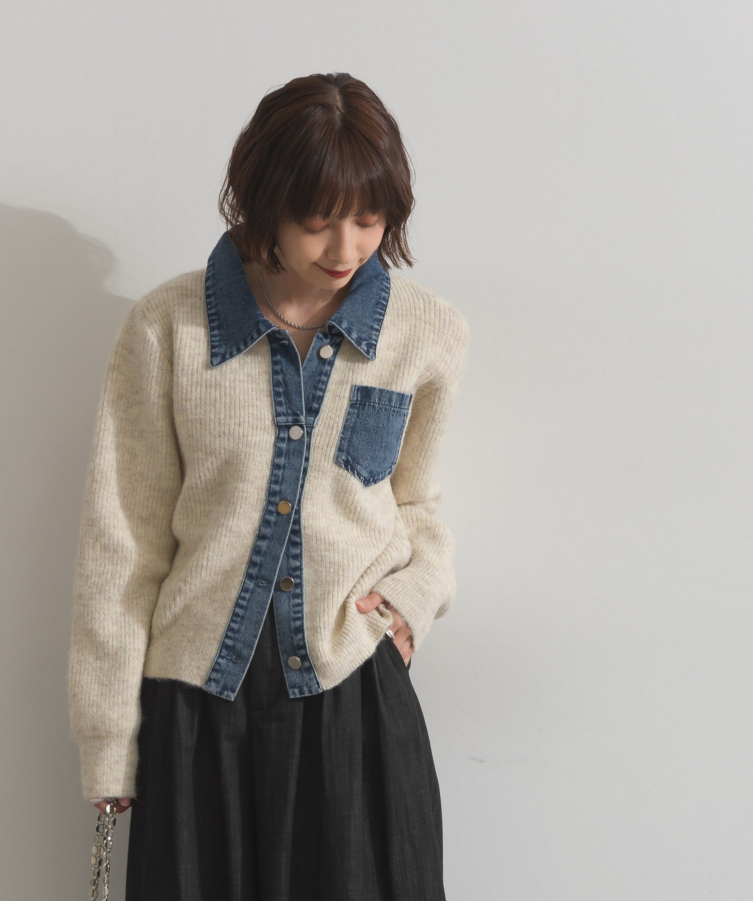 デニムの存在感で差をつける。1枚で主役になる異素材カーデ。