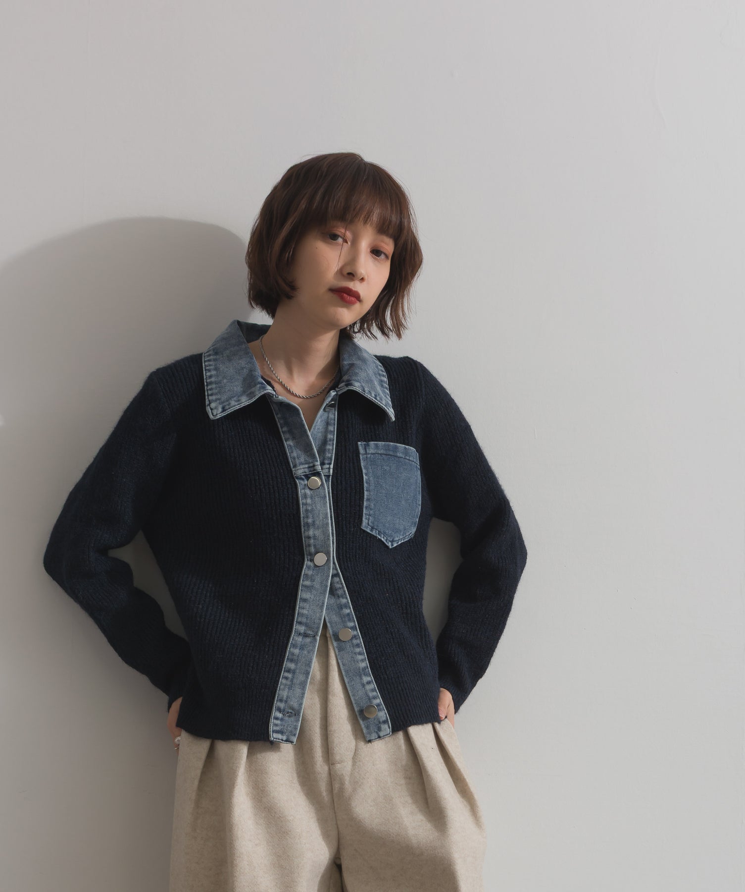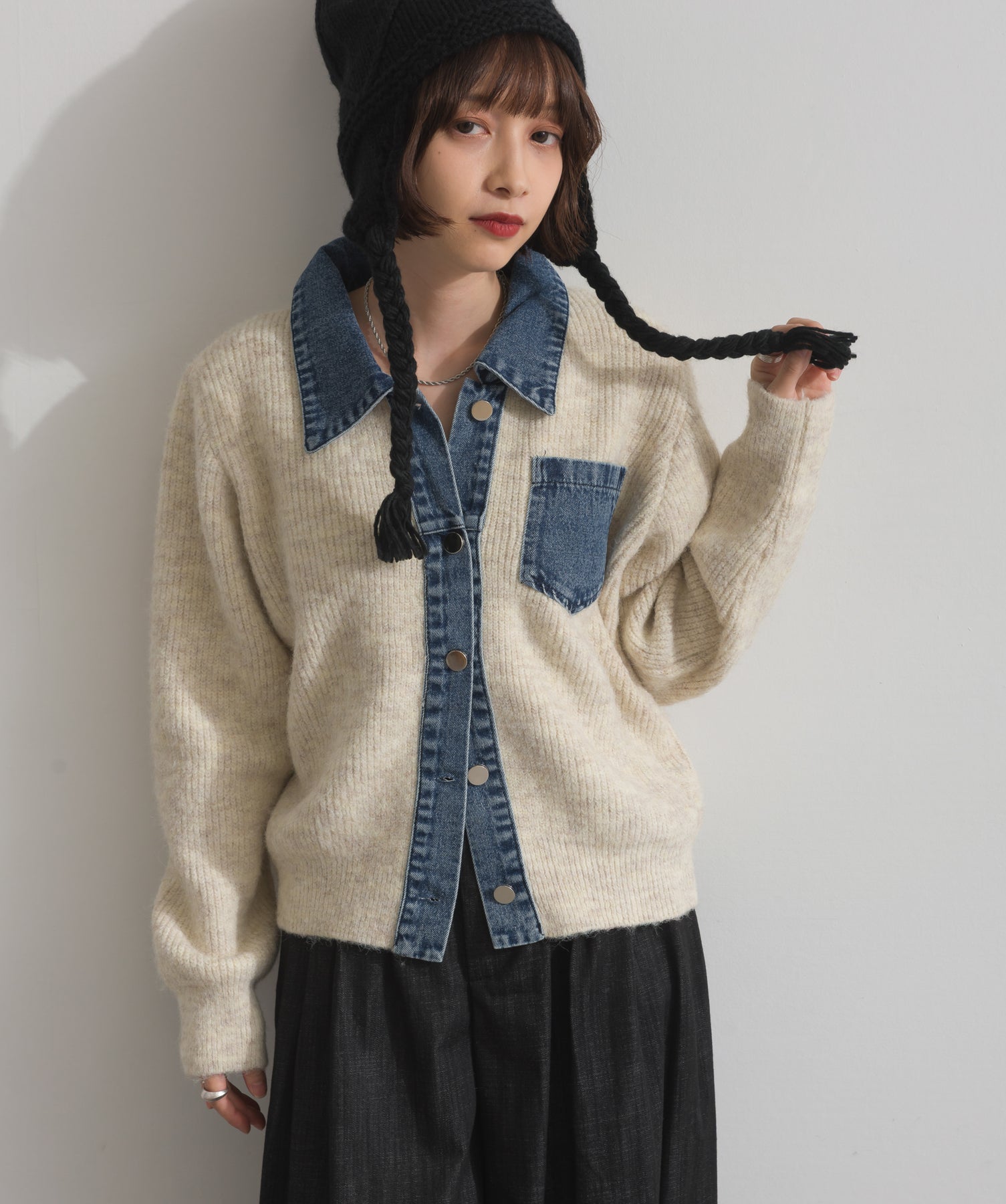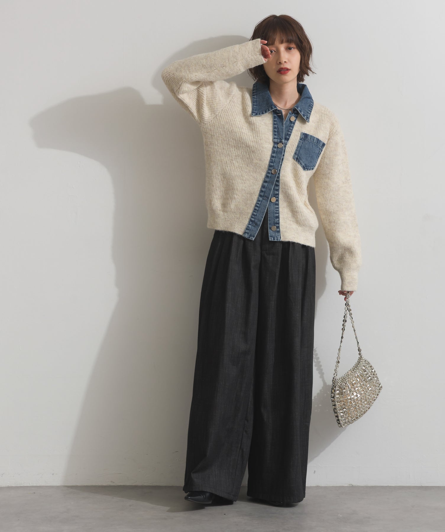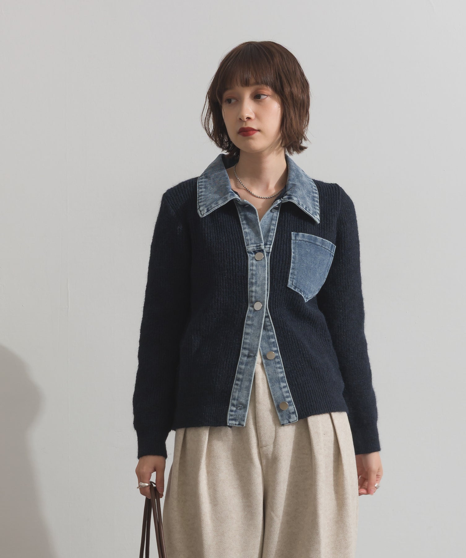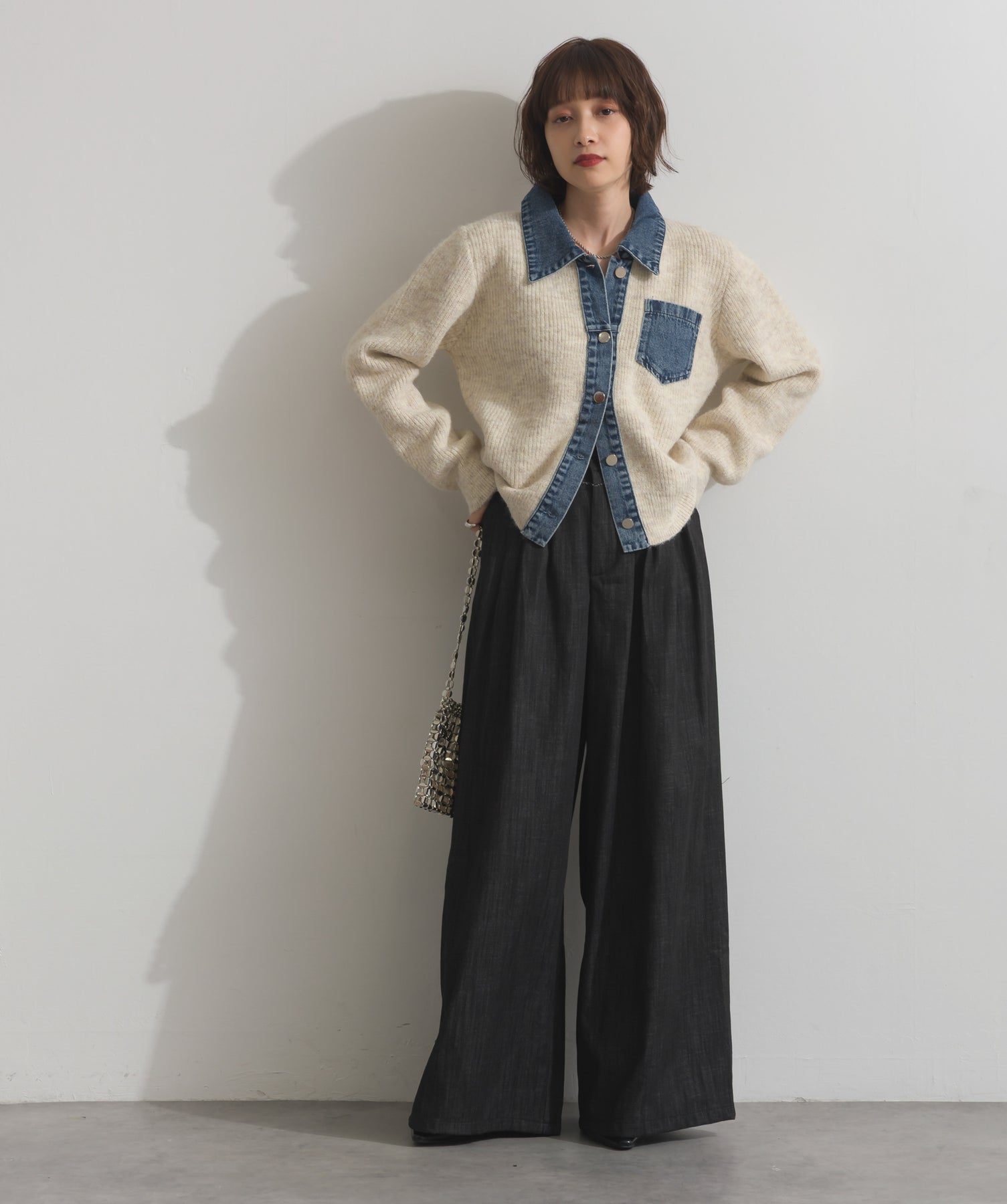 デニムの存在感で差をつける。1枚で主役になる異素材カーデ。