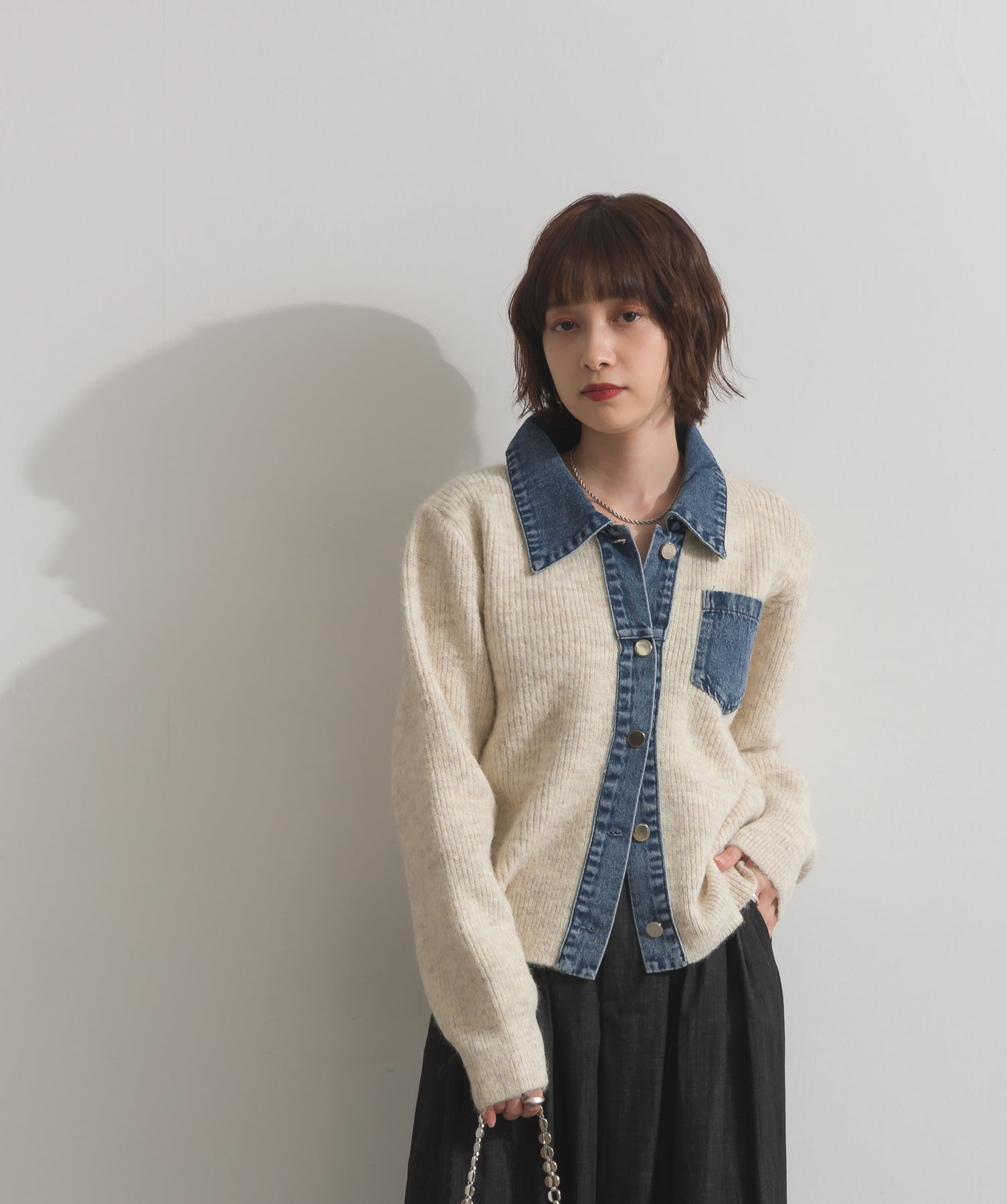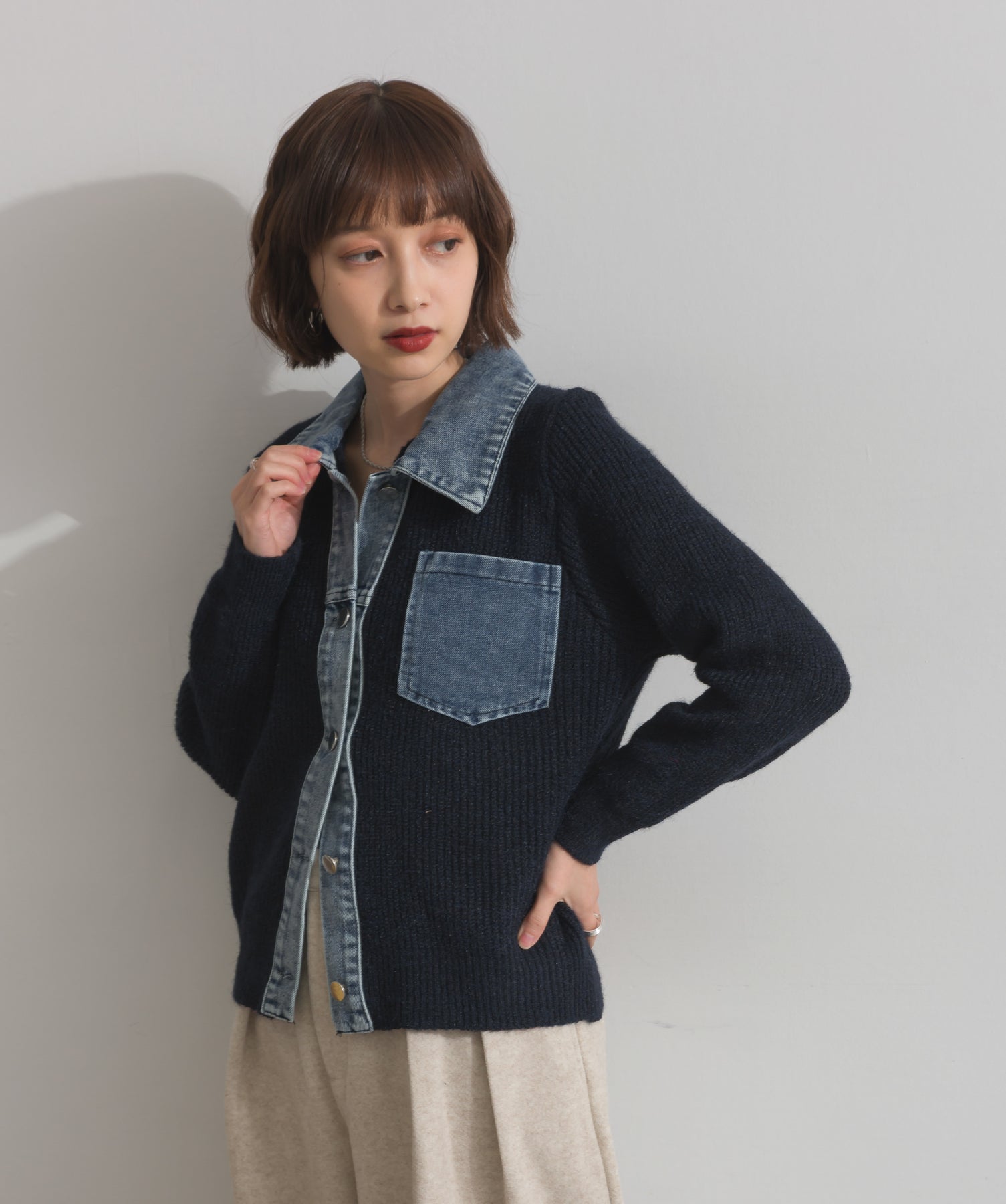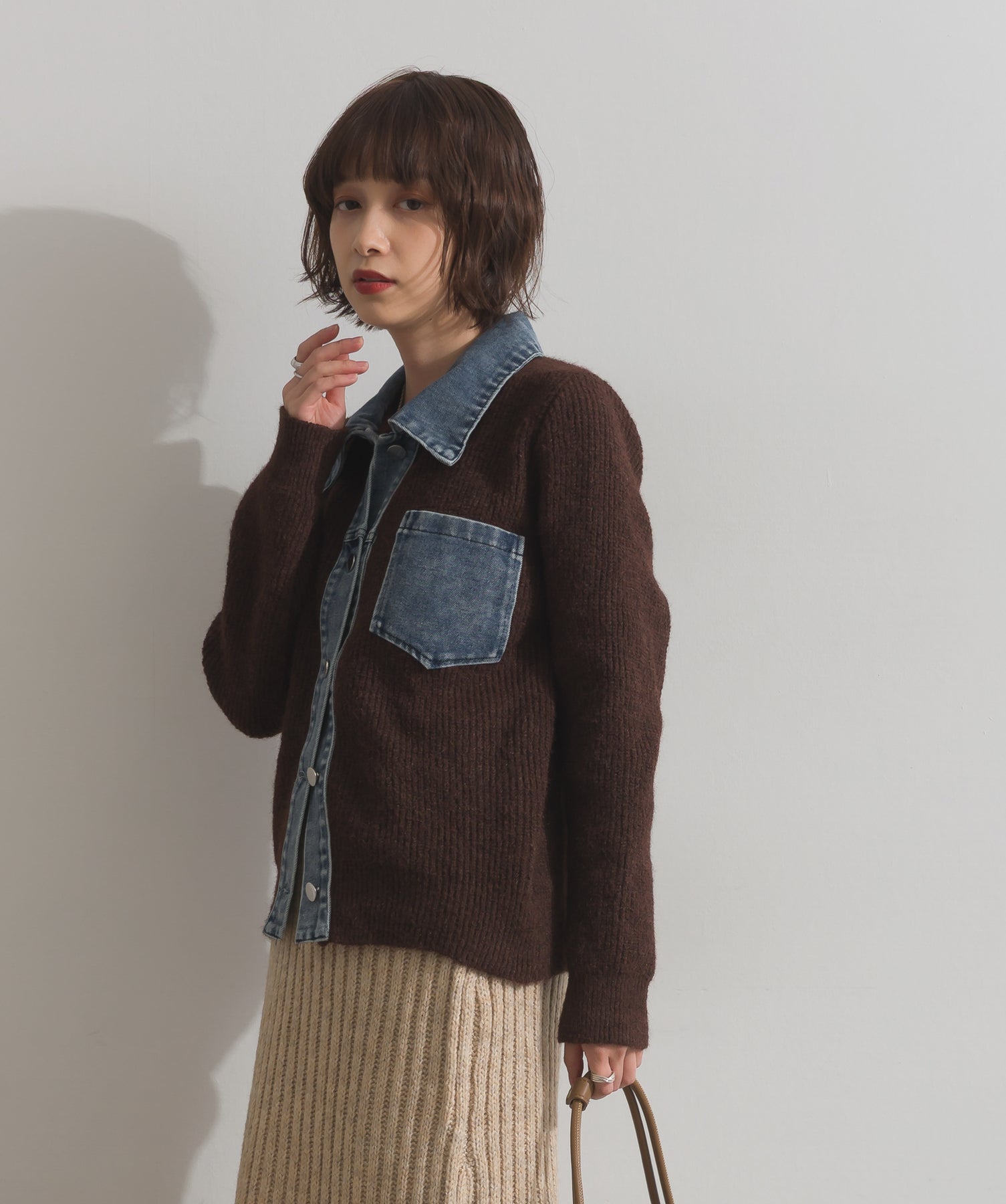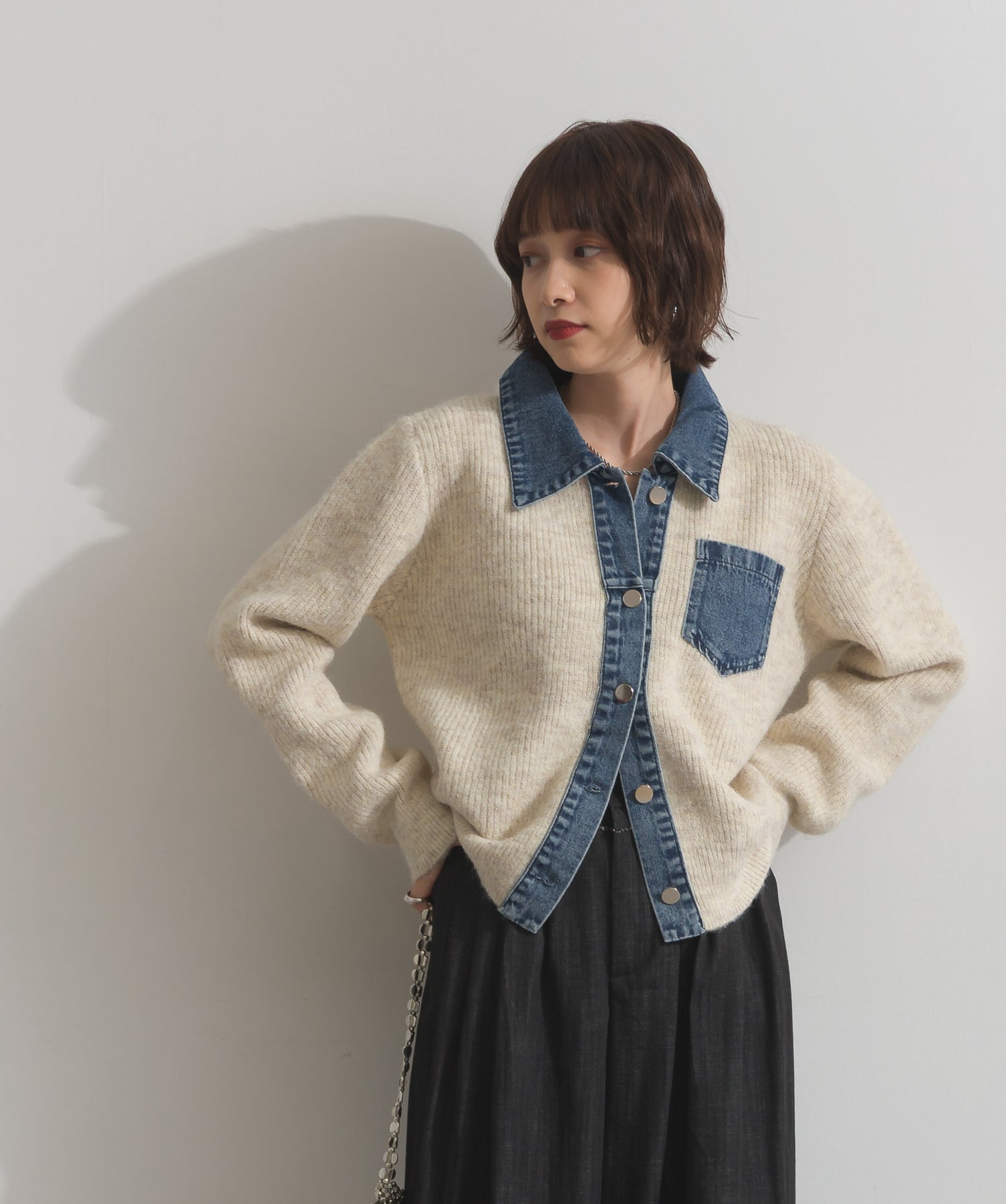 柔らかくふんわりと編み立てたリブニットをベースに、フロントや襟、ポケットにデニム素材をドッキング。異素材のコントラストが際立ち、立体感と奥行きのある表情を演出します。
