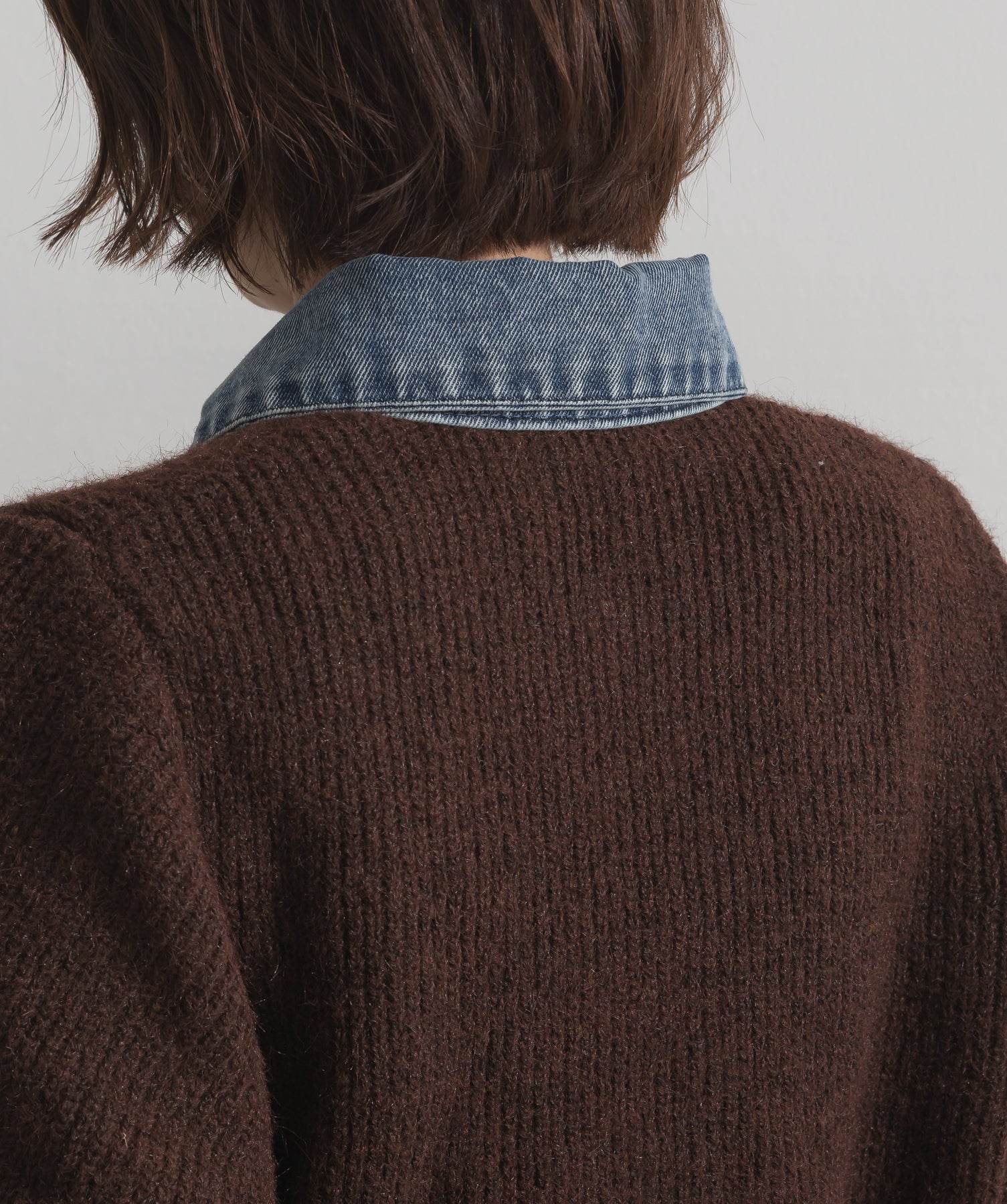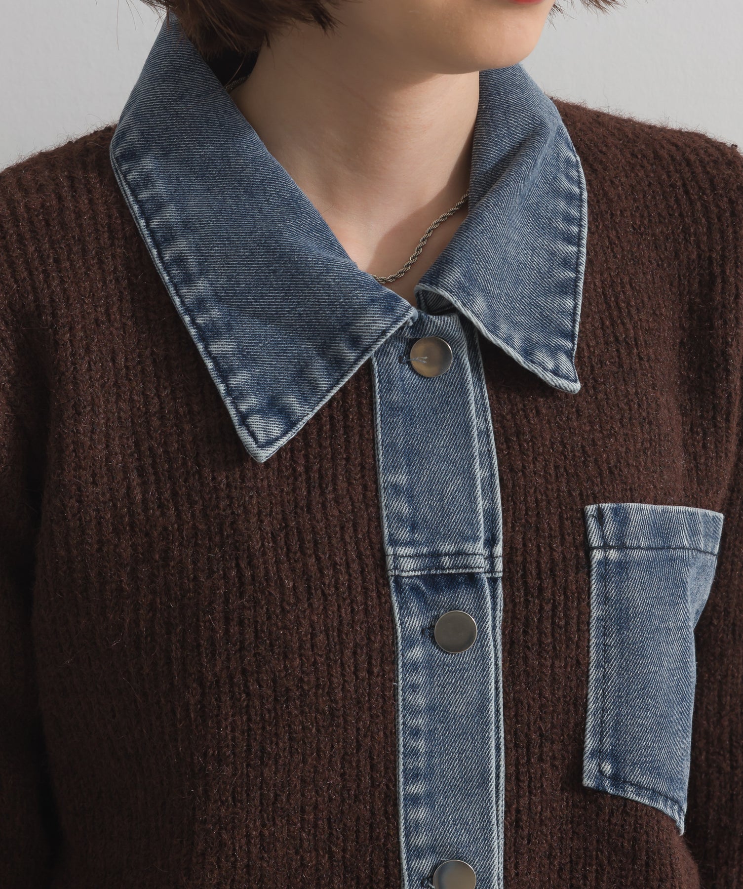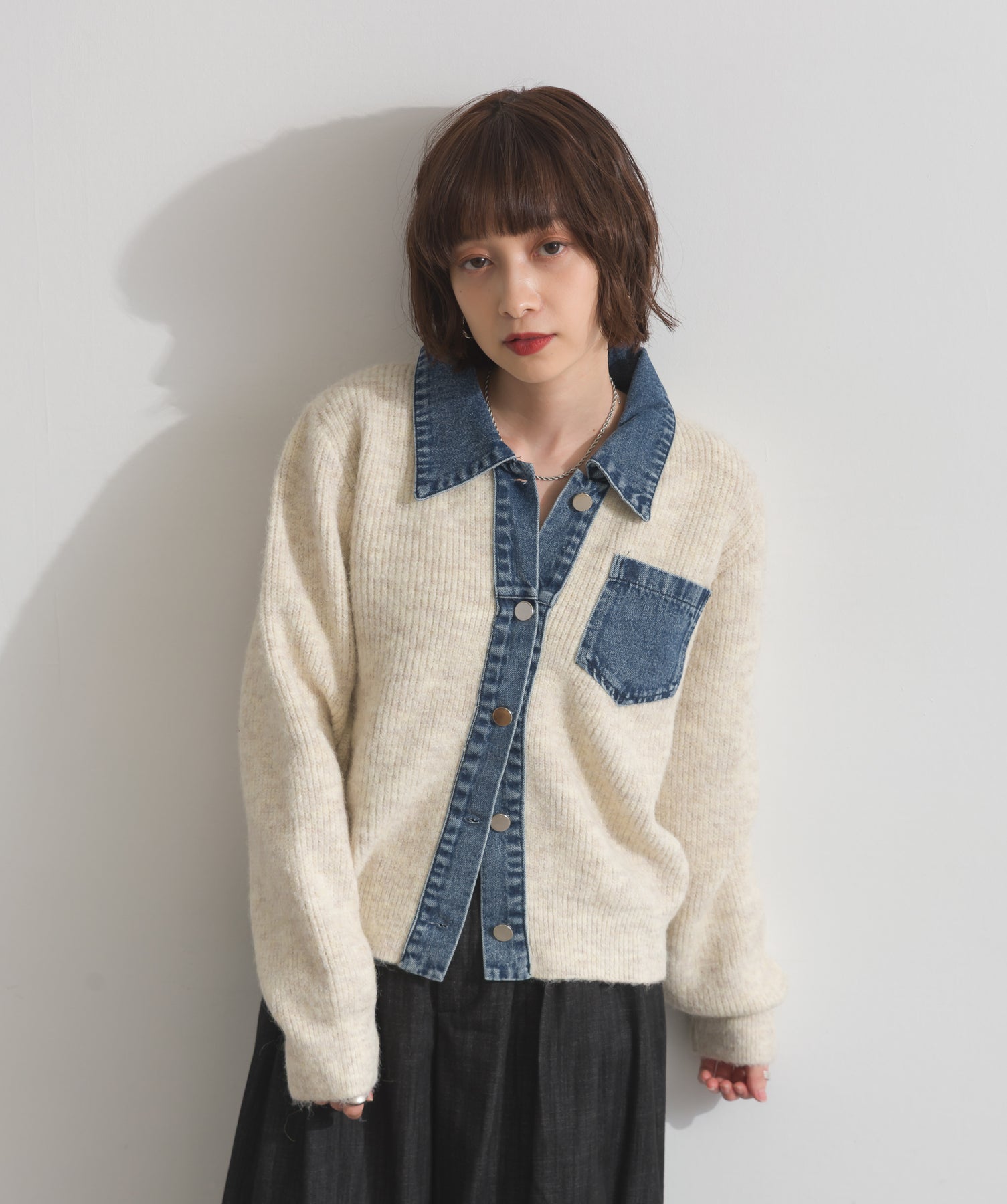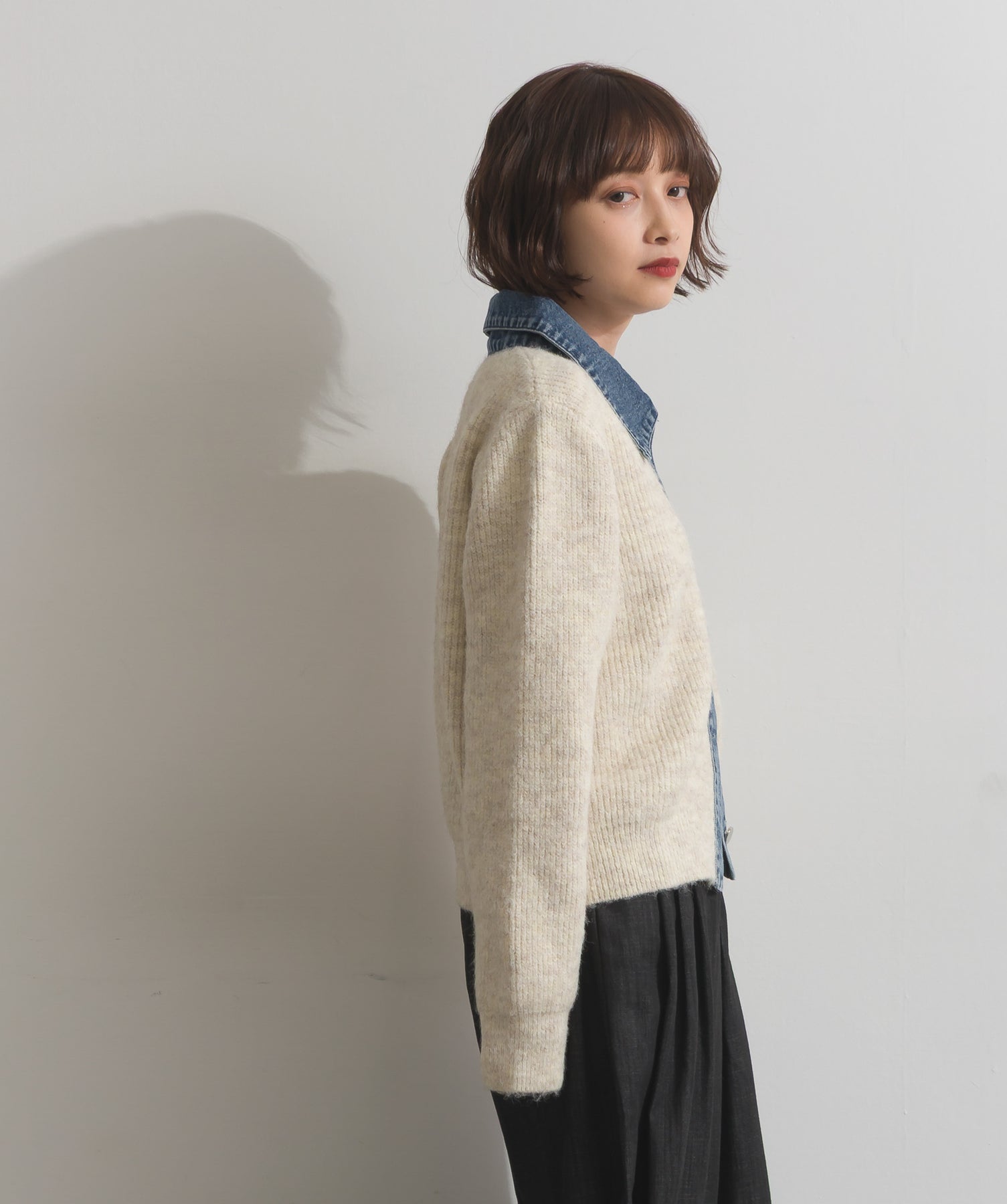 柔らかくふんわりと編み立てたリブニットをベースに、フロントや襟、ポケットにデニム素材をドッキング。異素材のコントラストが際立ち、立体感と奥行きのある表情を演出します。